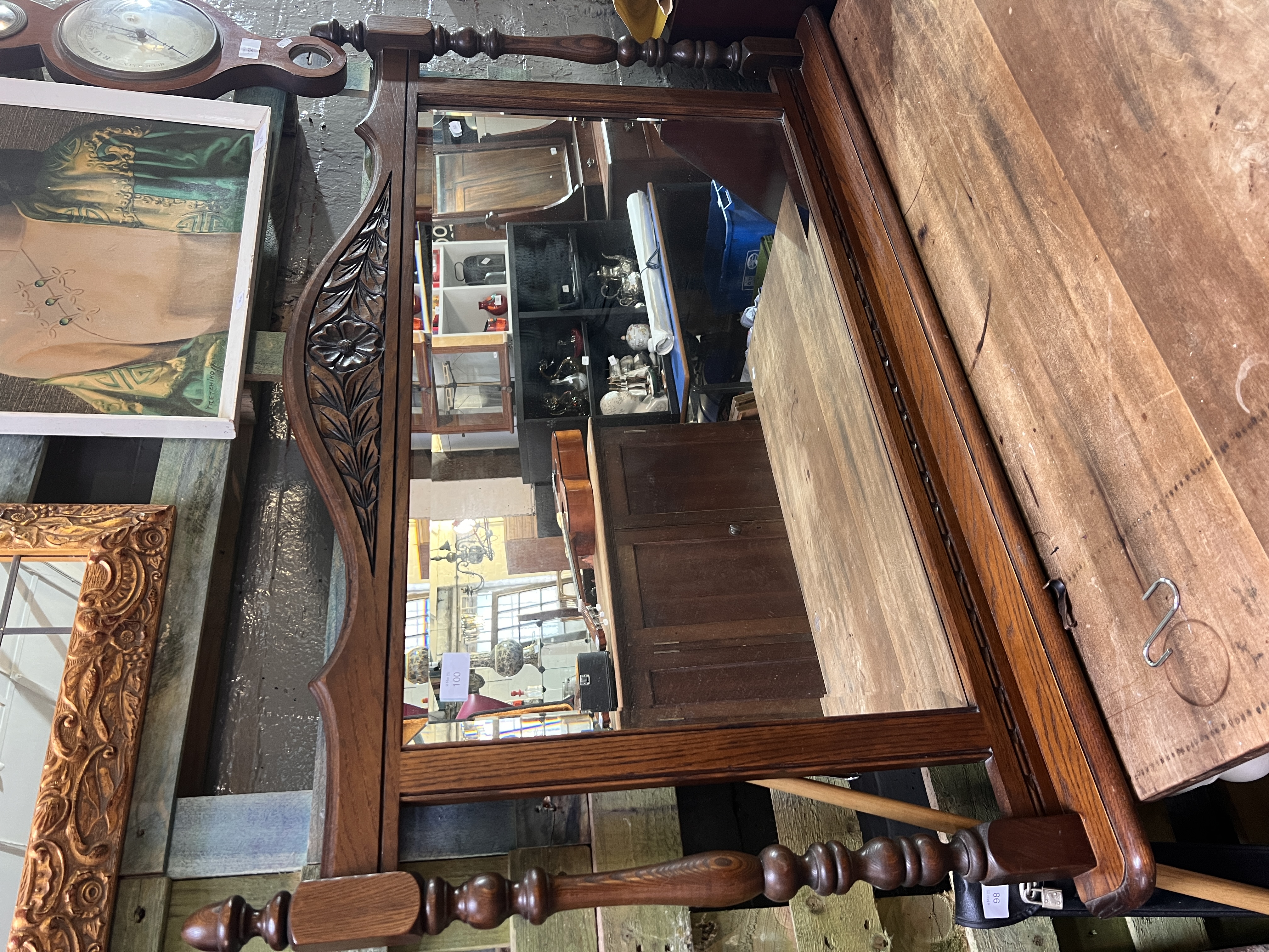 A large oak framed over-mantel mirror with carved details