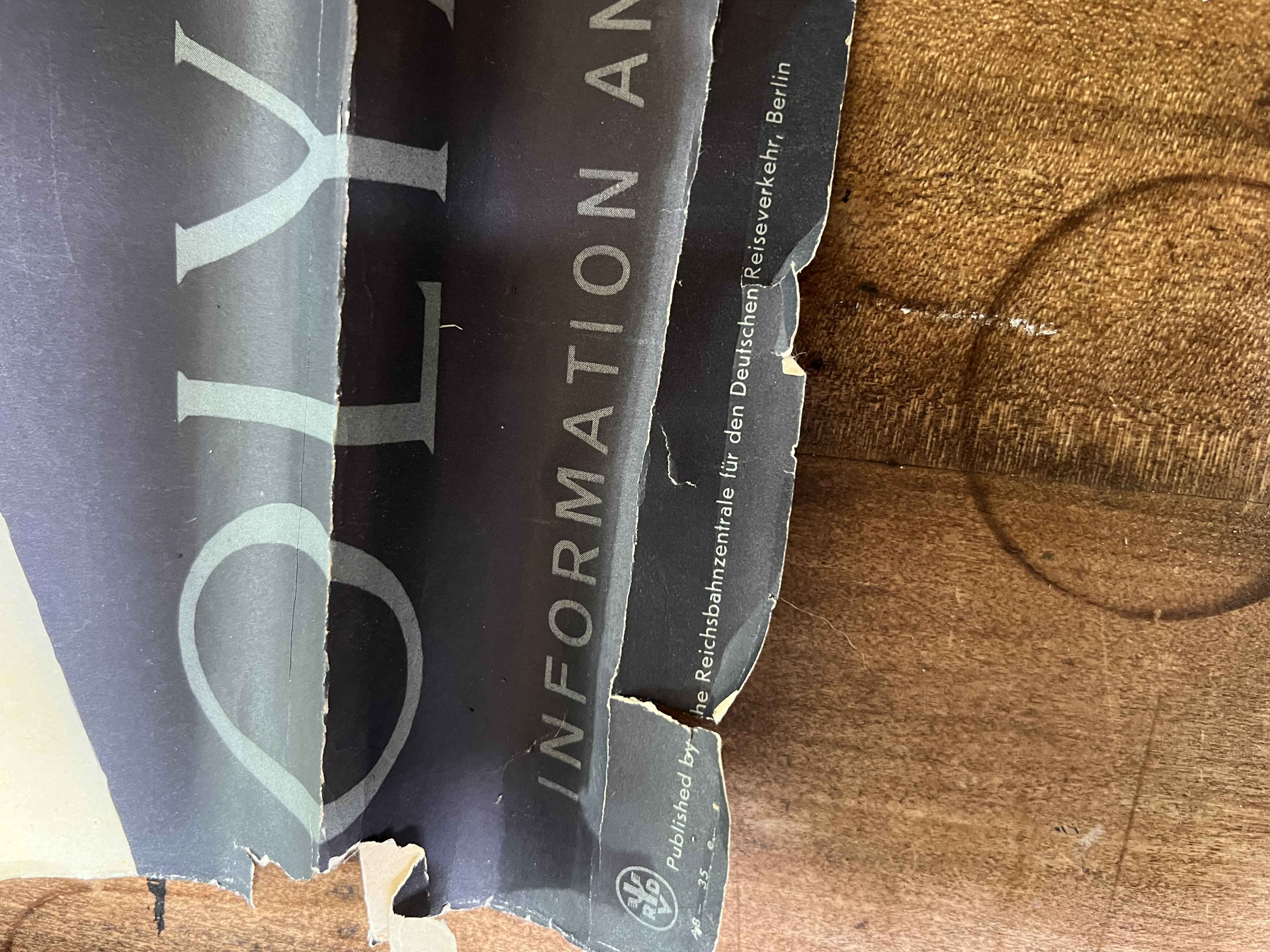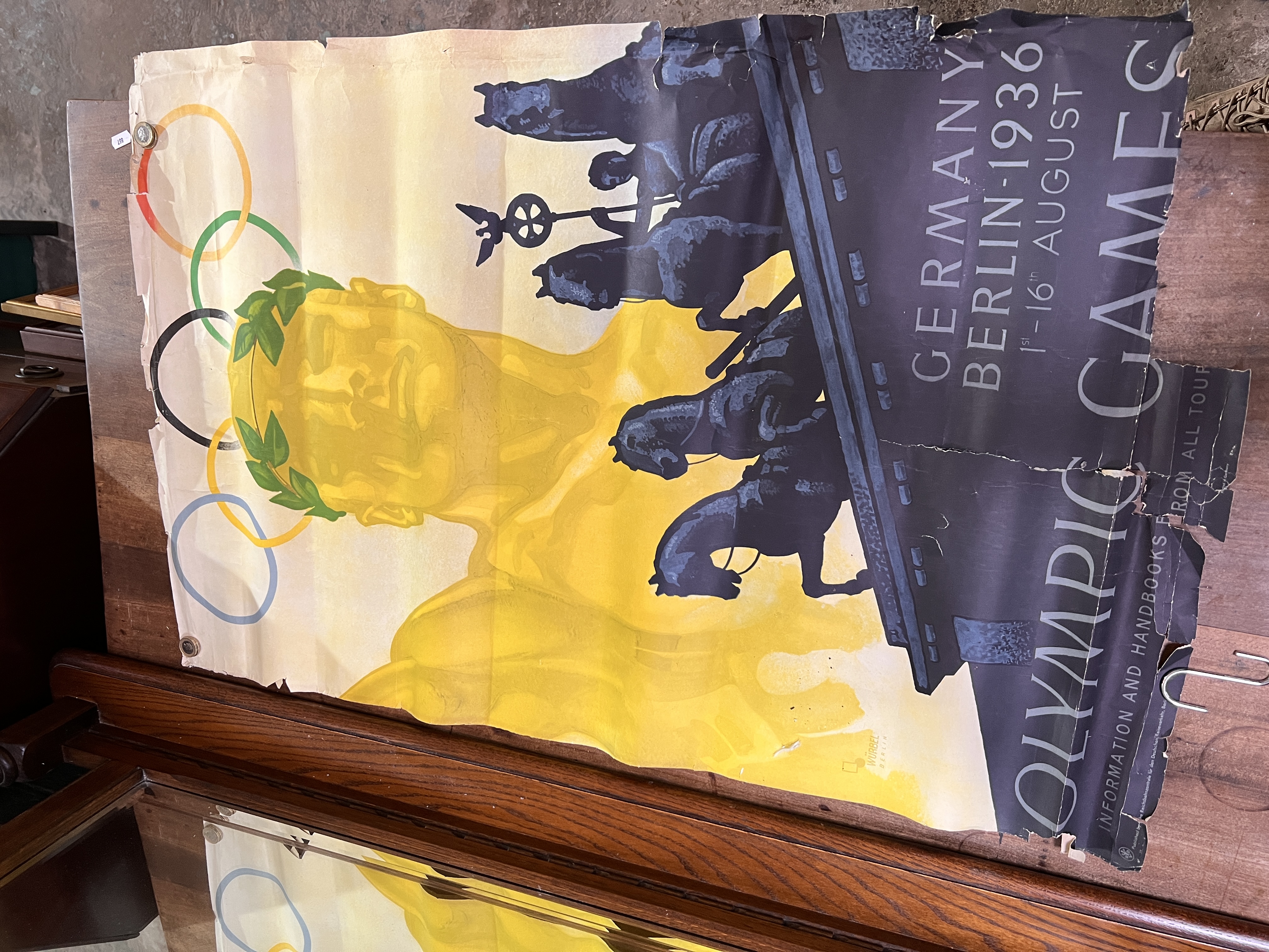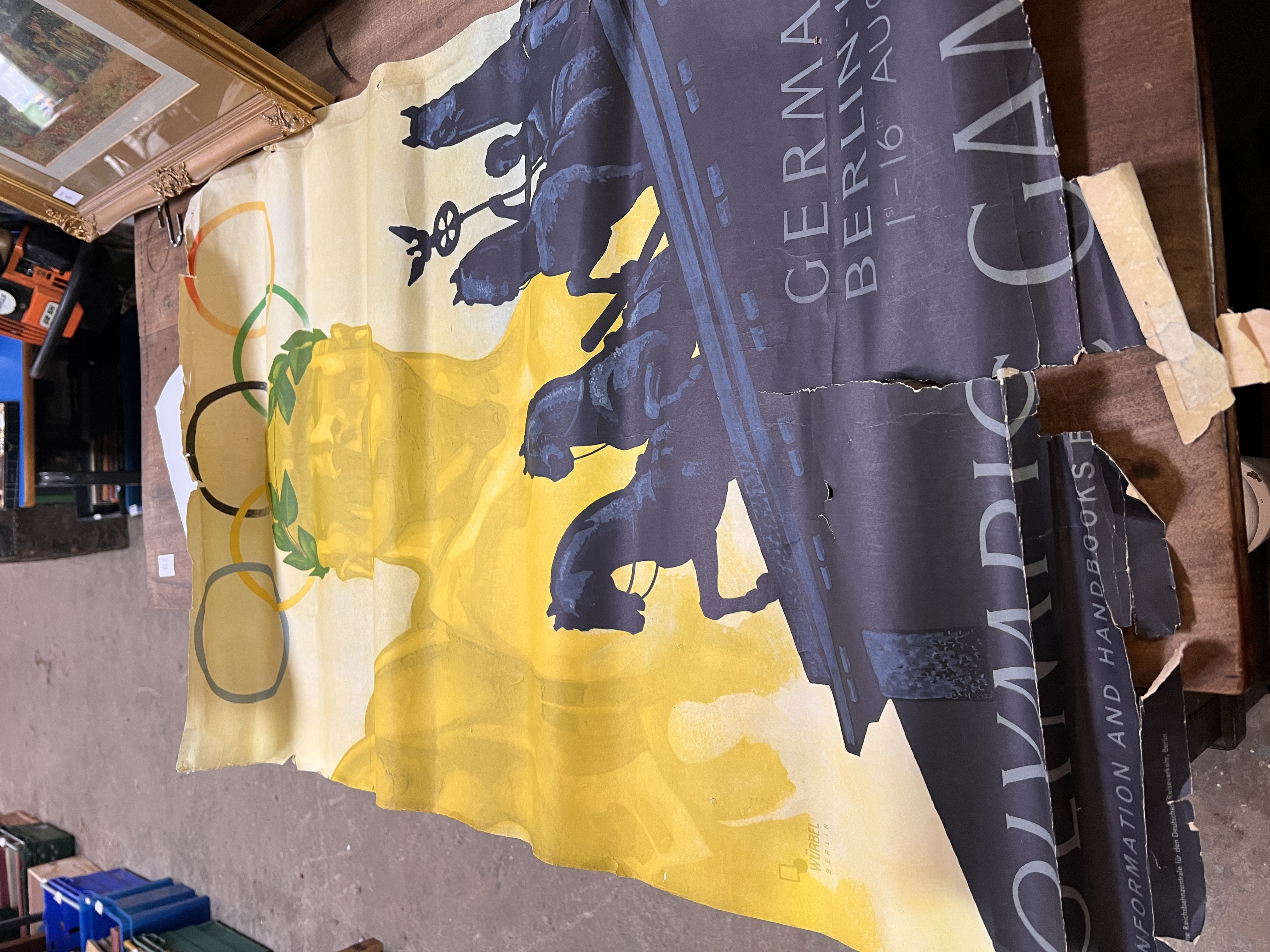 A screen printed poster for the 1936 Berlin Olympics, published by the Reichsbahnzentrale fur den Deutschen Reiseverkehr Berlin. Some loss and damage to poster.