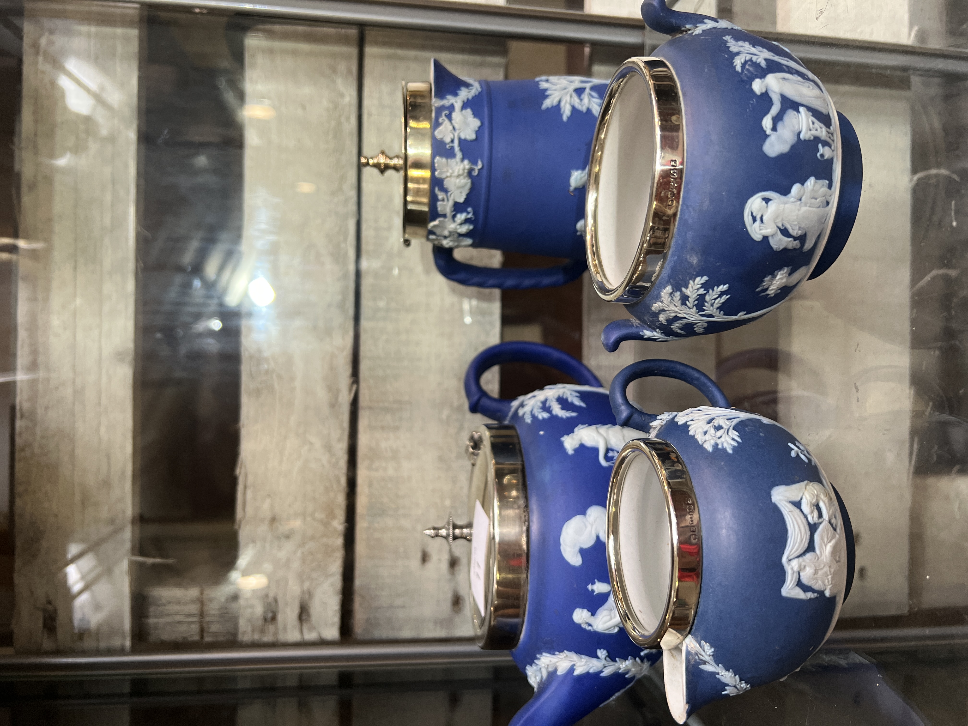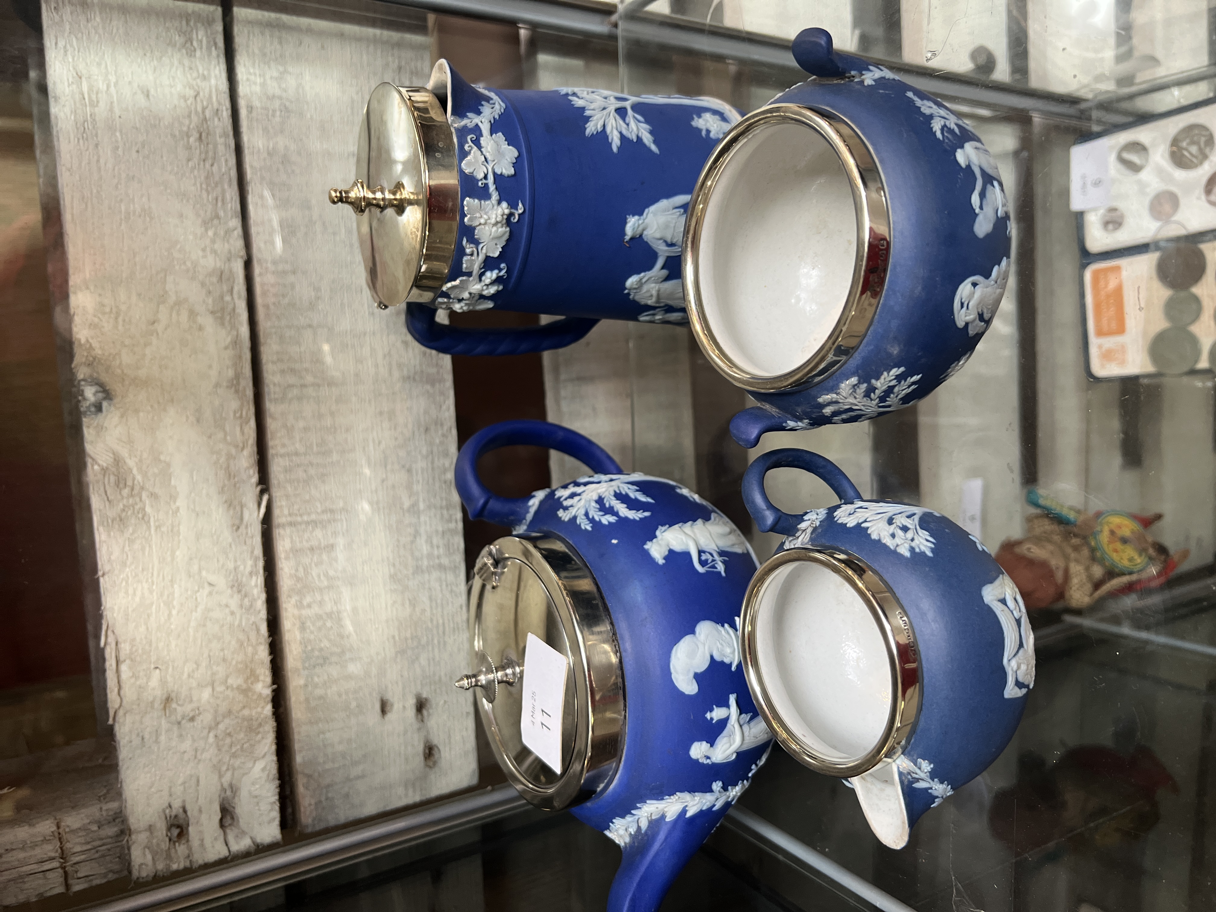 An early 20th century Wedgwood Jasperware tea set including teapot, water jug, creamer and sugar pot. Deep blue ground jasperware pattern with silver plated fitments.