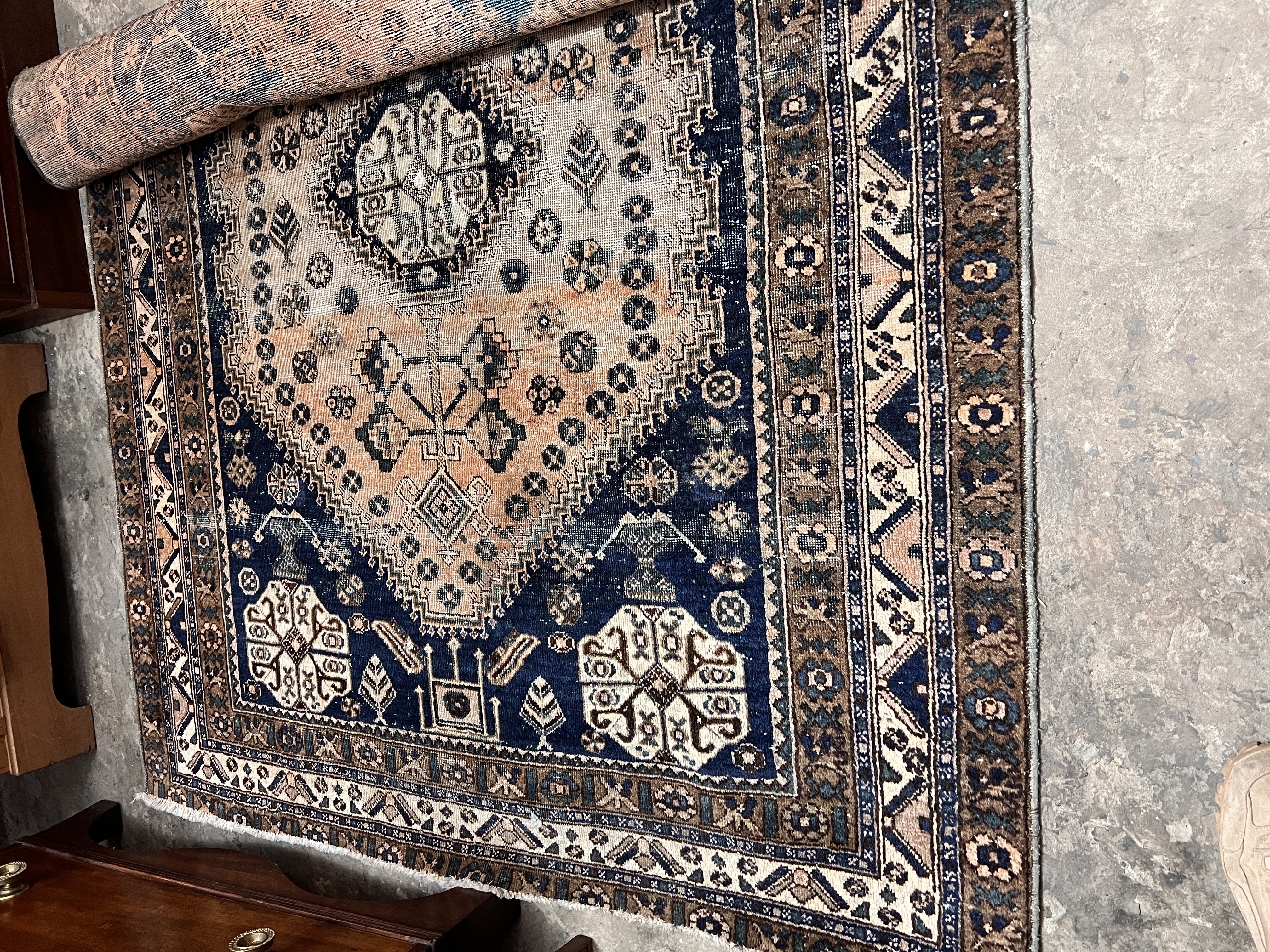 A Vintage hand woven caucasian Quinn rug with blue ground, 2m x 1.5m aprox
