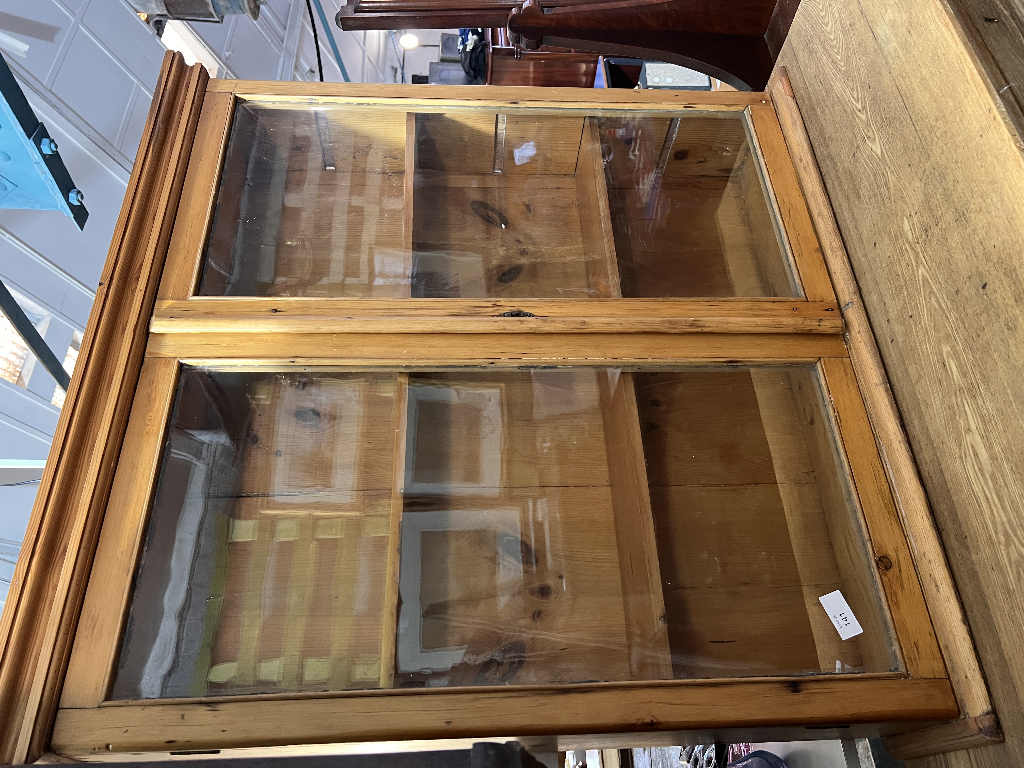 An early 20th century yellow pine display case with rolled glass doors. 95cm wide x 95cm tall x 20cm deep