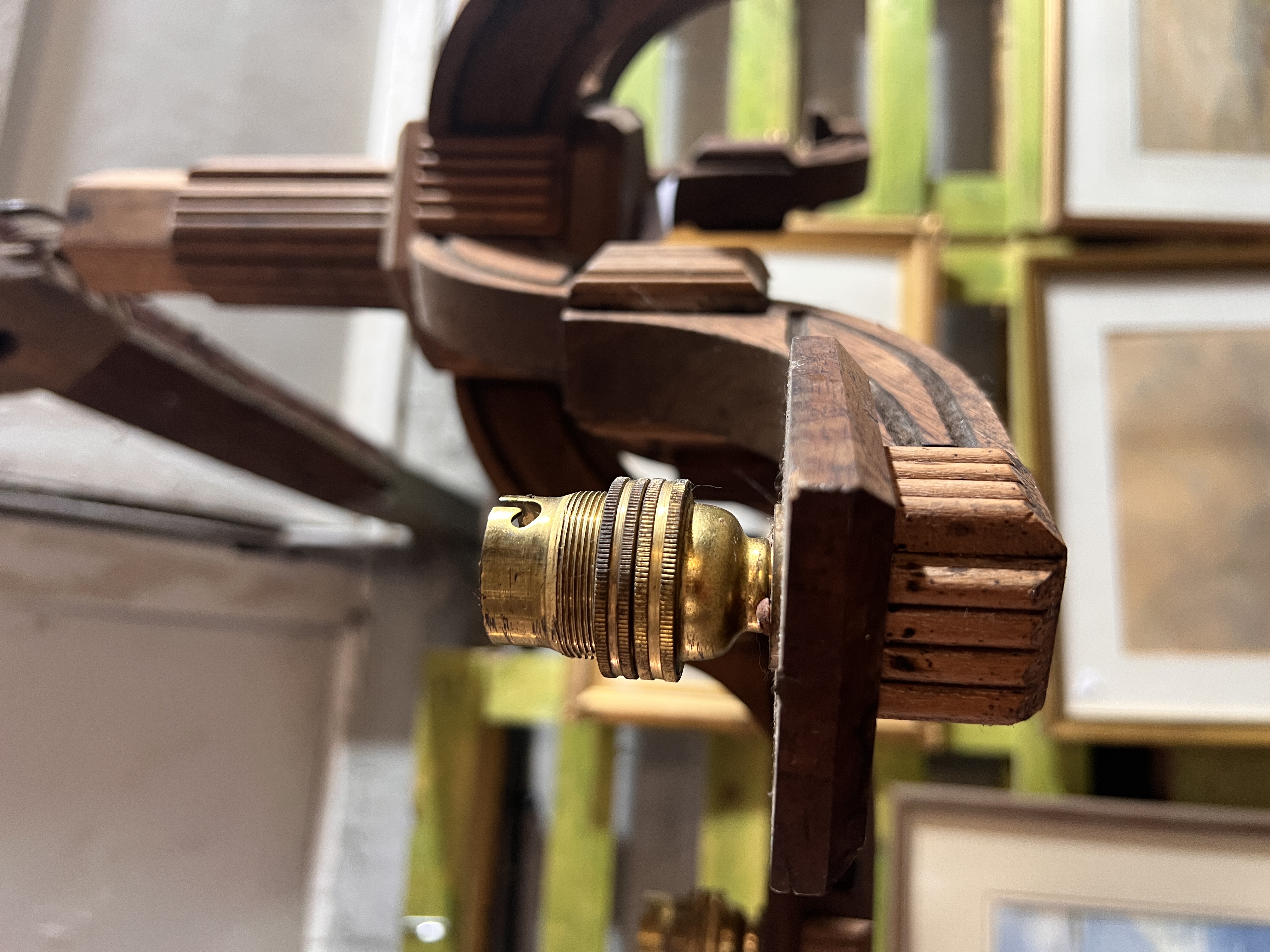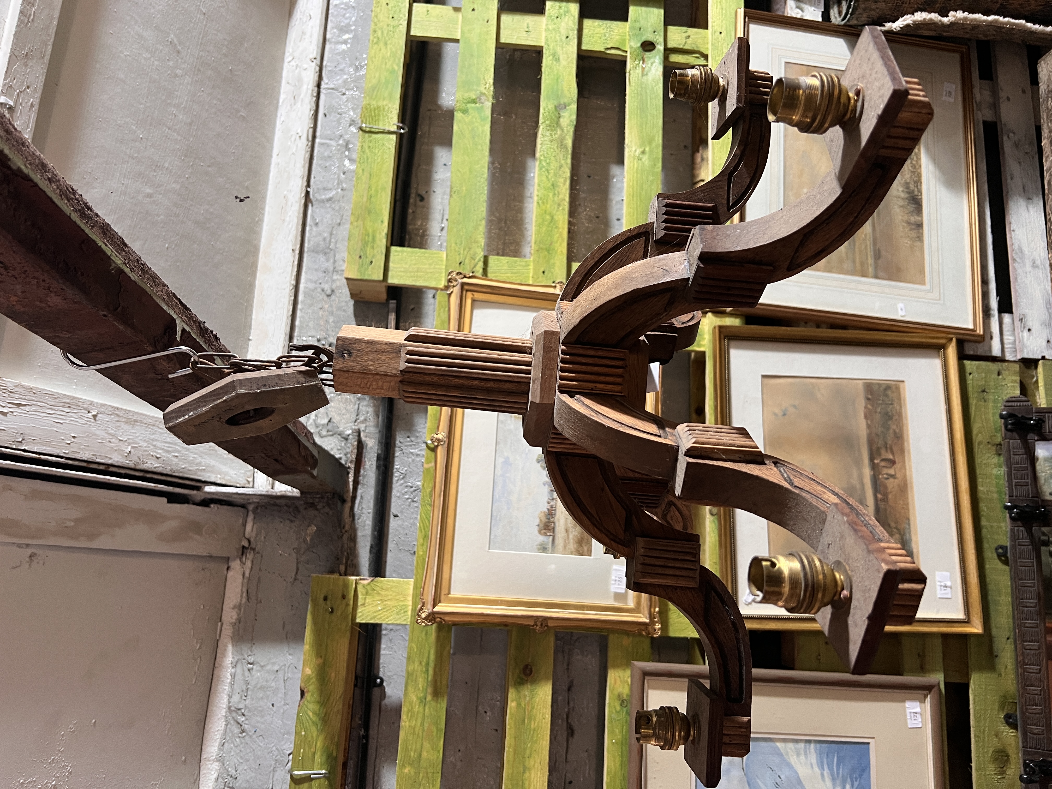 An oak six branch chandelier light fixture
