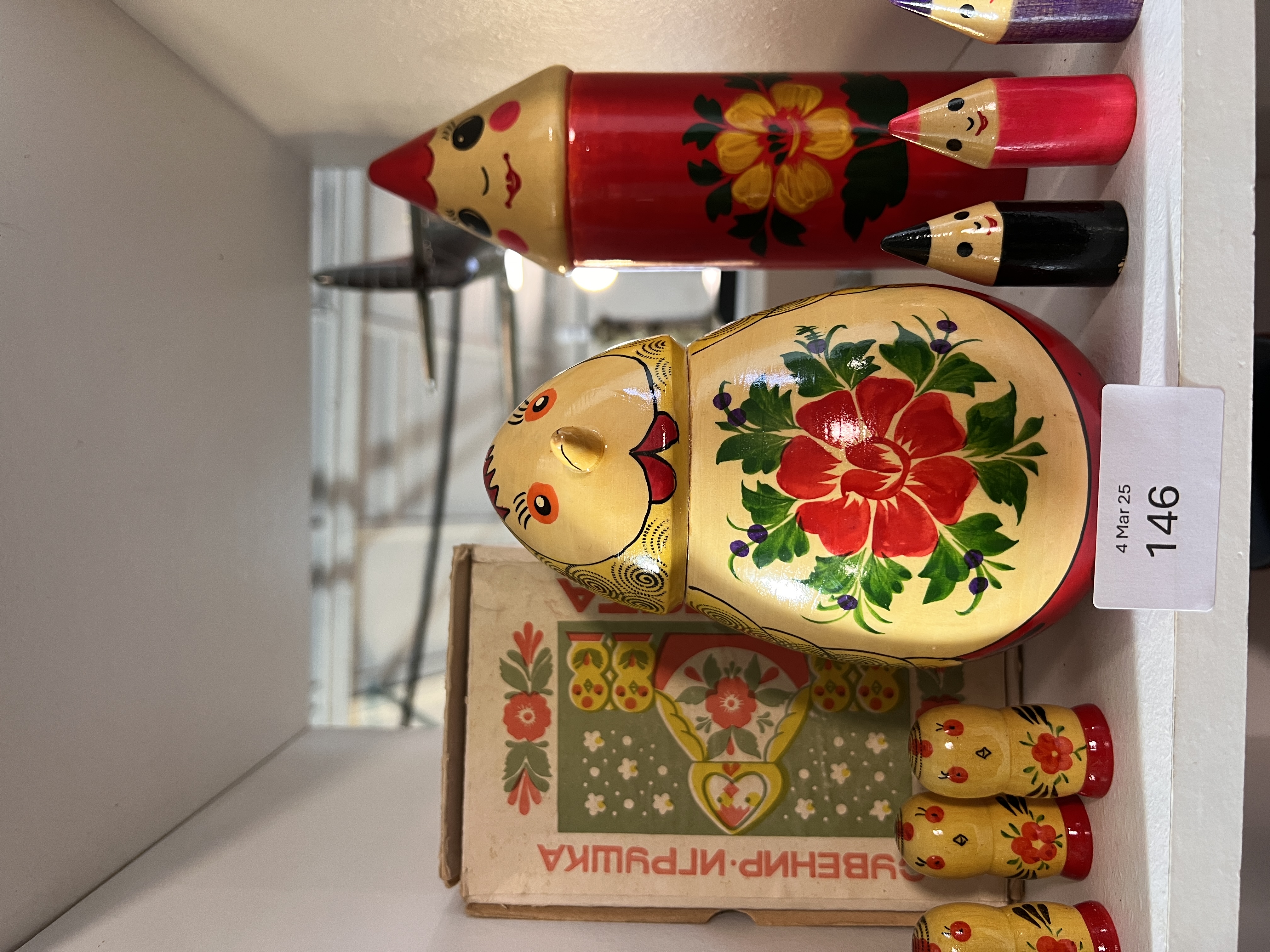 Two vintage Russian Matryoshka dolls including boxed bird and pencil