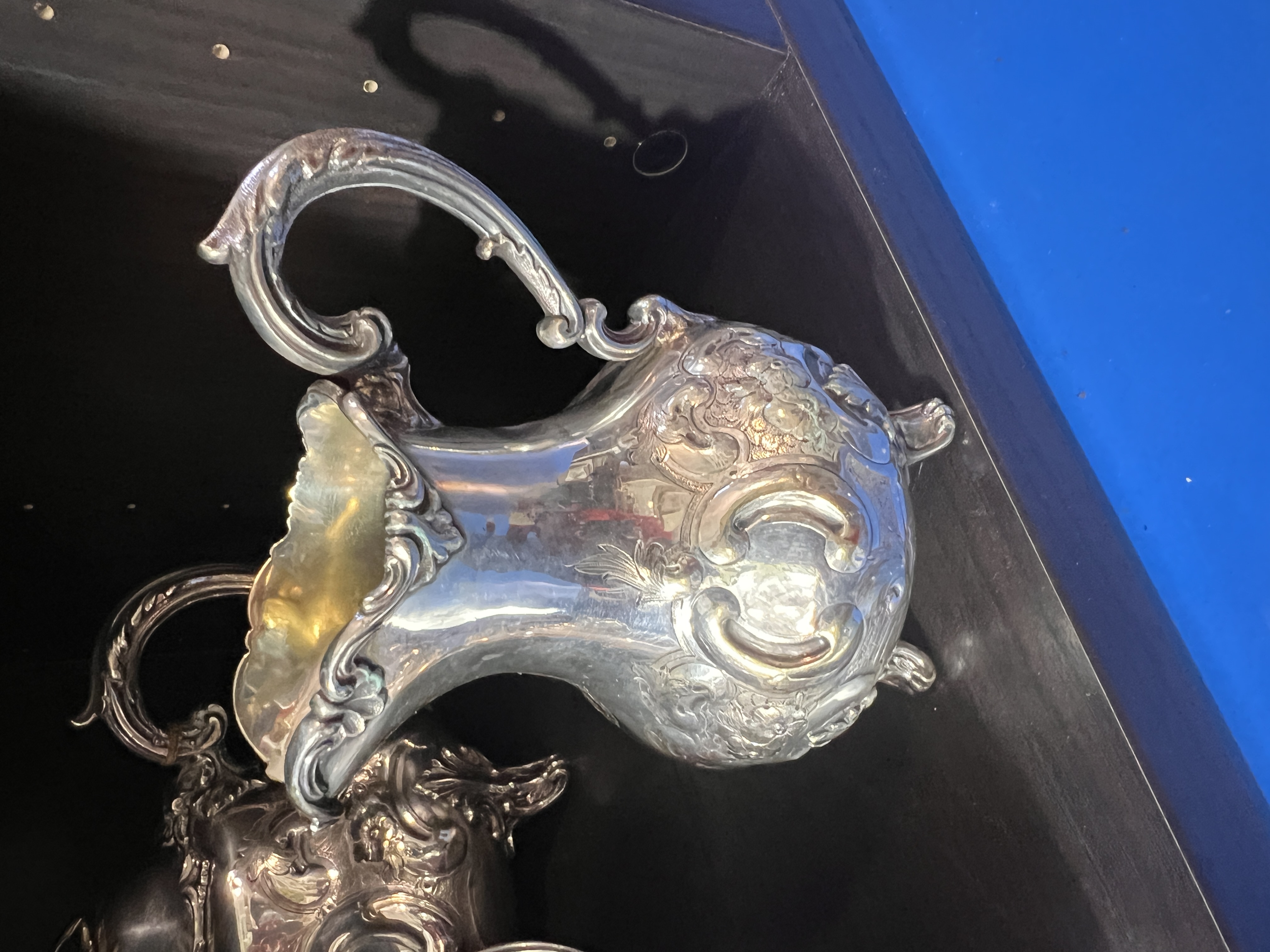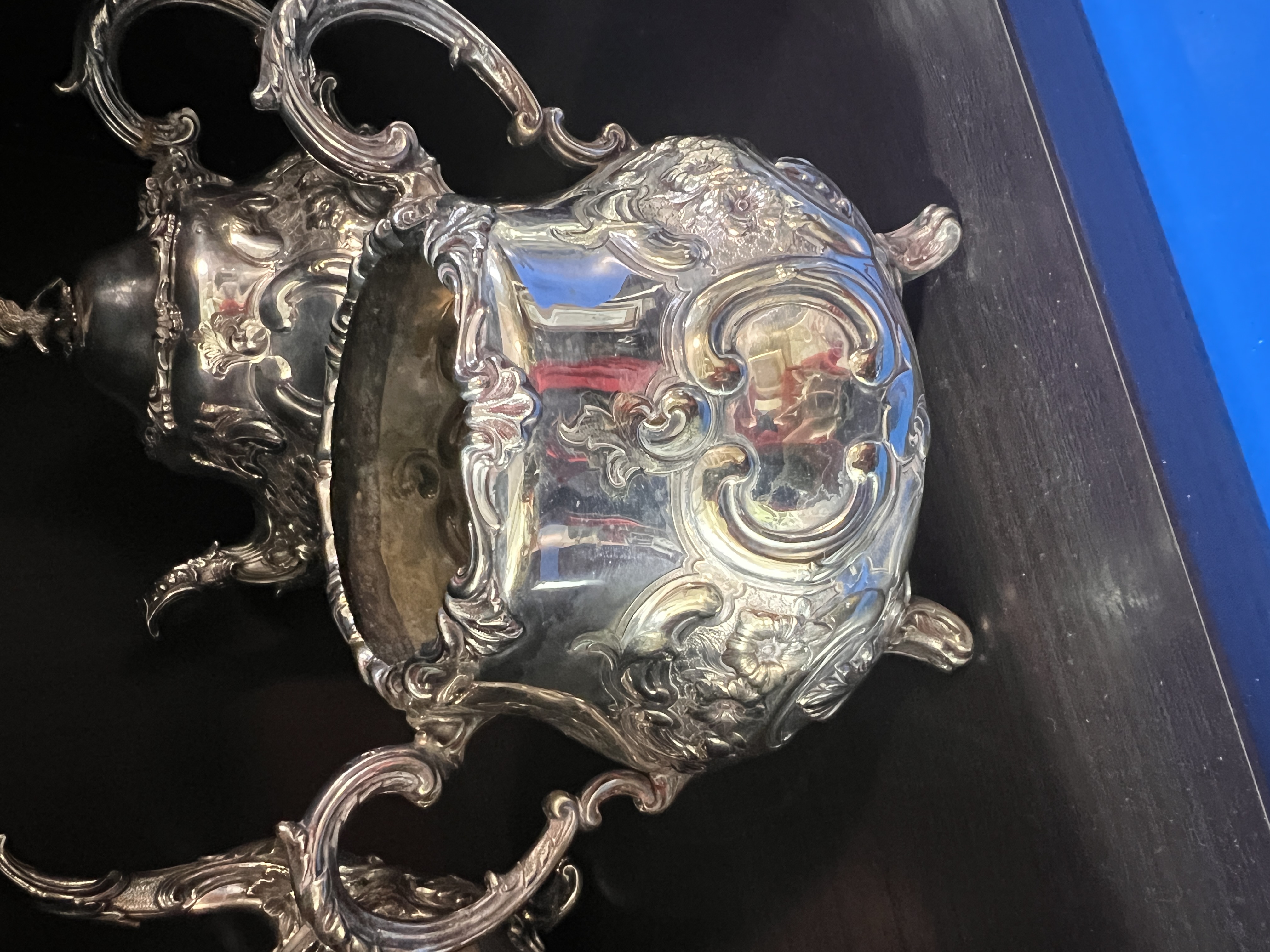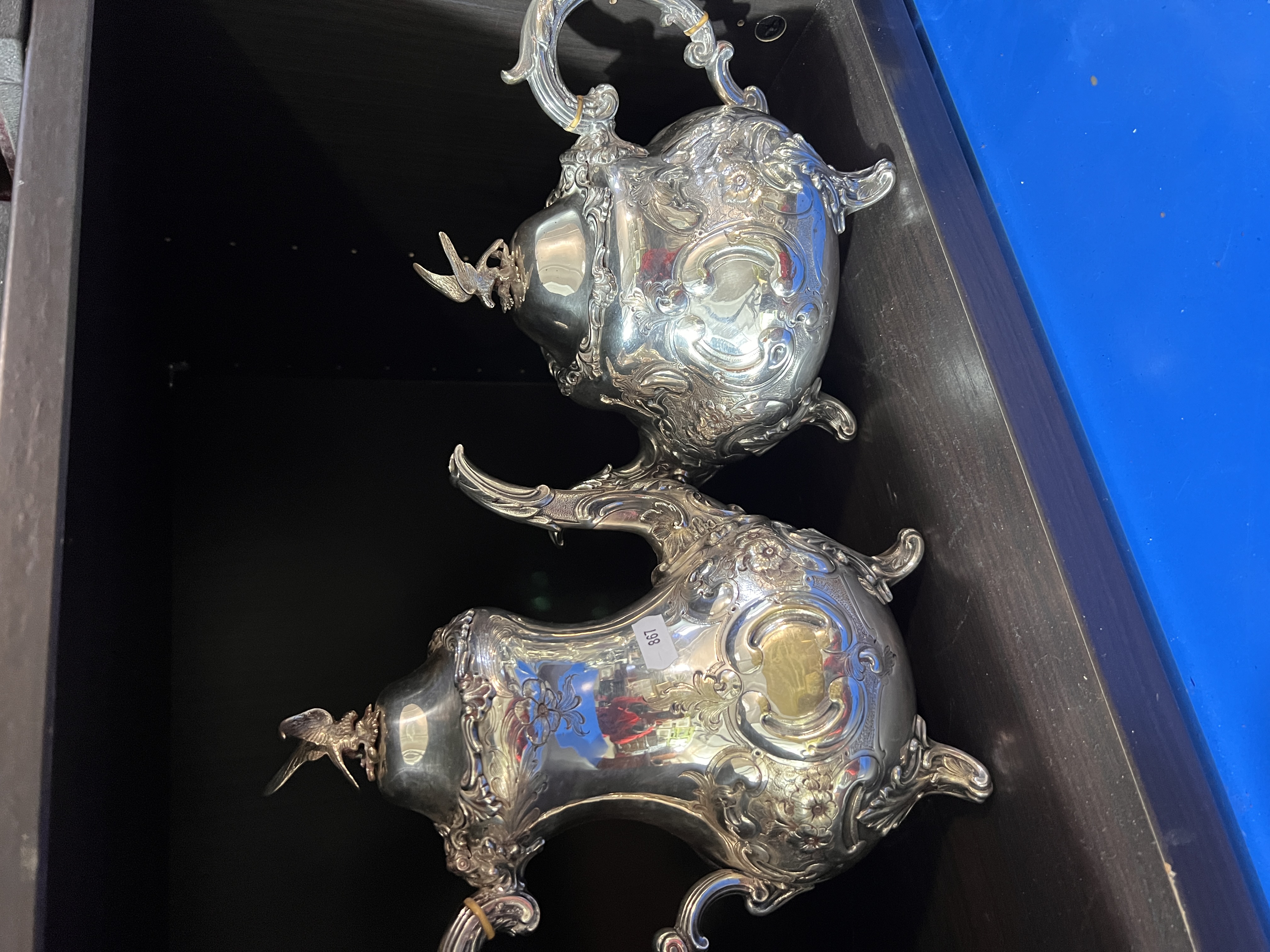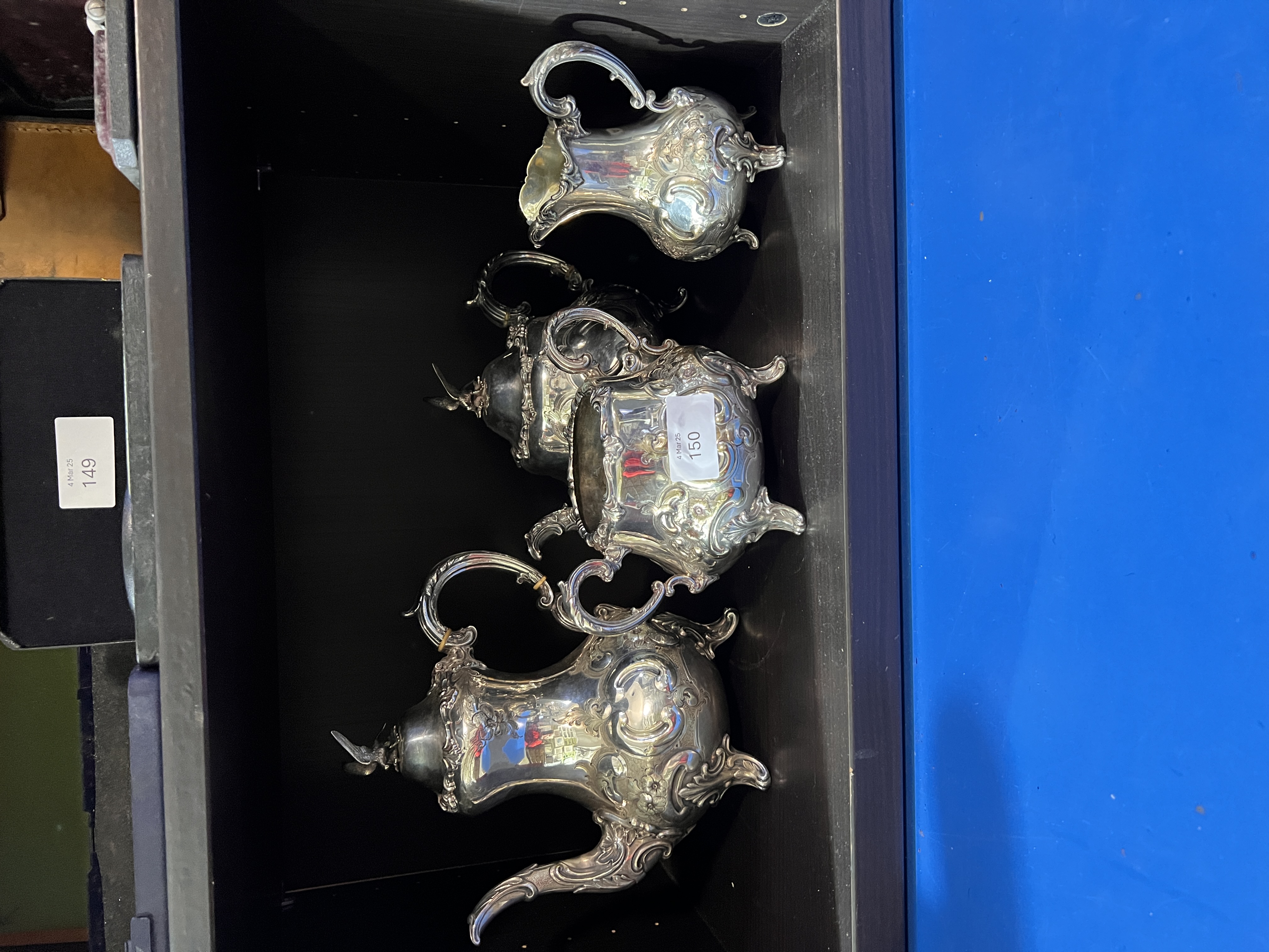 A Victorian silver plated tea set having embossed floral decoration. Including tea pot, water jug, creamer and sugar