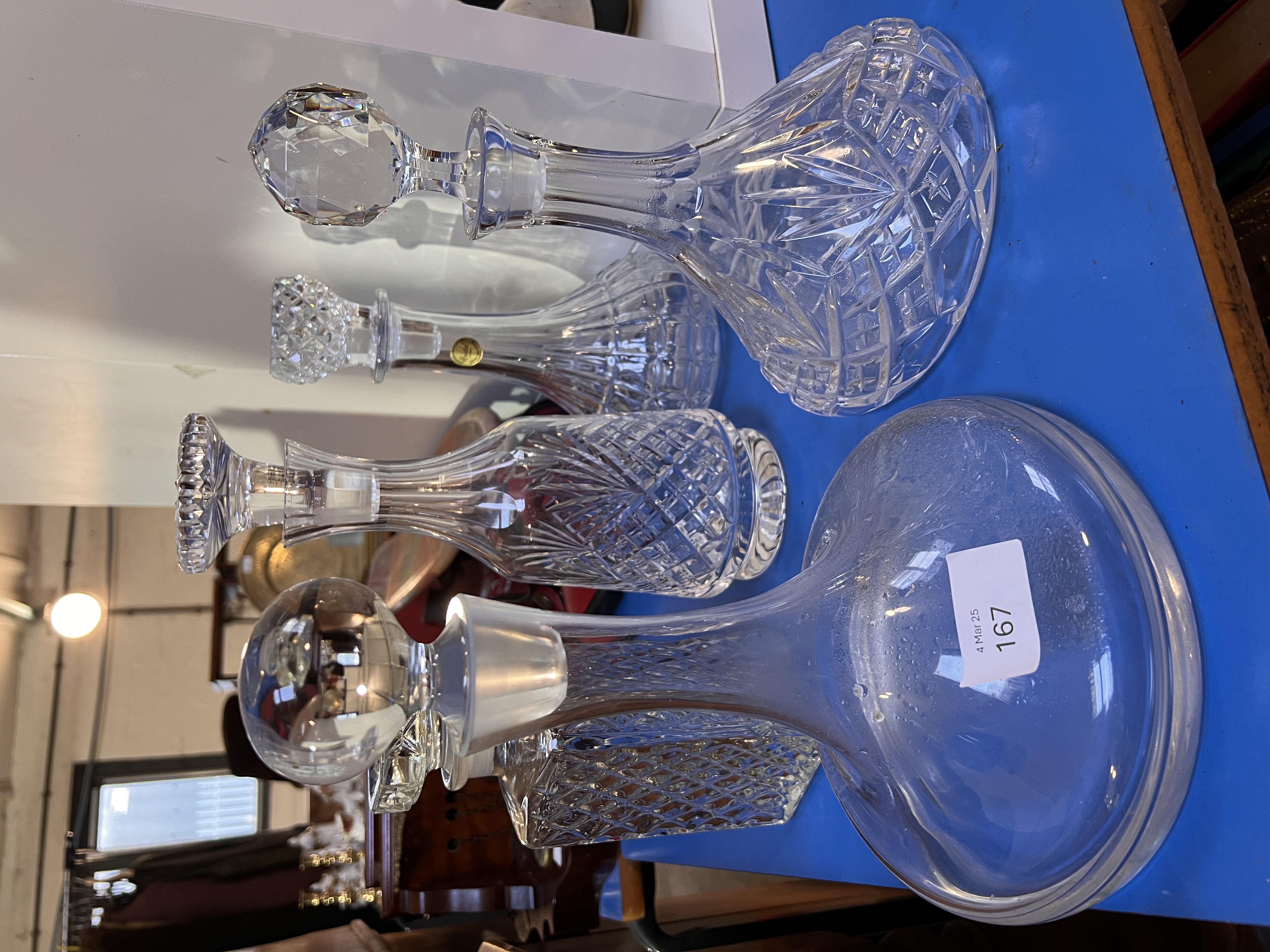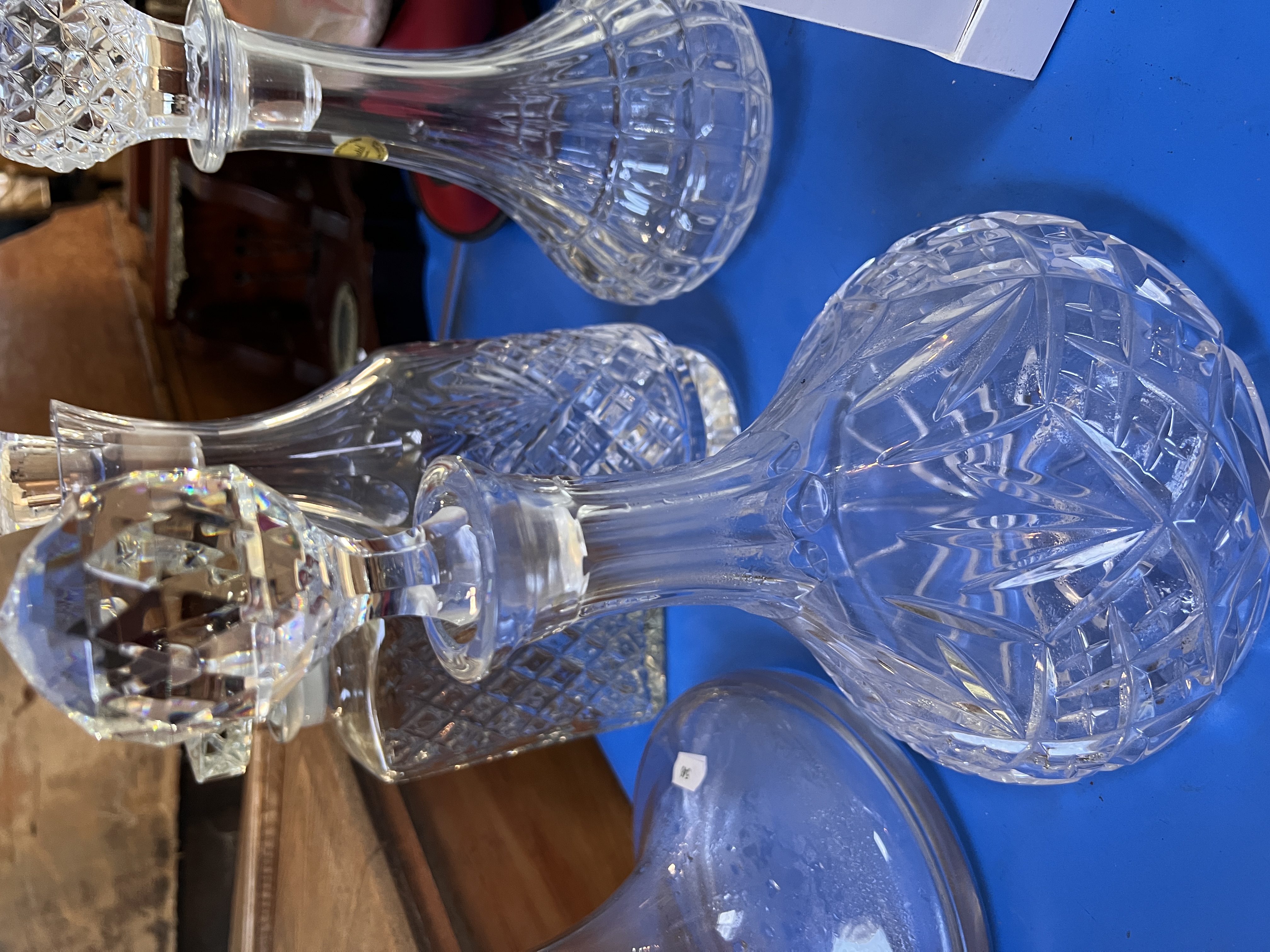 Five clear cut crystal glass decanters including ships style and Cristal