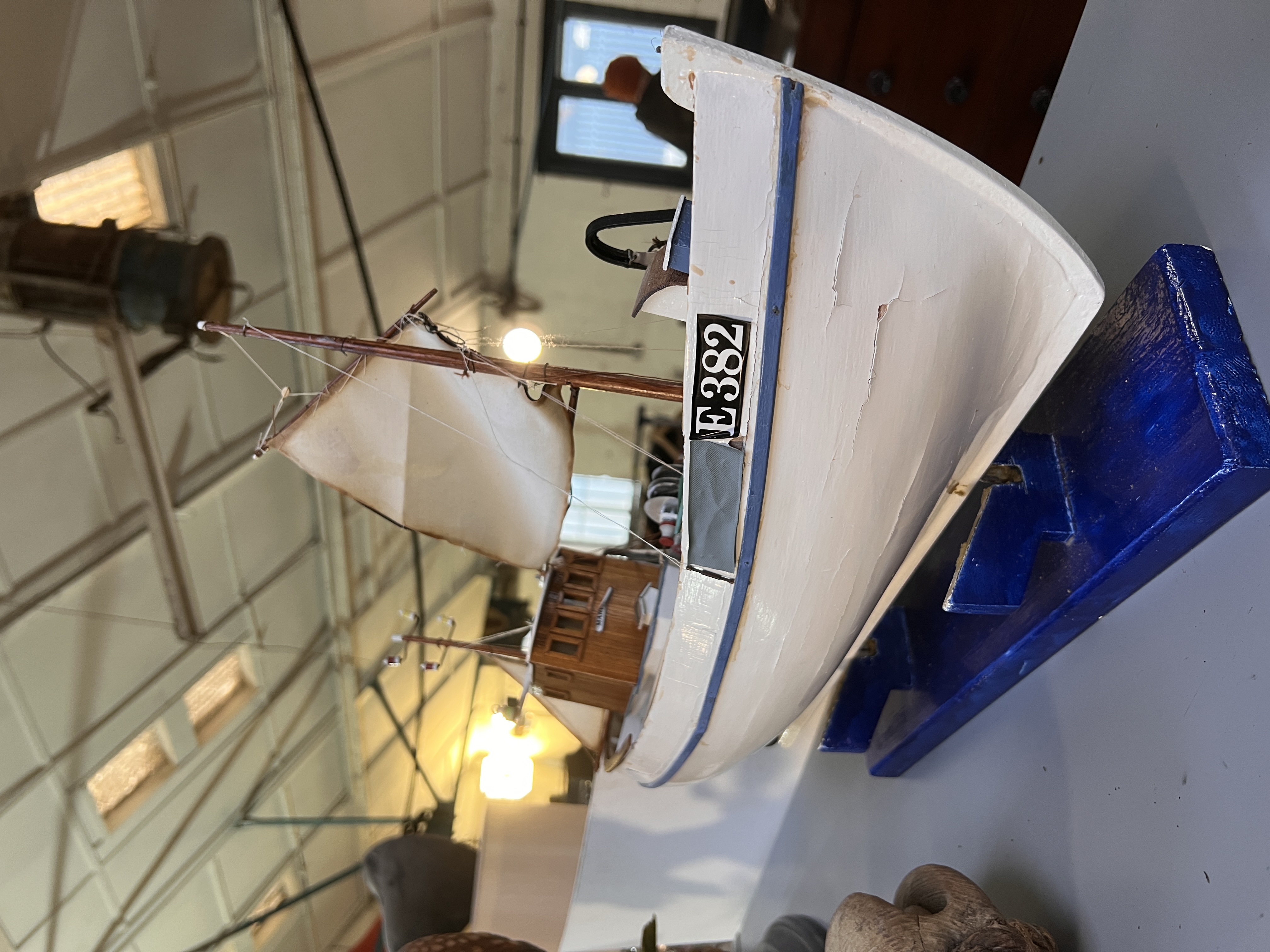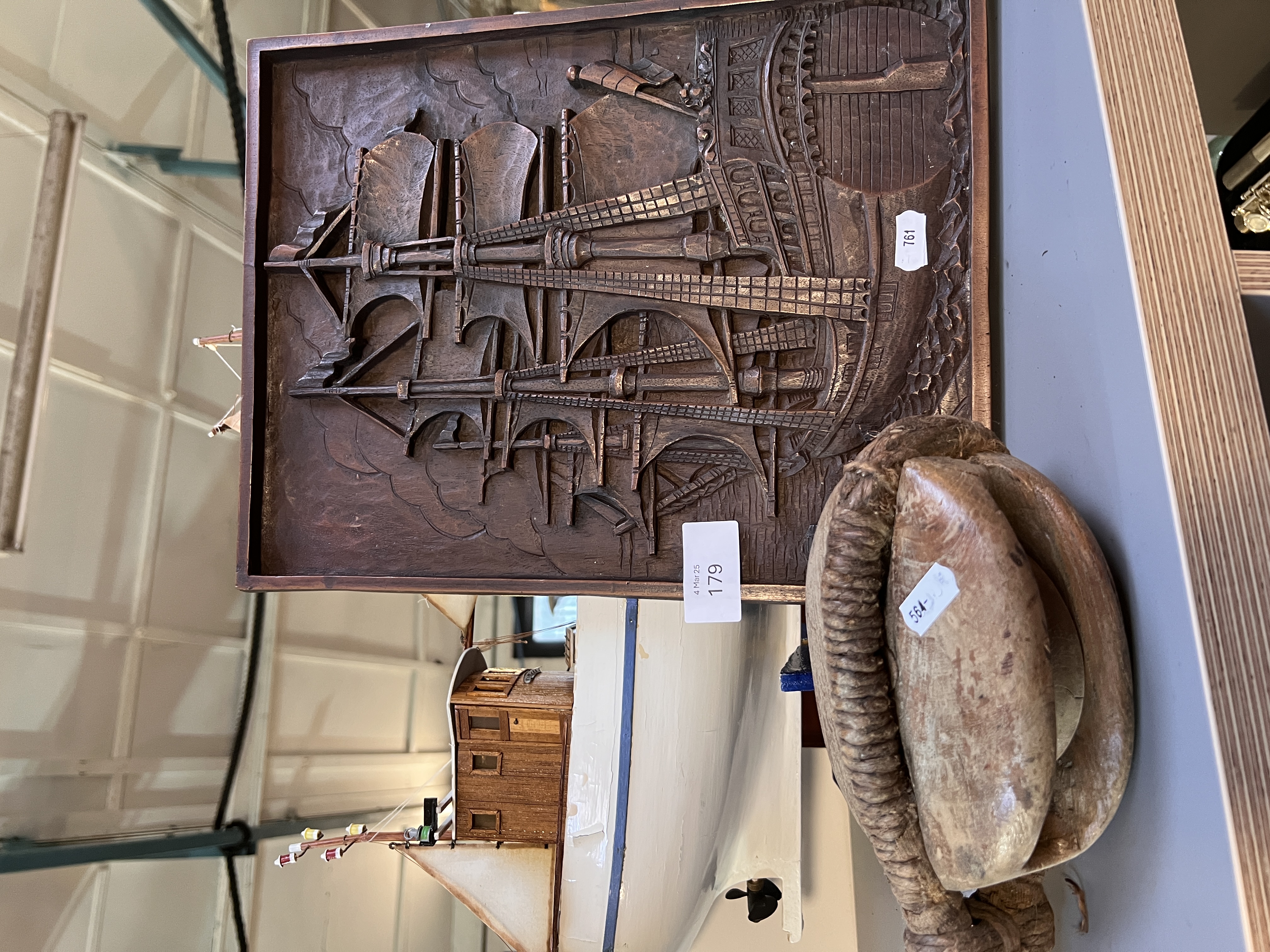 A selection of maritime themed items including model boat, wooden pulley and plaque