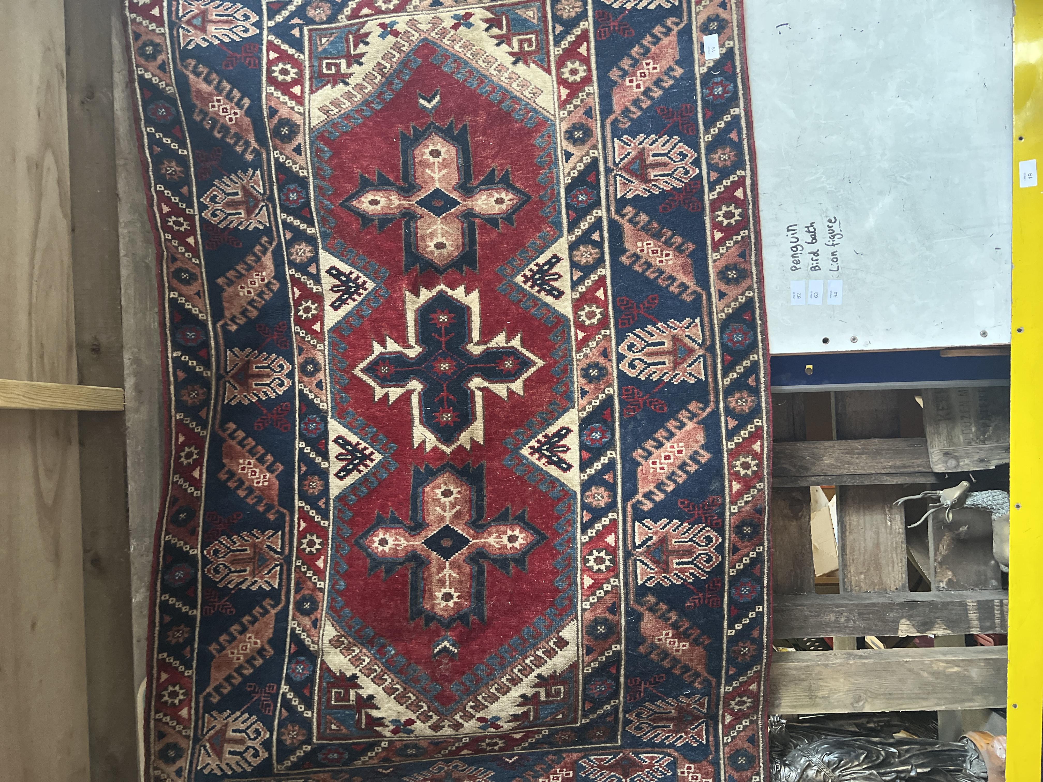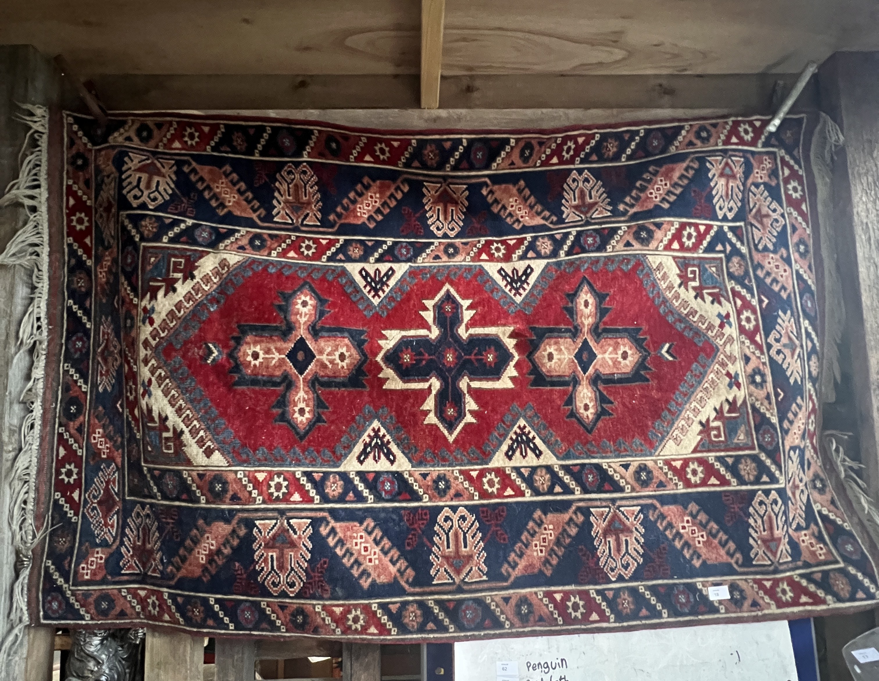 A vintage handwoven Turkish Antalya rug with blue and red ground 4ft x 6ft approx.