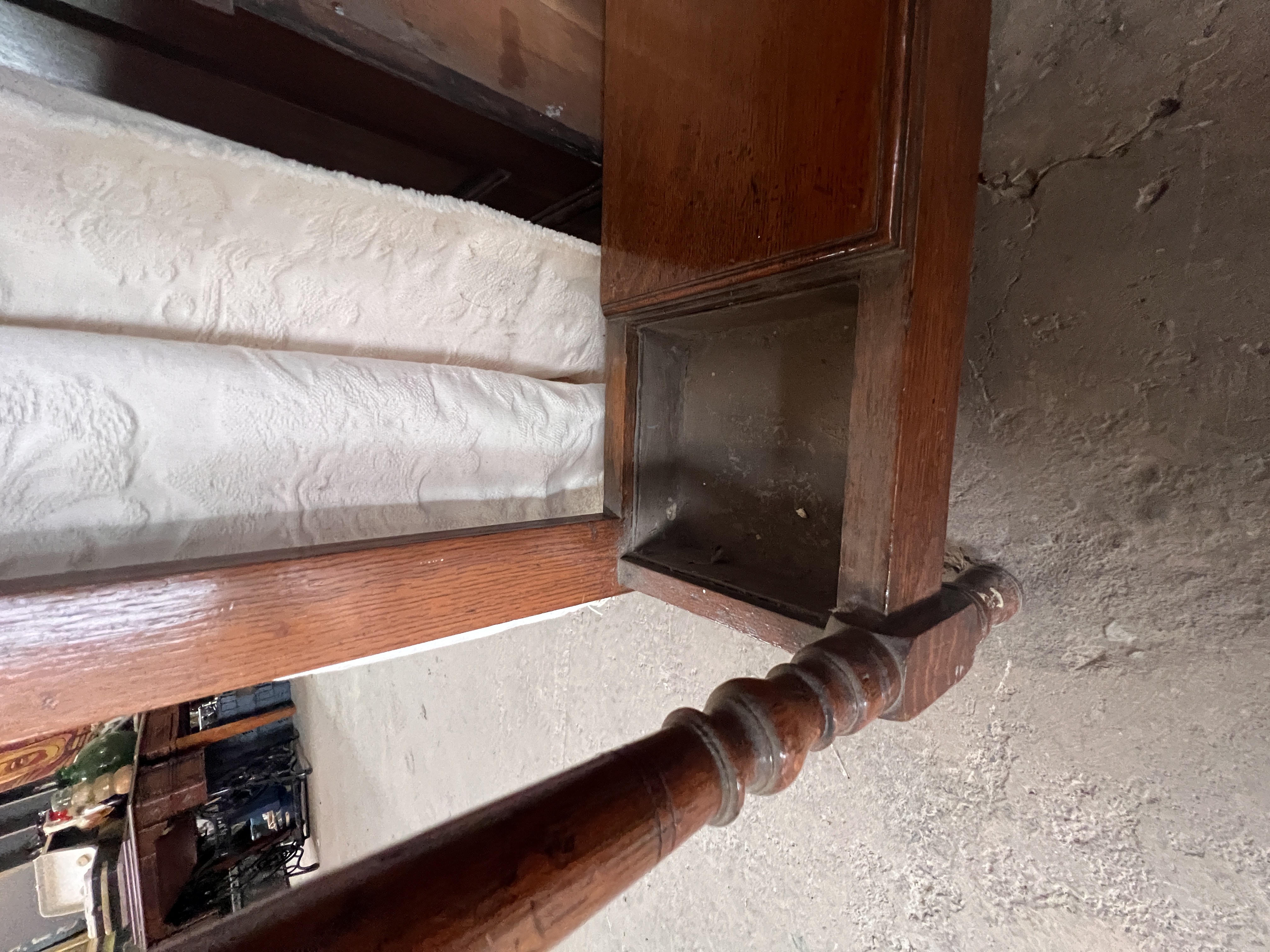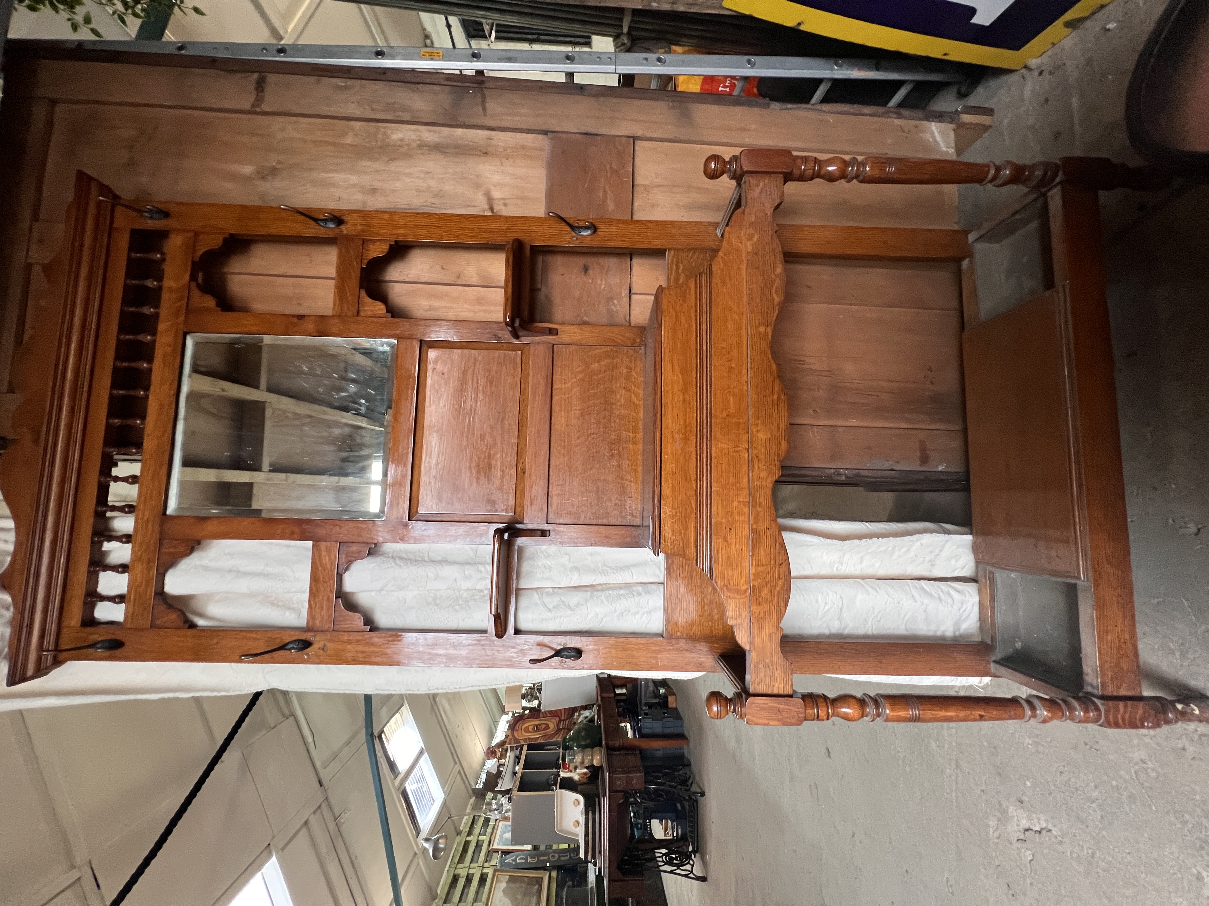 Edwardian oak framed hallway coat stand with mirror back and metal tray linings.
