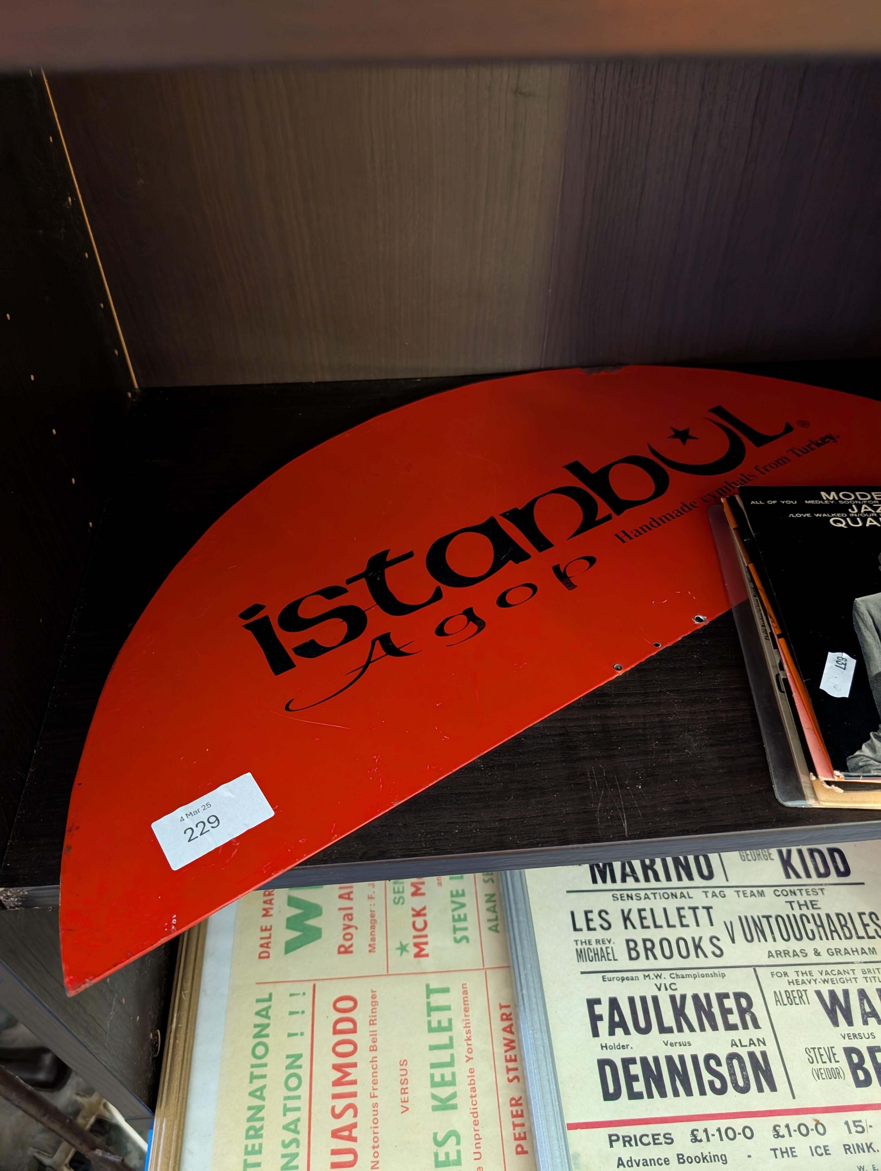 A vintage metal advertising sing or Istanbul handmade cymbals
