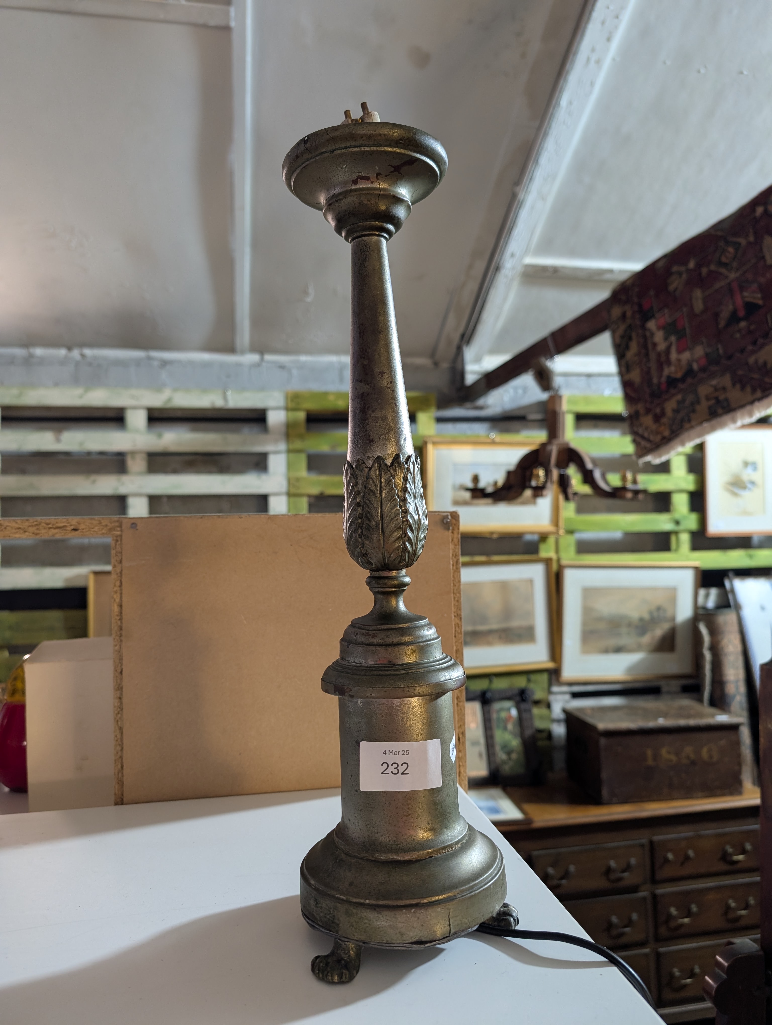 An antique side lamp having embossed metal body