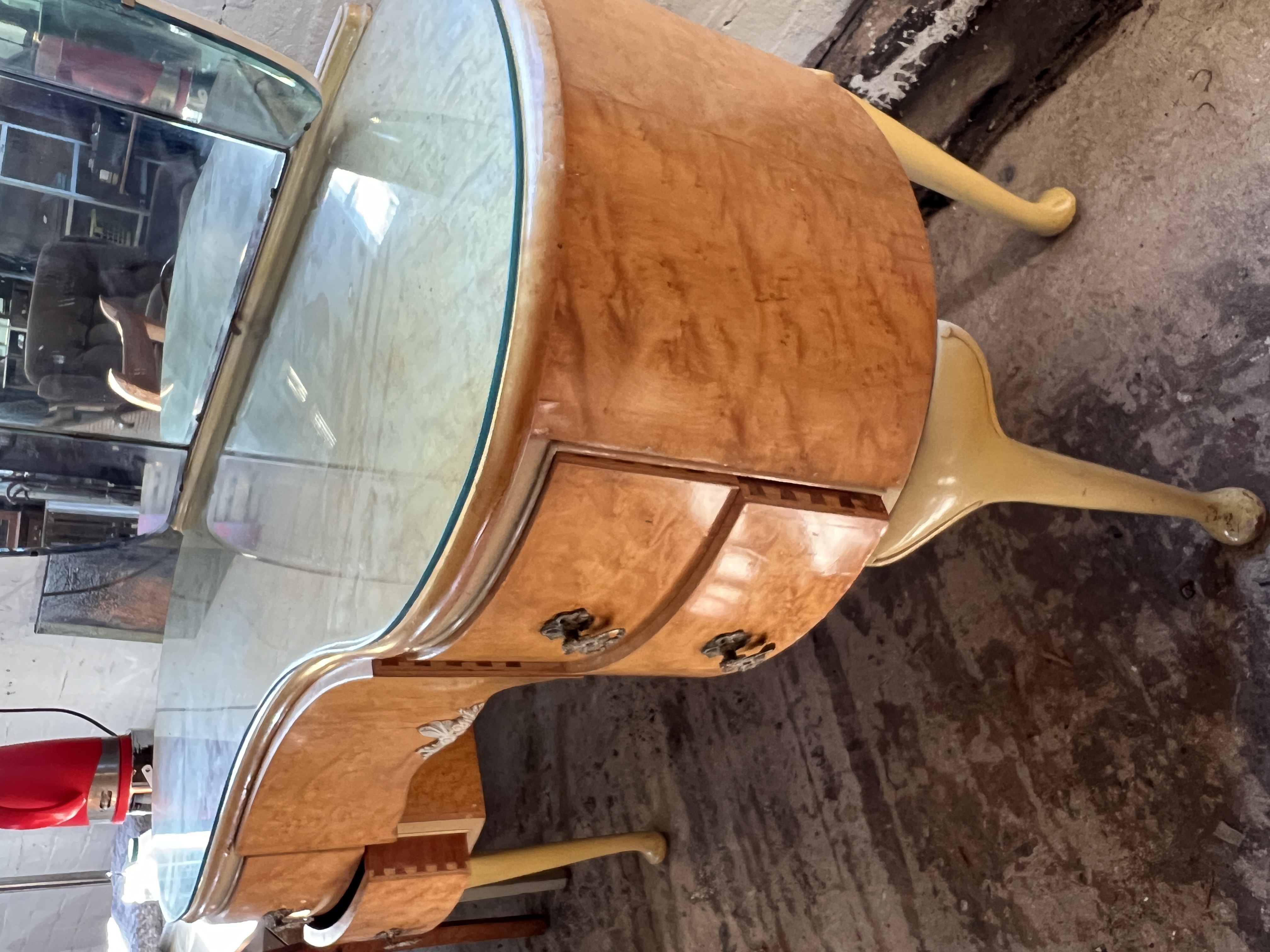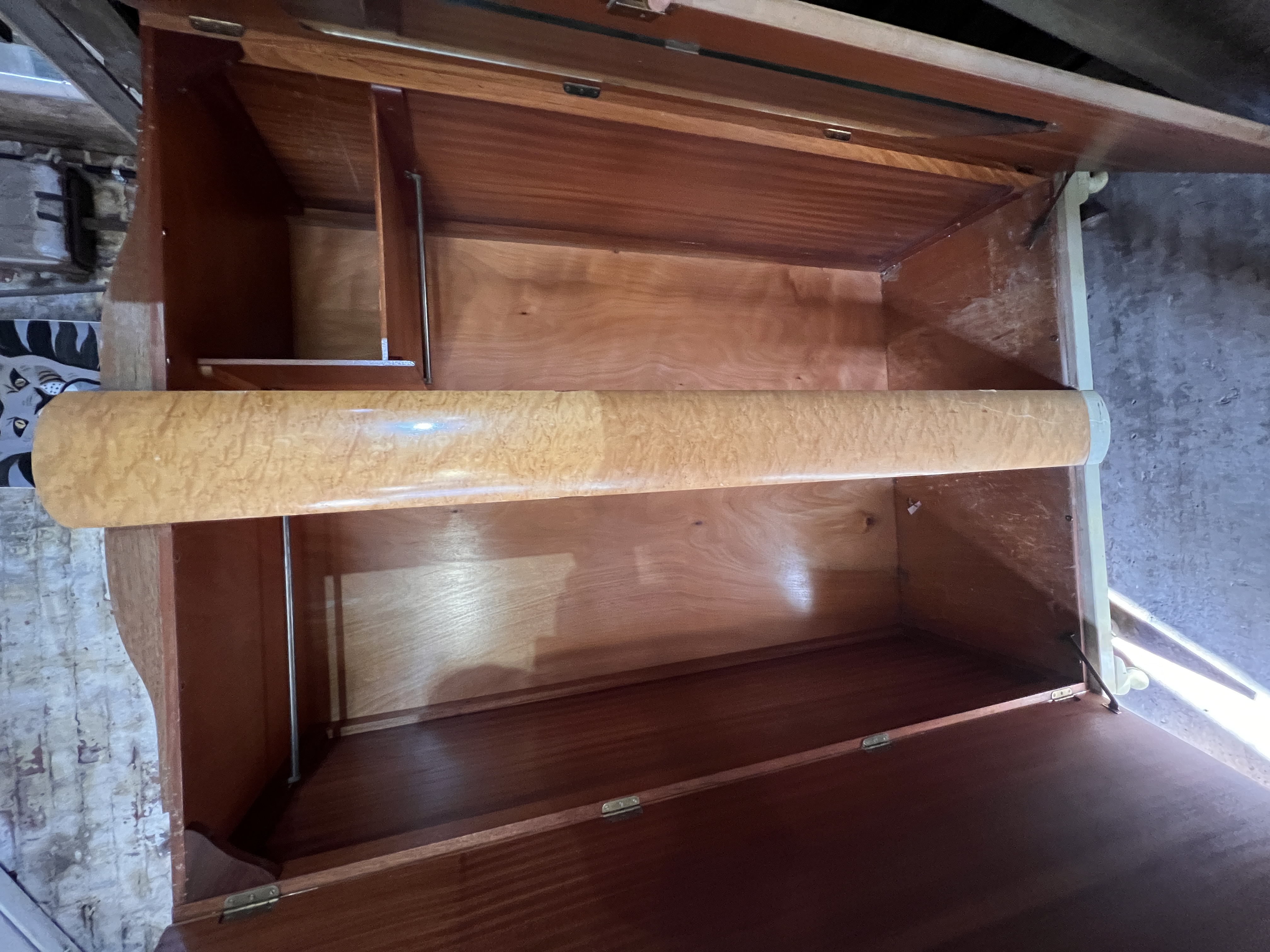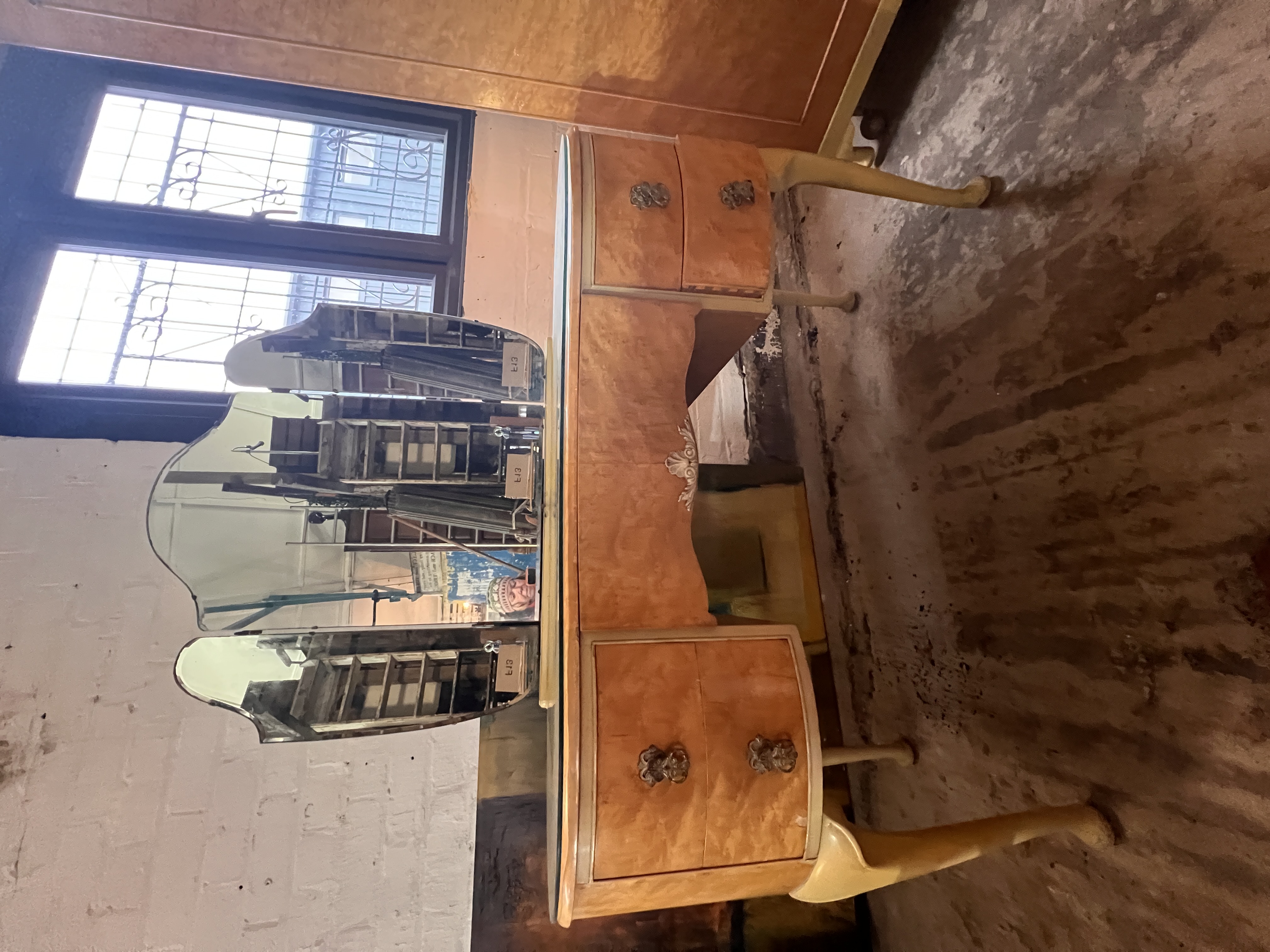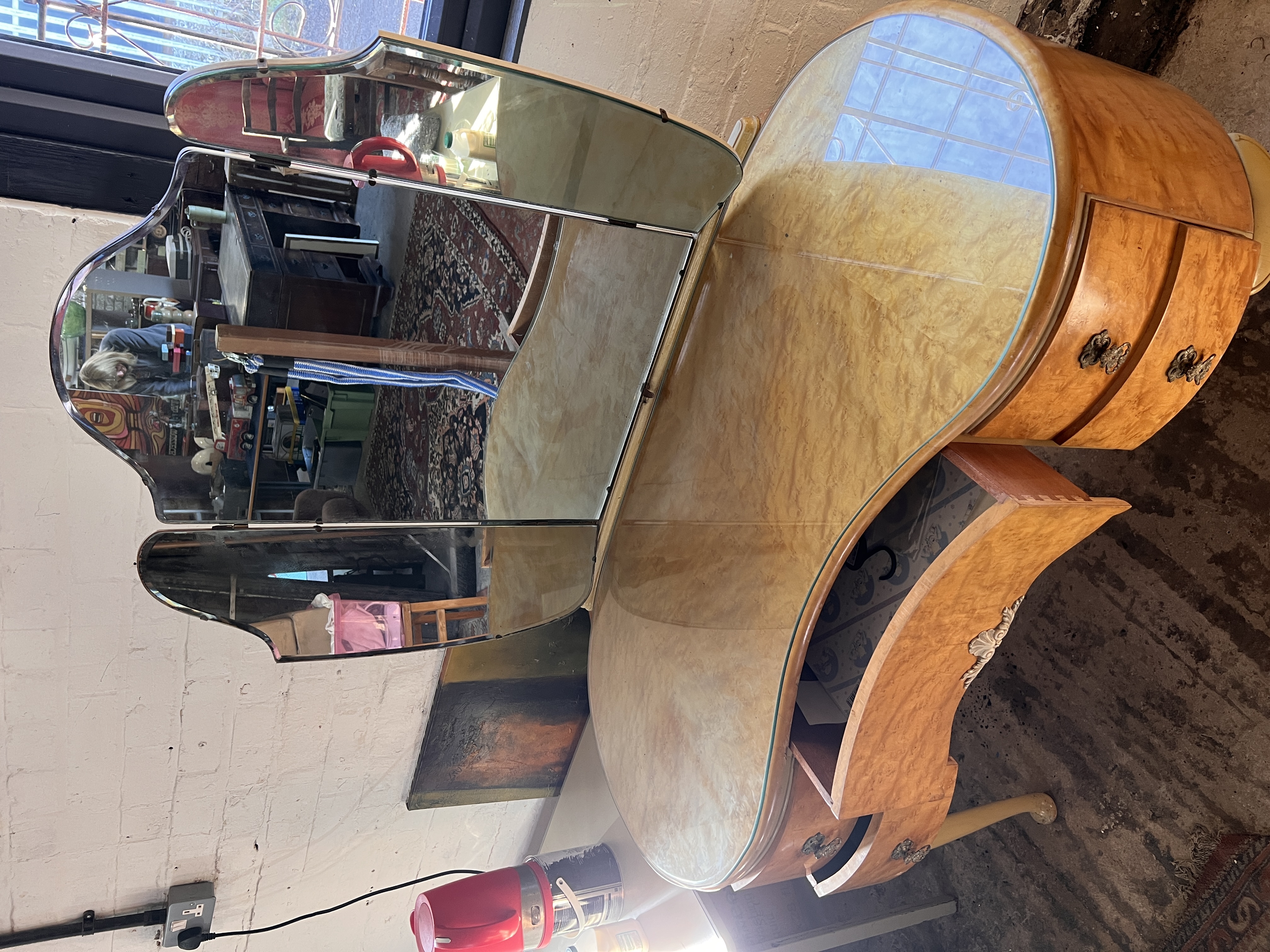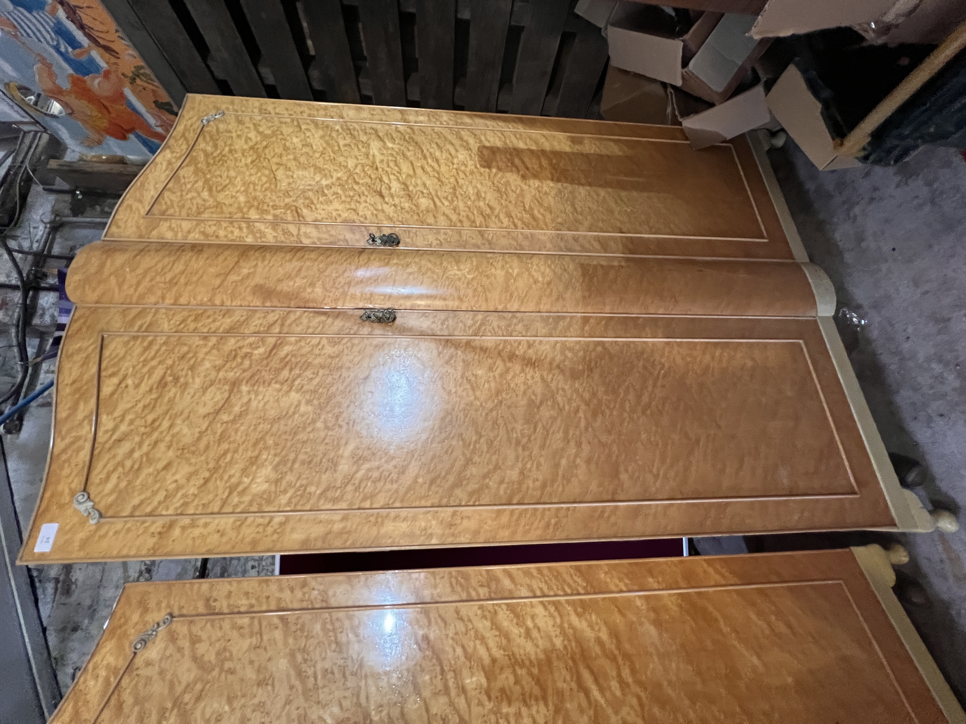 A mid-century Art Deco design Cabinet Works Ltd bedroom suite in birdseye maple. Double wardrobe, smaller fitted wardrobe and dressing table.