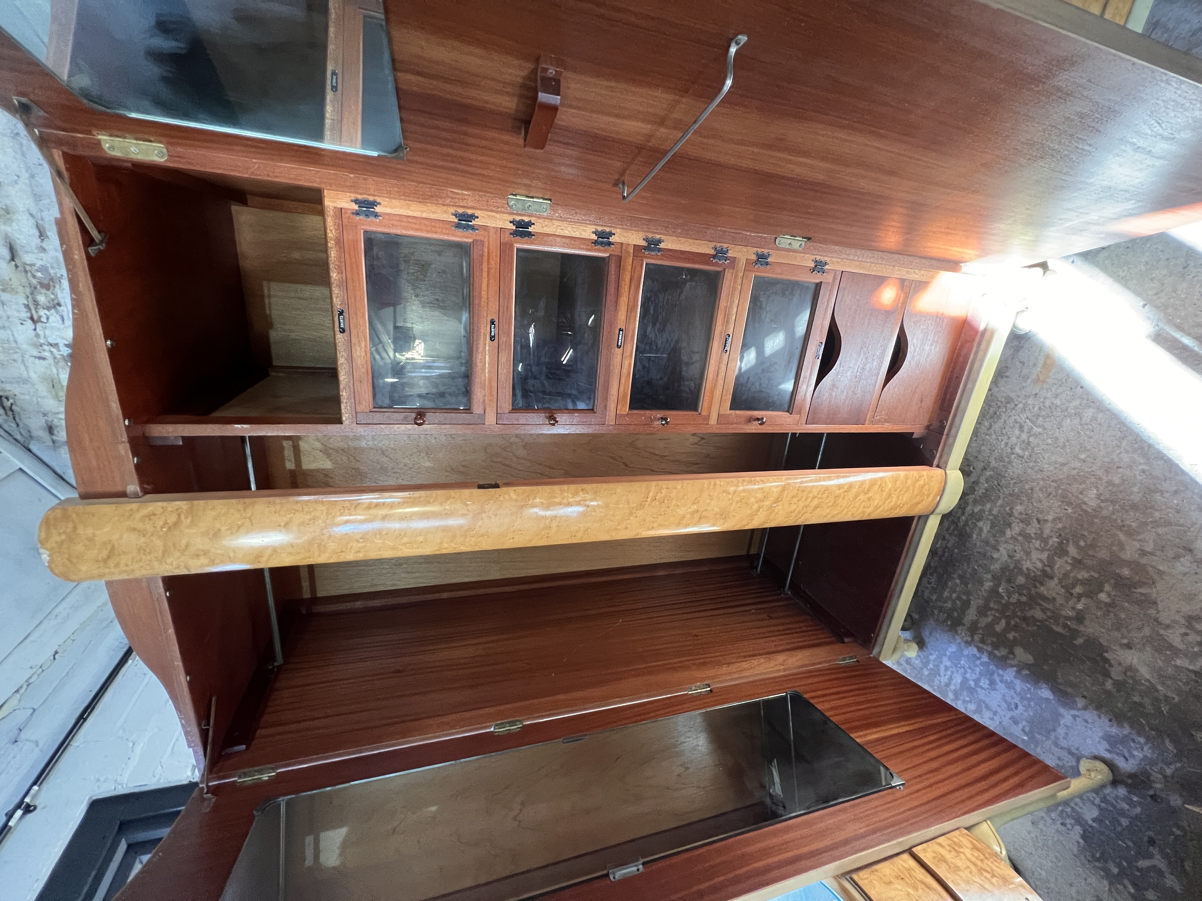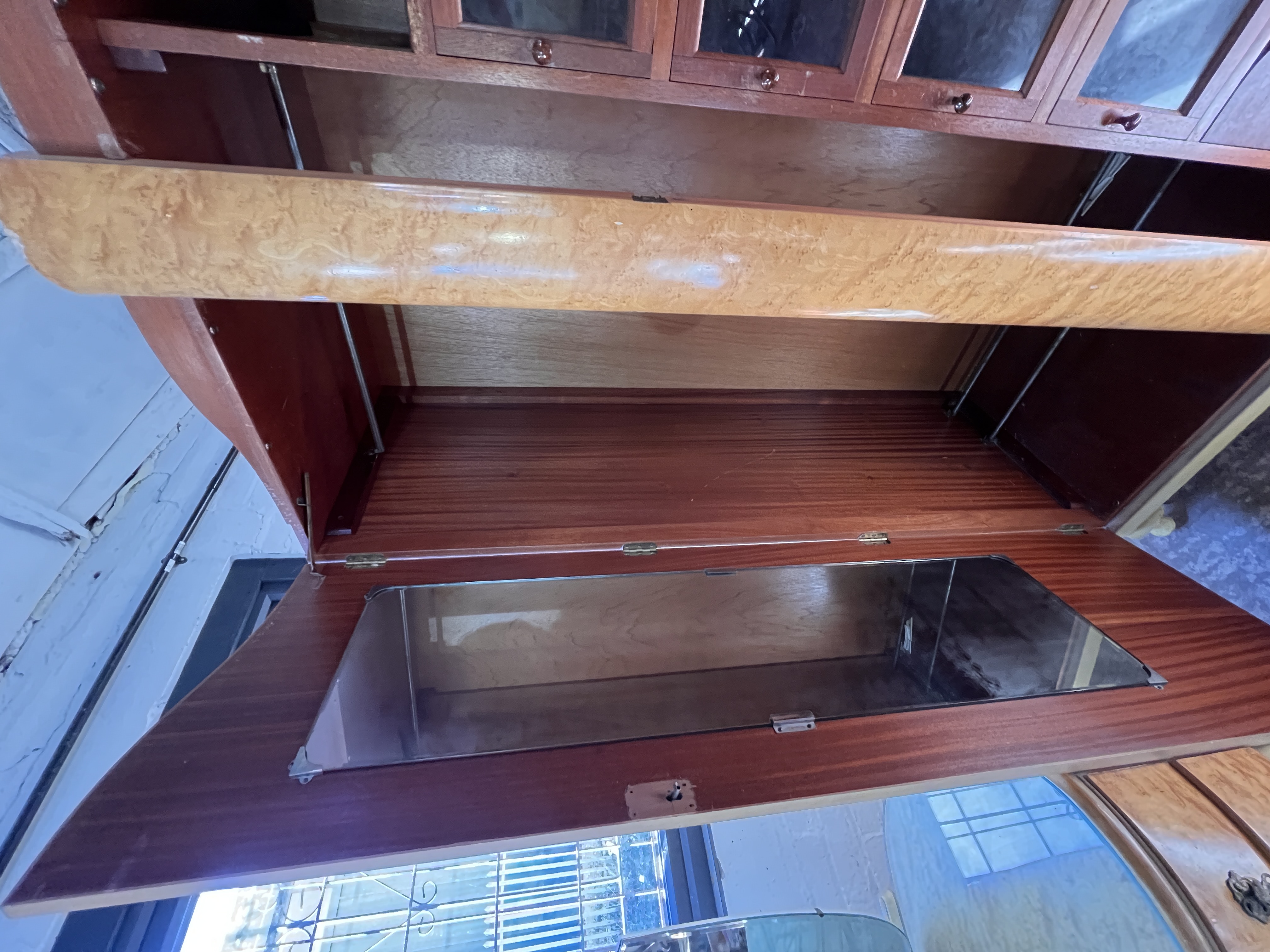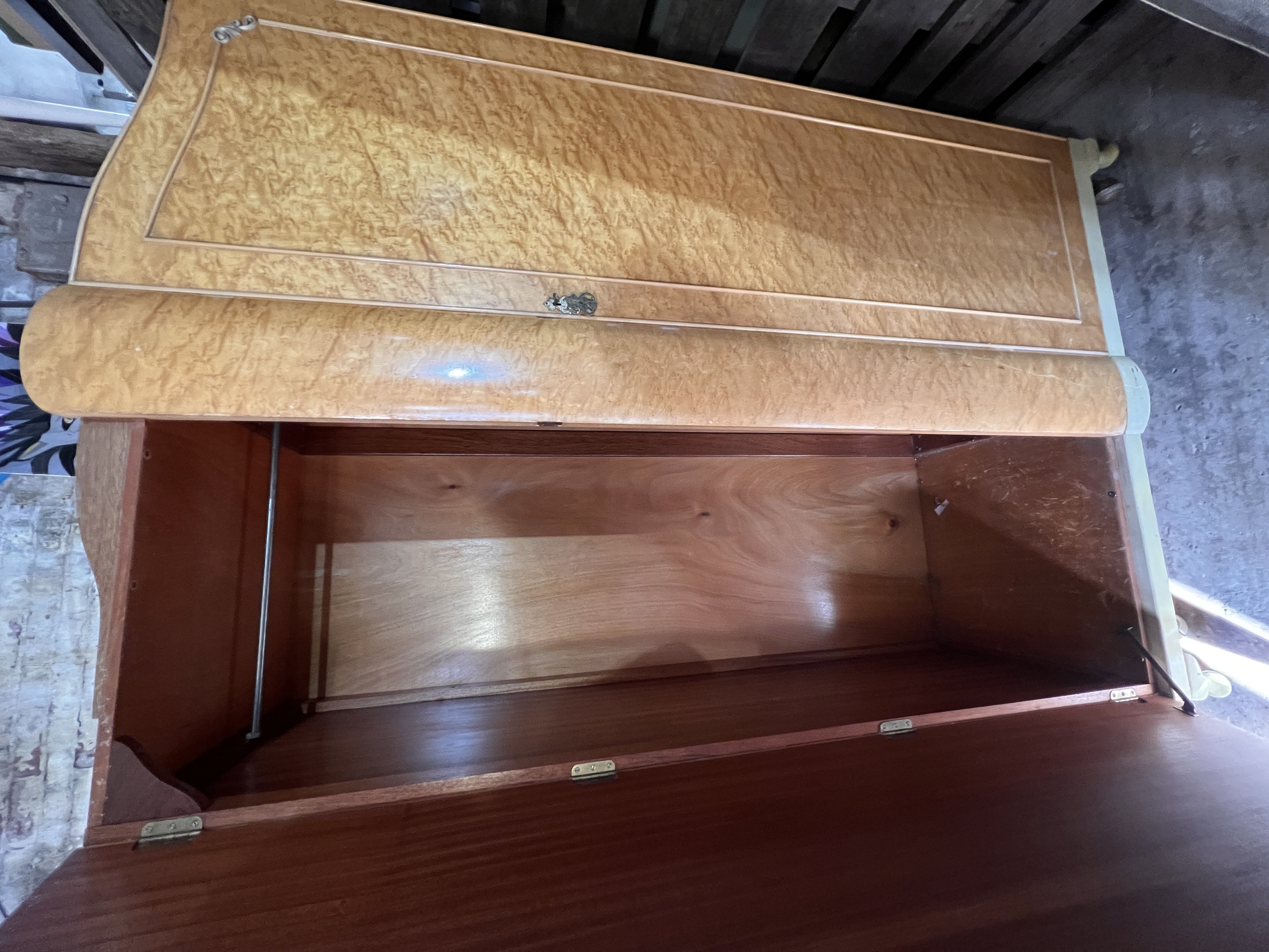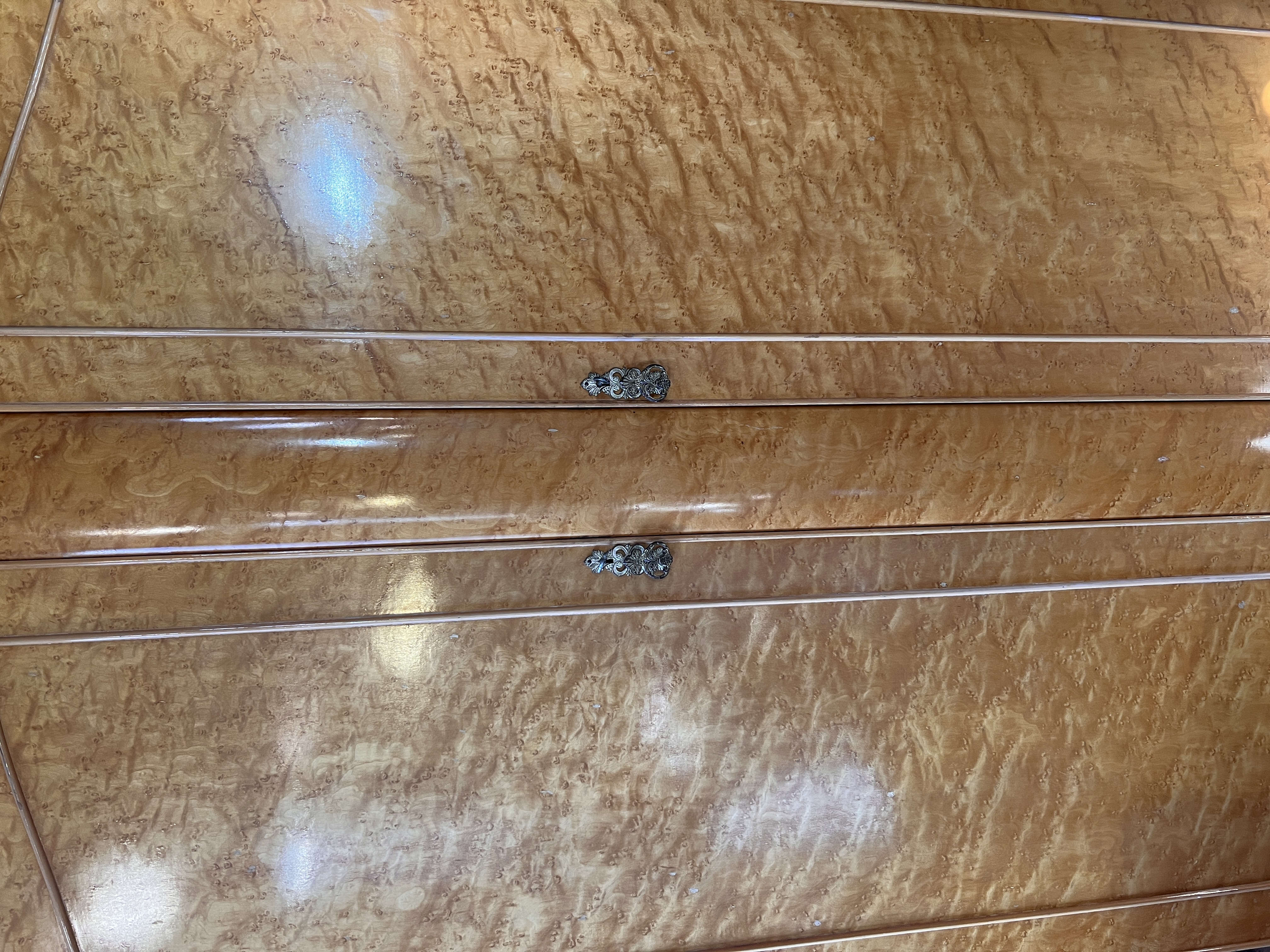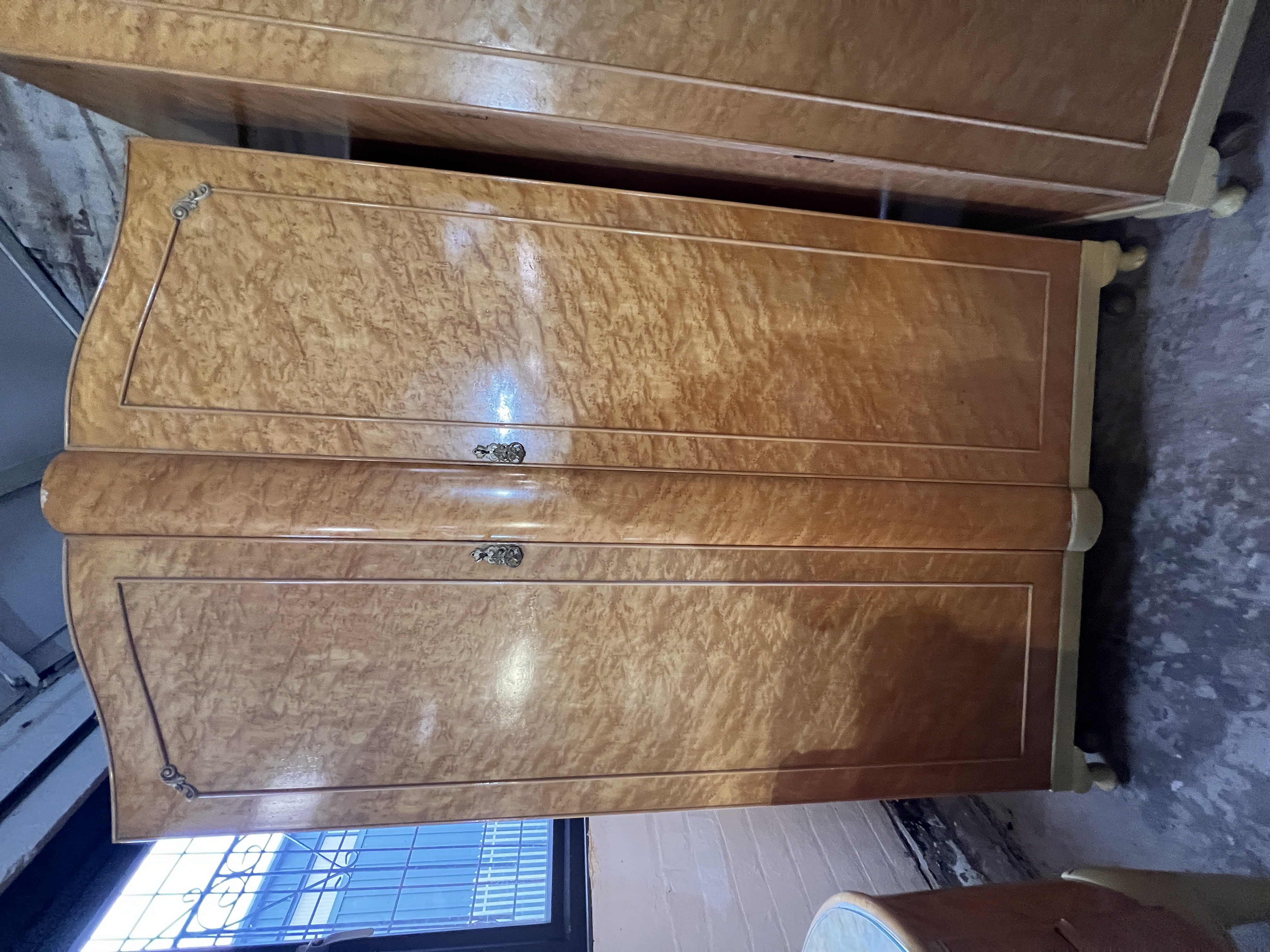 A mid-century Art Deco design Cabinet Works Ltd bedroom suite in birdseye maple. Double wardrobe, smaller fitted wardrobe and dressing table.
