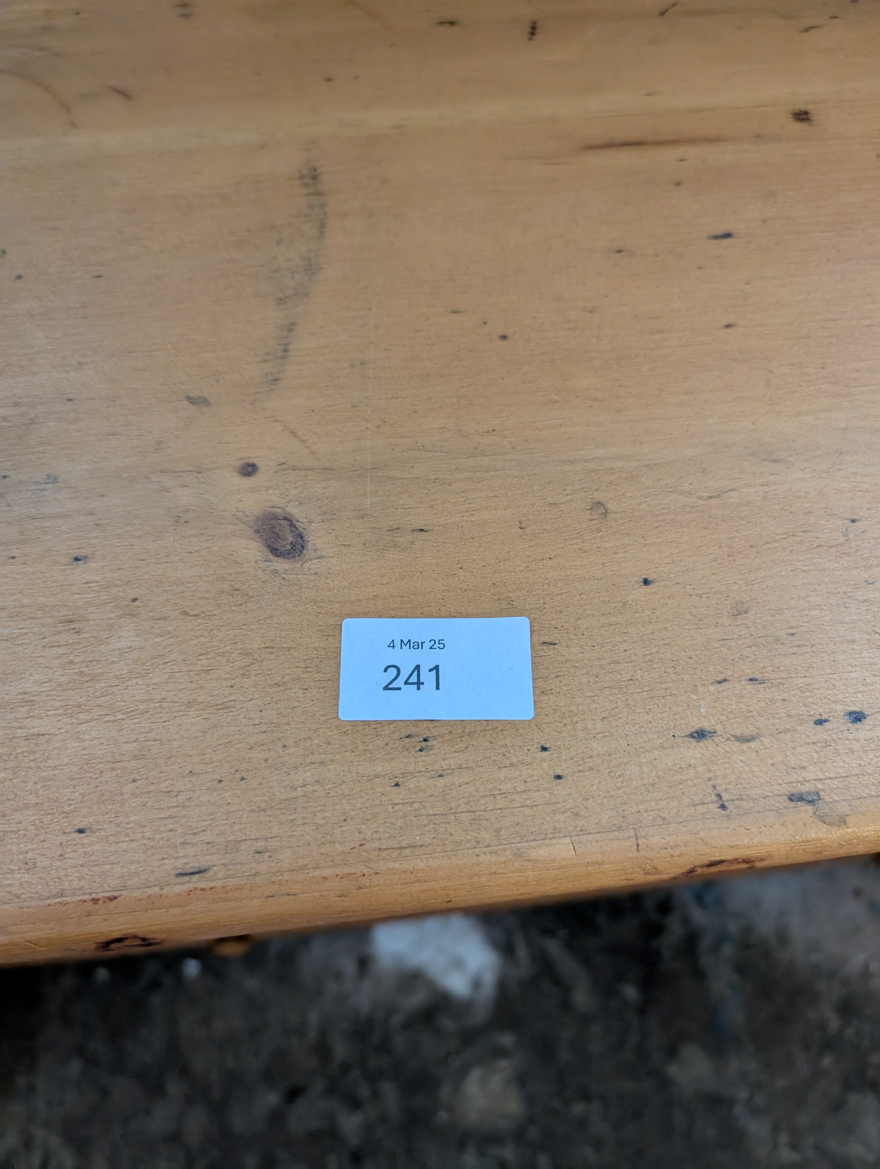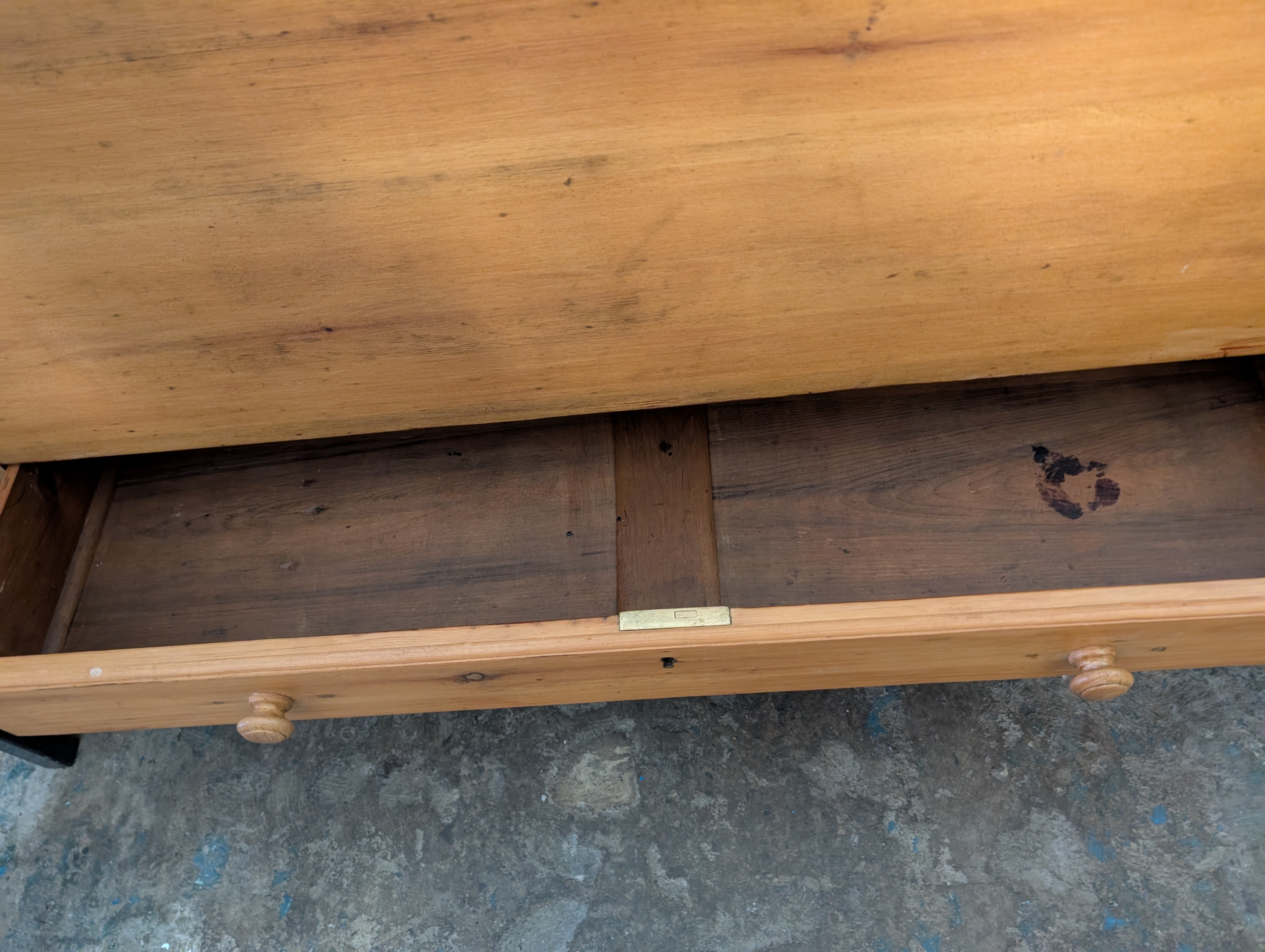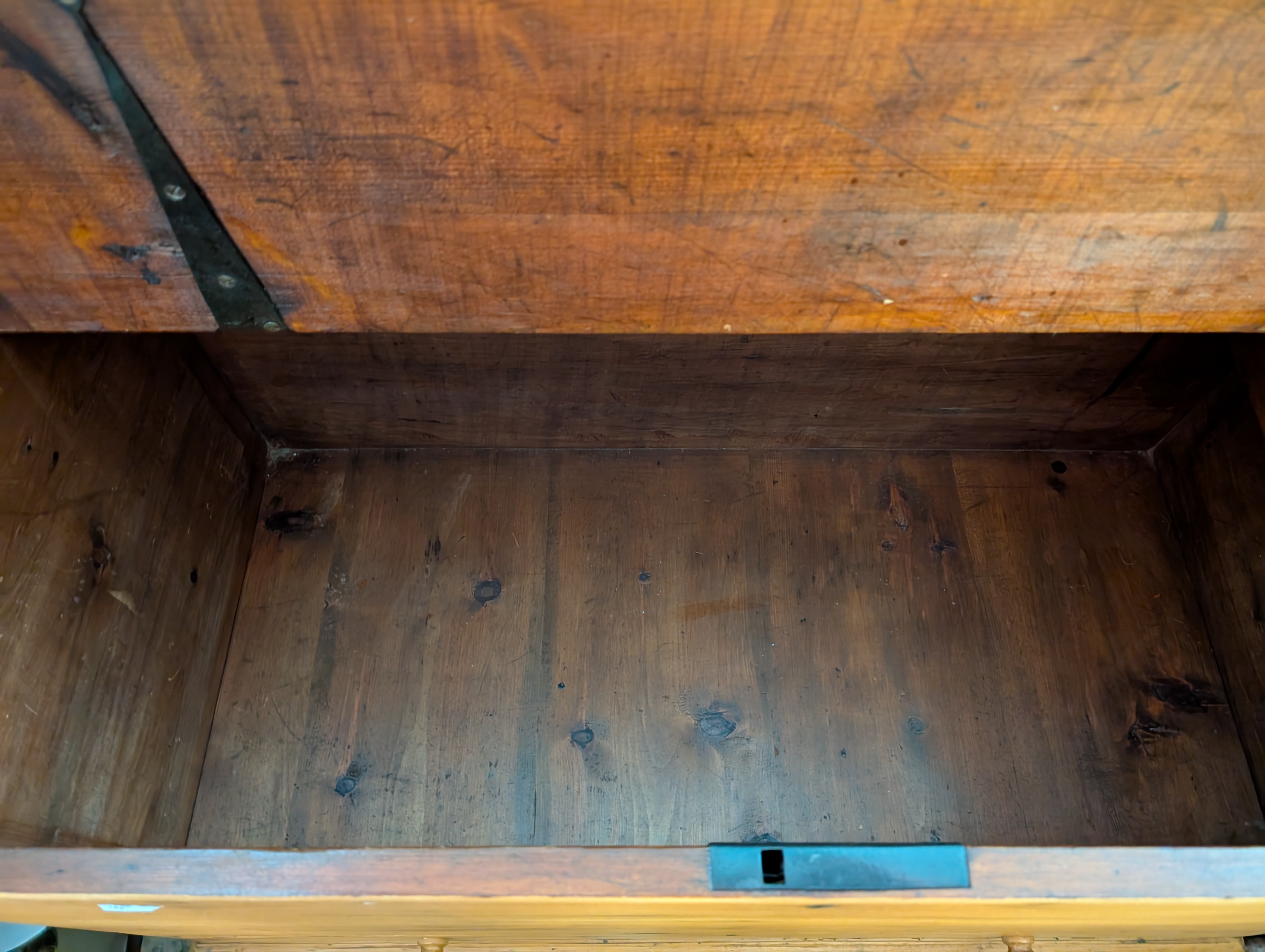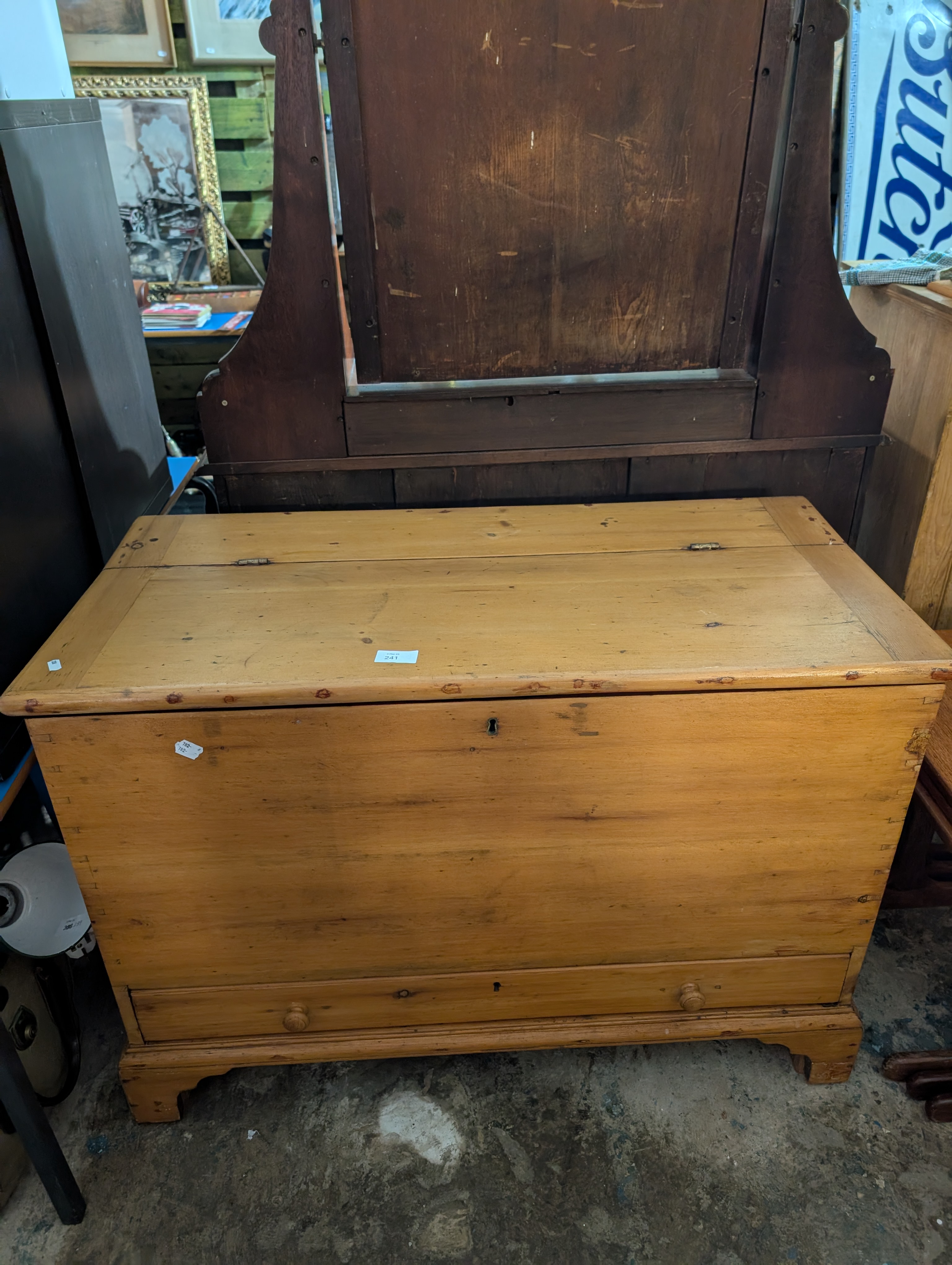 A yellow pine bedding box with single drawer turned handles and hinged lid