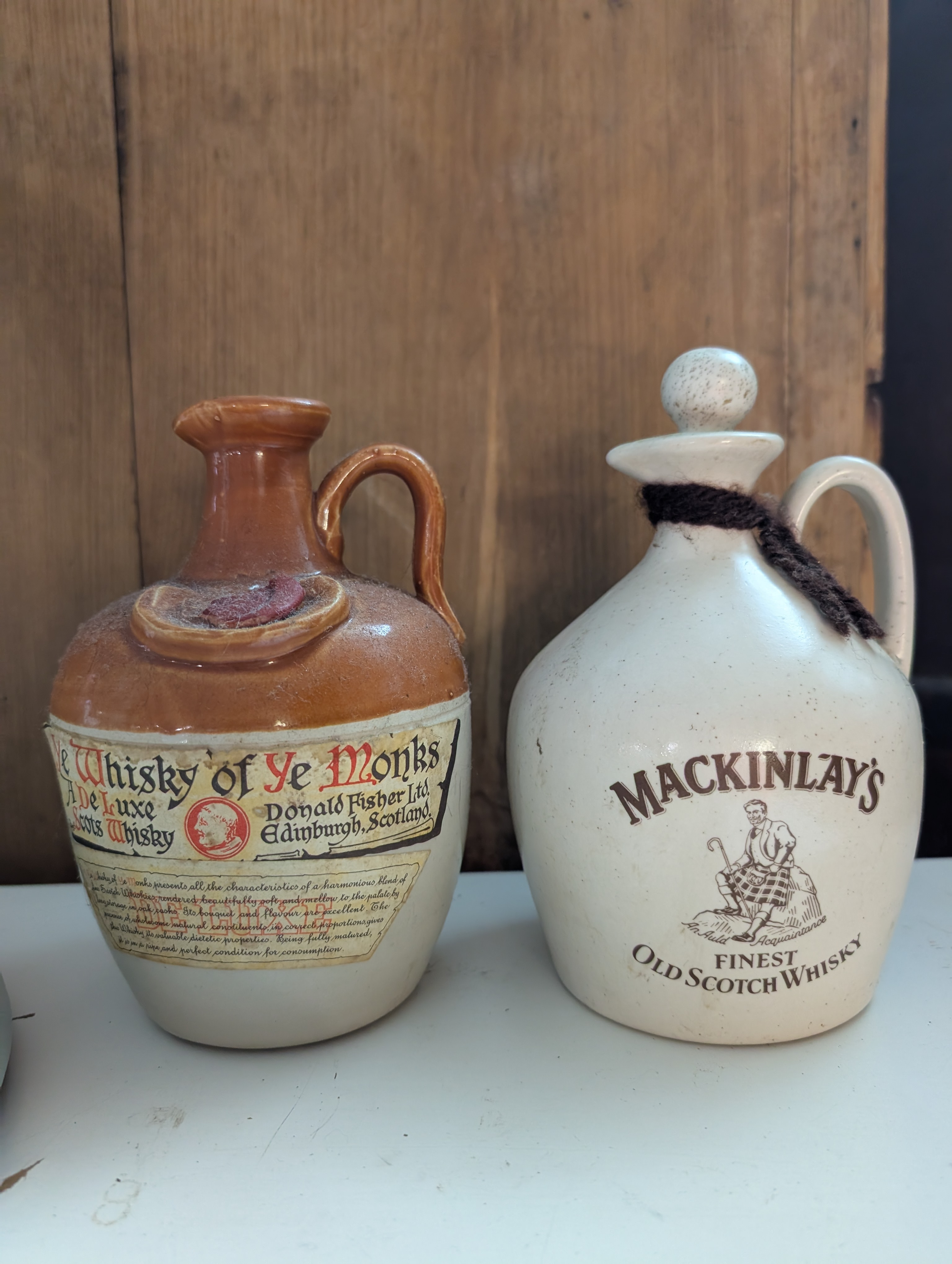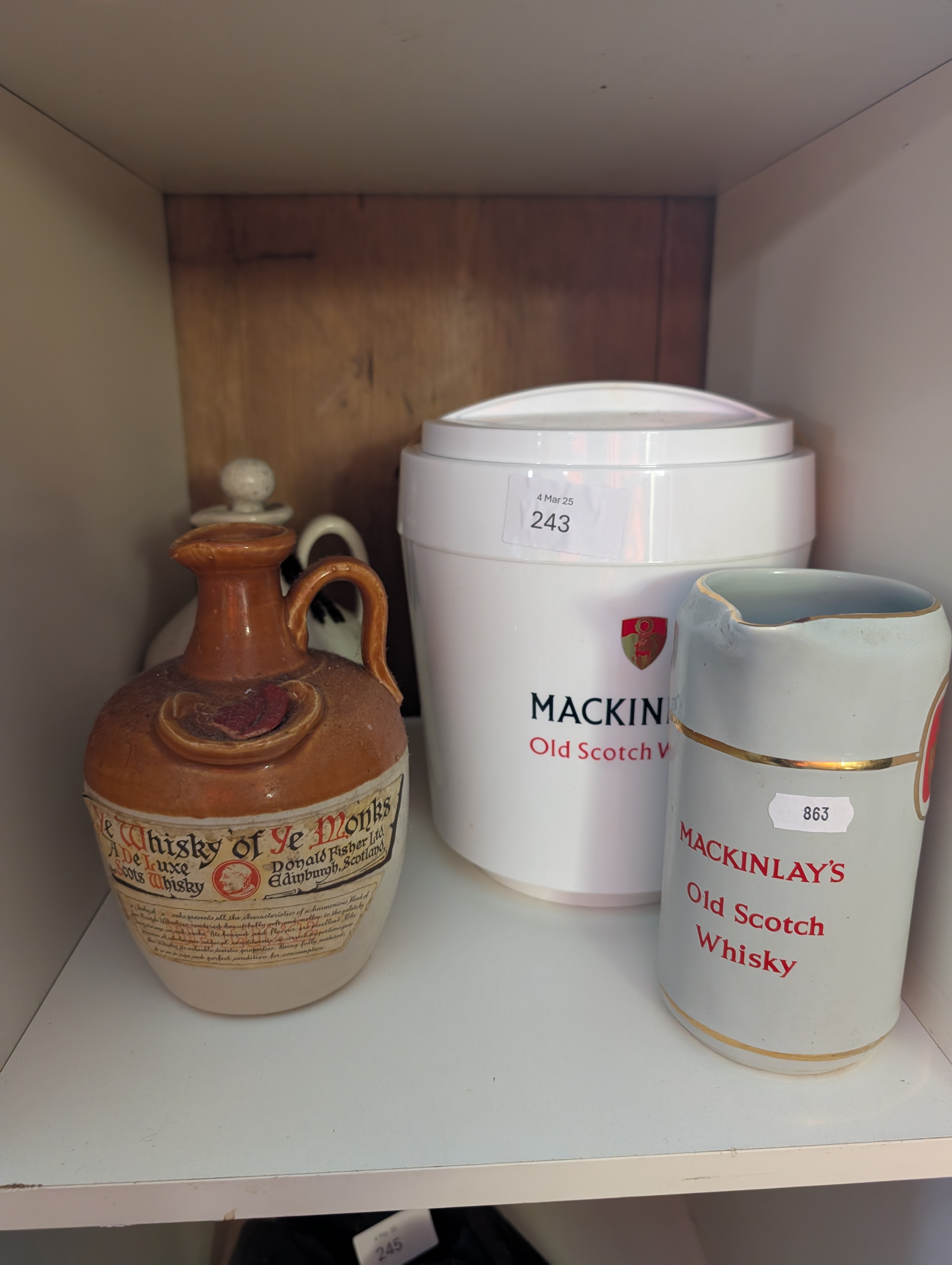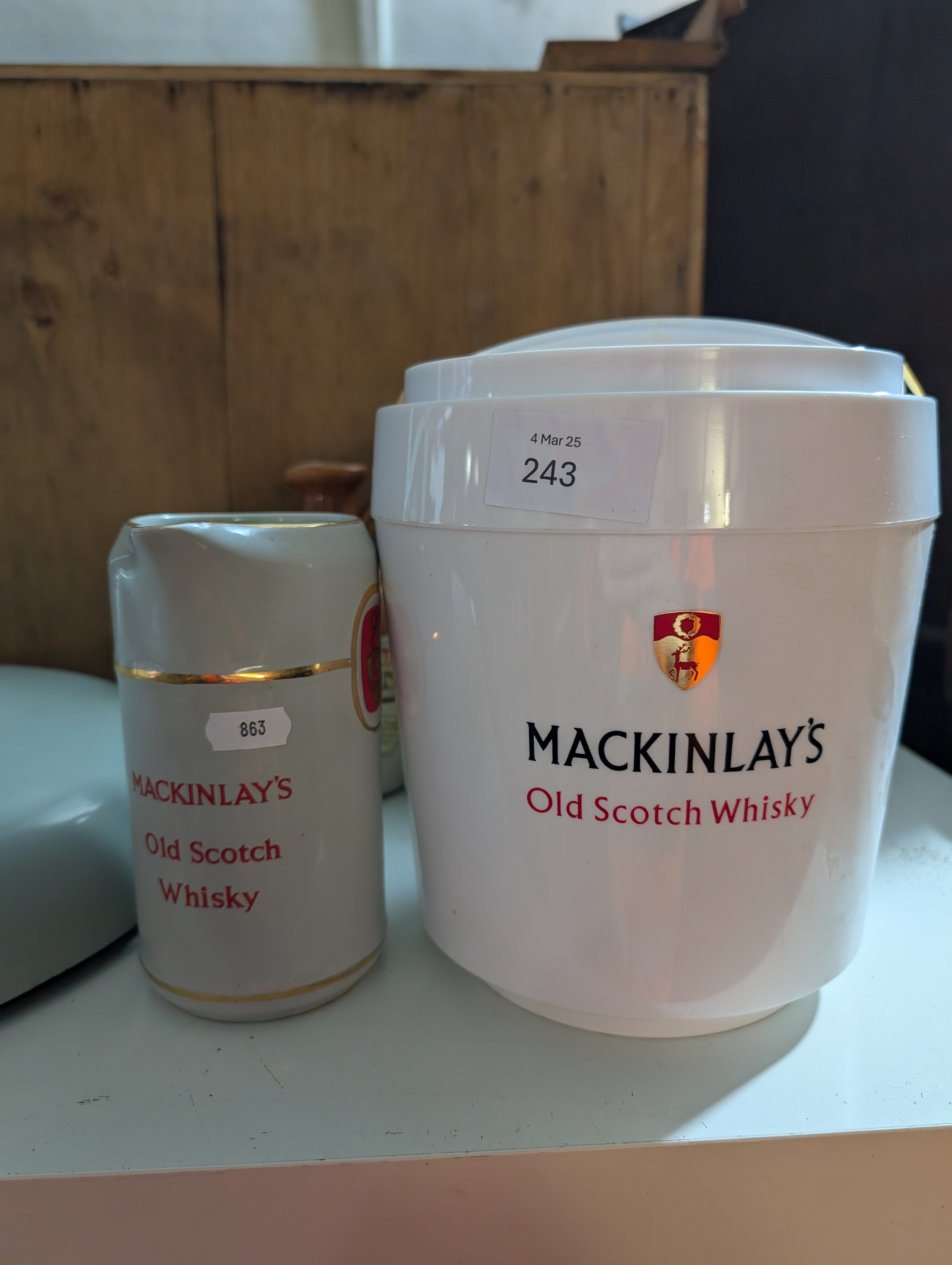 A Mackinlays Old Scotch Whisky ice bucket with decanter and two ceramic bottles