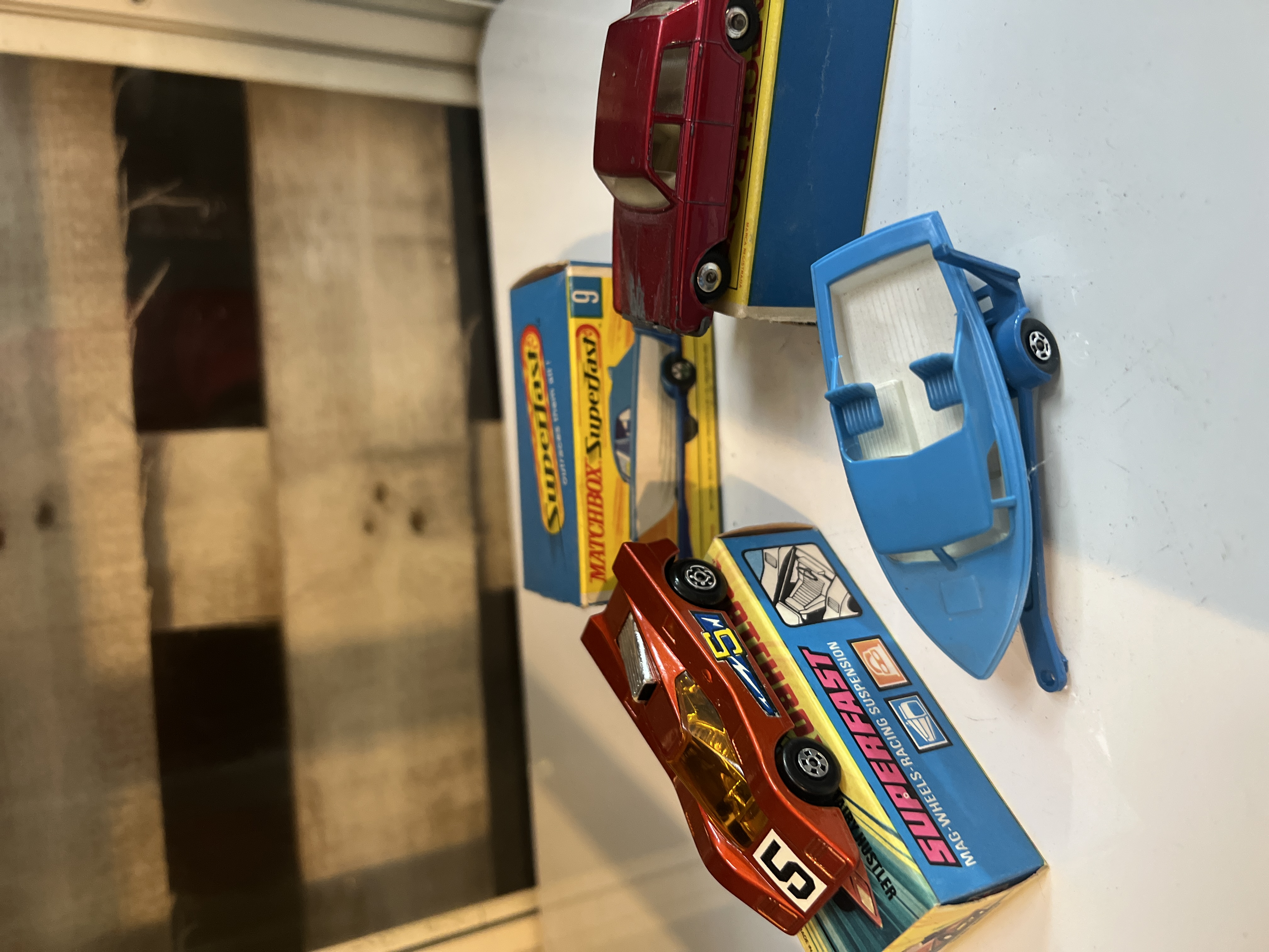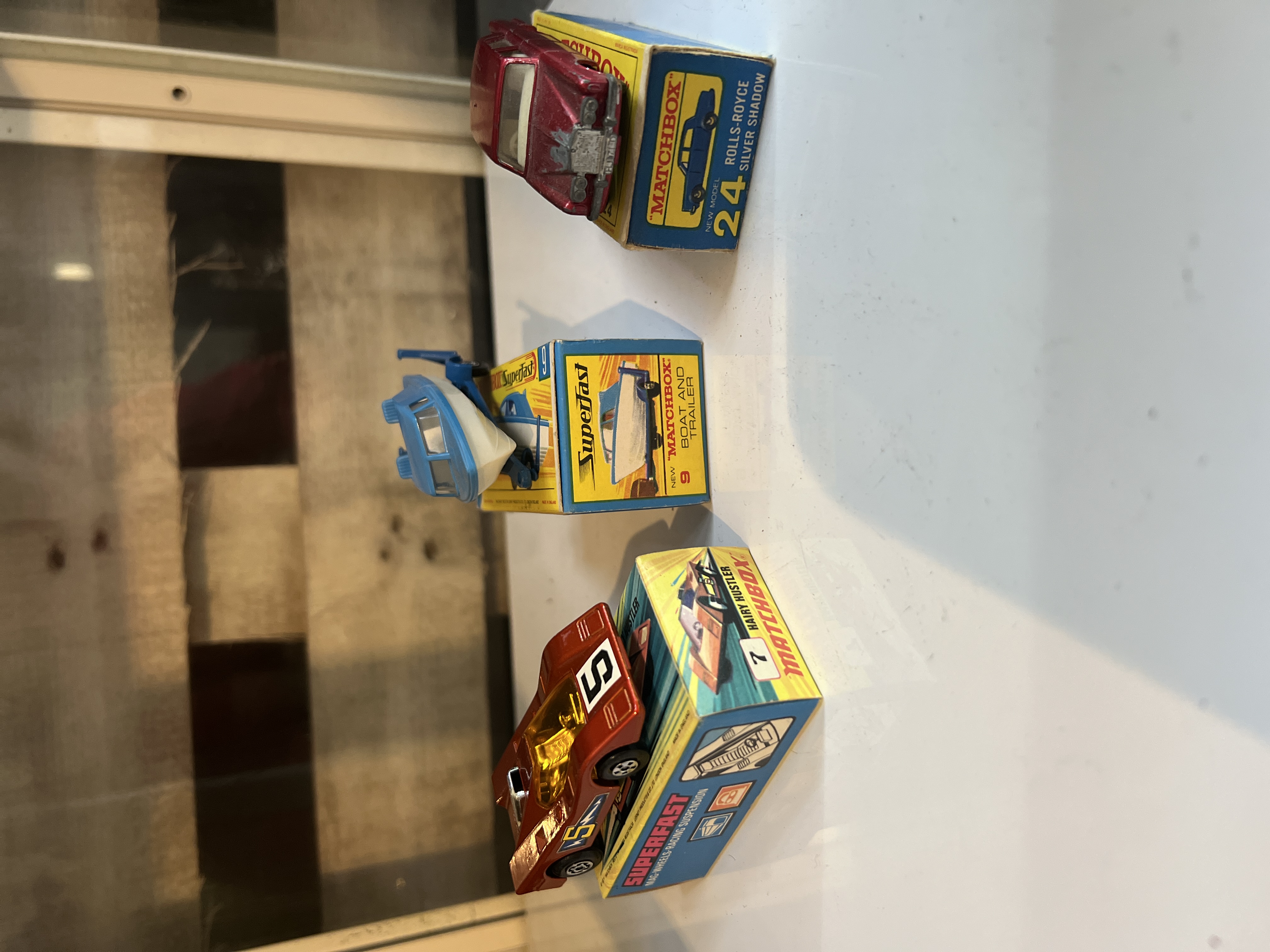 Three boxed Matchbox die-cast model cars, inc. 24v Rolls Royce Silver Shadow, 9 Boat and Trailer and 7 Hairy Hustler.