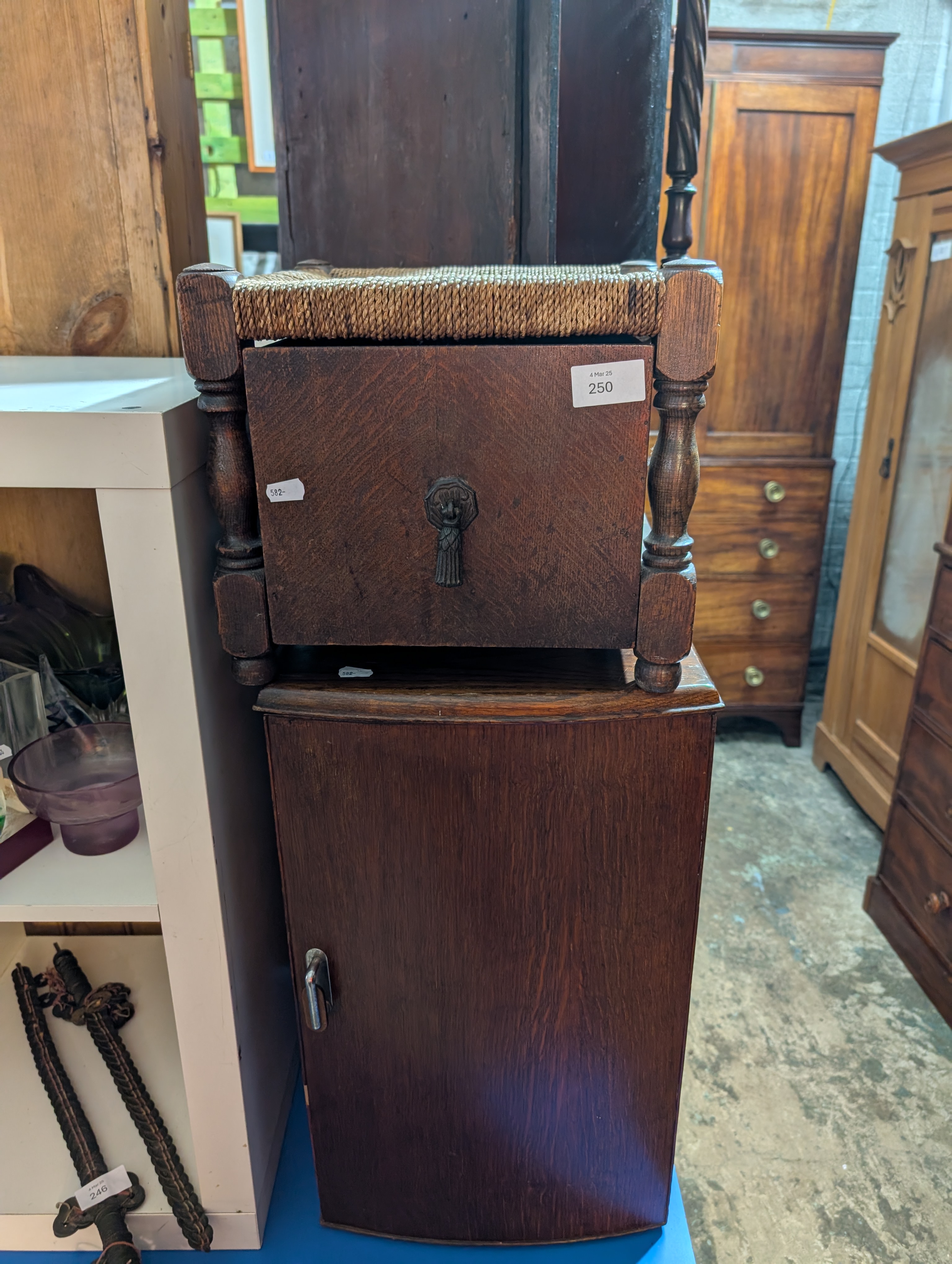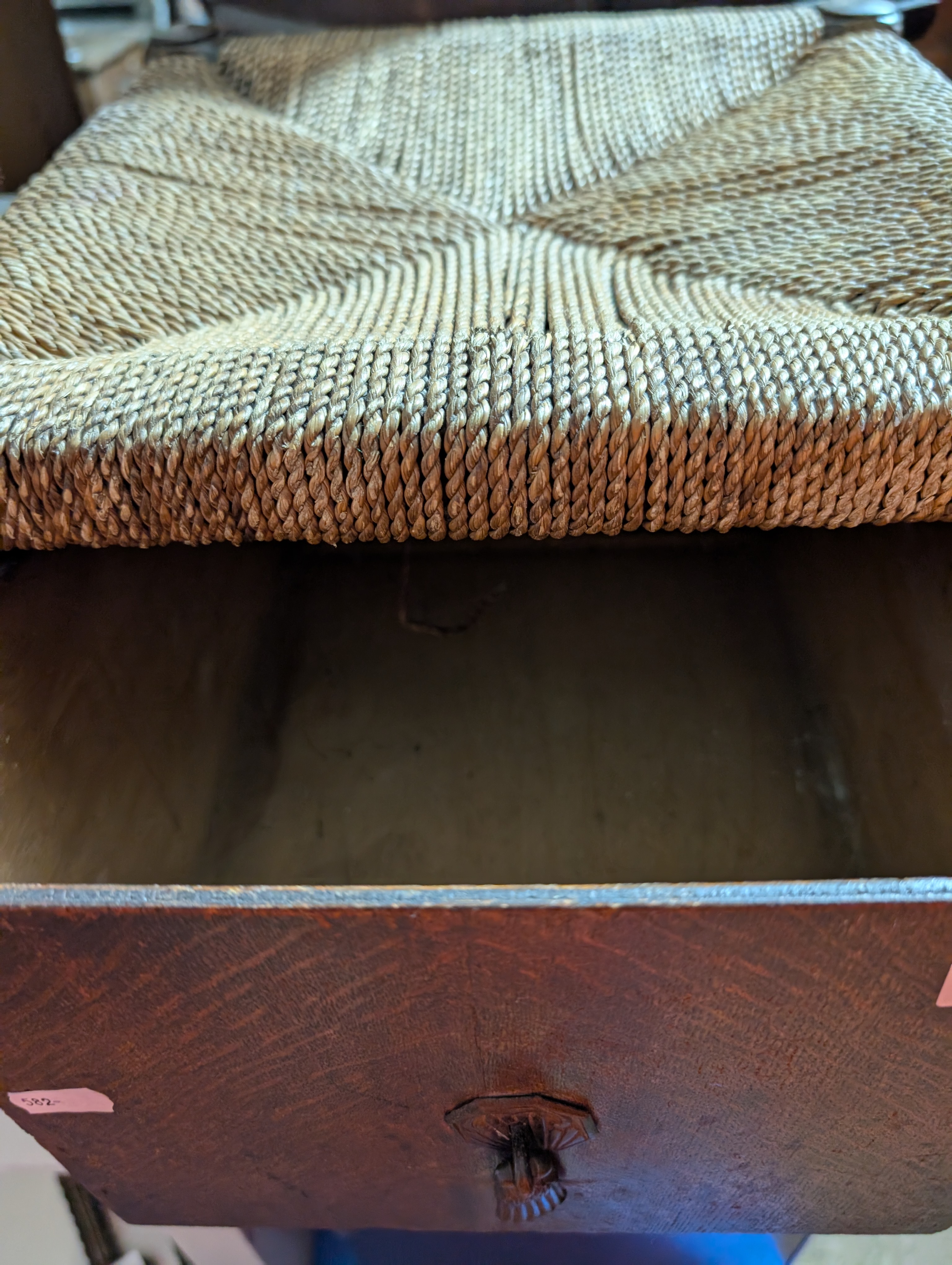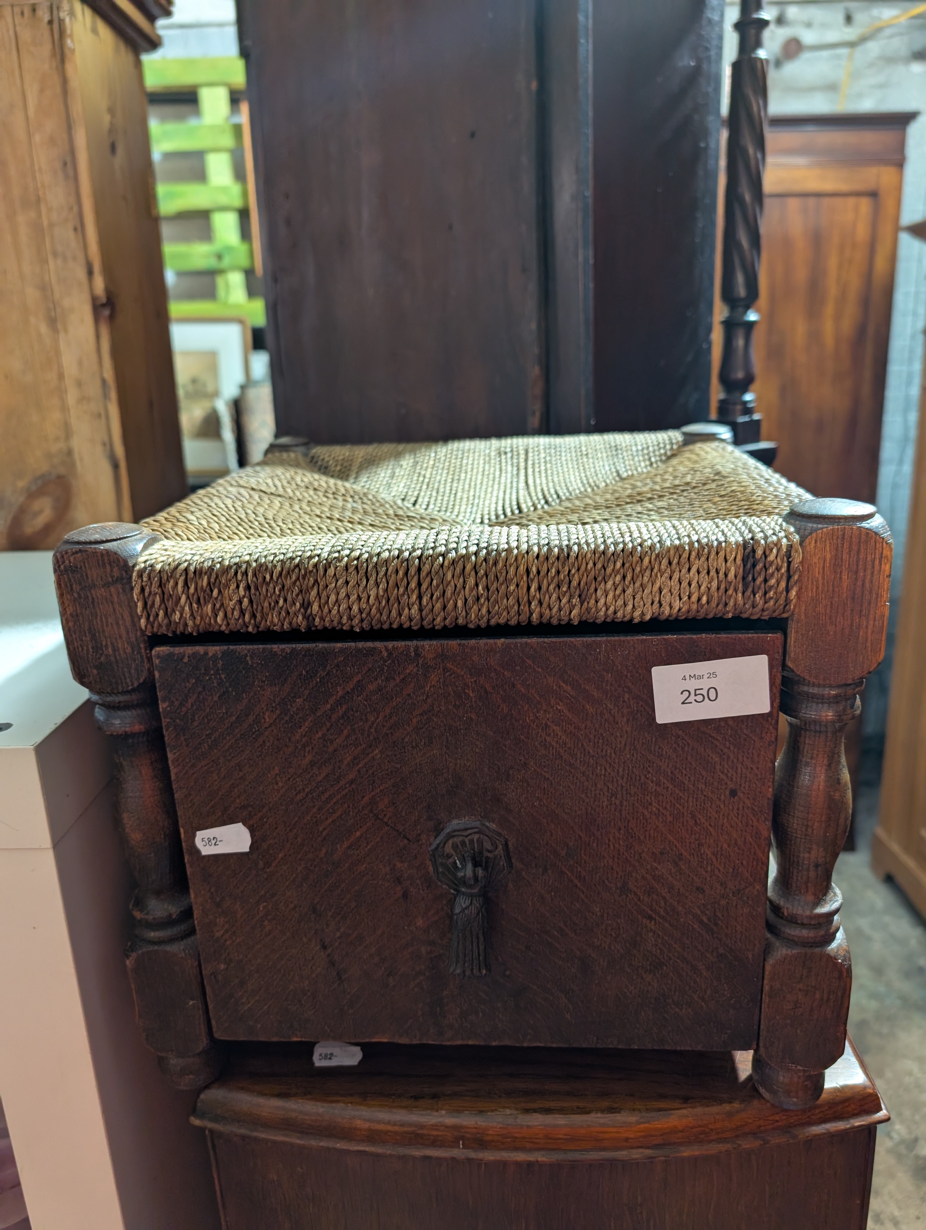 An oak framed coal bucket with woven top stool