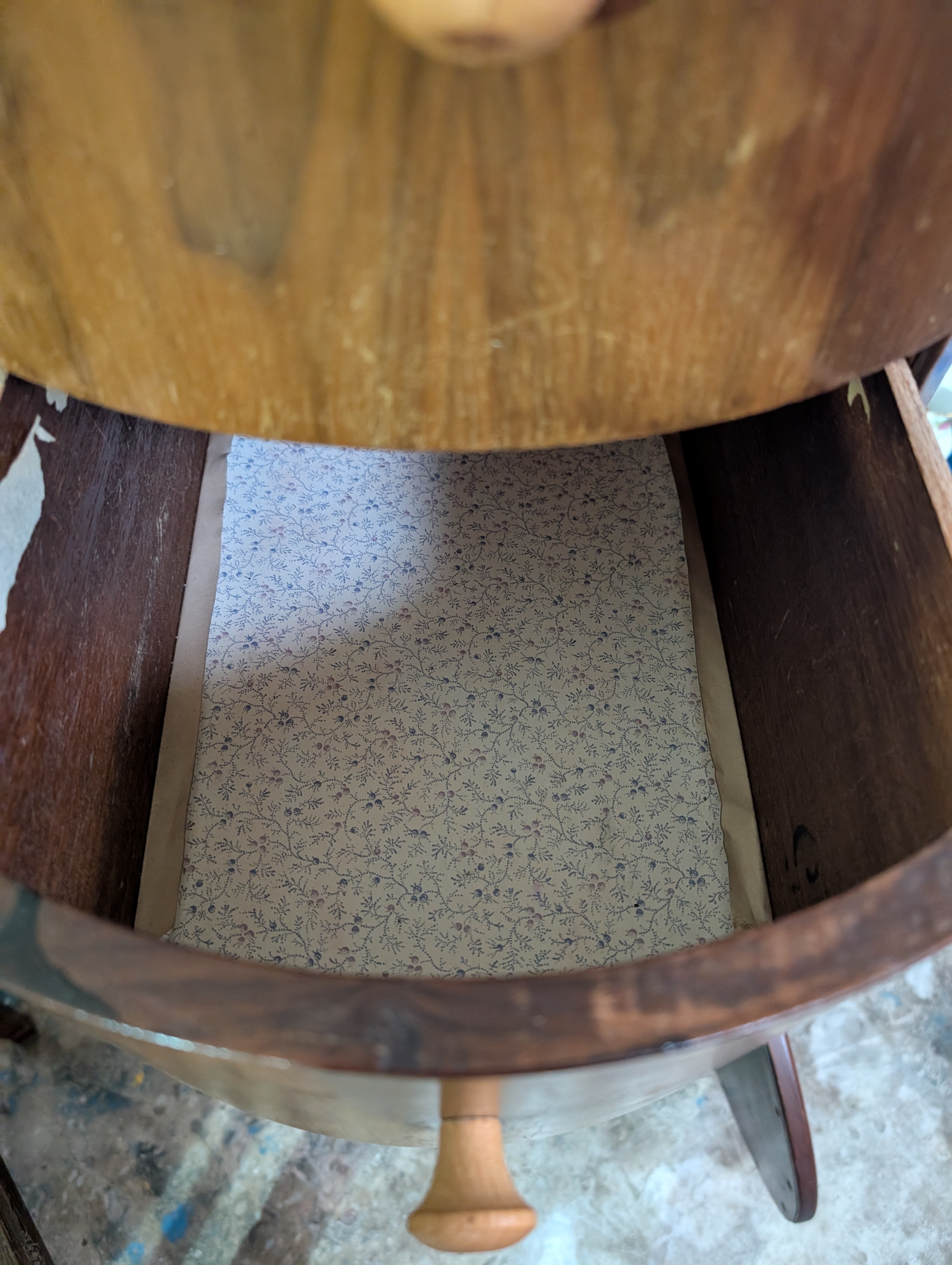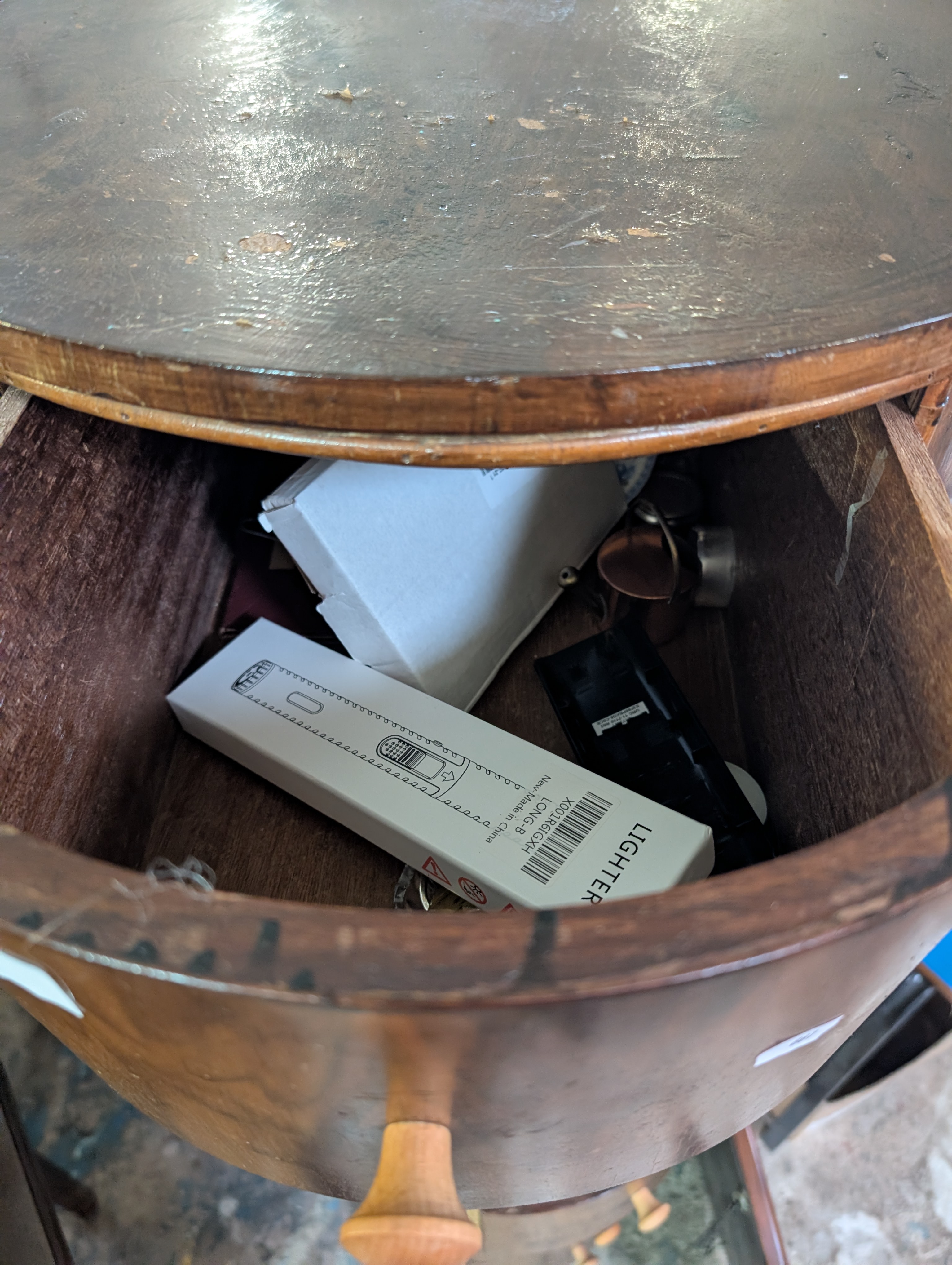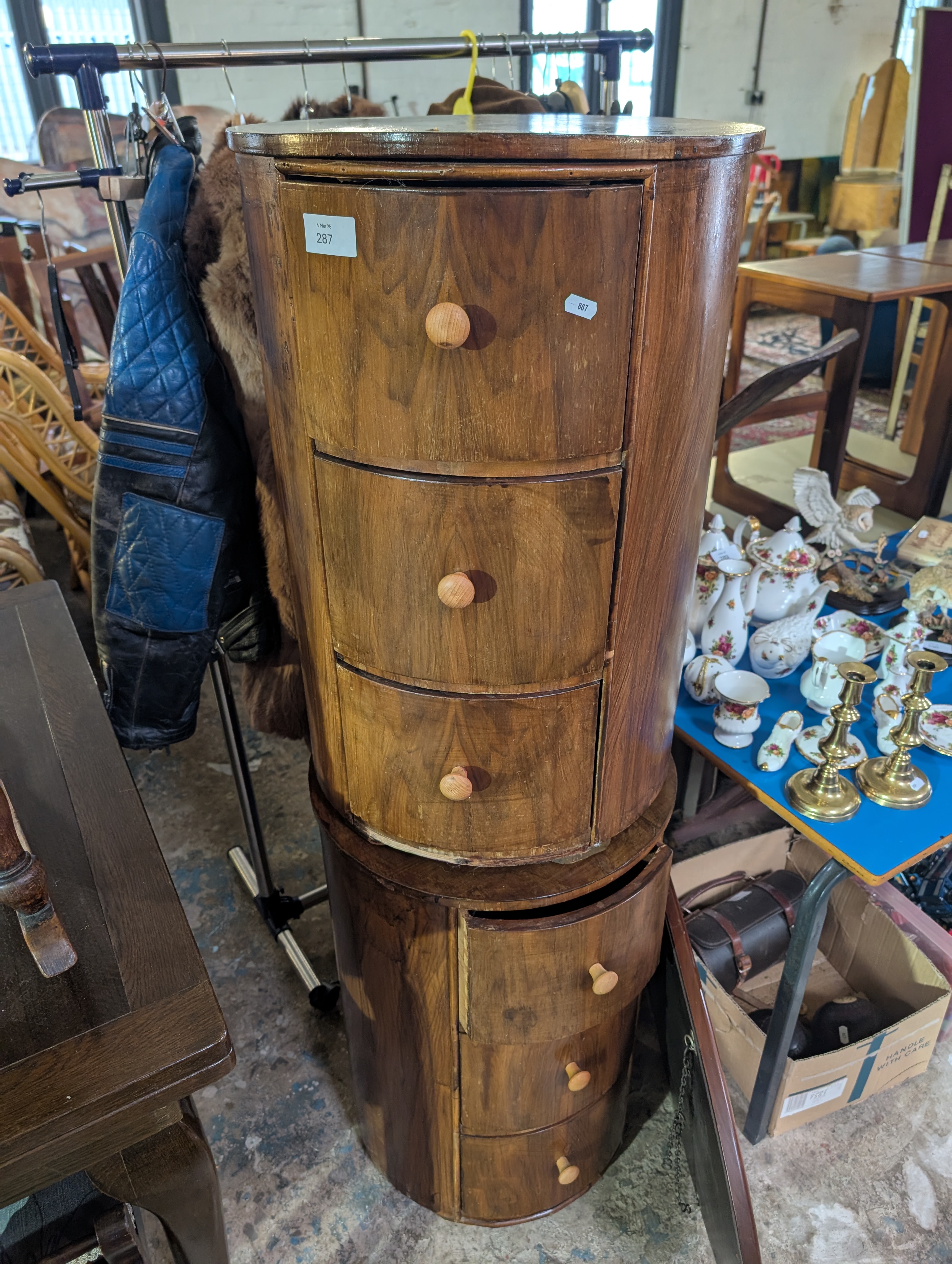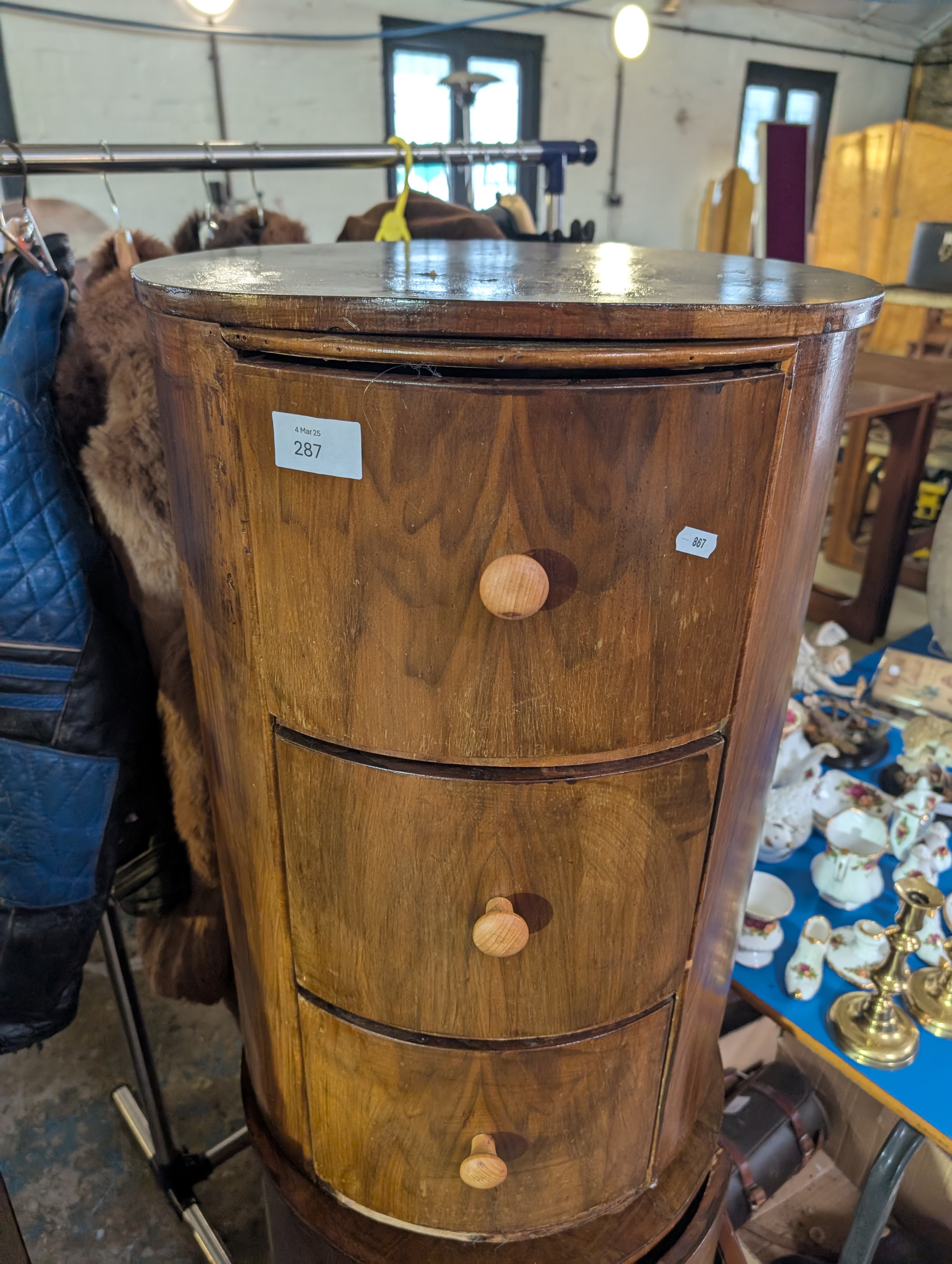 A pair of Art Deco style cylinder bed side cabinets with three drawers