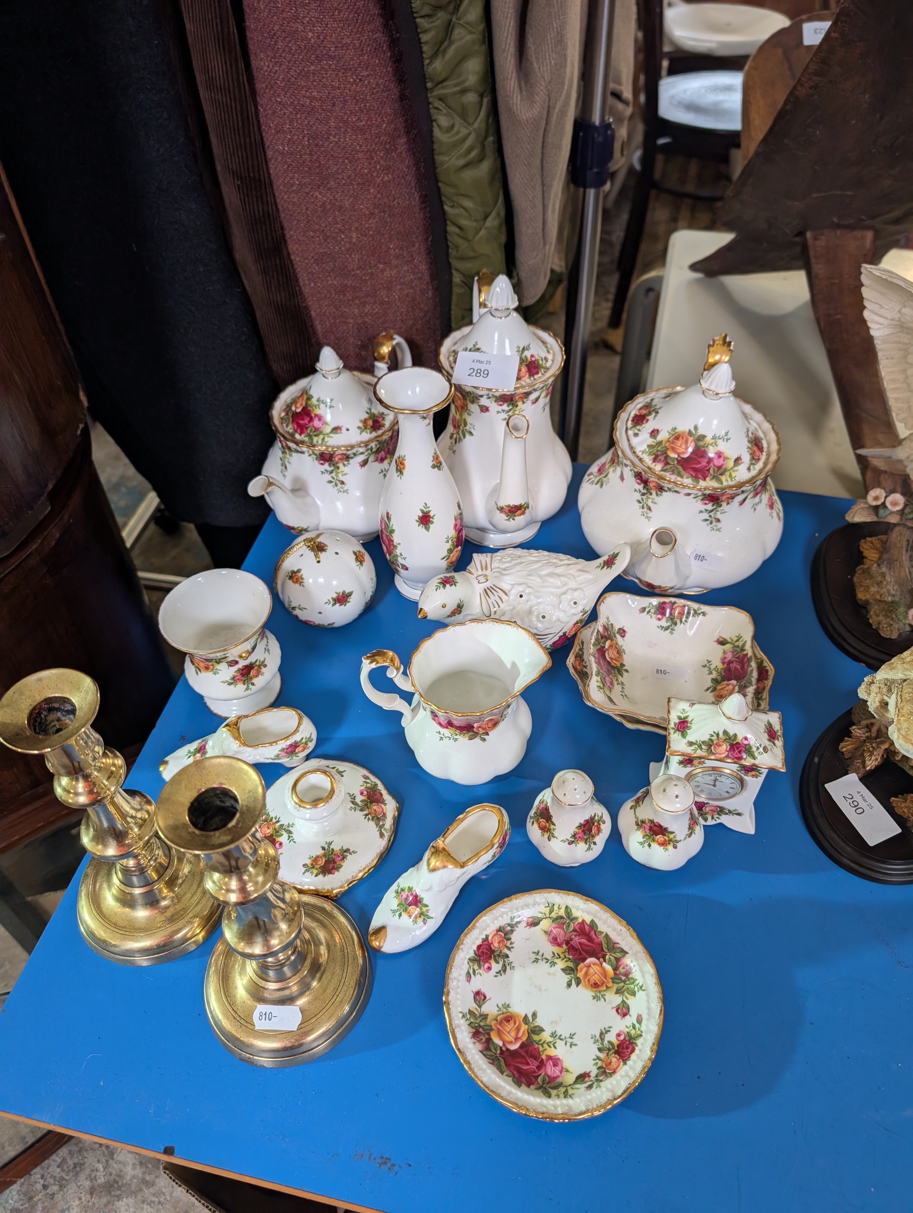 A selection of Royal Albert Old Country Roses including teapots, clock and pomander