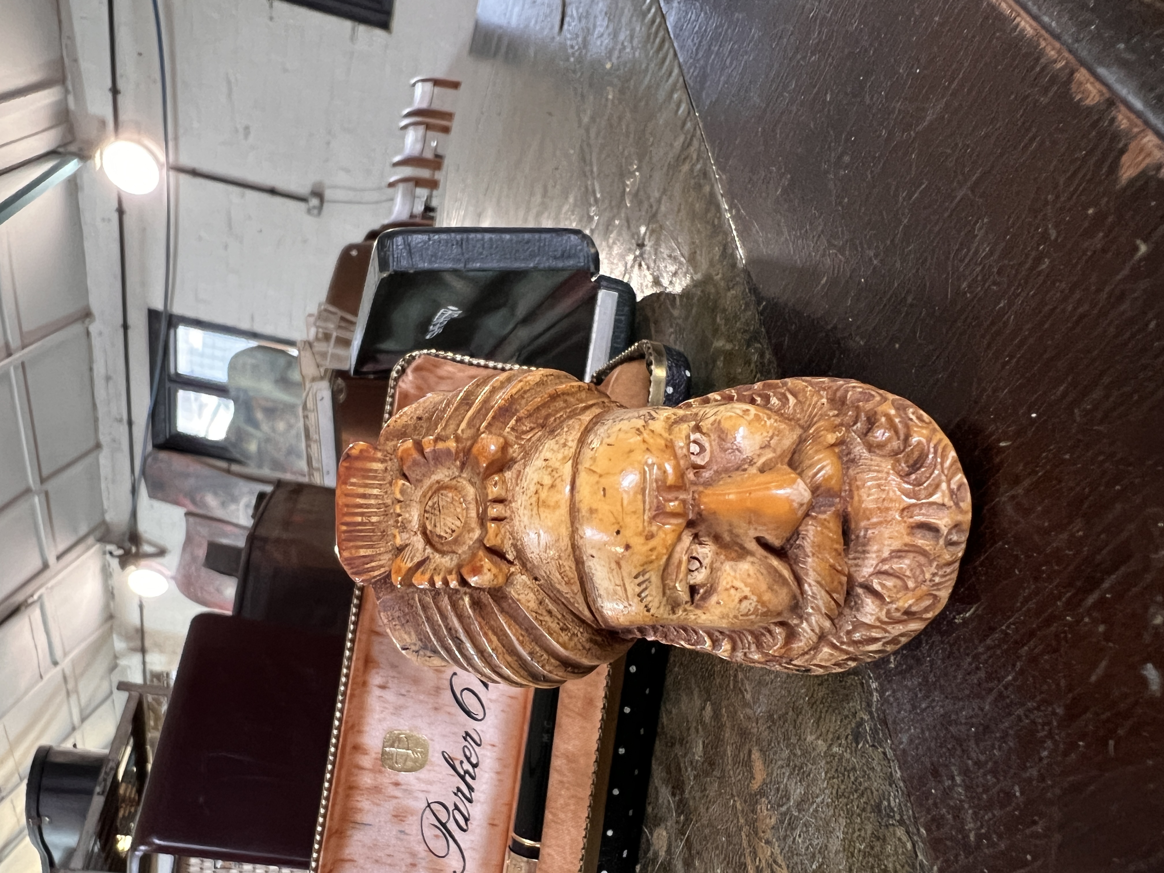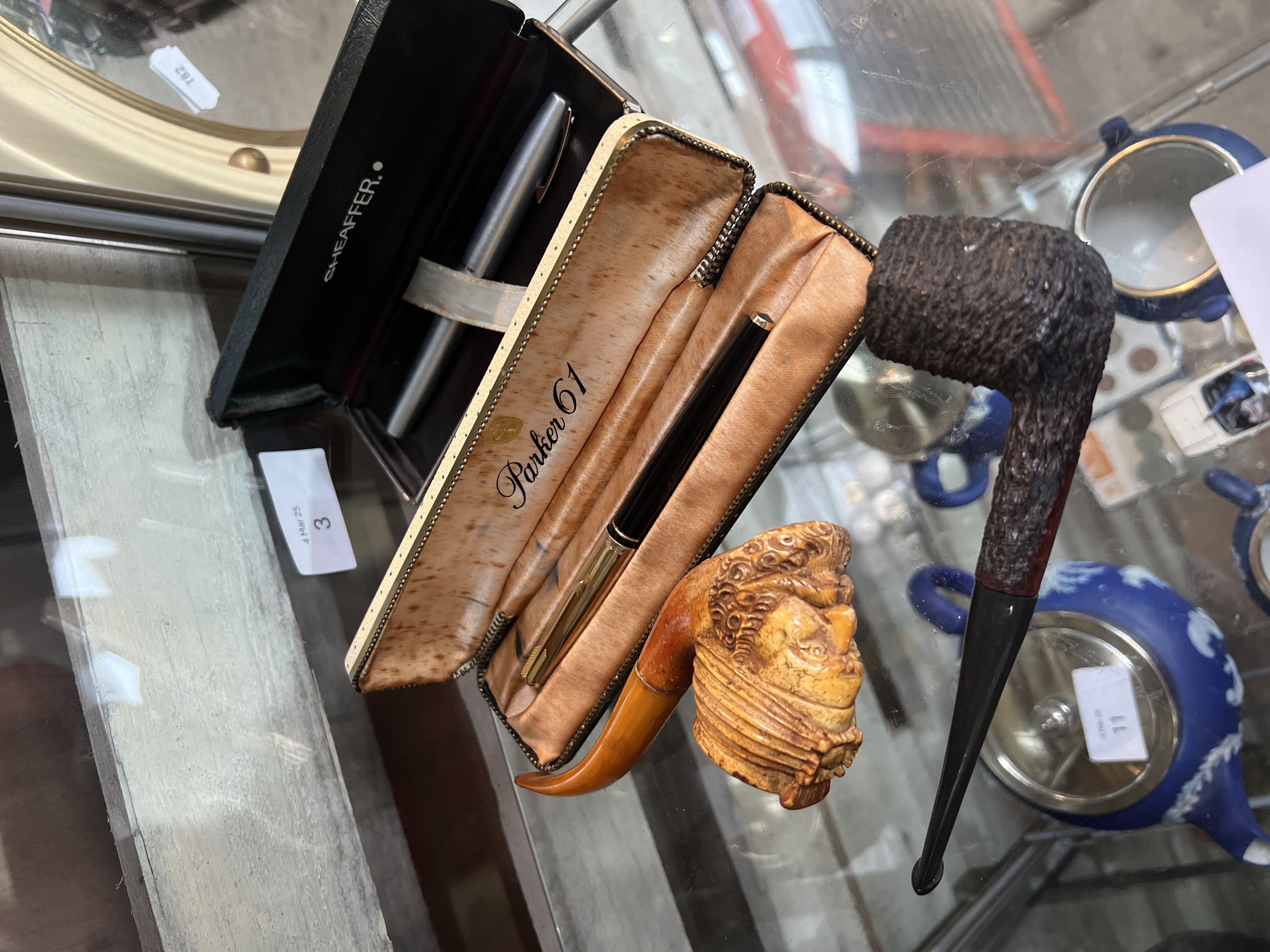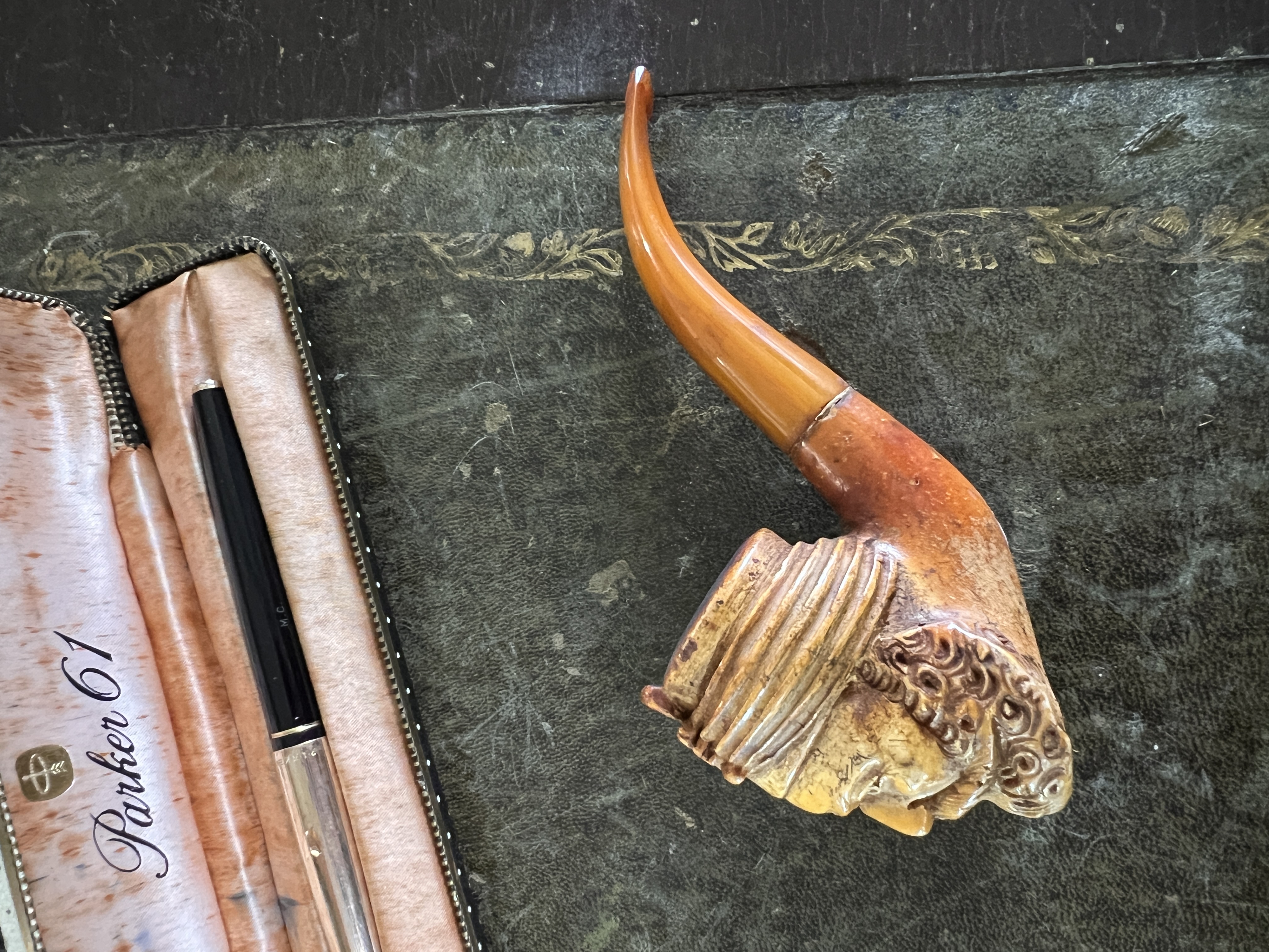An antique meerschaum carved tobacco pipe in the form of a Turkish man with similar pipe and a Parker 61 pen and Shaeffer pen in cases.