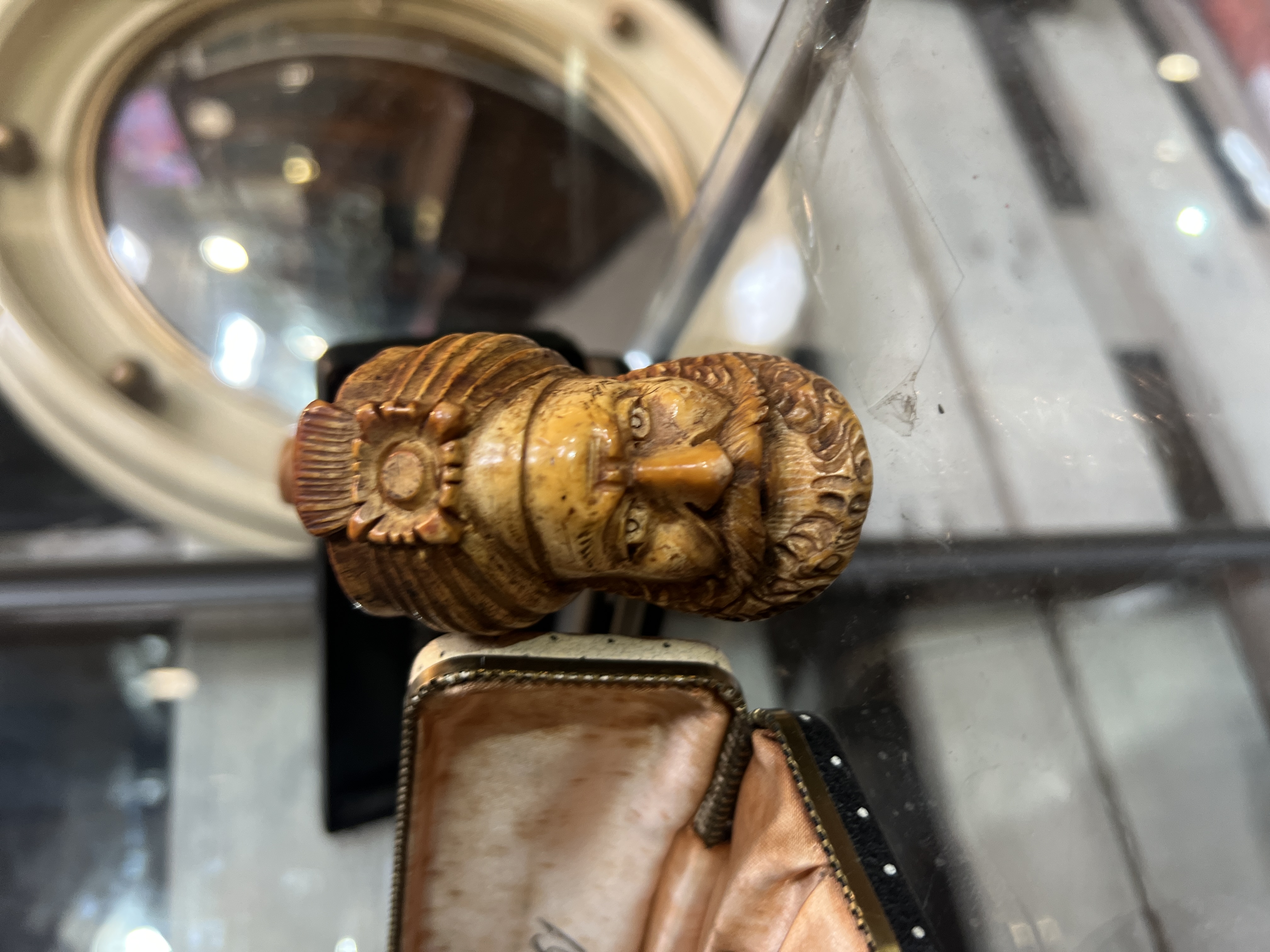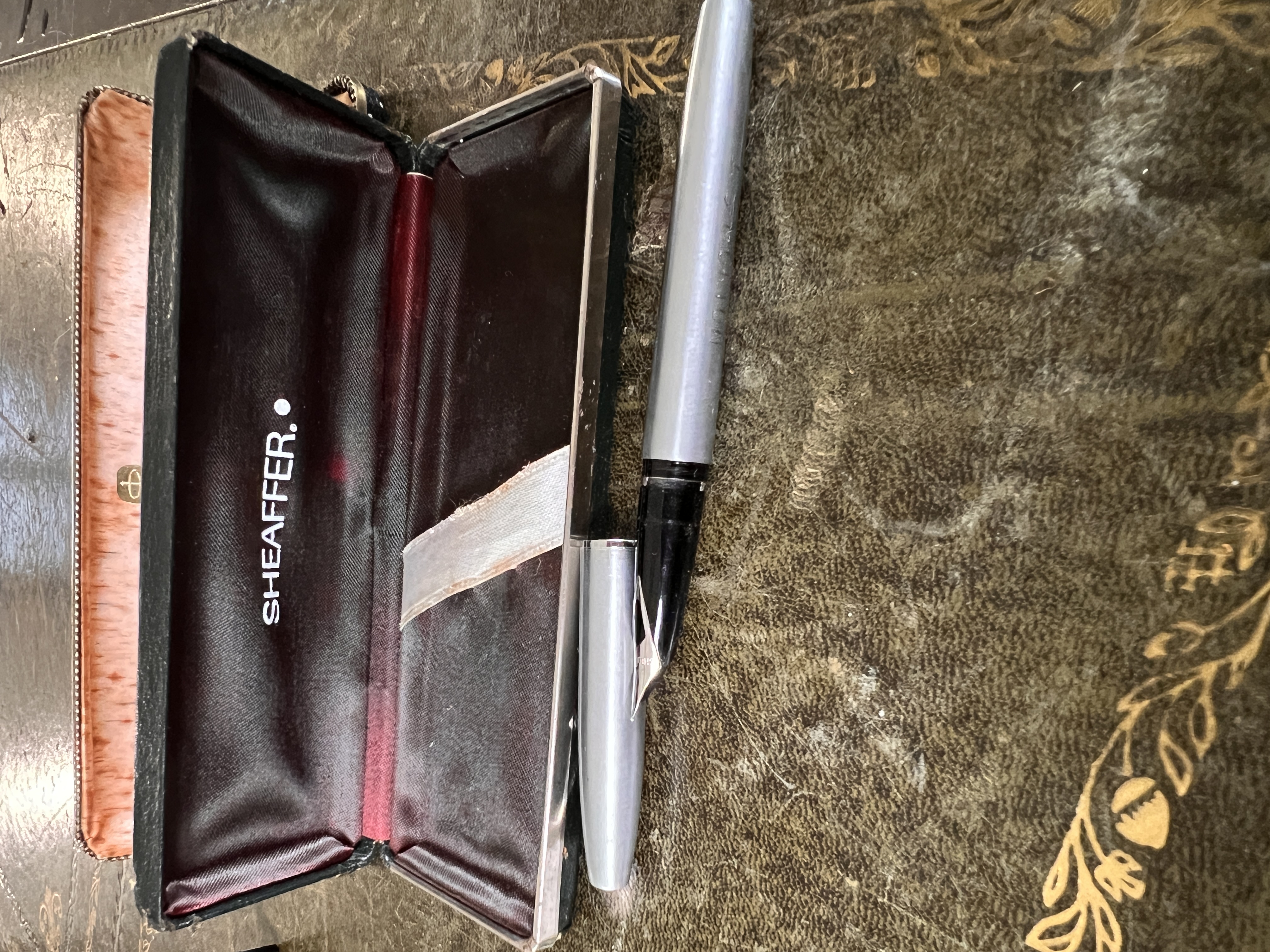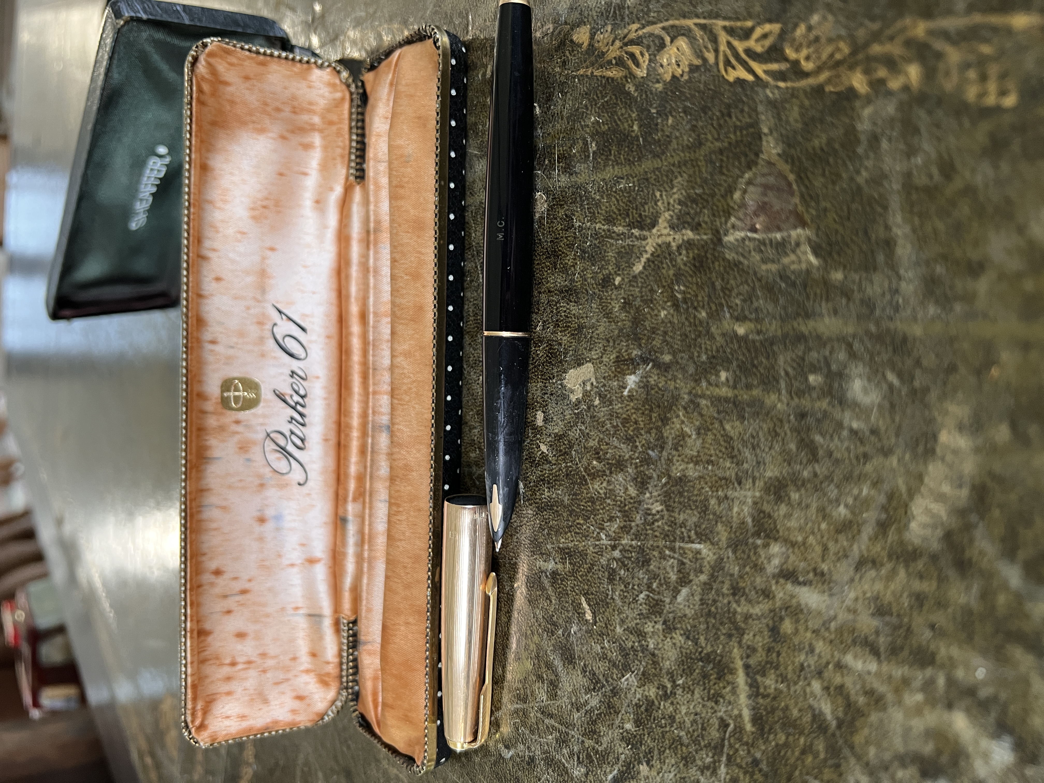An antique meerschaum carved tobacco pipe in the form of a Turkish man with similar pipe and a Parker 61 pen and Shaeffer pen in cases.
