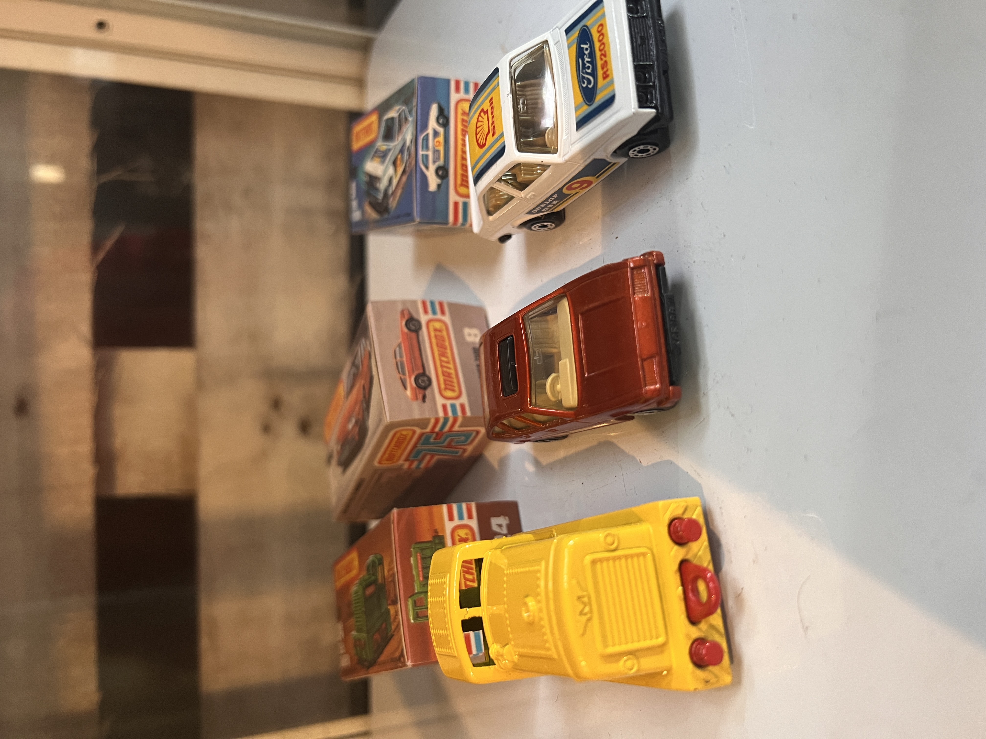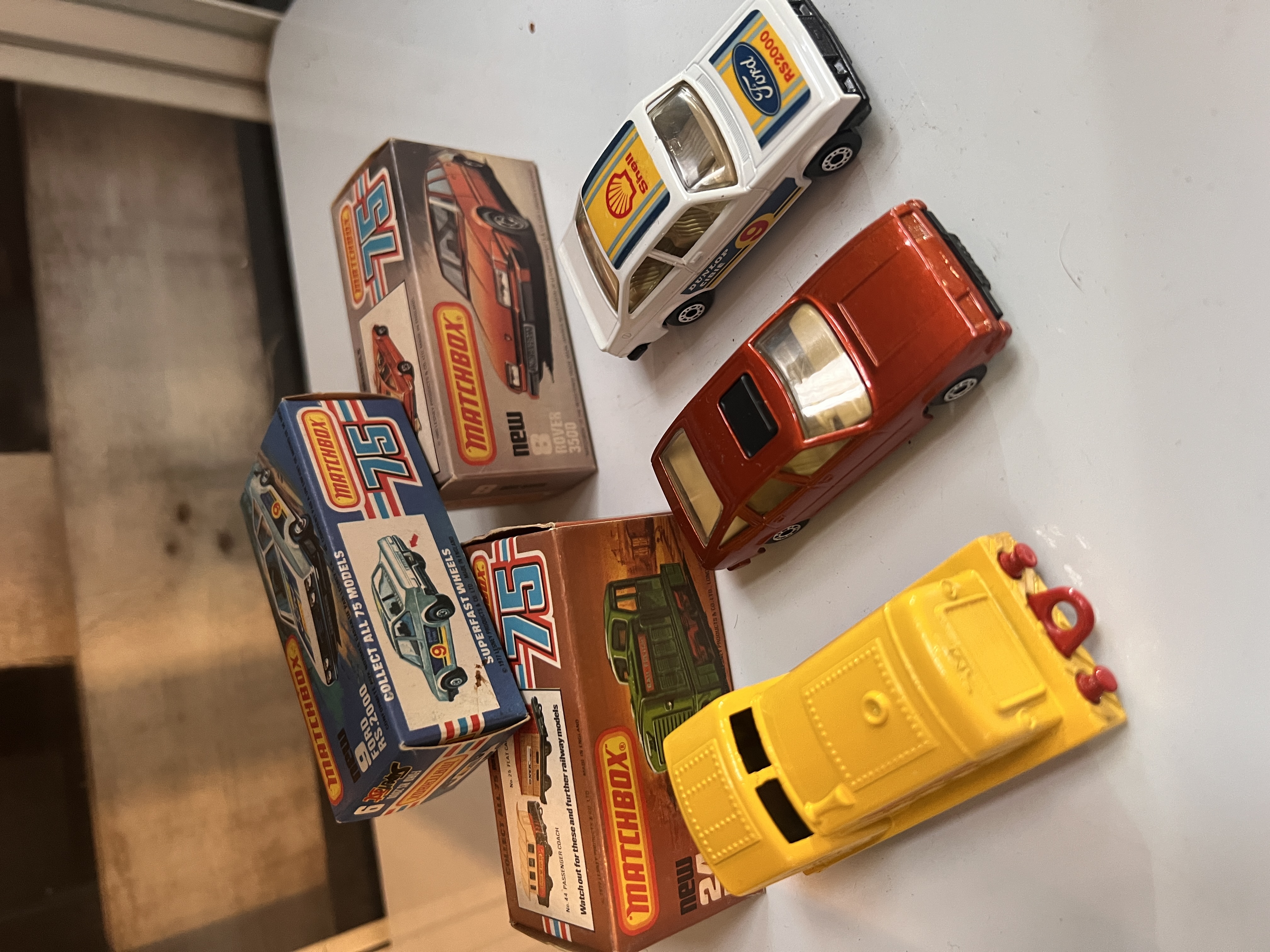 Three boxed Matchbox die-cast model cars including 9 Ford RS 2000, 8 Rover 3500 and 24 Diesel Shunter