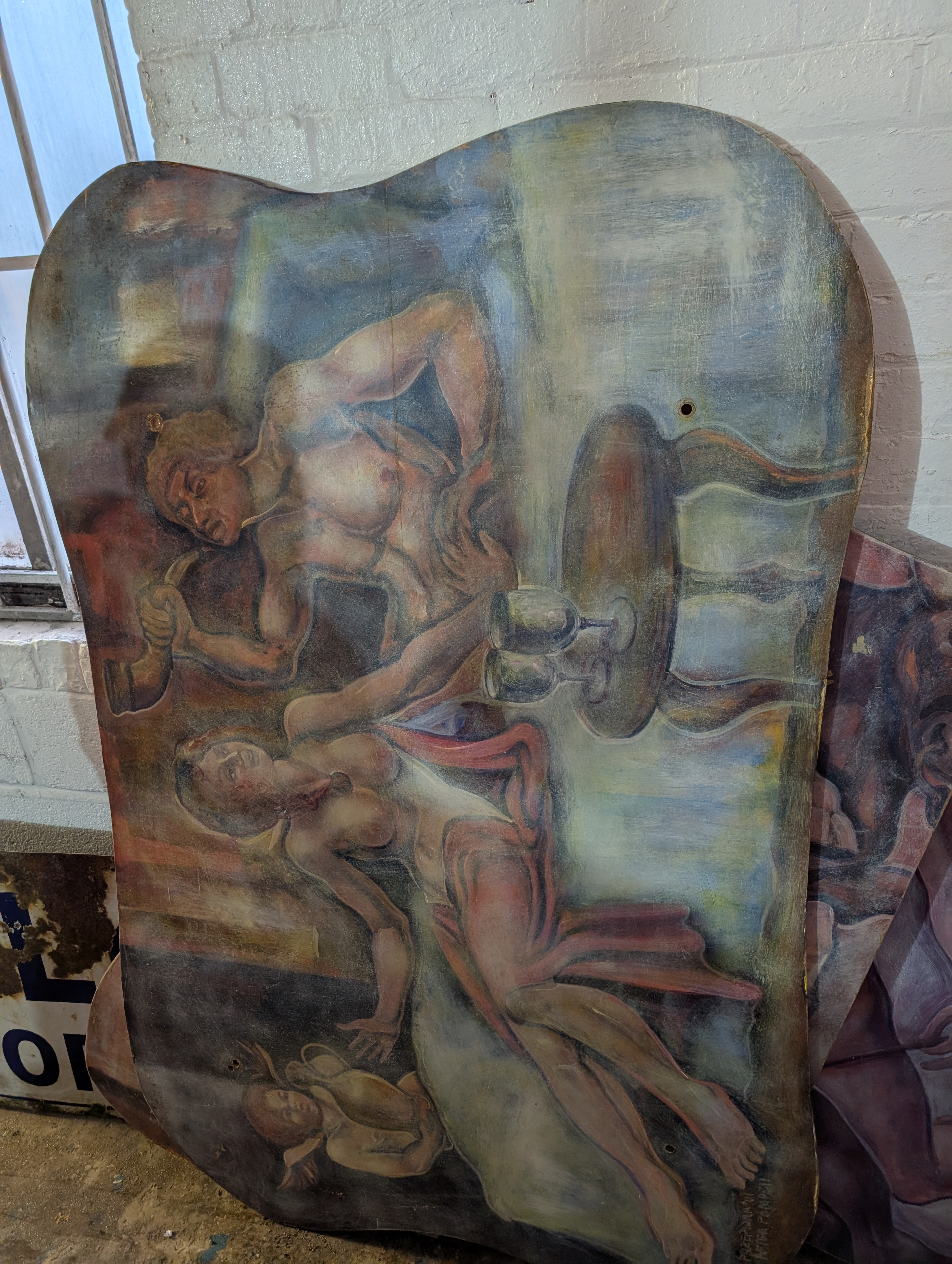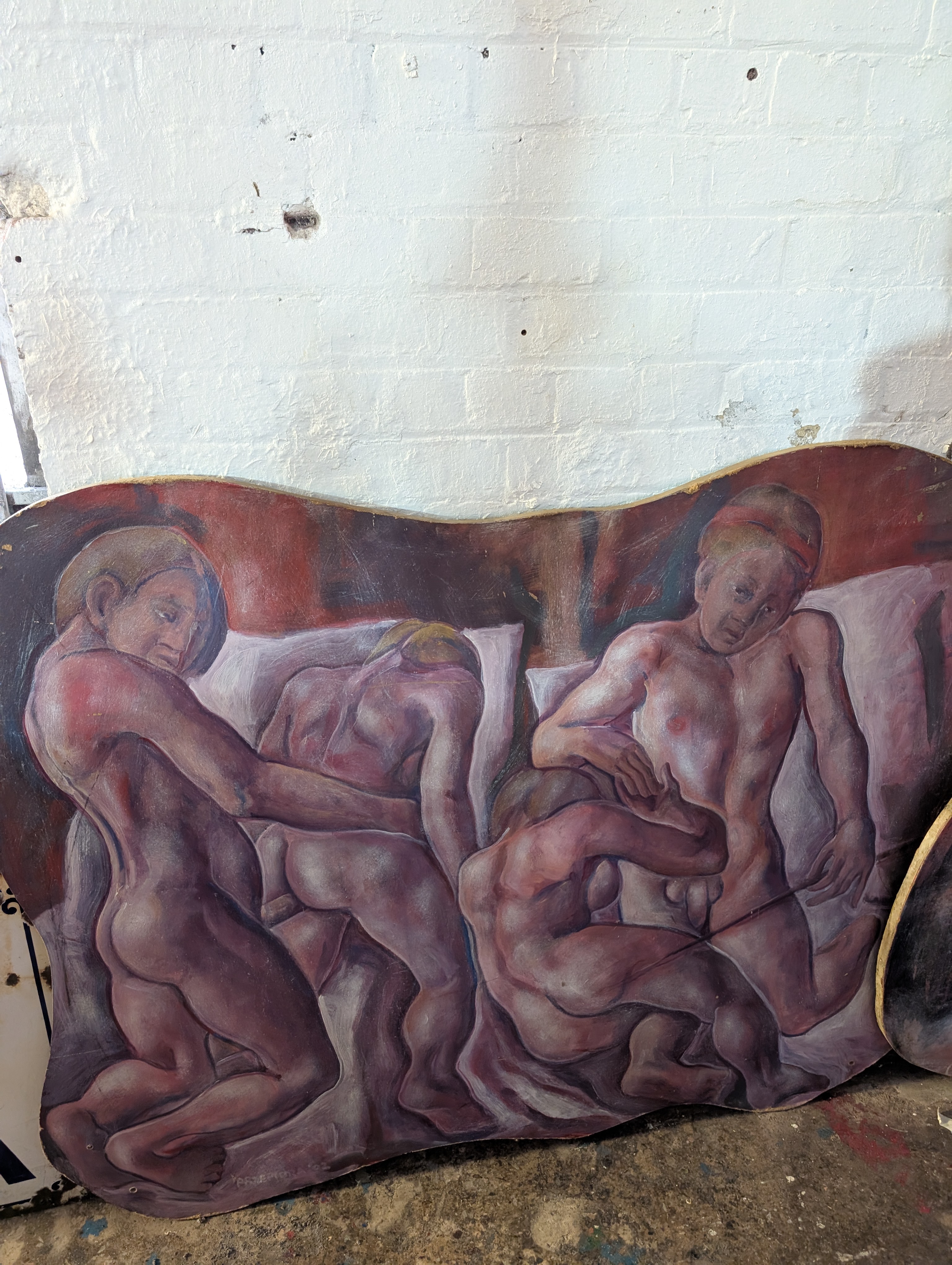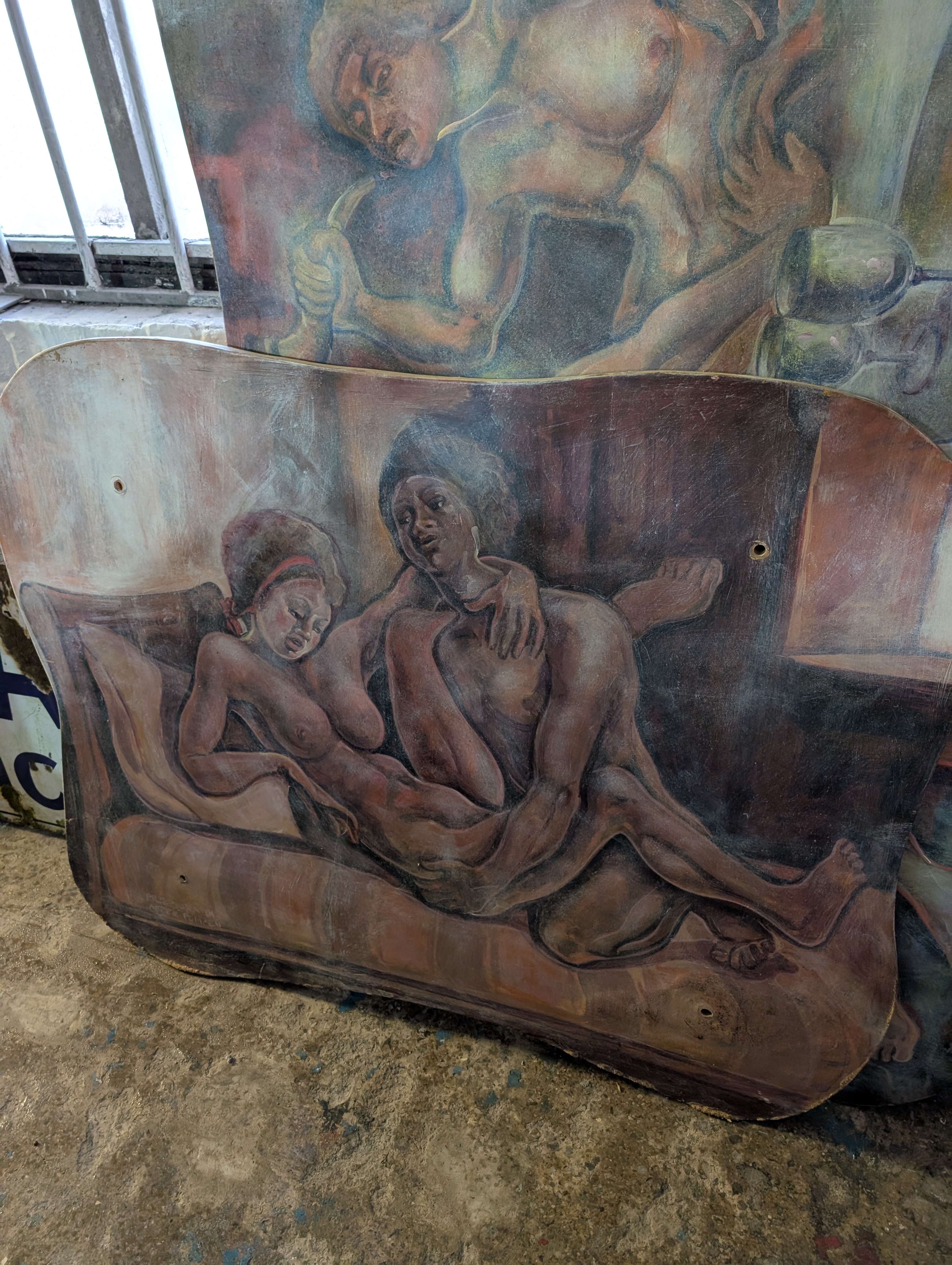 A set of hand painted mid century life size erotic oils on board after images from Pompei by artist David Stefan Prezpiora