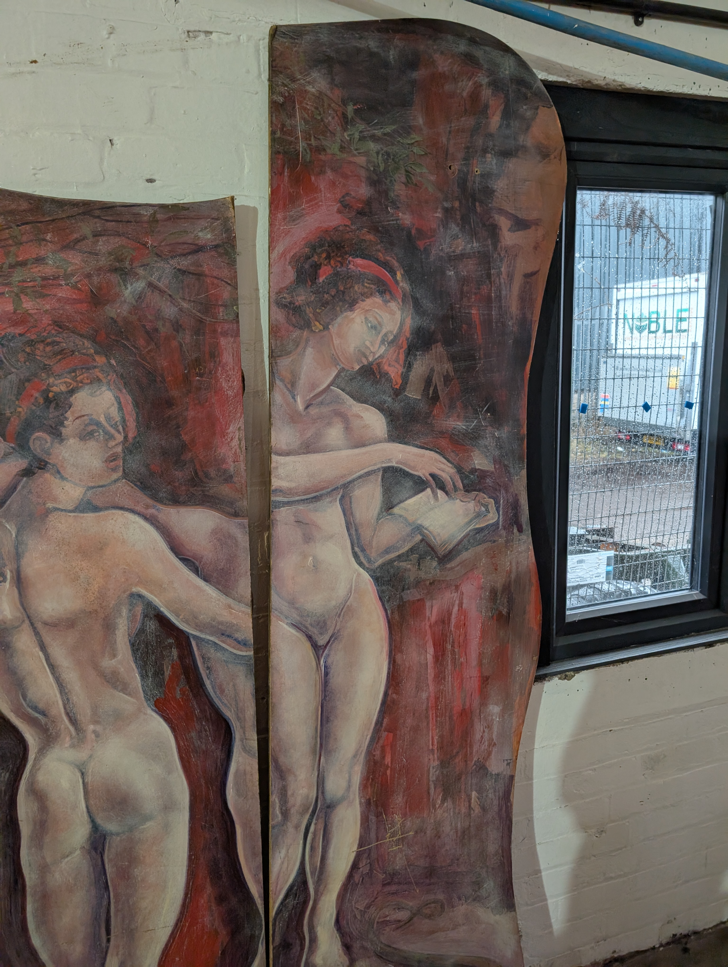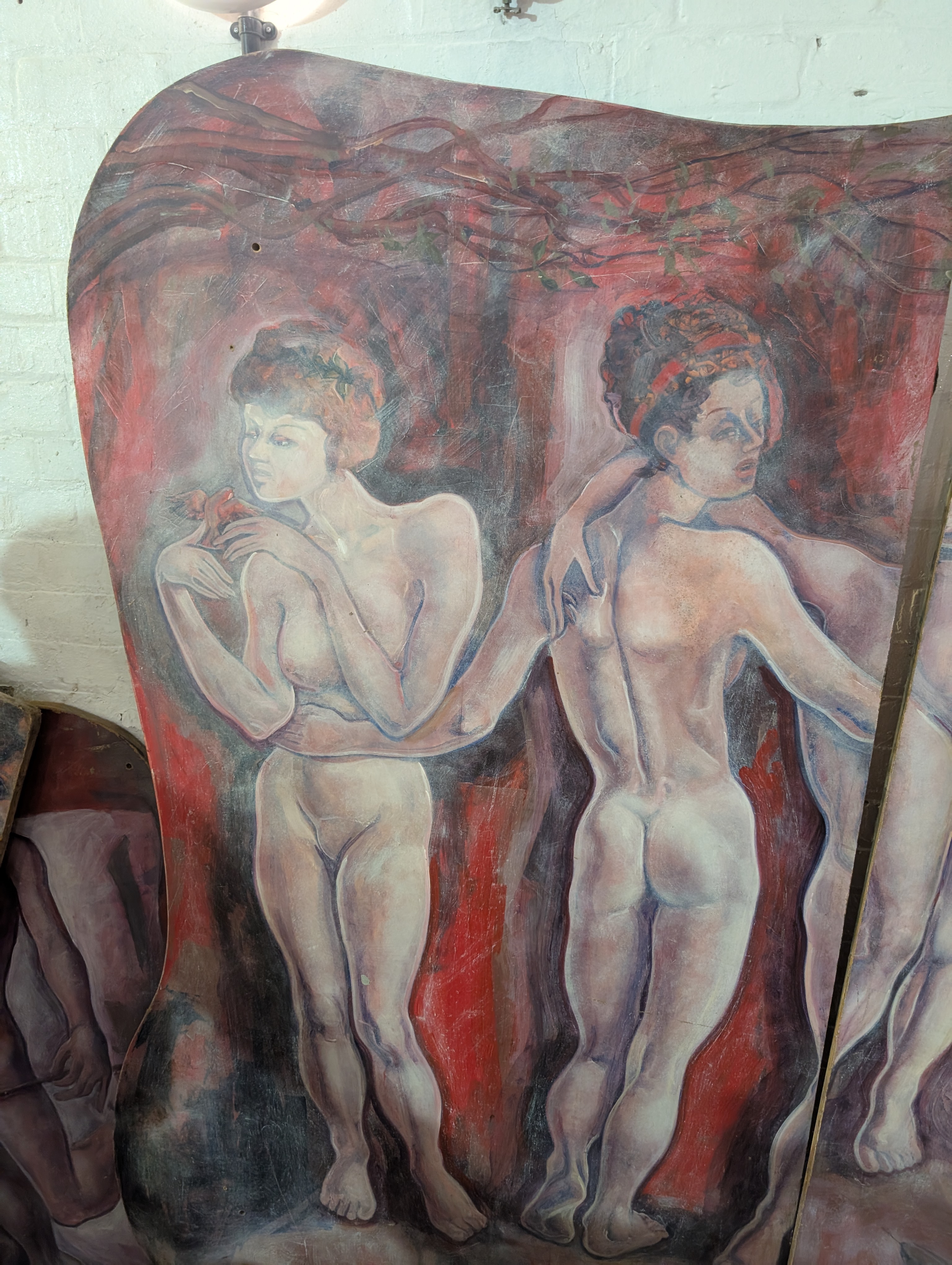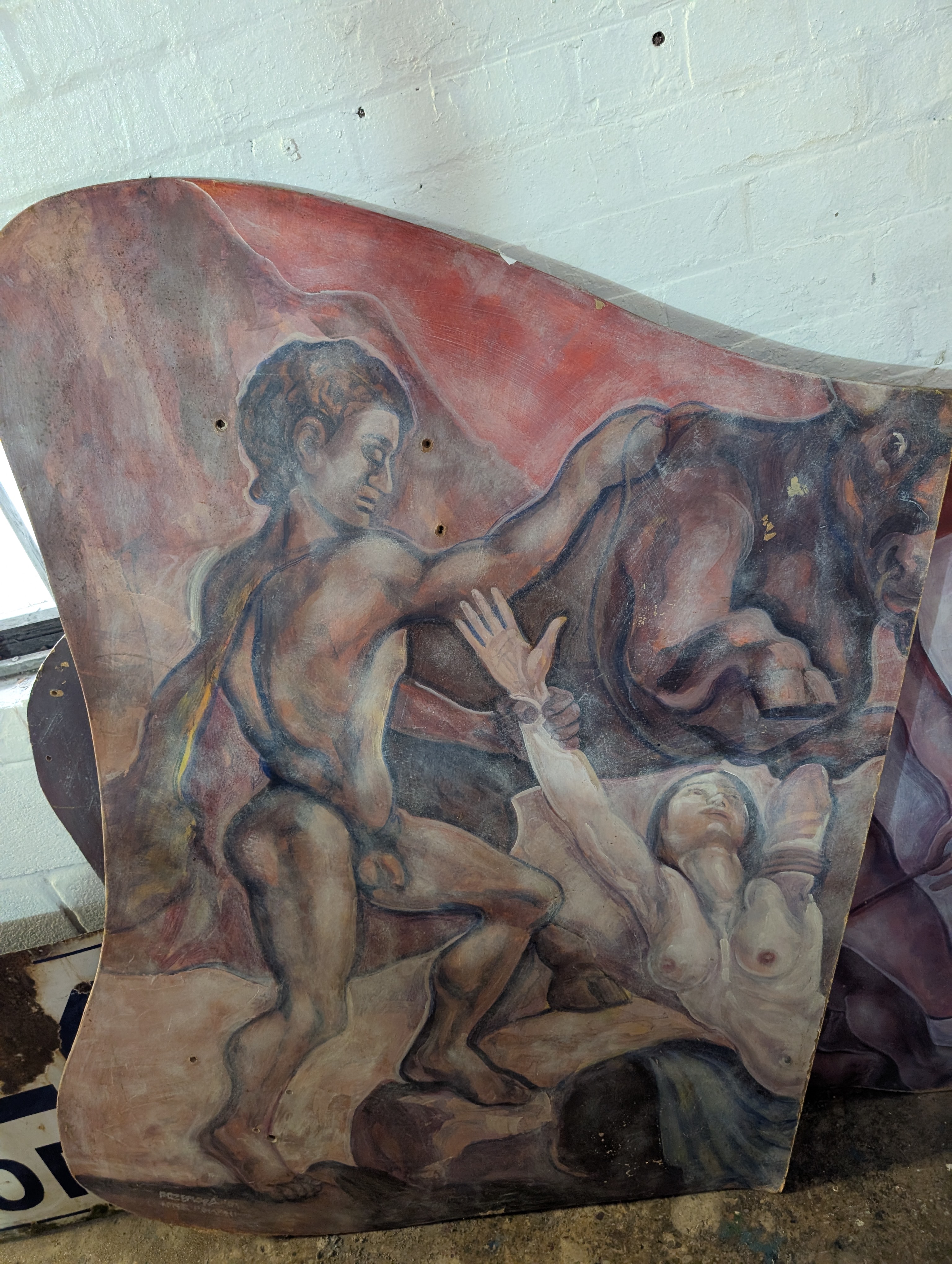 A set of hand painted mid century life size erotic oils on board after images from Pompei by artist David Stefan Prezpiora