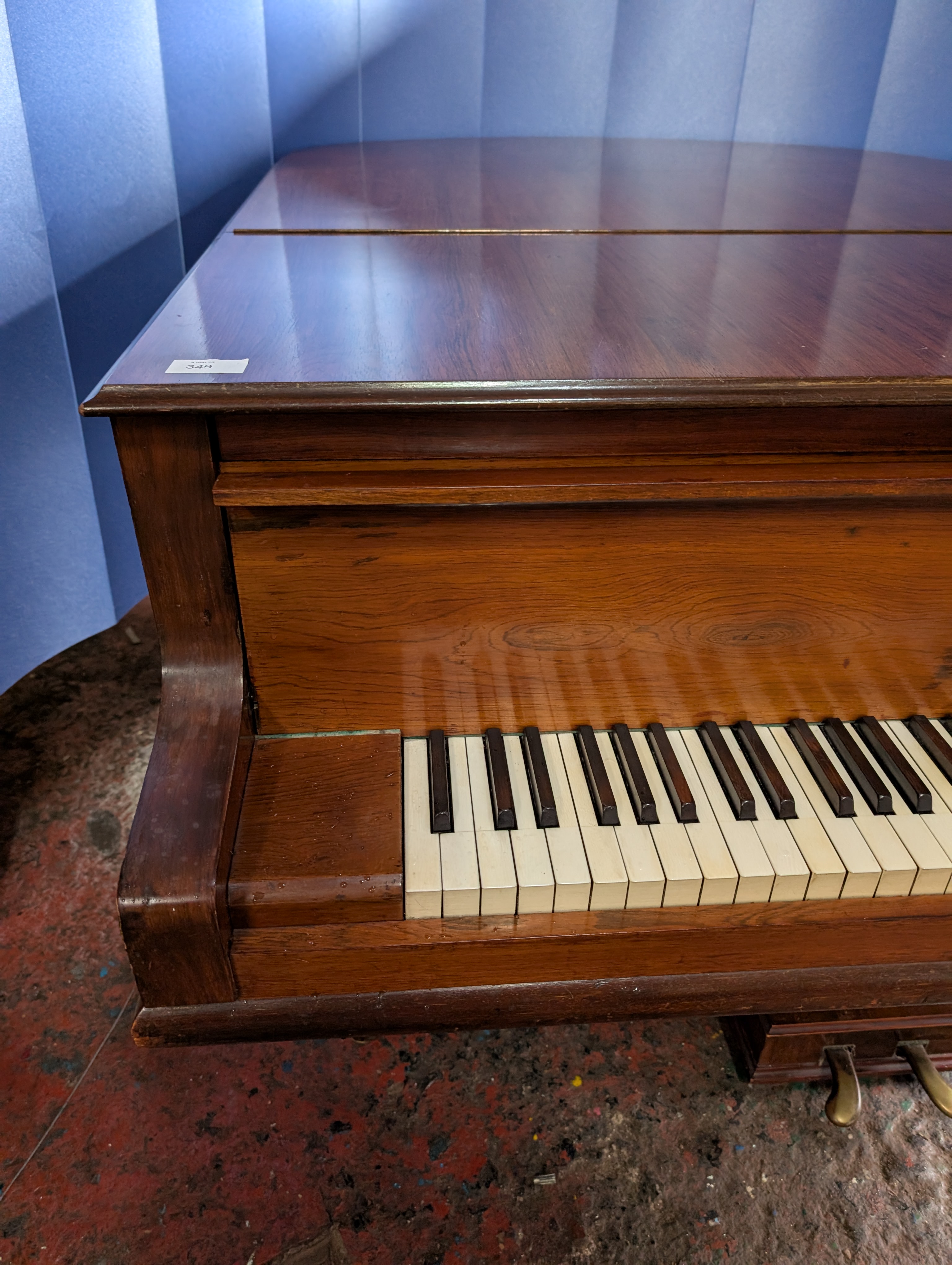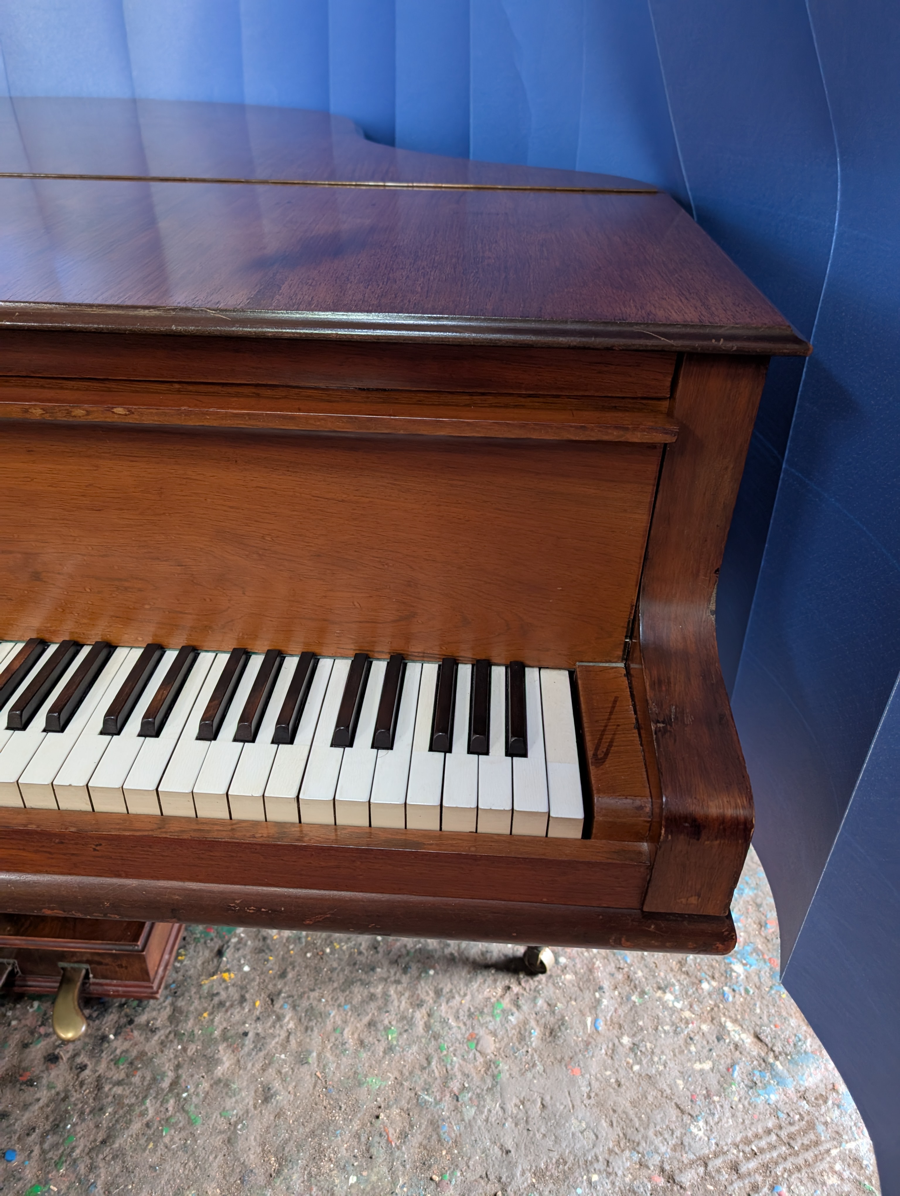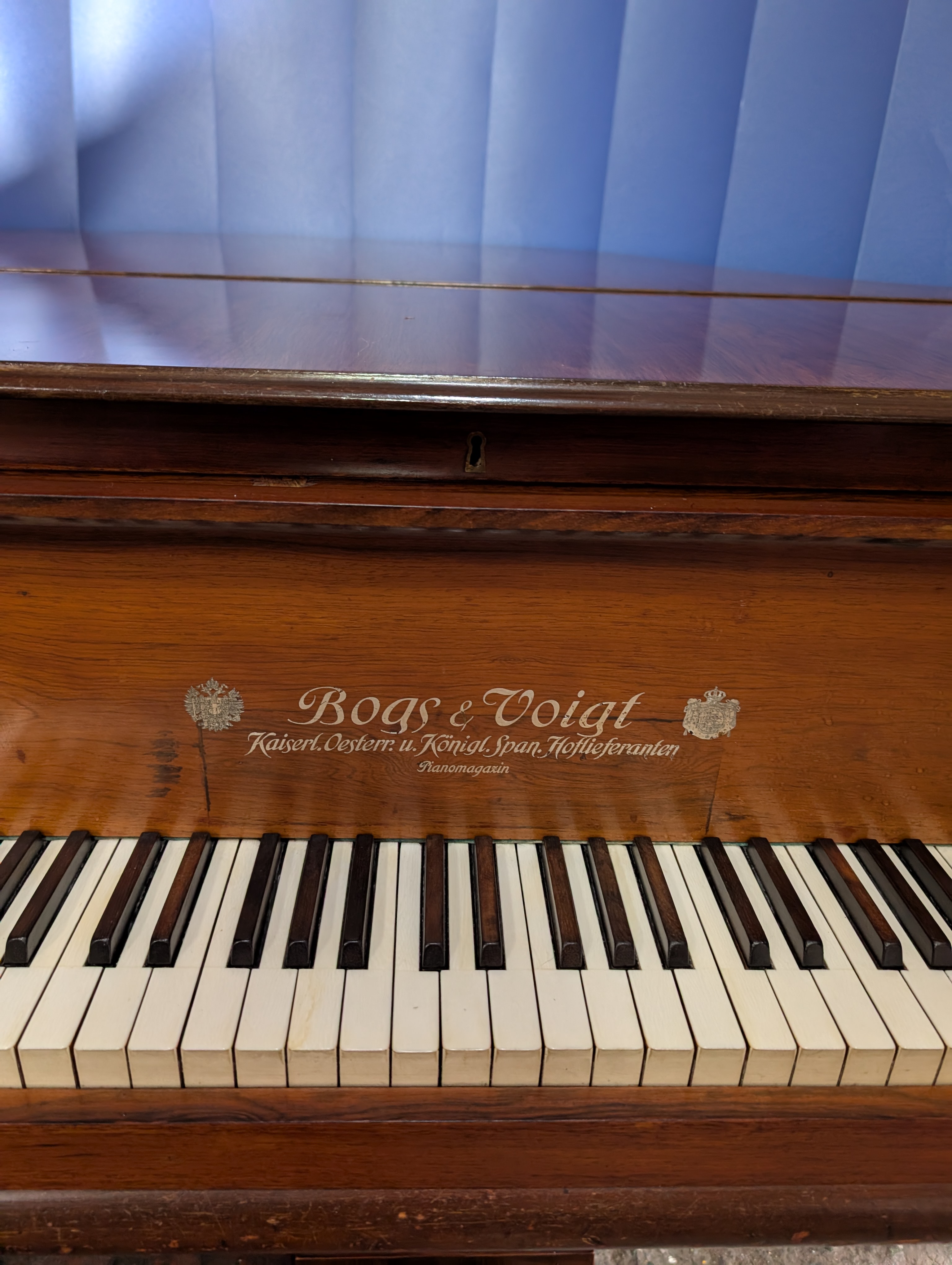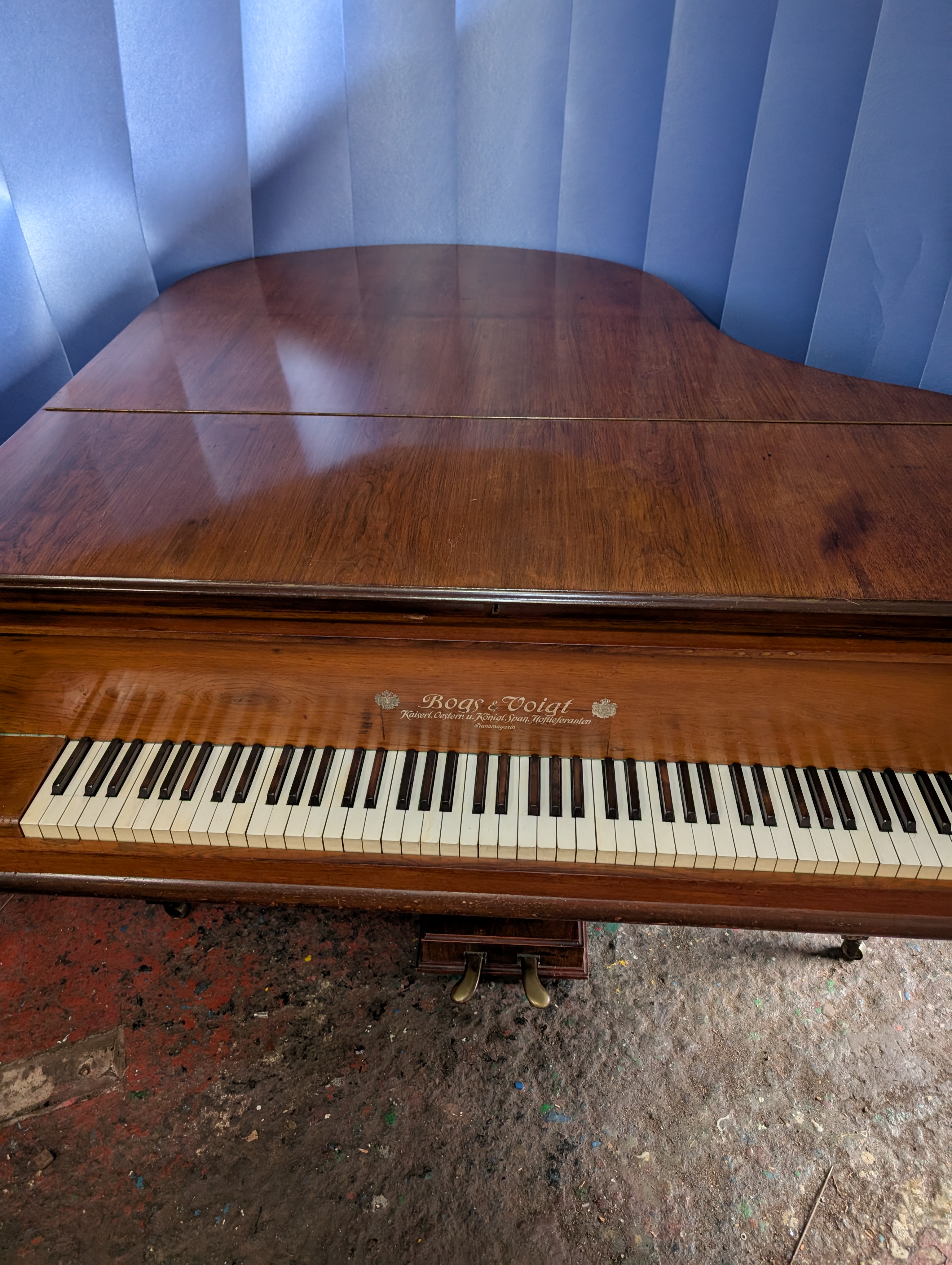 A baby grand piano made by Bogs and Voigt with mahogany case.
