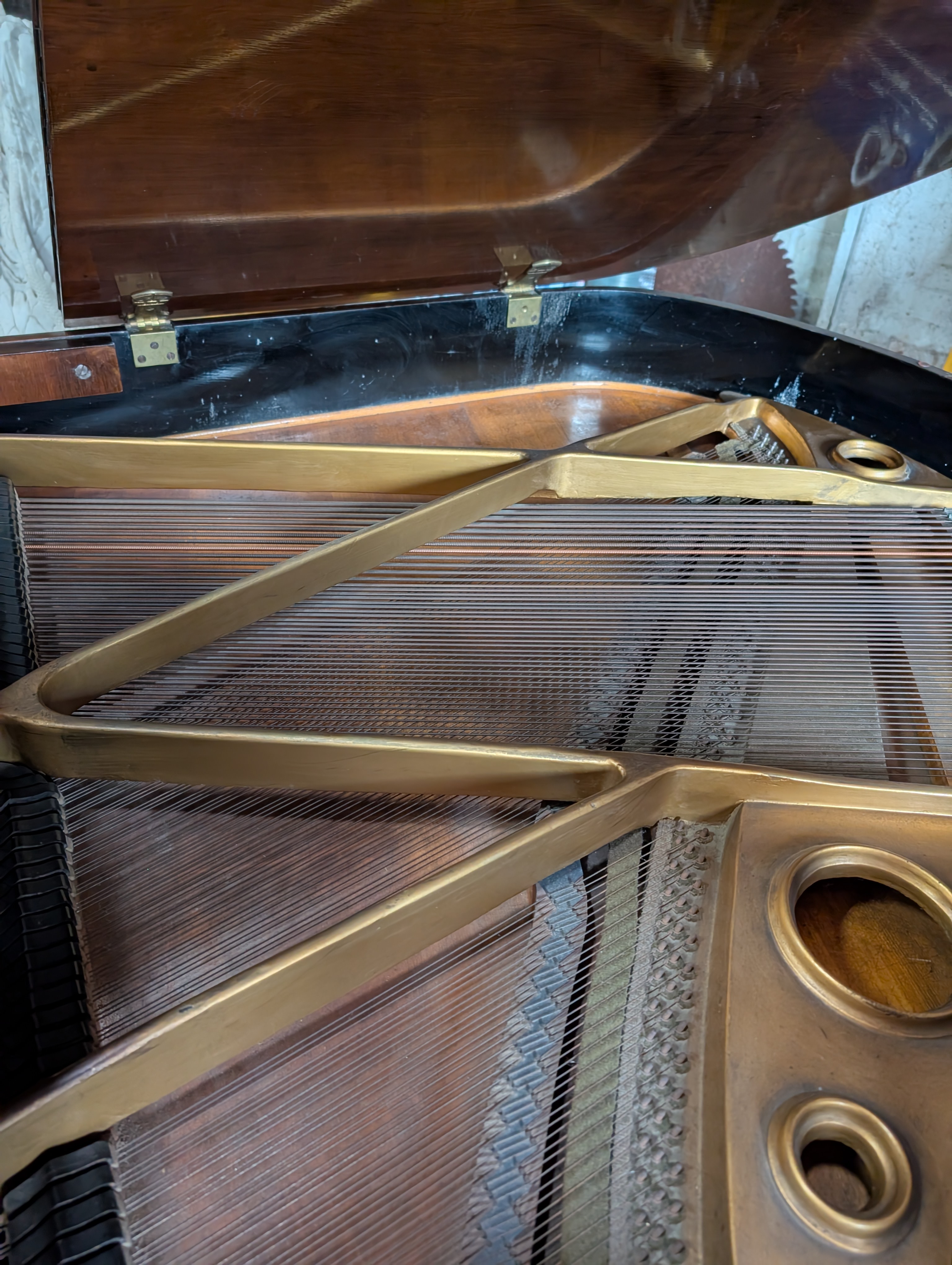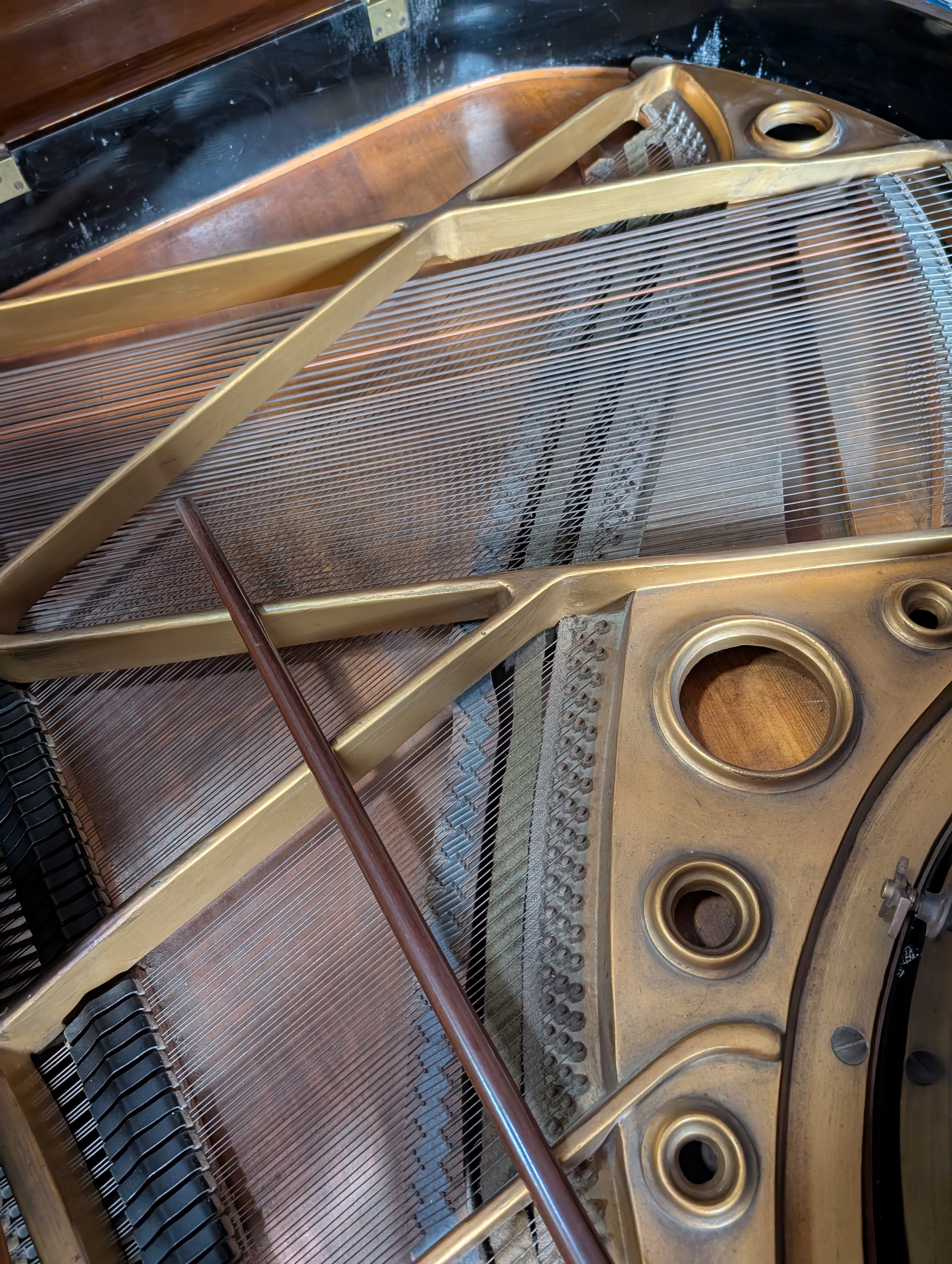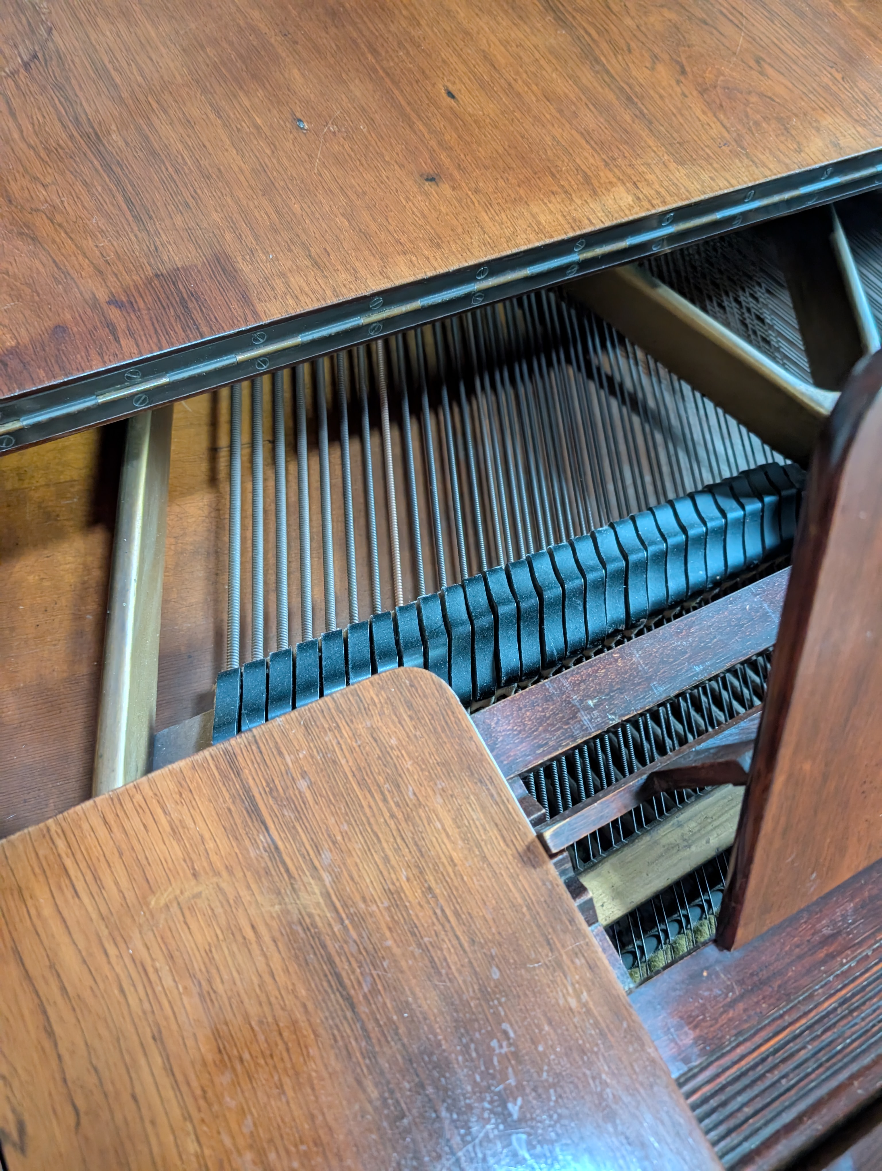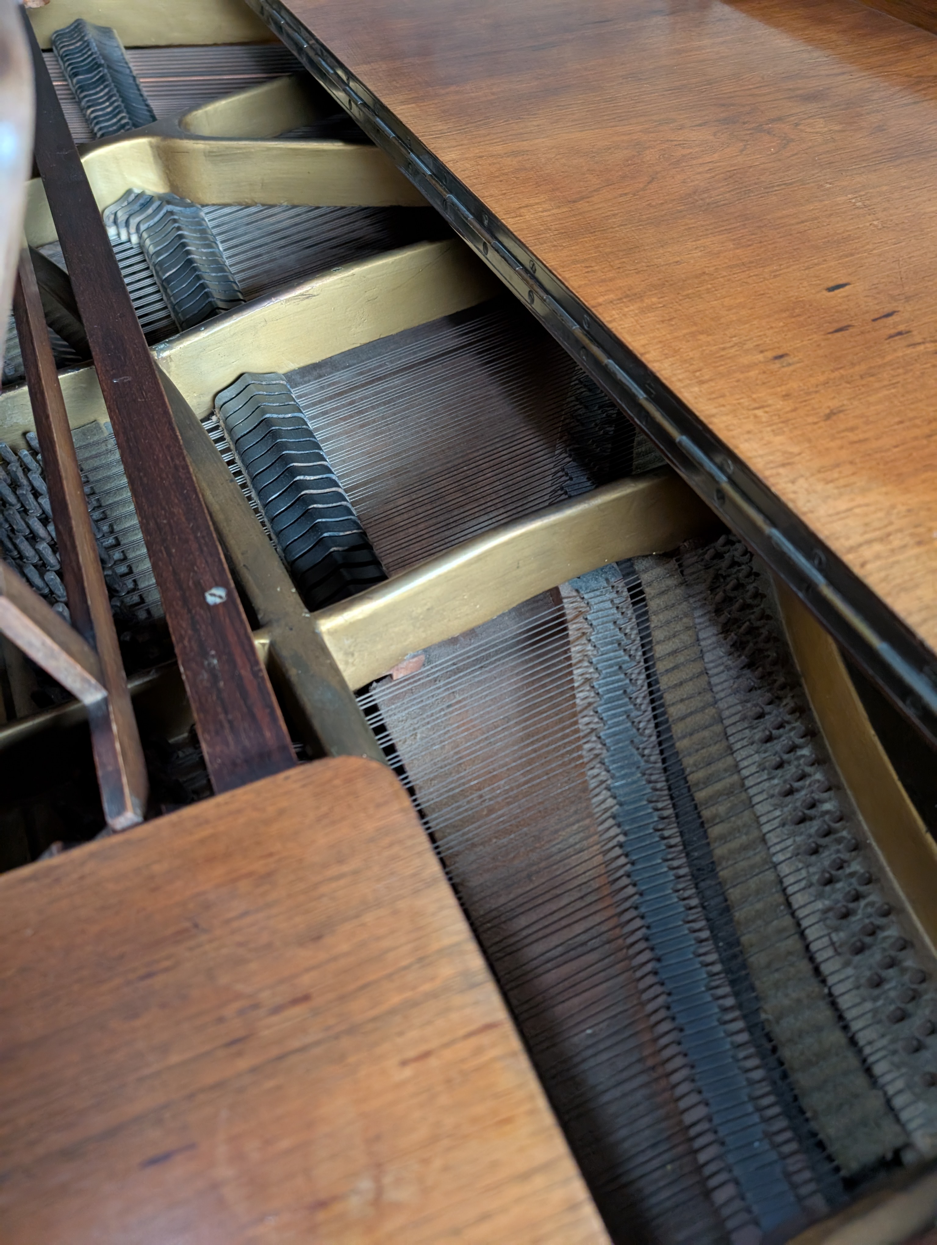 A baby grand piano made by Bogs and Voigt with mahogany case.
