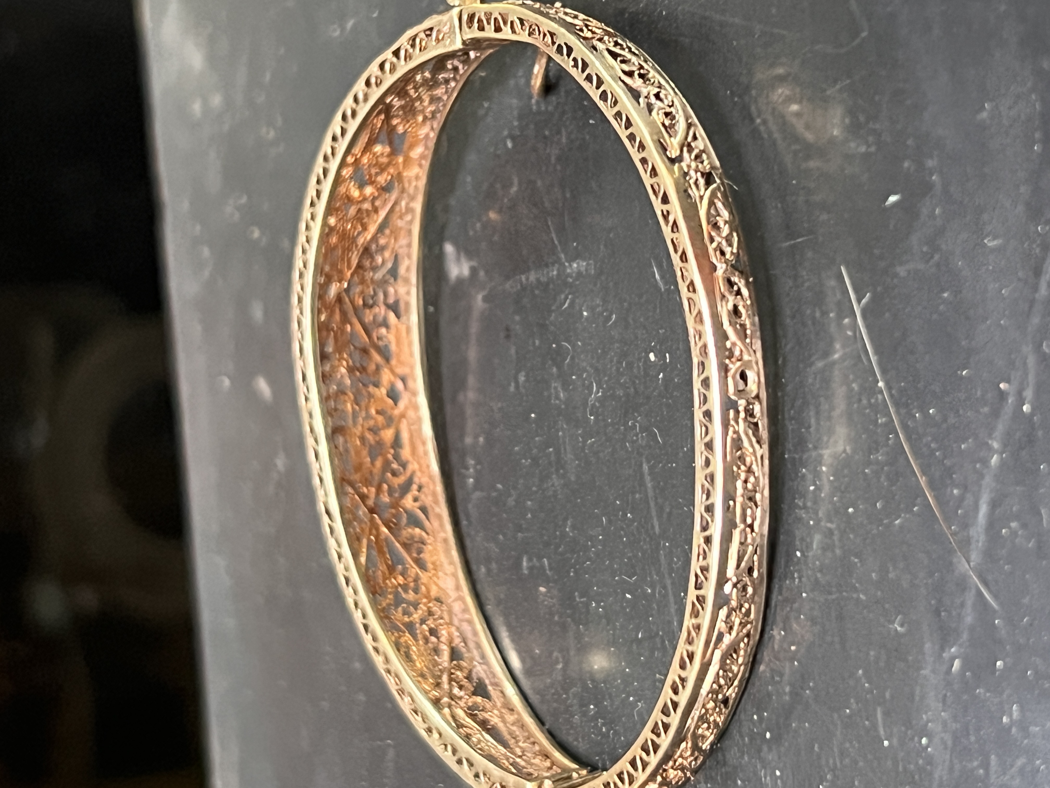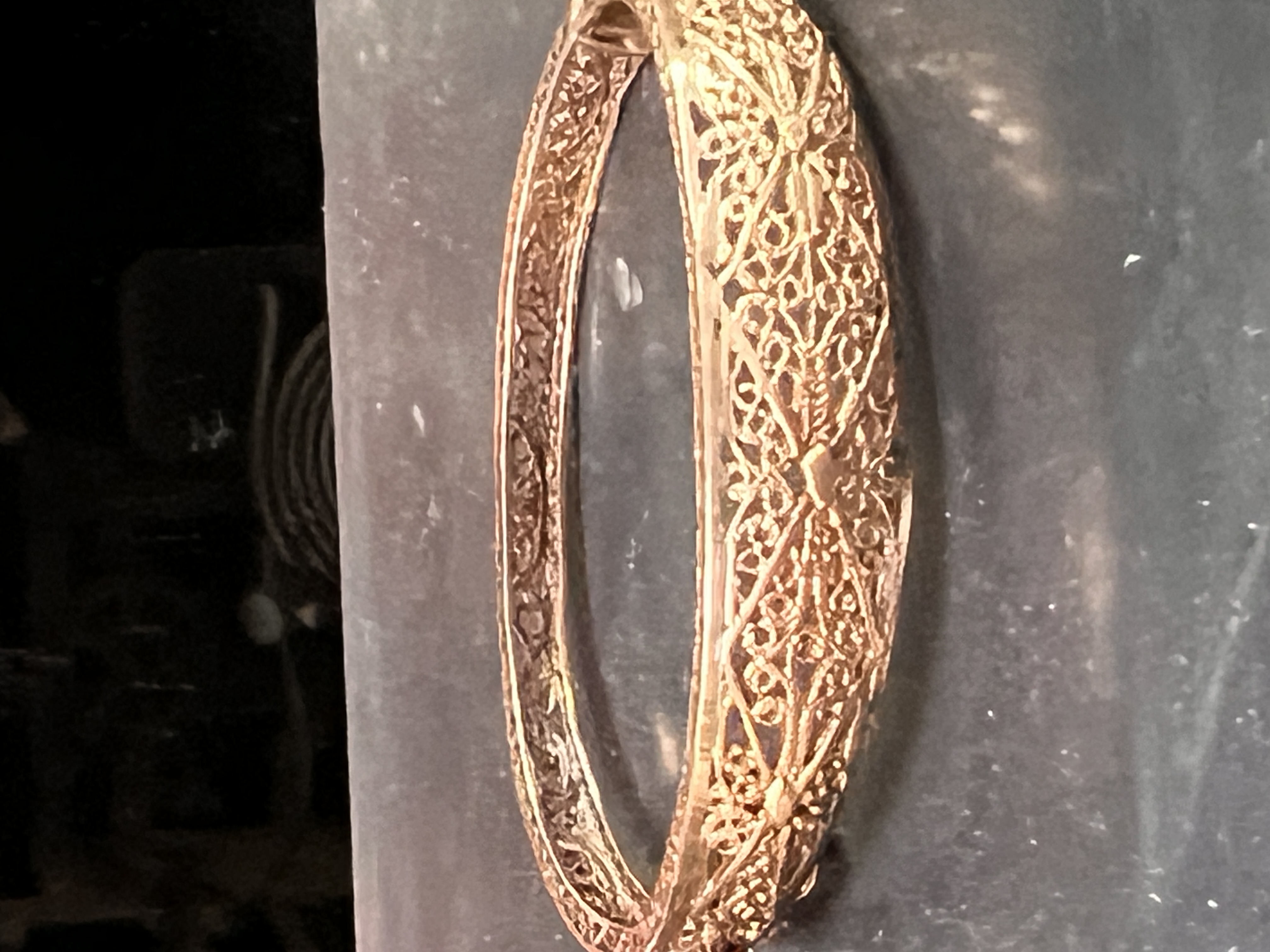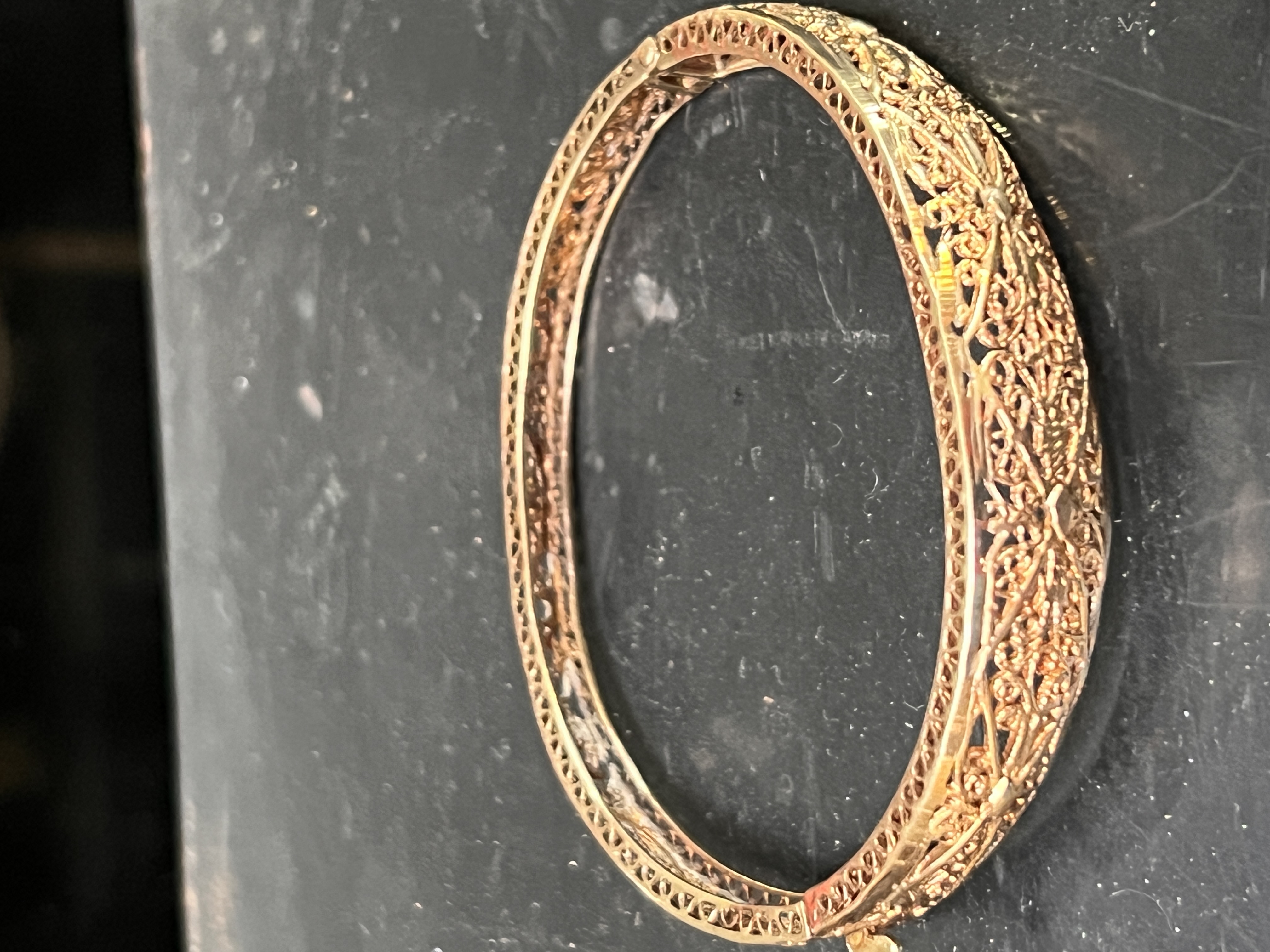 An early 20th century 9ct snap close bracelet having filigree decoration. Stamped AVD 375, weight 11.52 grams