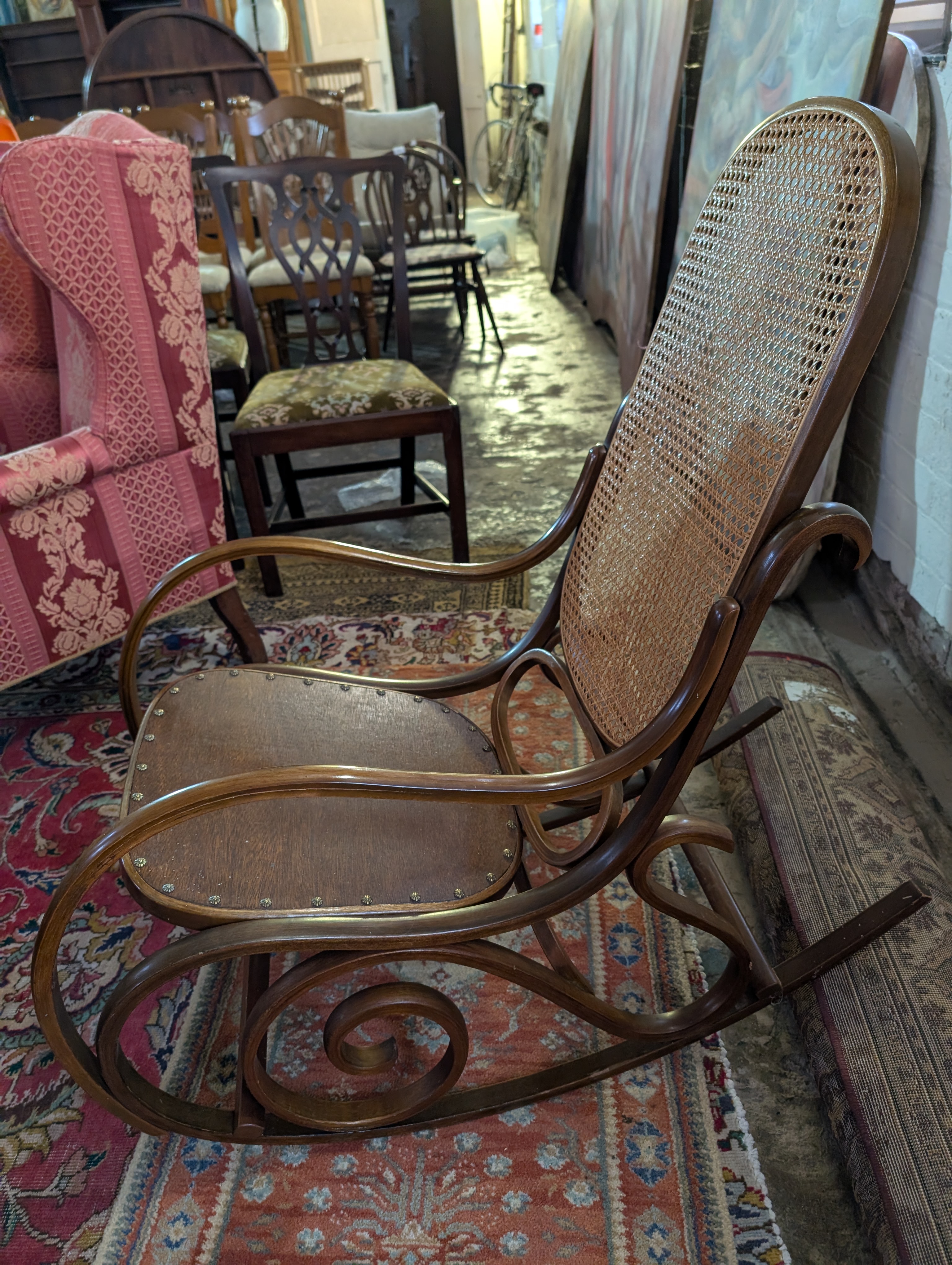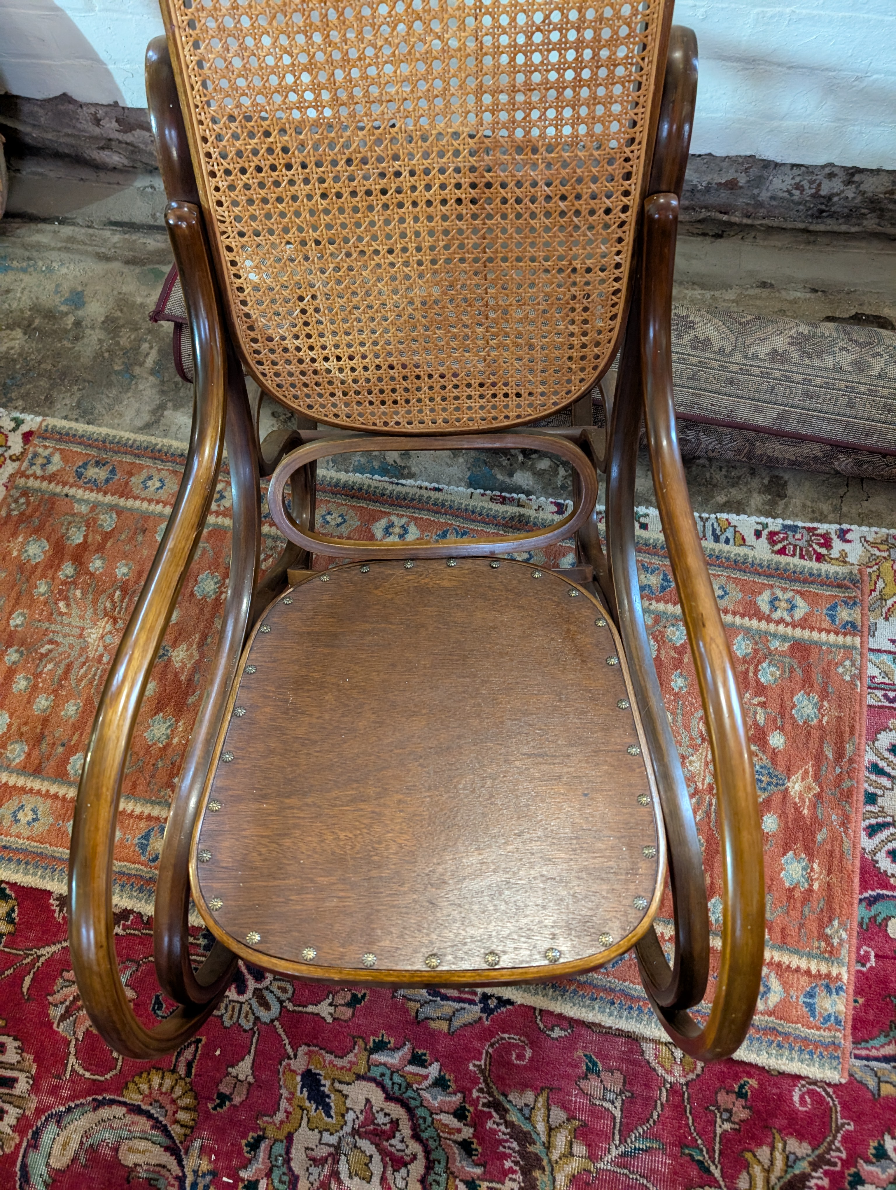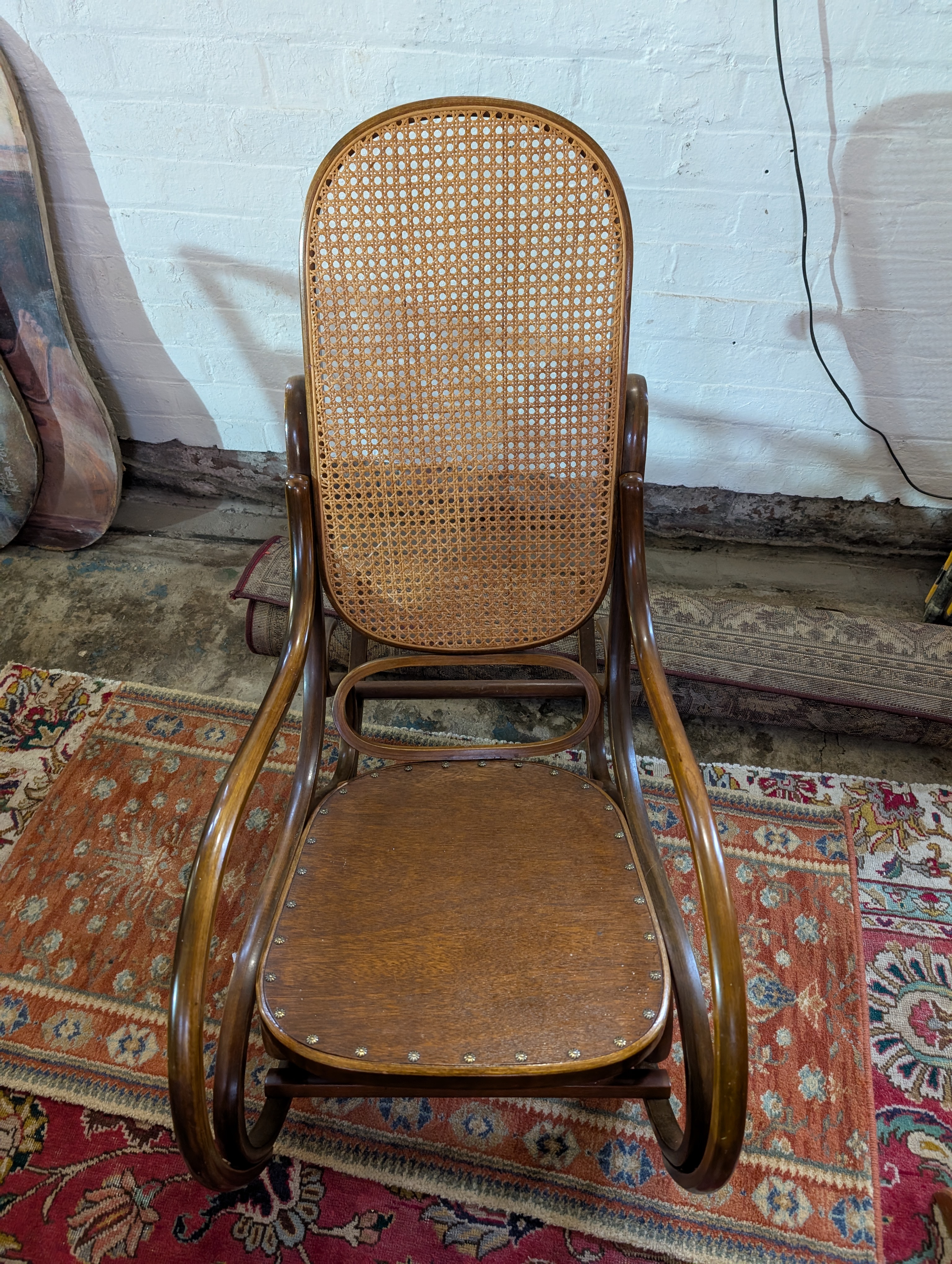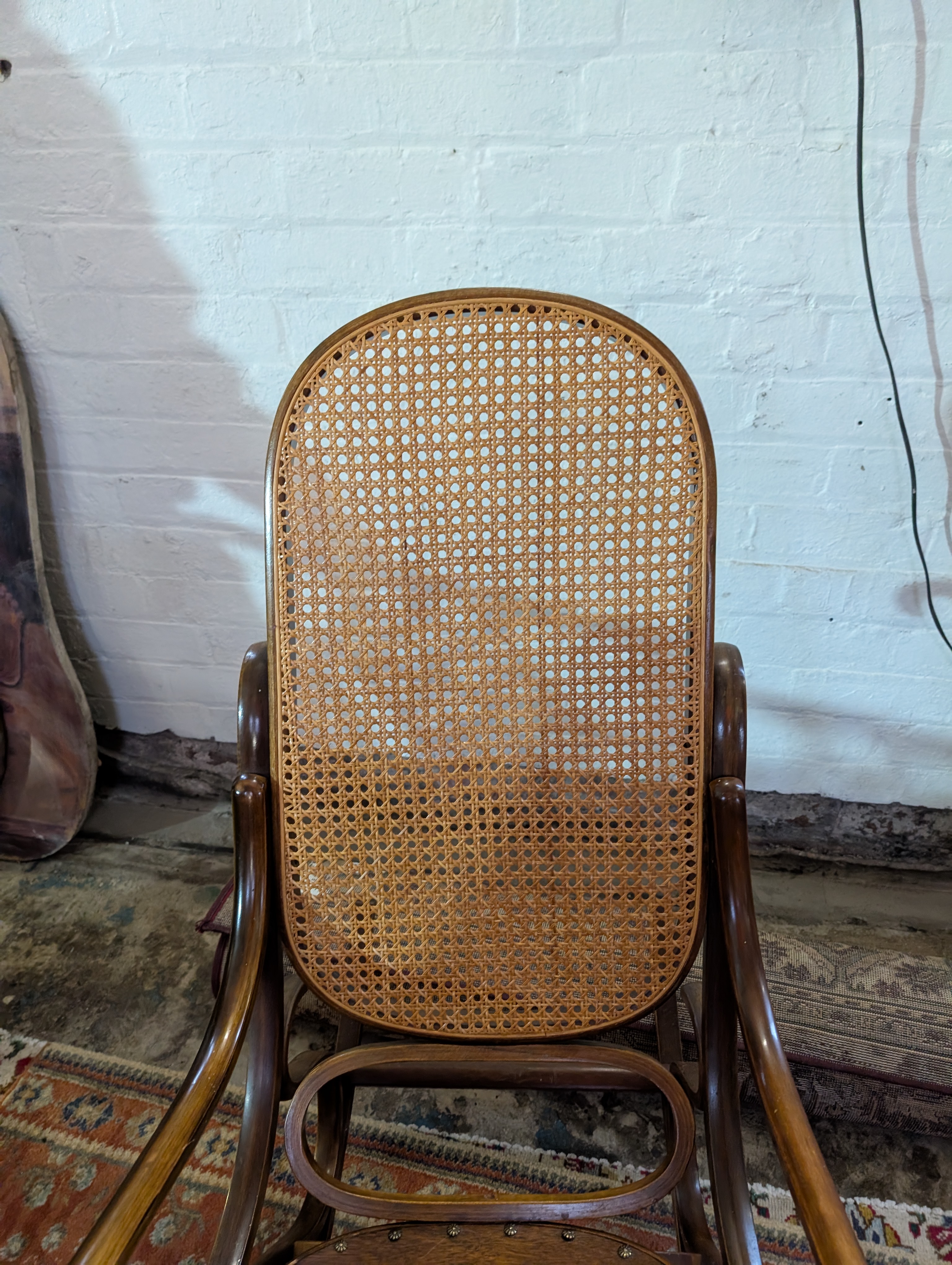 A beech framed and rattan back American style rocking chair