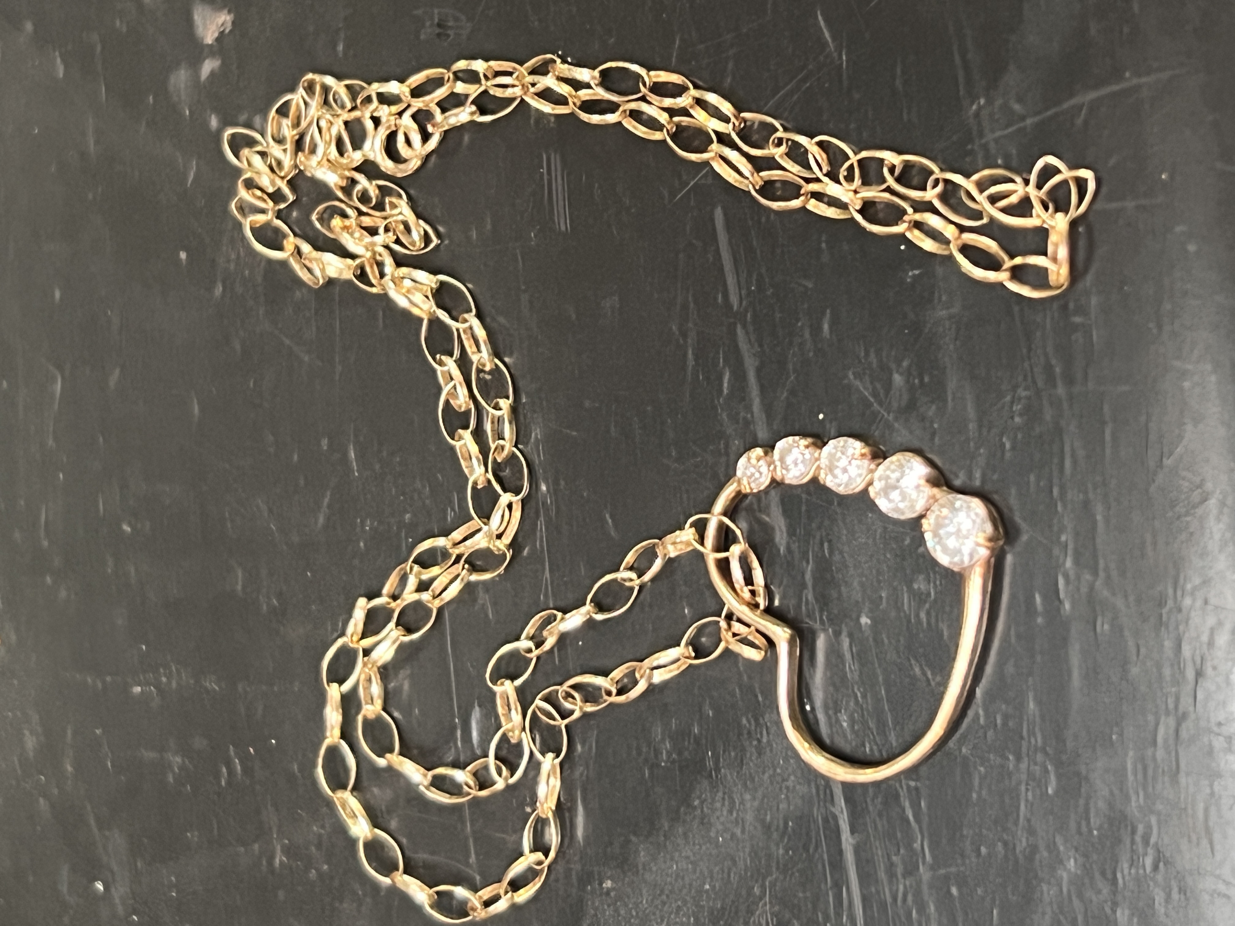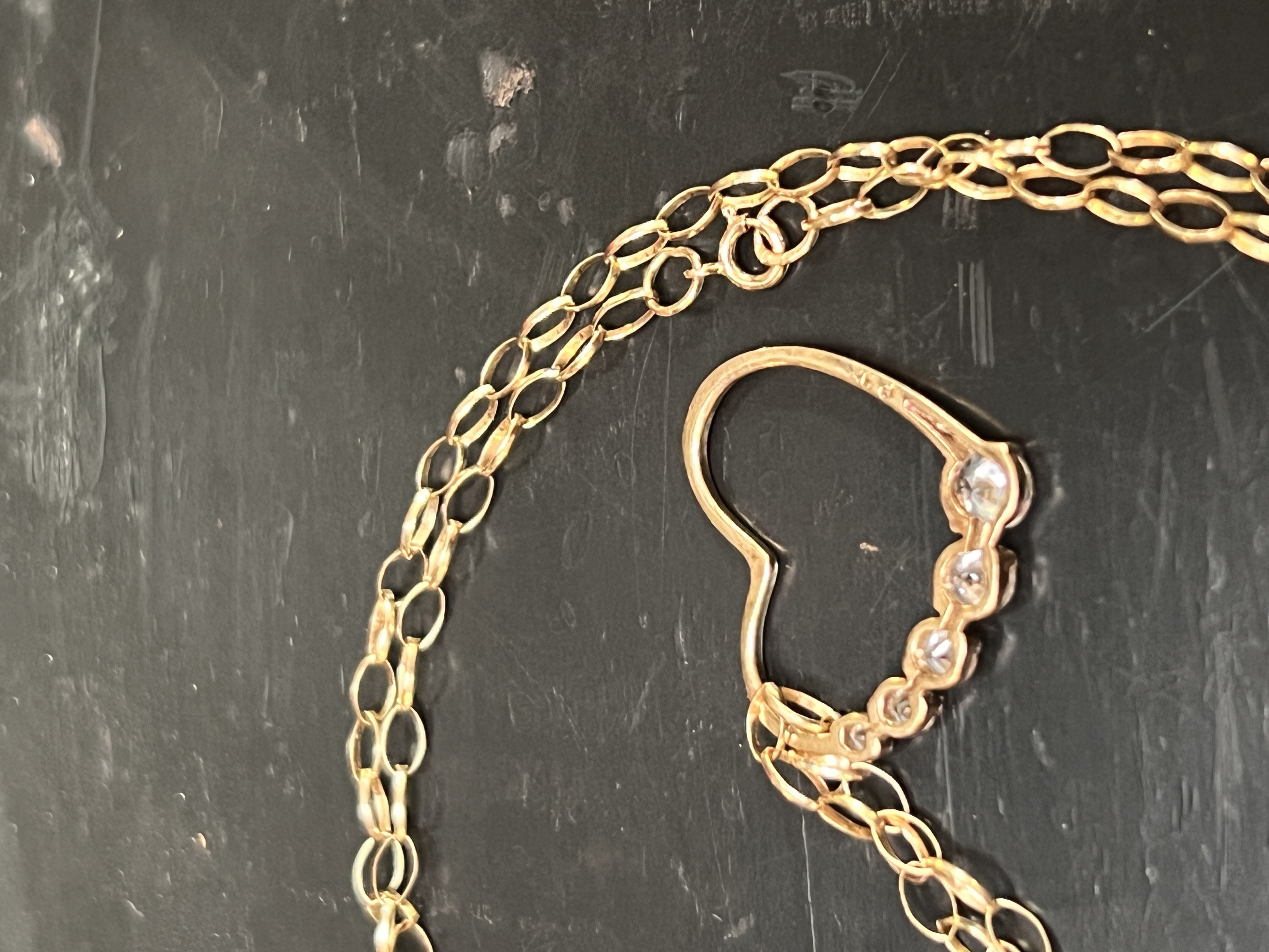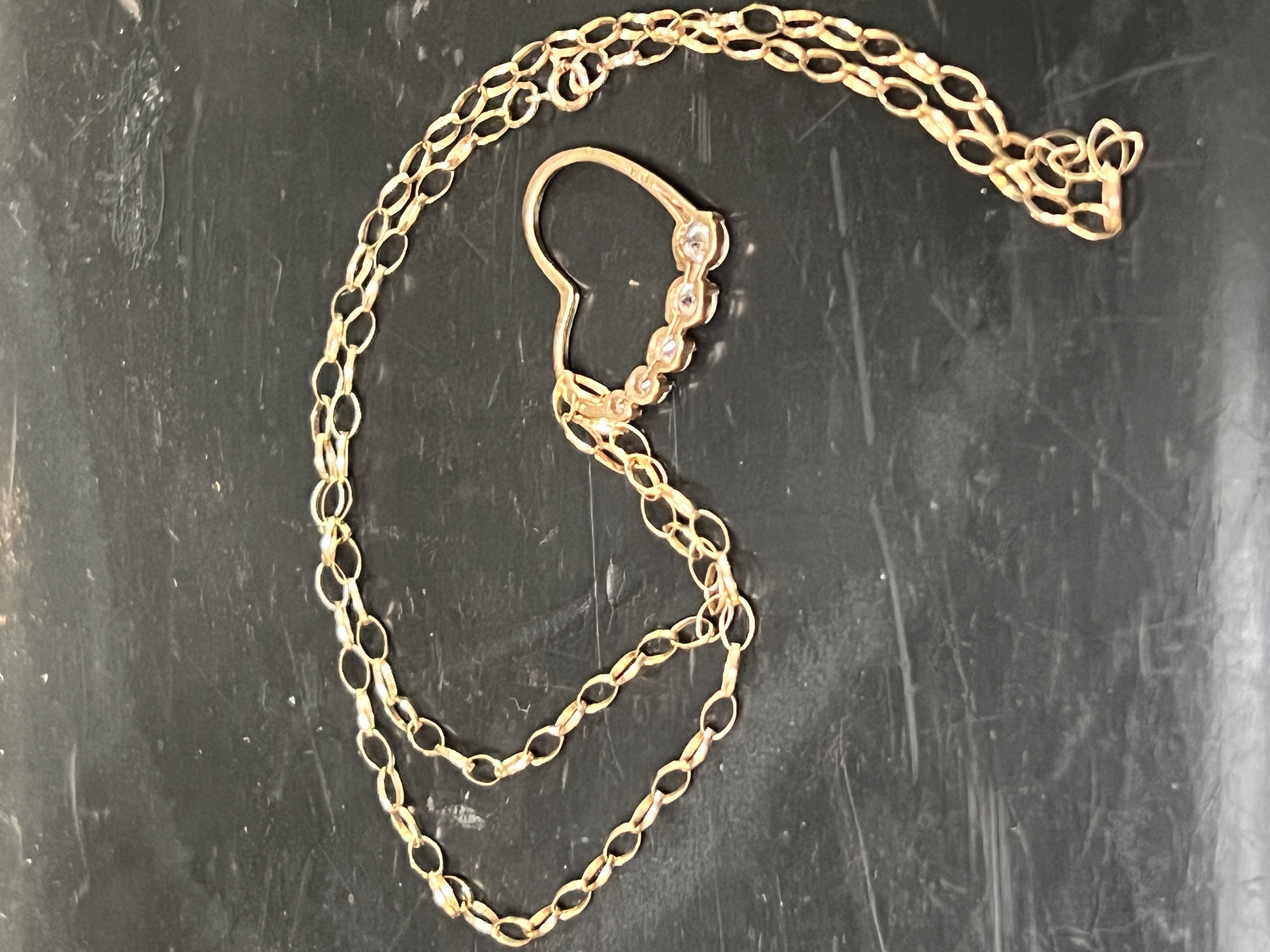 A chainlink necklace having heart shaped pendant with five graduated stones. stamped 9ct