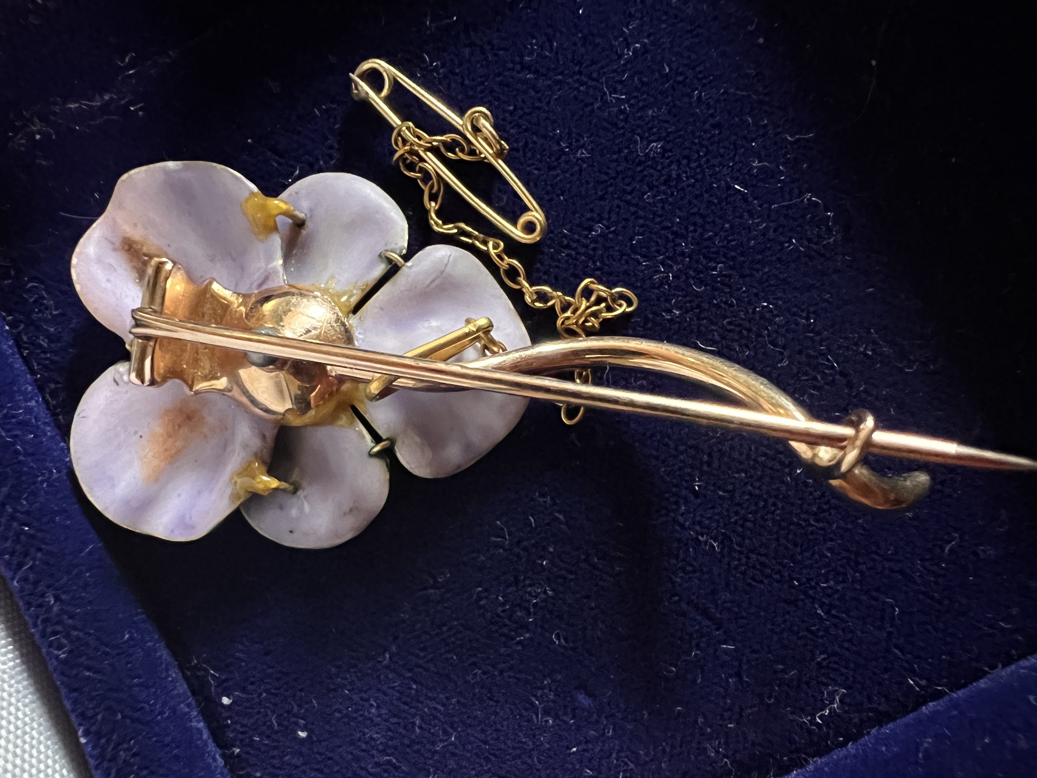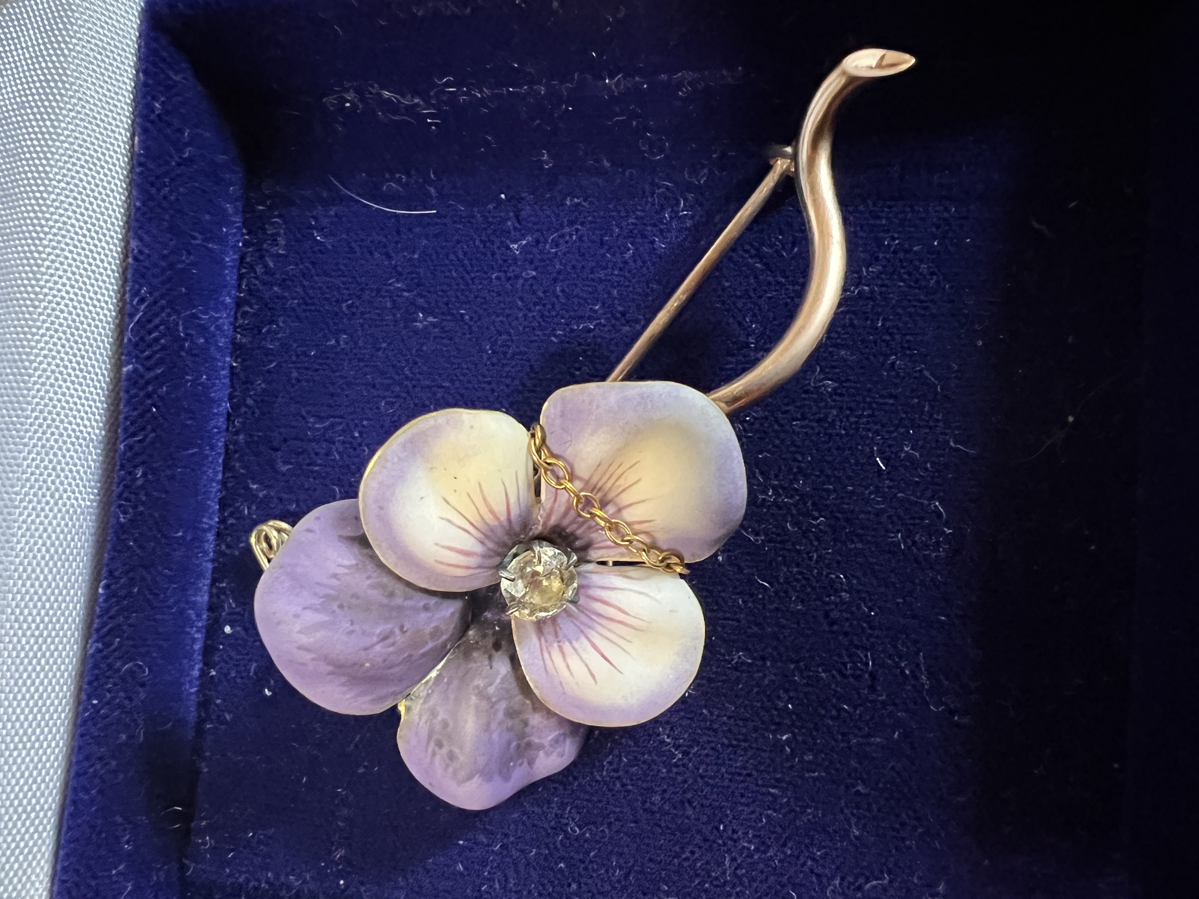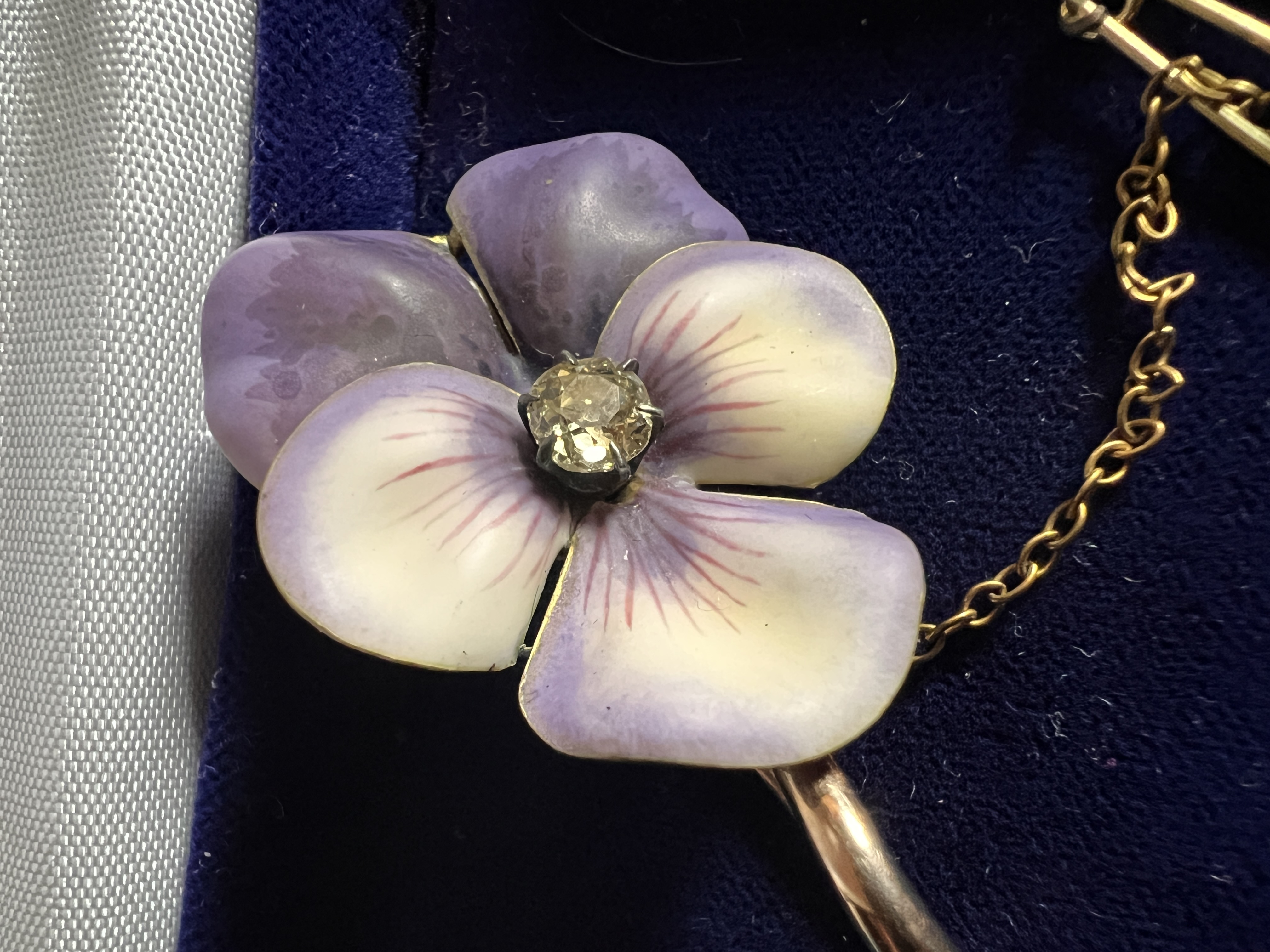 A ladies stylised brooch on the form of a leaf and flower with gold bar and central diamond. 9.8 grams