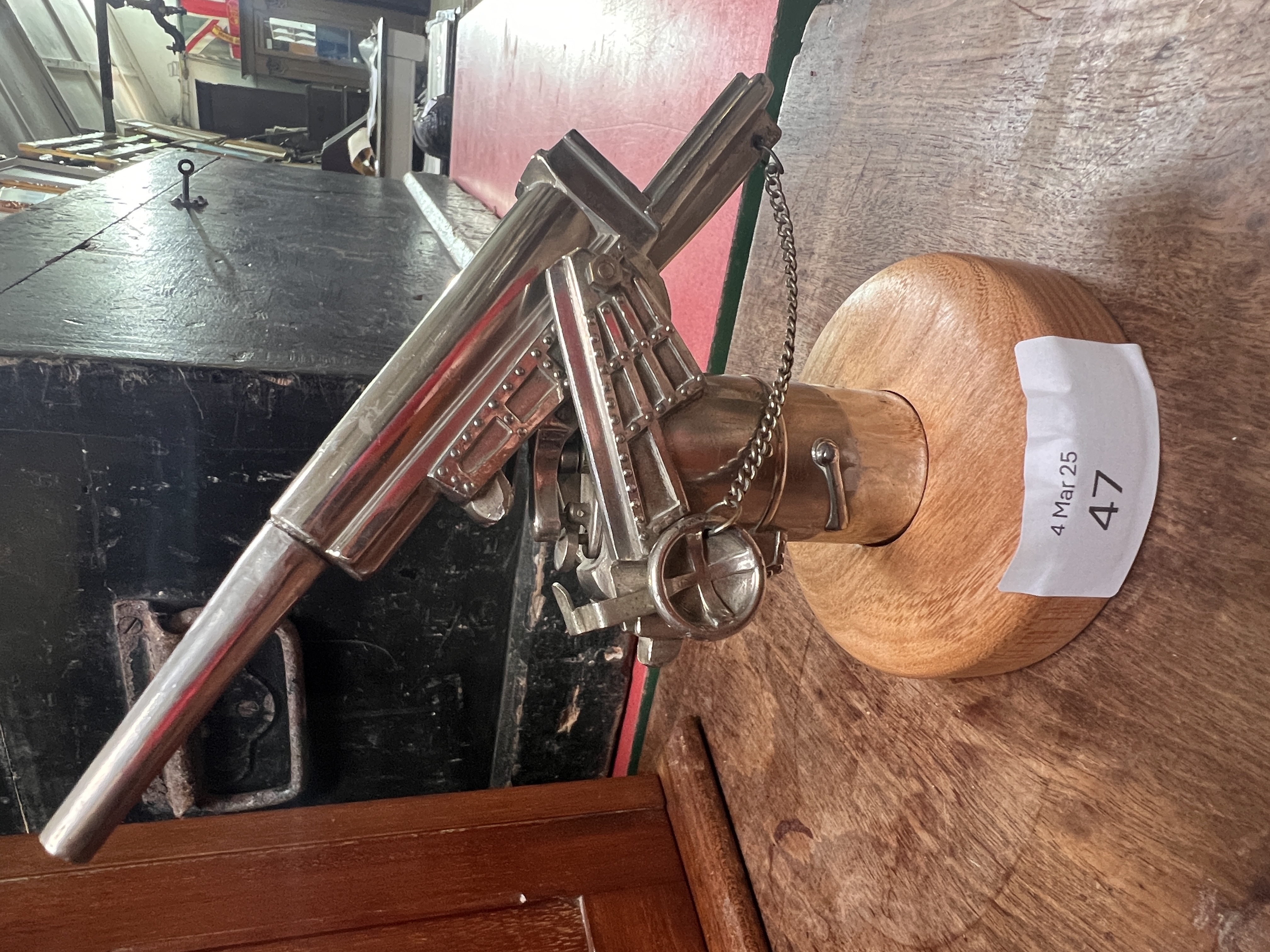 A table-top cigarette lighter in the form of a naval battleship gun with wooden base.