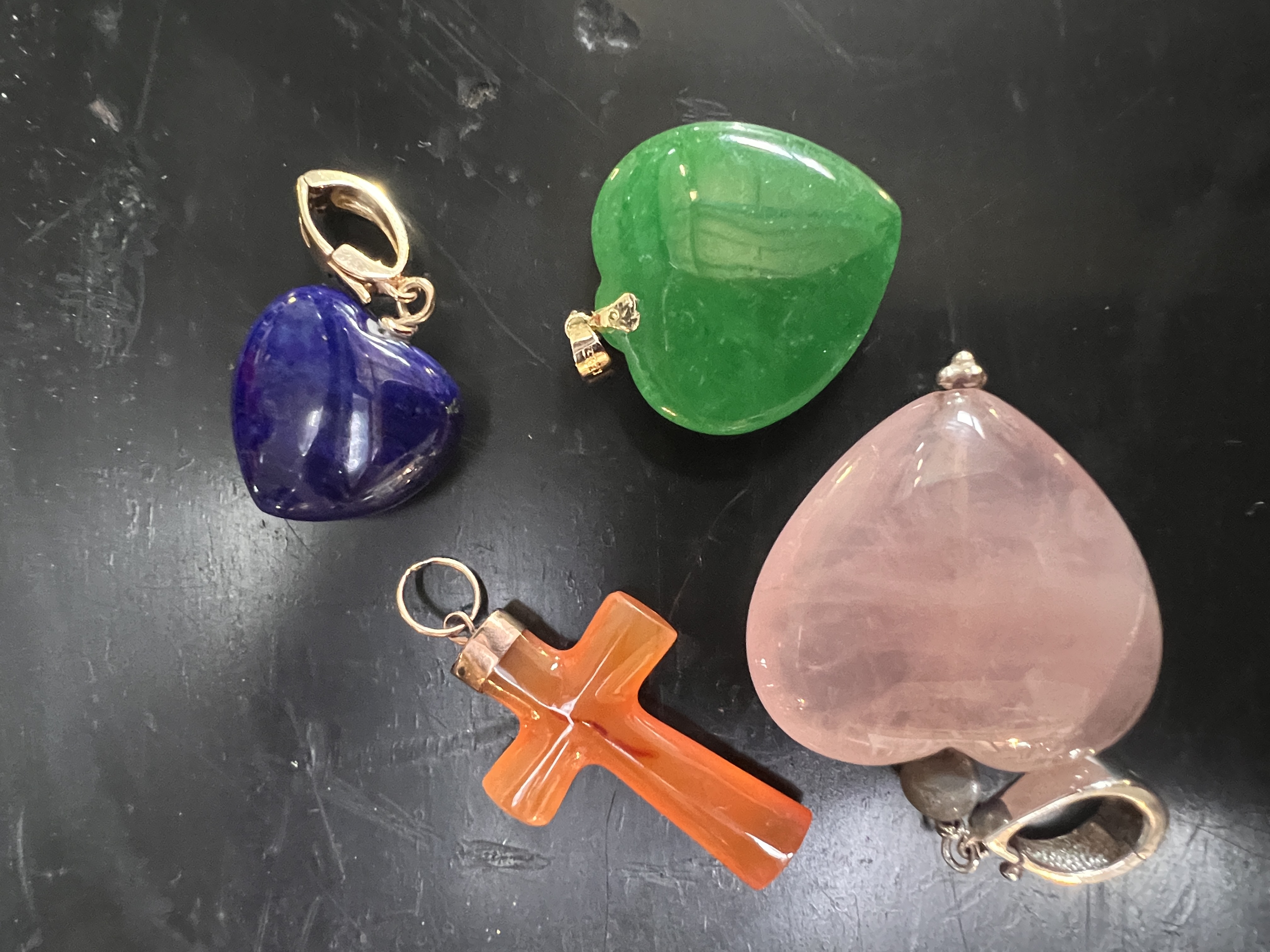 Four semi-precious stone pendants including cornelian cross, rose quartz 925 clasp, lapis heart 375 clasp and jade 14ct clasp.