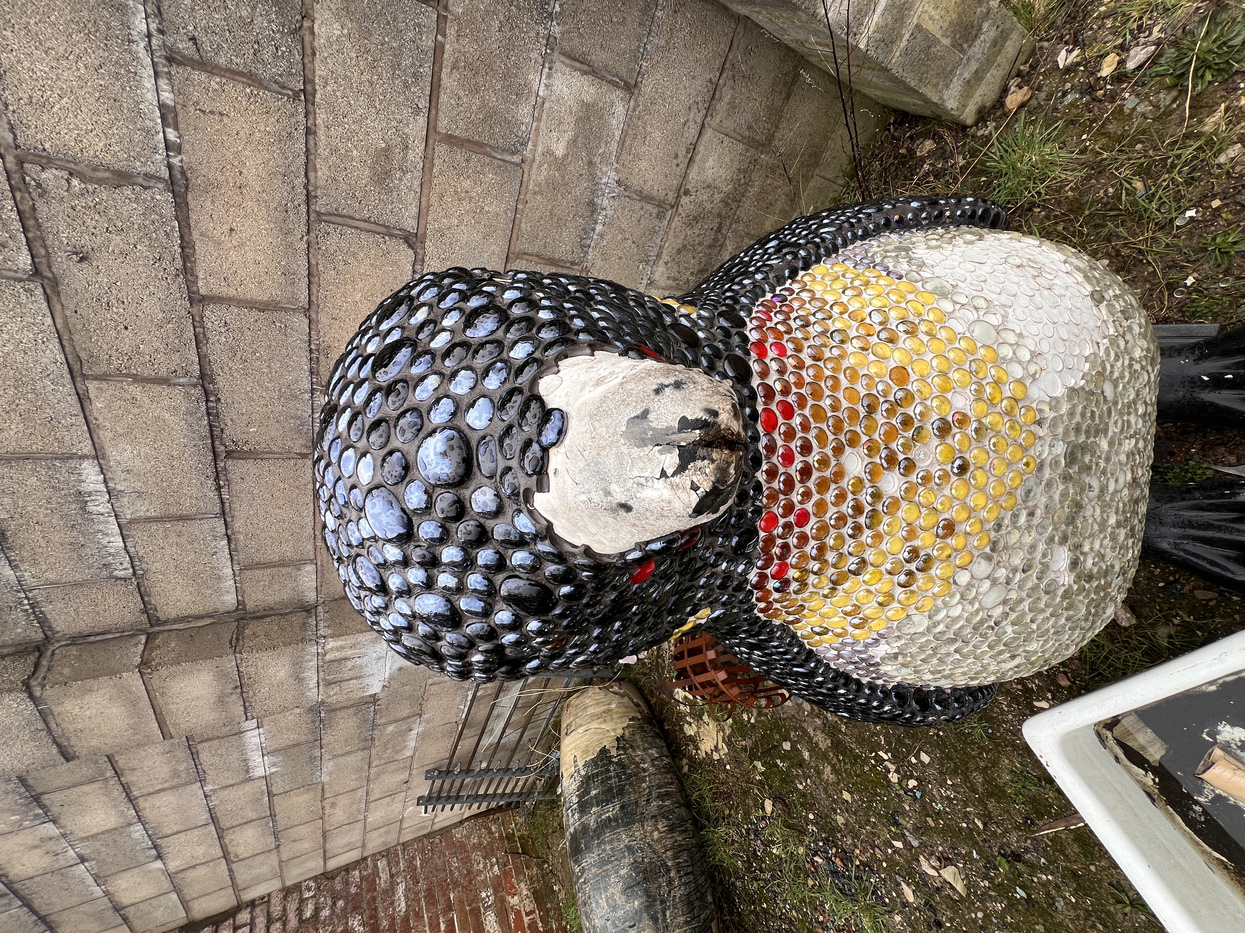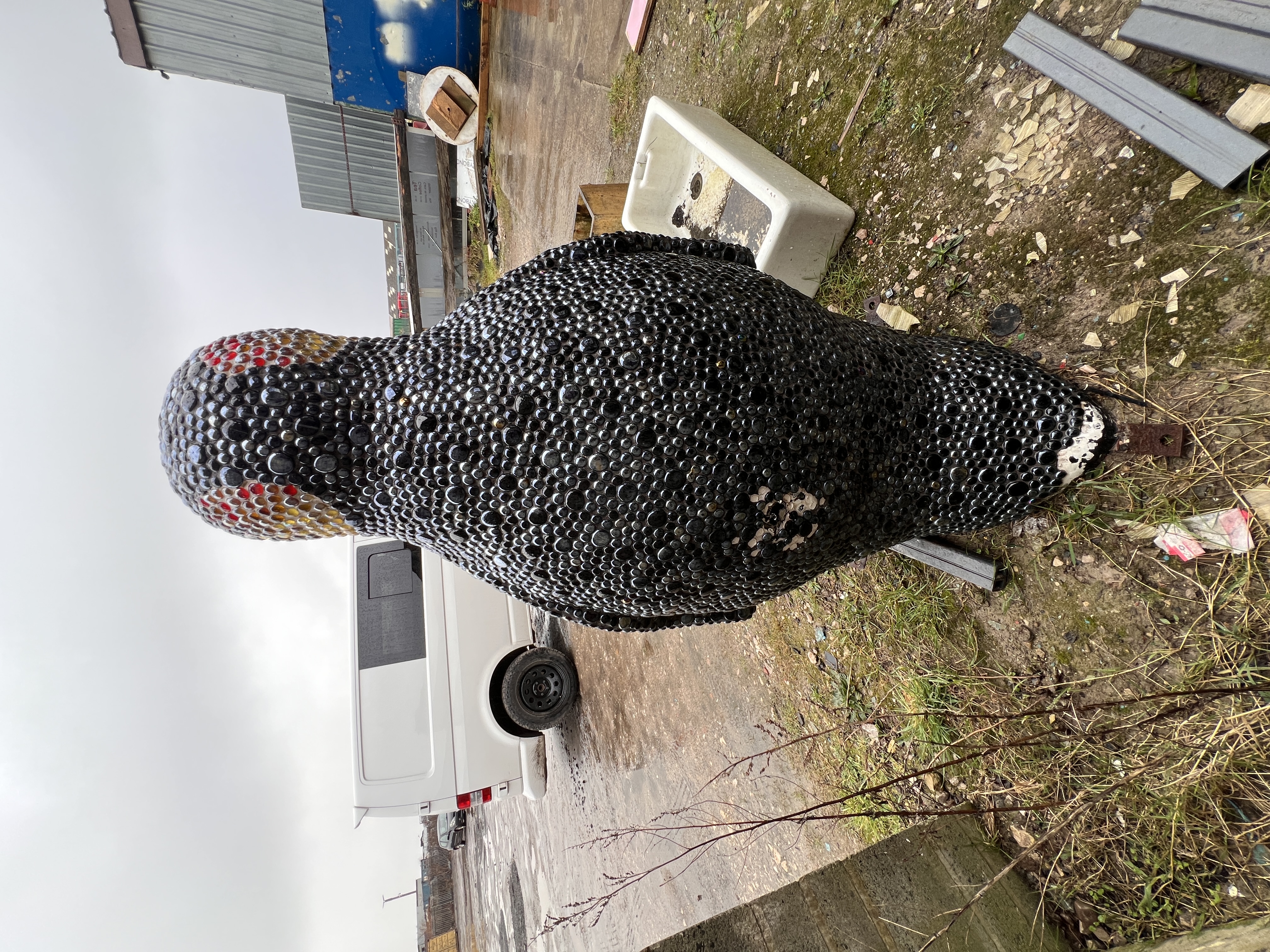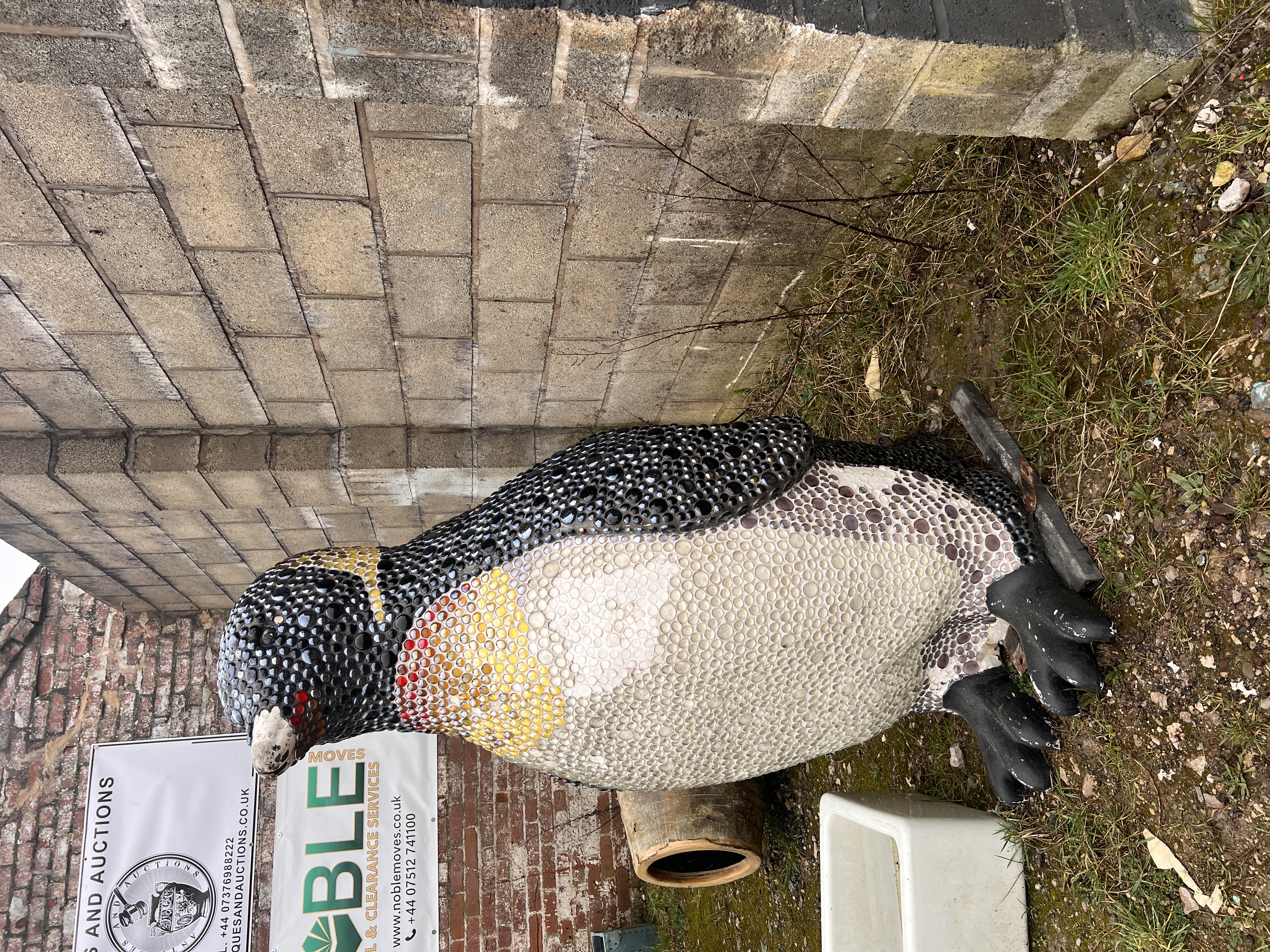 A large mosaic sculpture of an Emperor penguin, decorated with glass beads aprox 5ft tall, some loss of decoration.