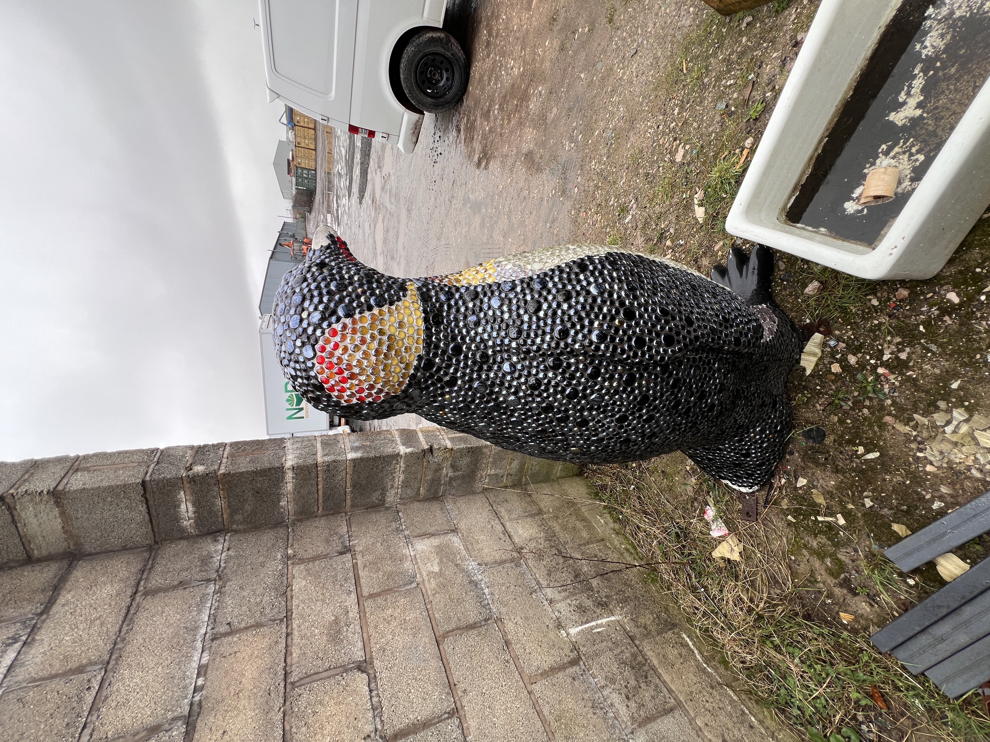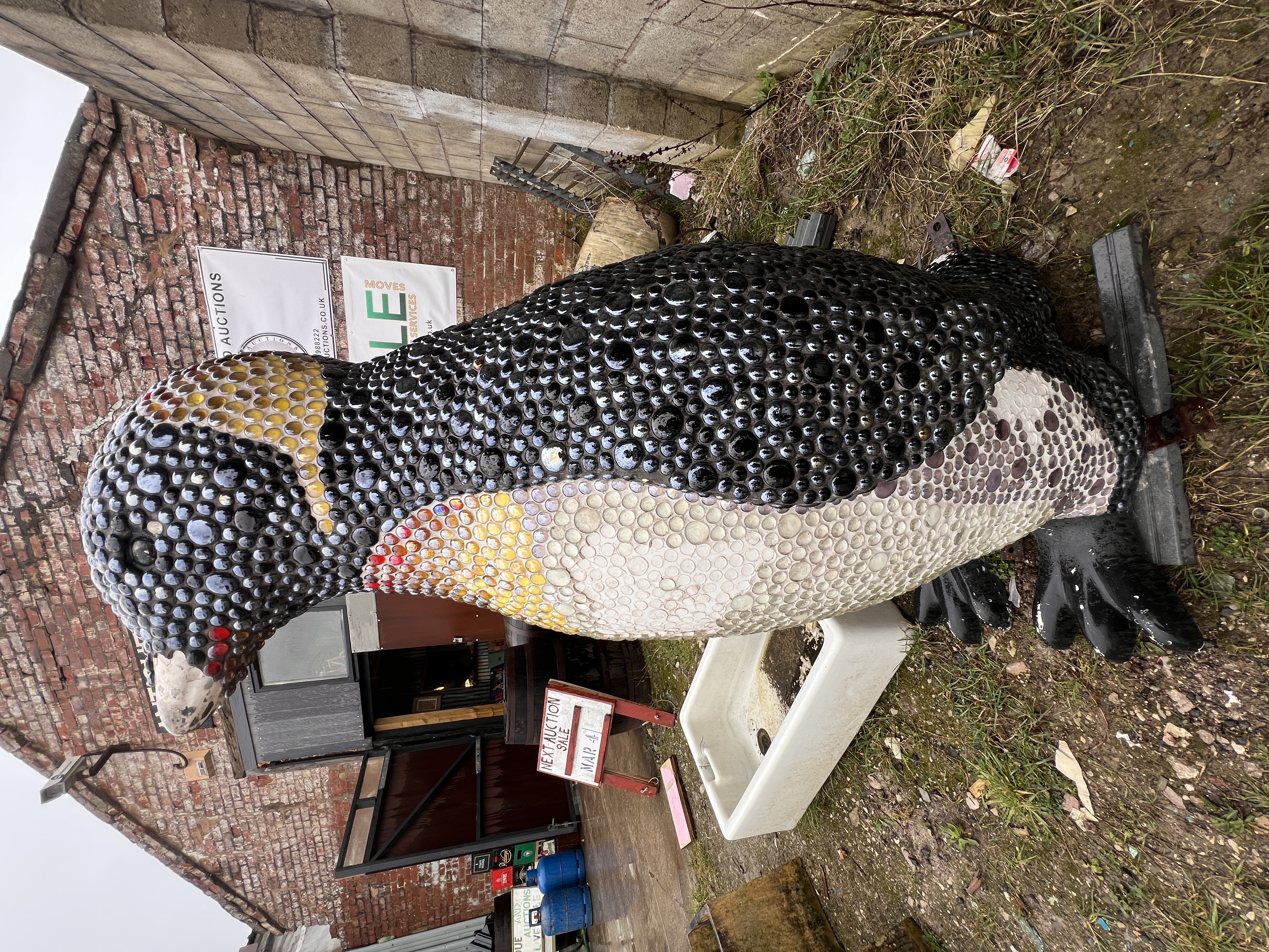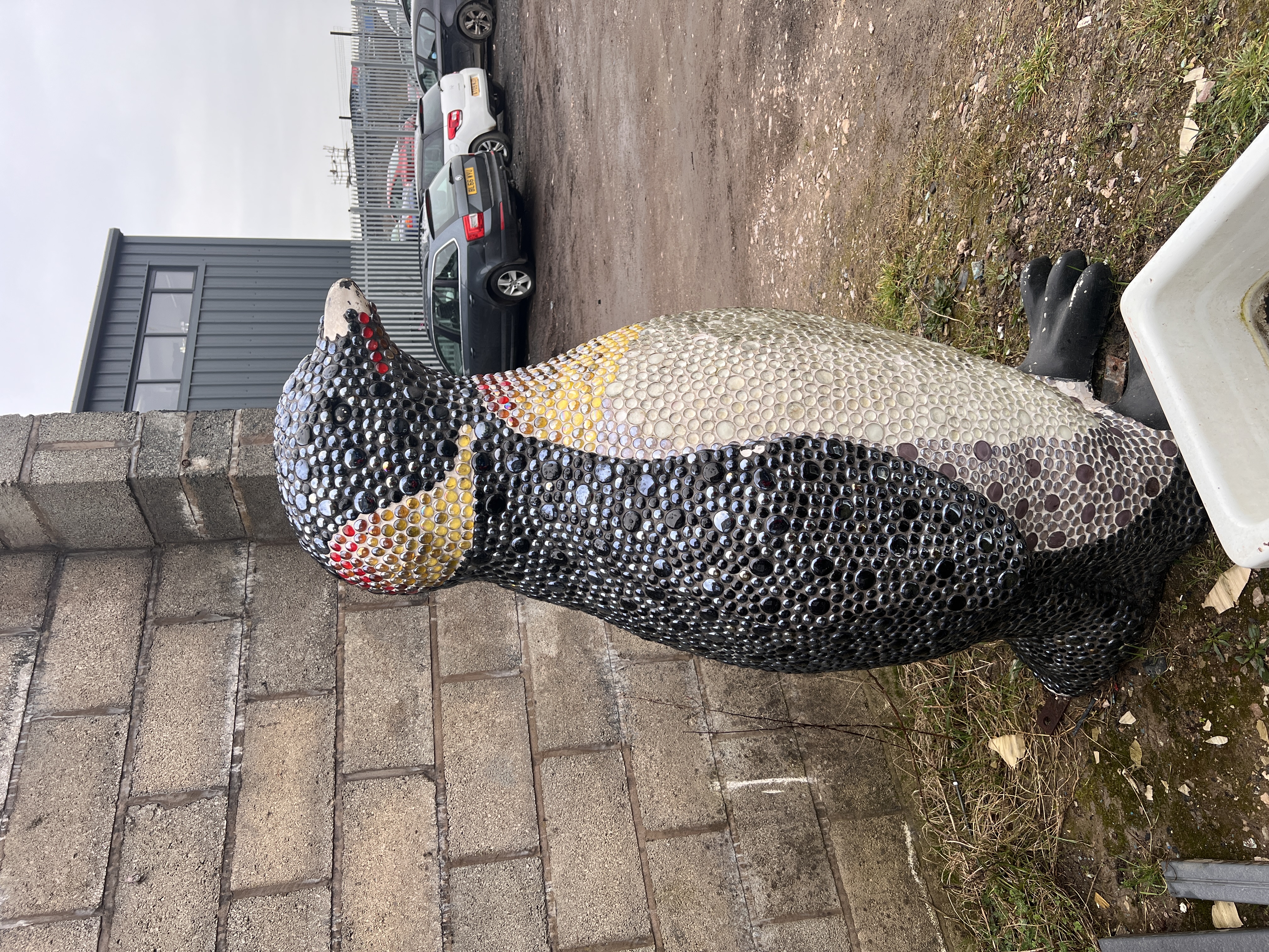 A large mosaic sculpture of an Emperor penguin, decorated with glass beads aprox 5ft tall, some loss of decoration.