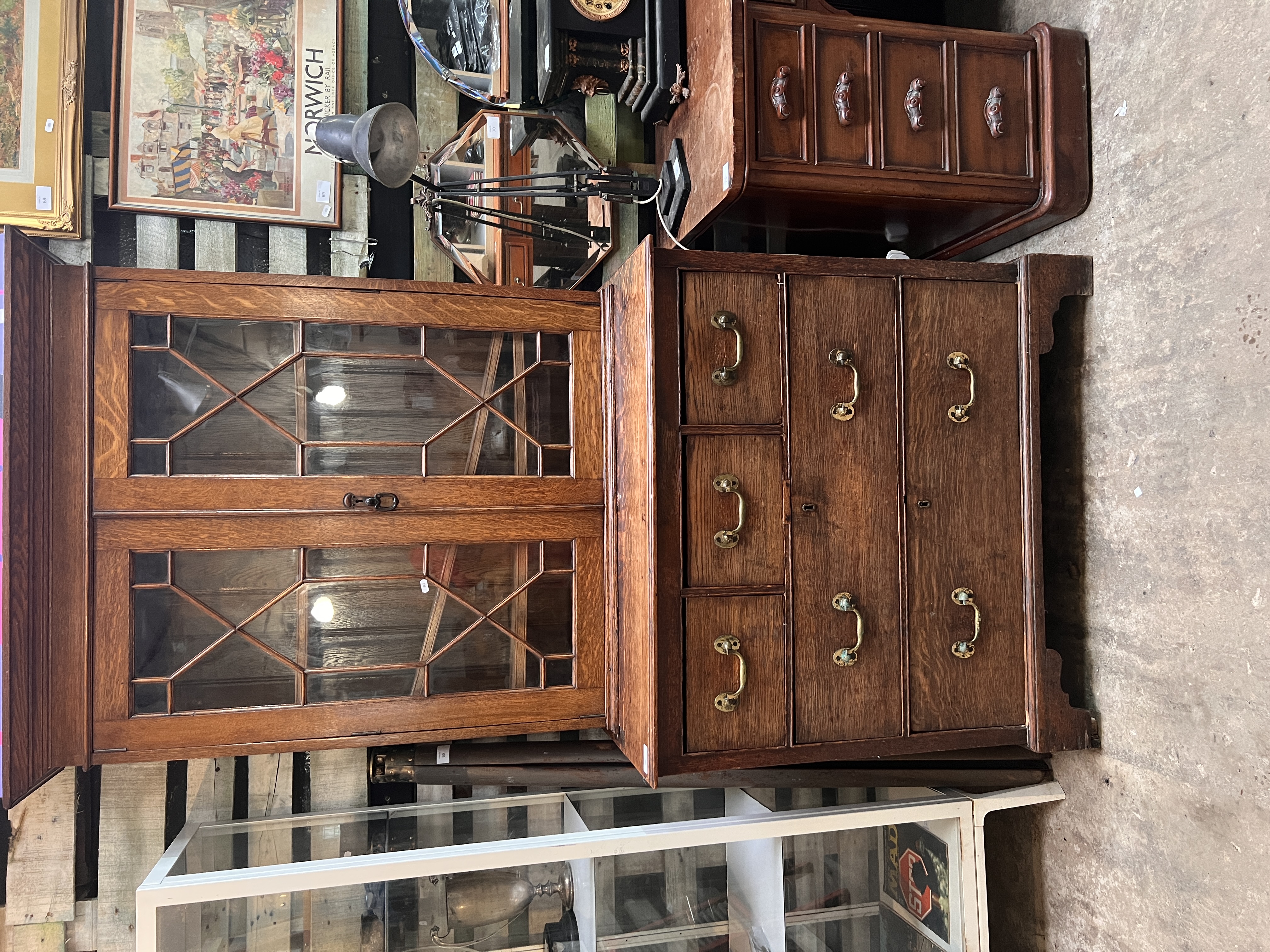 A Victorian oak chest of three over two drawers with glazed dresser top.