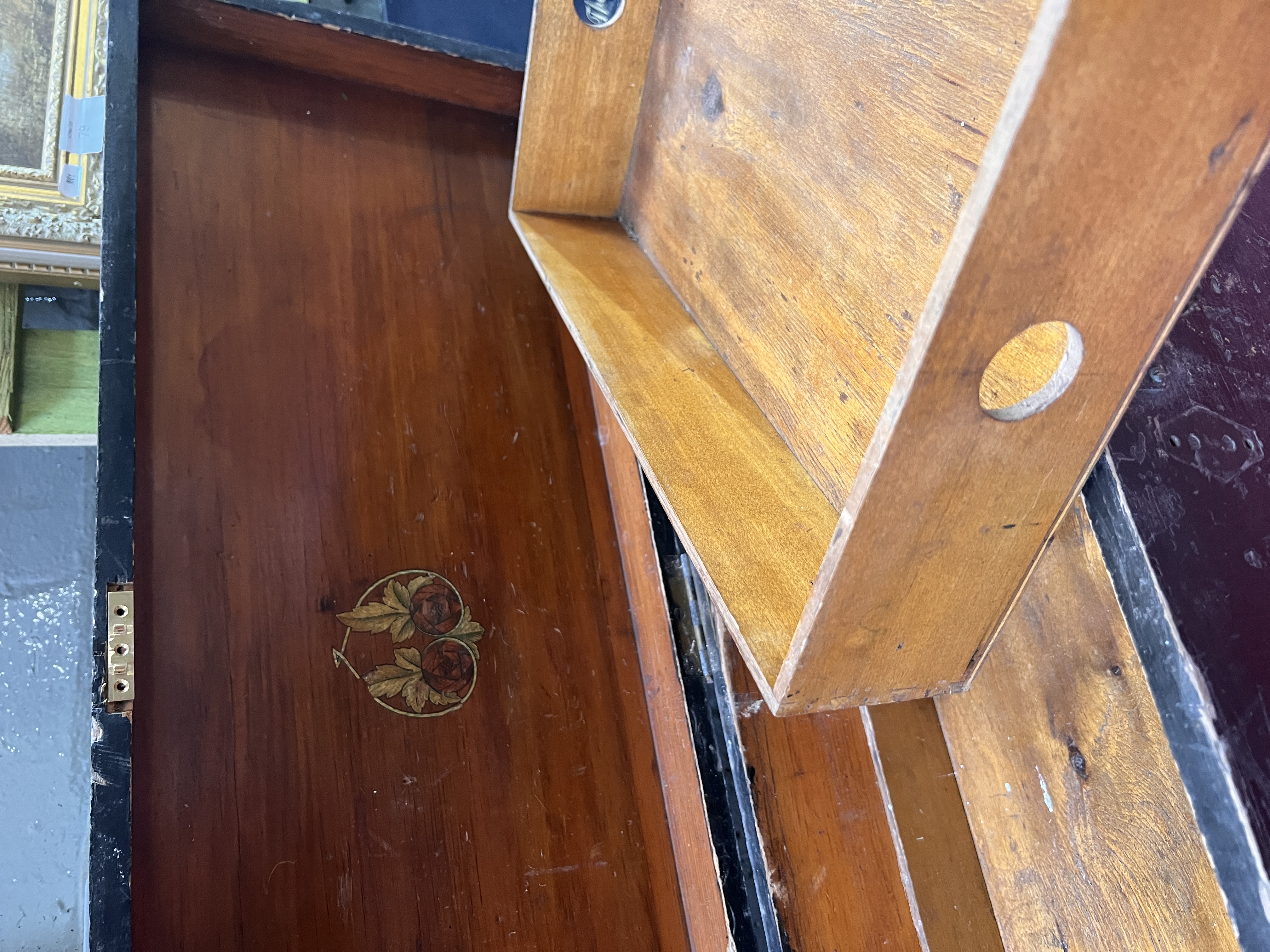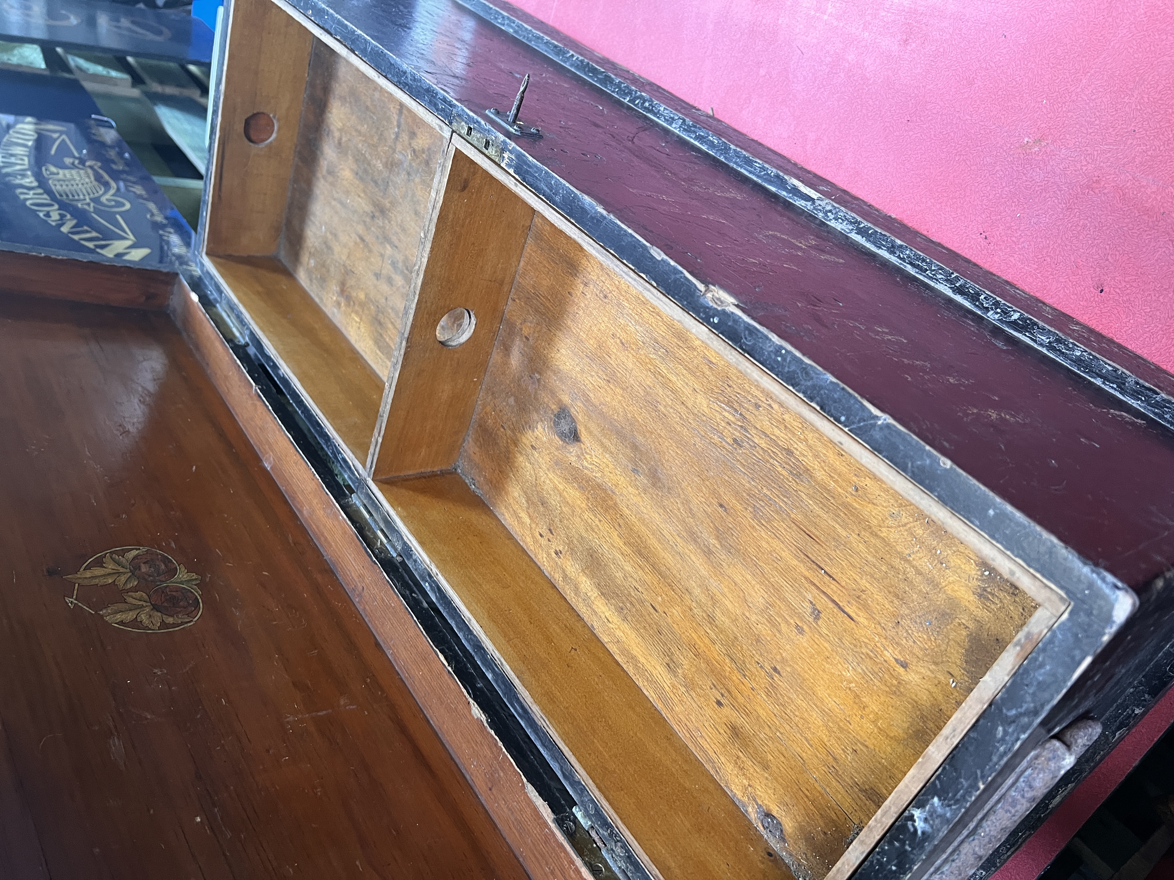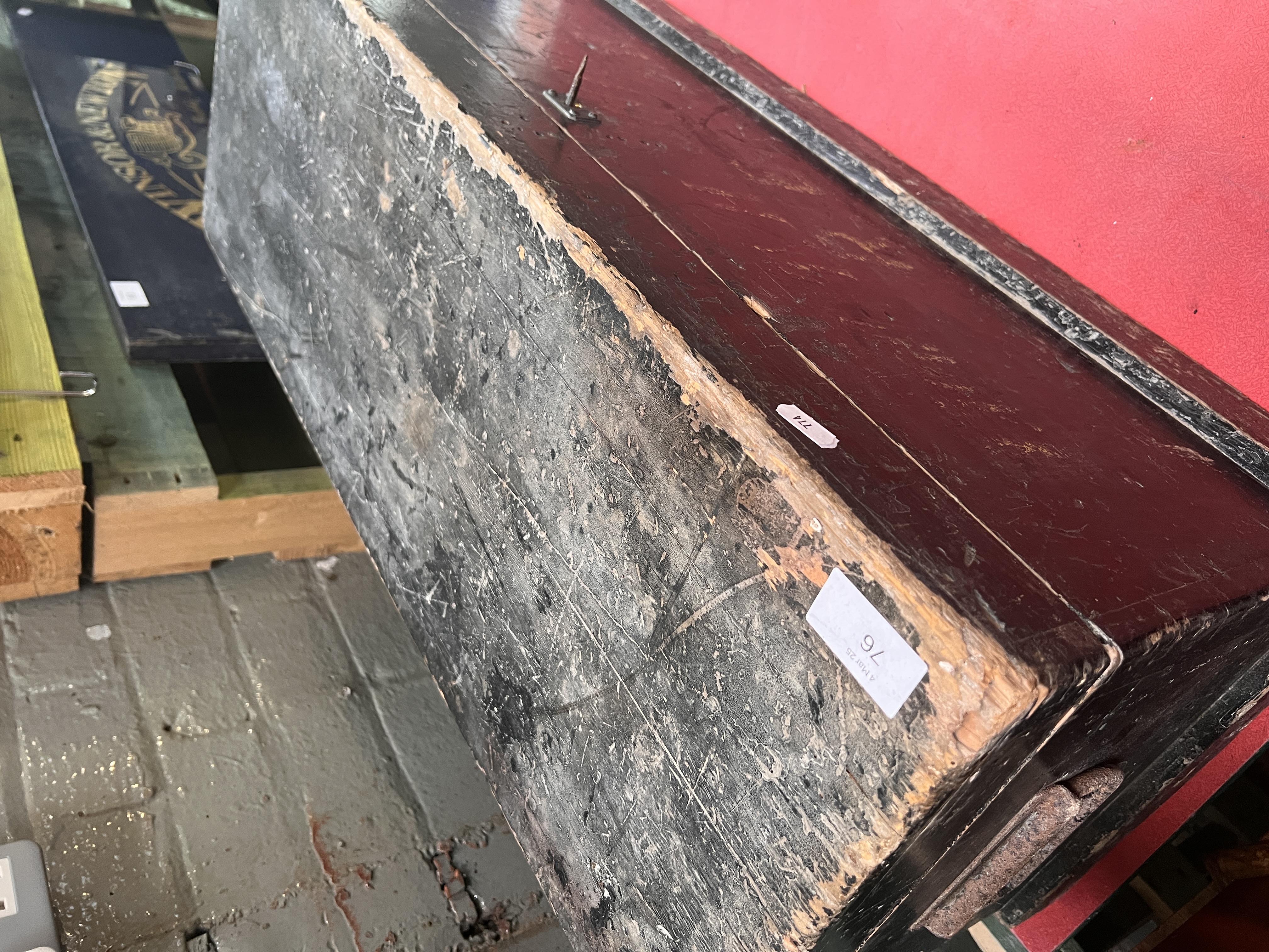 A vintage painted pine tool chest with inner compartments.