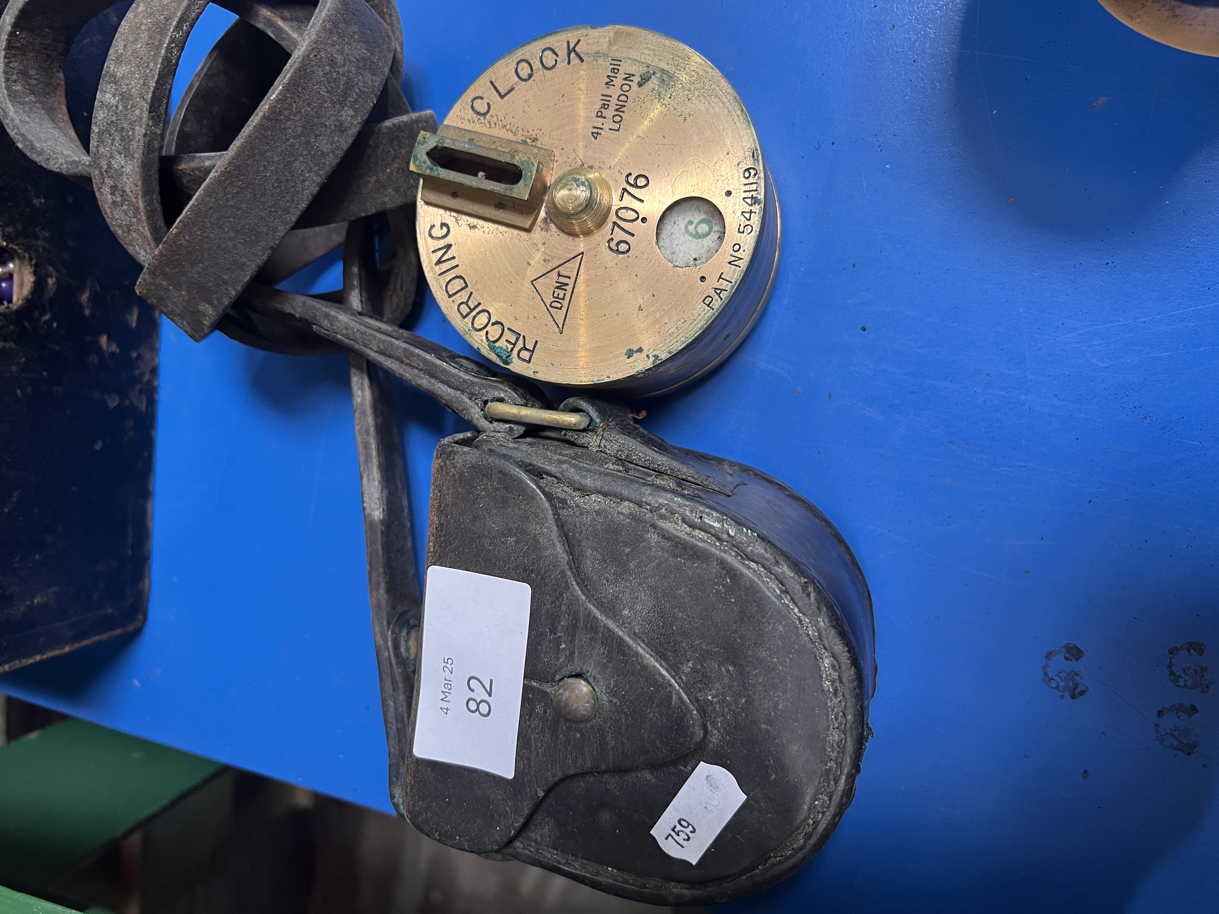 A brass-cased recording clock with leather case.