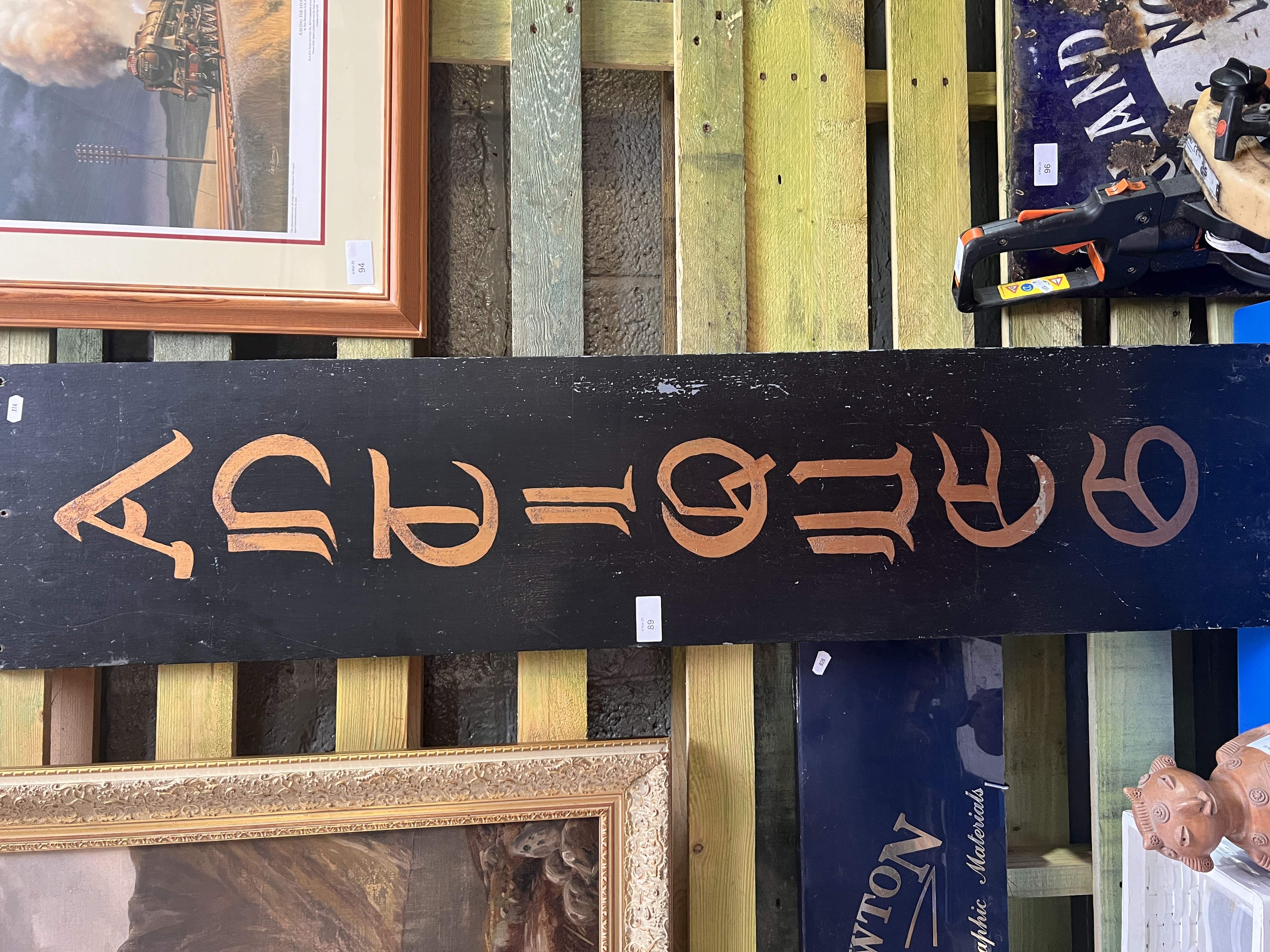 A vintage hand-painted wooden sign for antiques