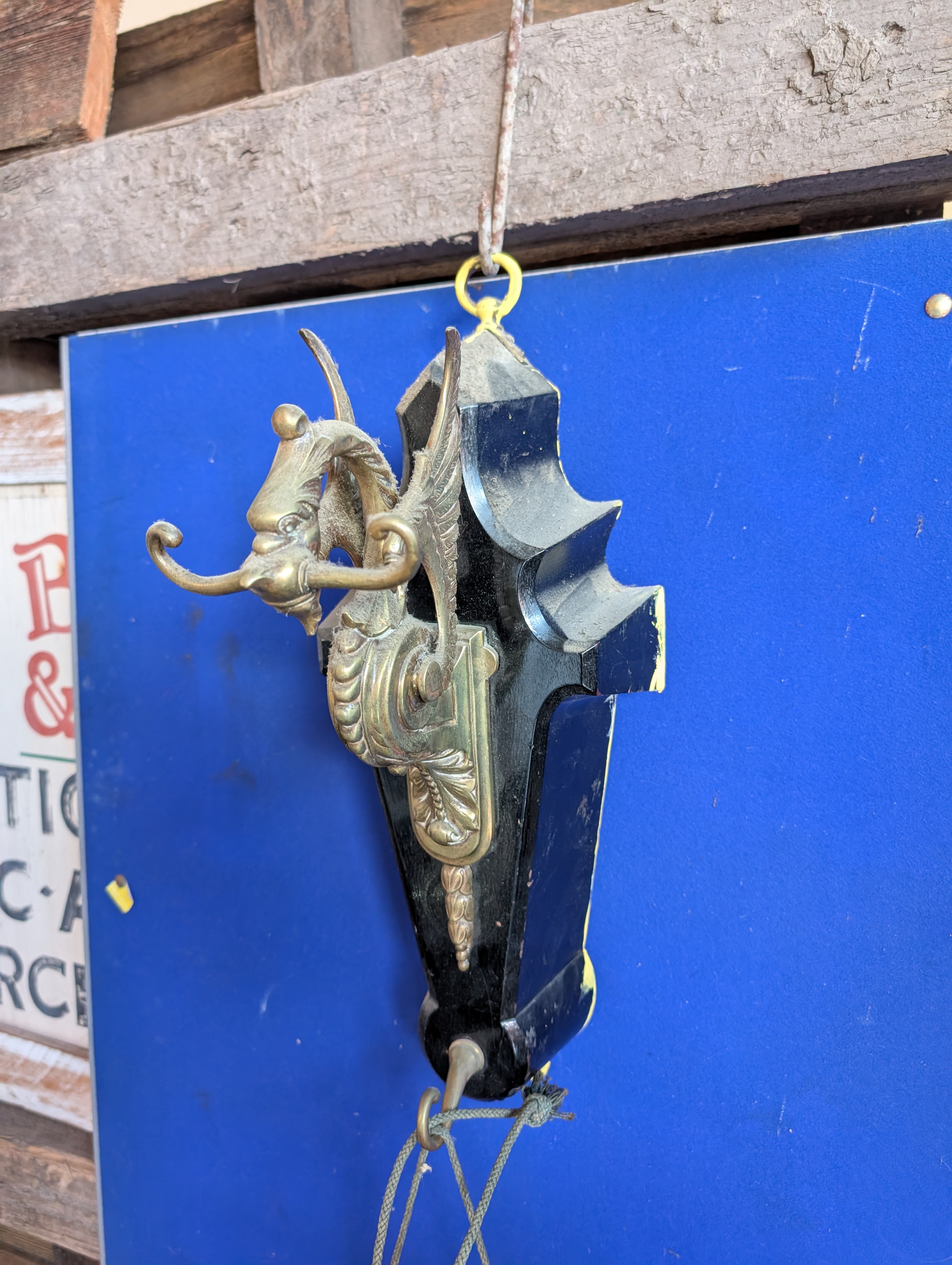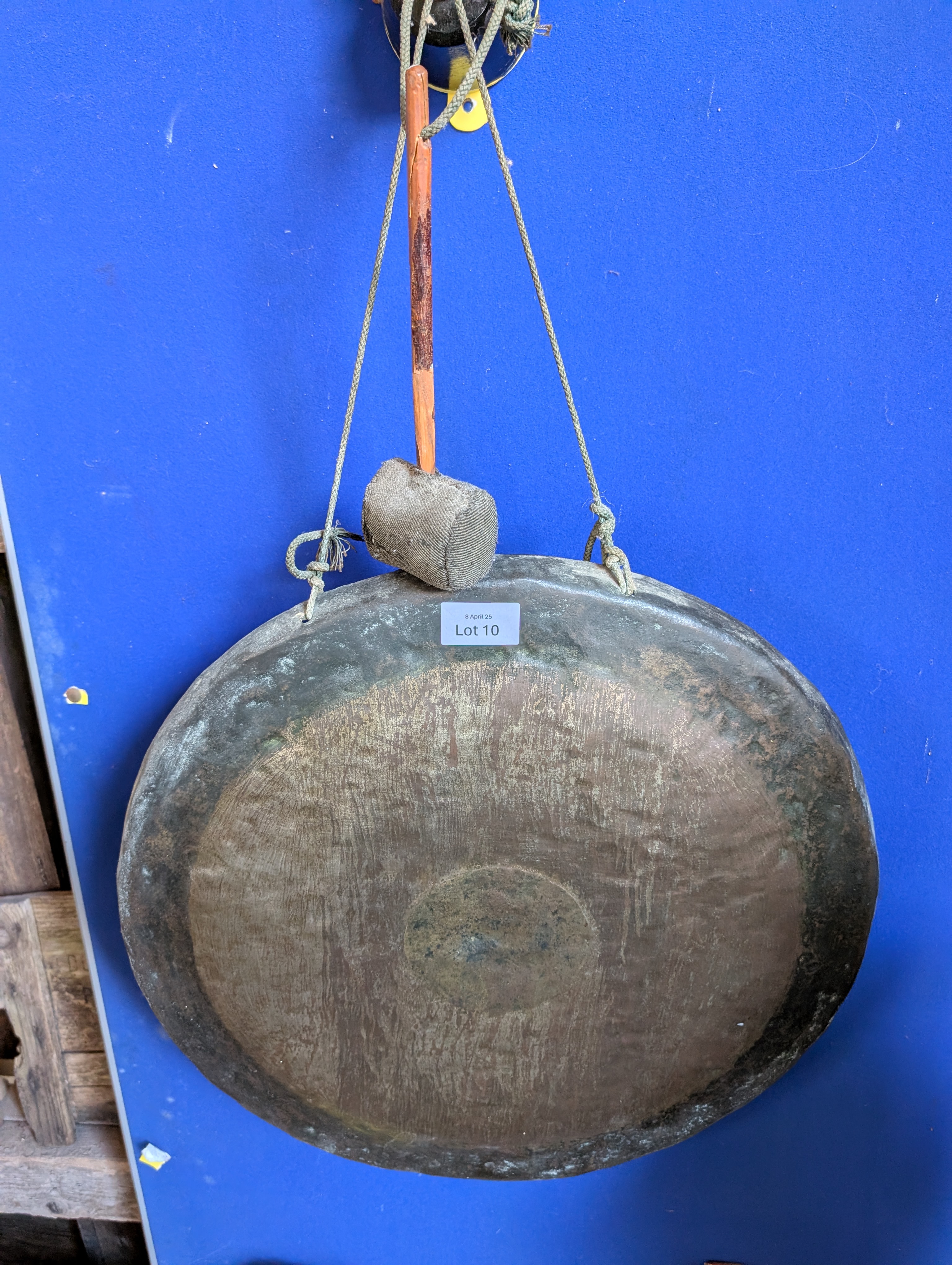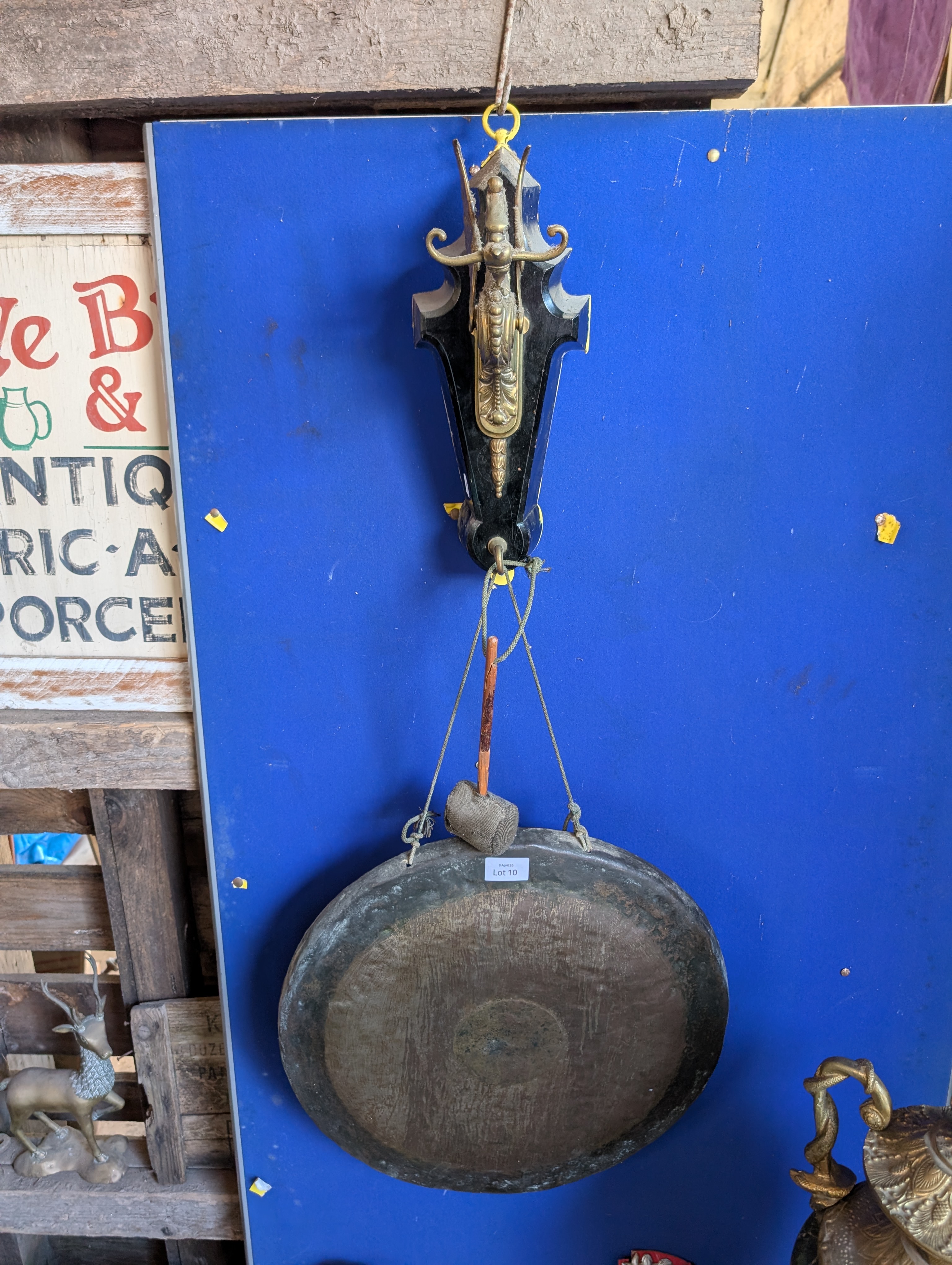 A Victorian dinner gong with ebonised mount decorated with brass dragon and Chinese bronze gong 52cm across