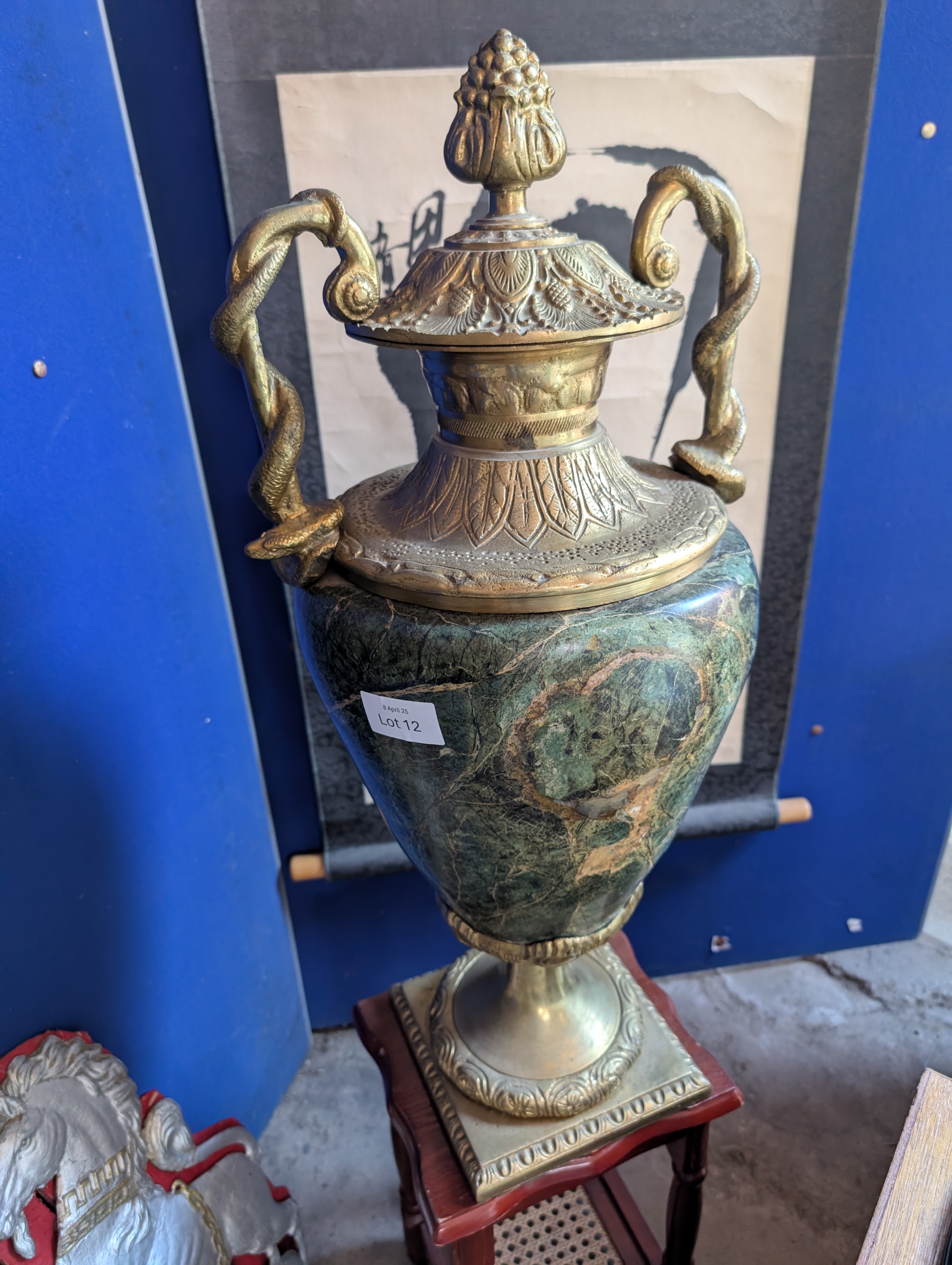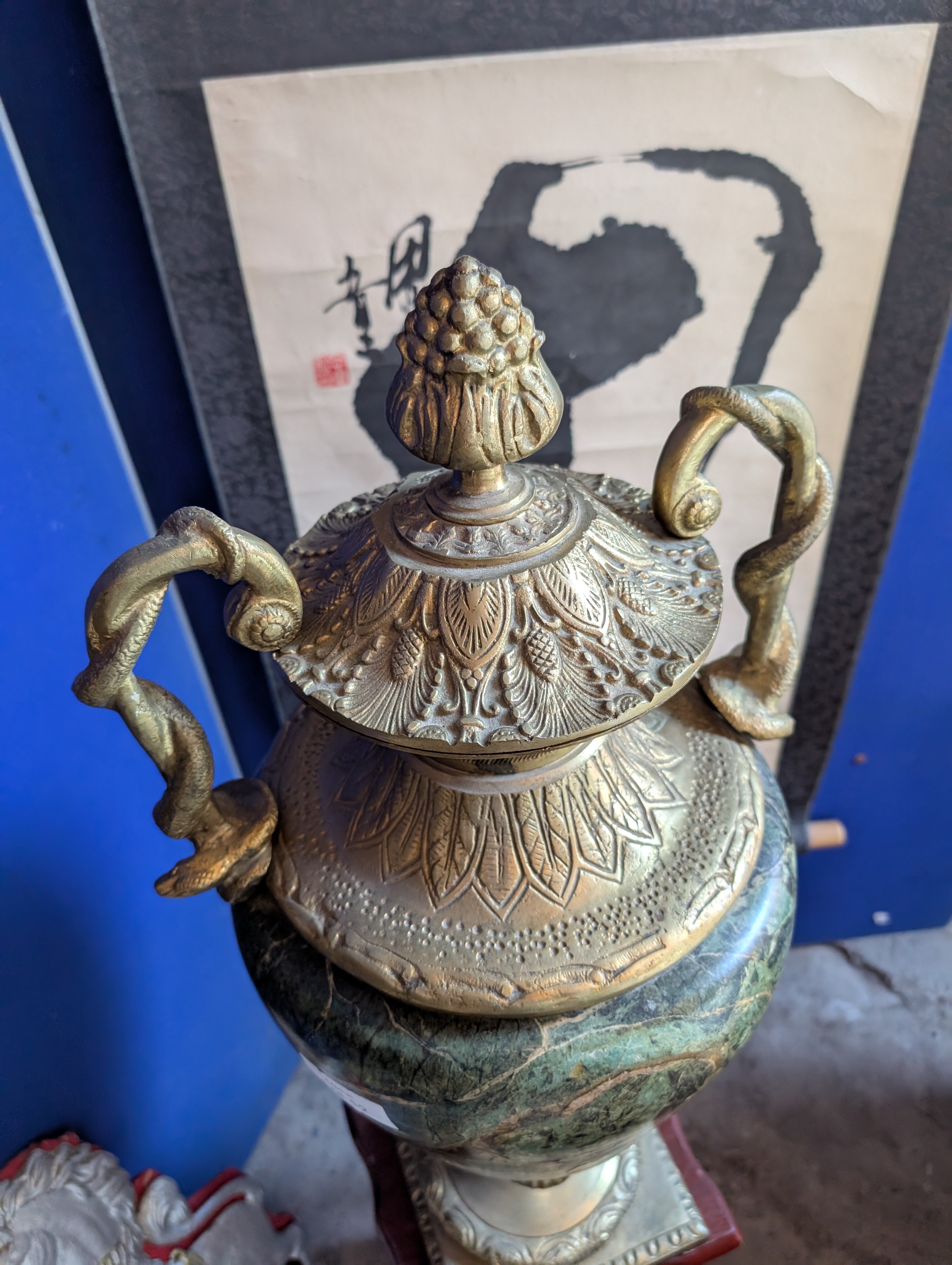 A large Victorian neo classical cassolette or urn heavy green marble body with ormolu decoration. Very good condition 70cm tall