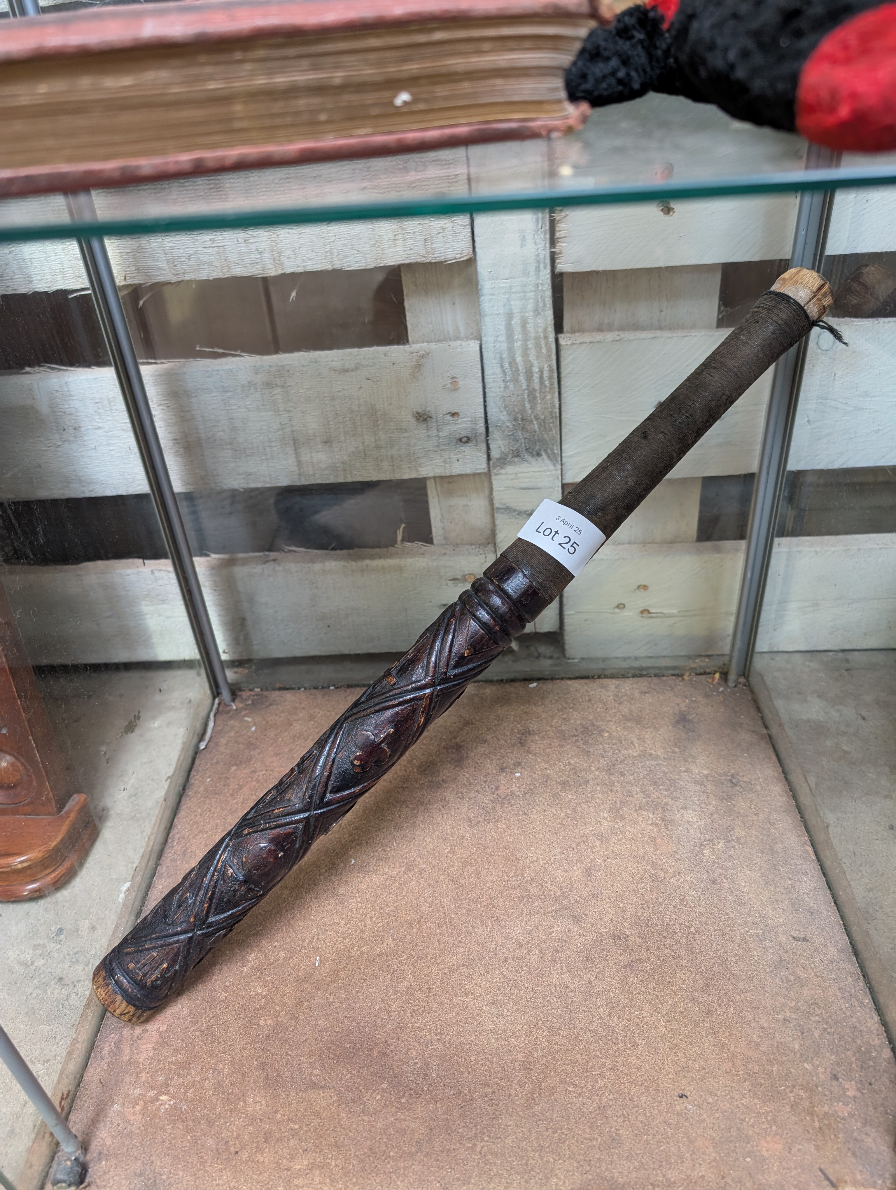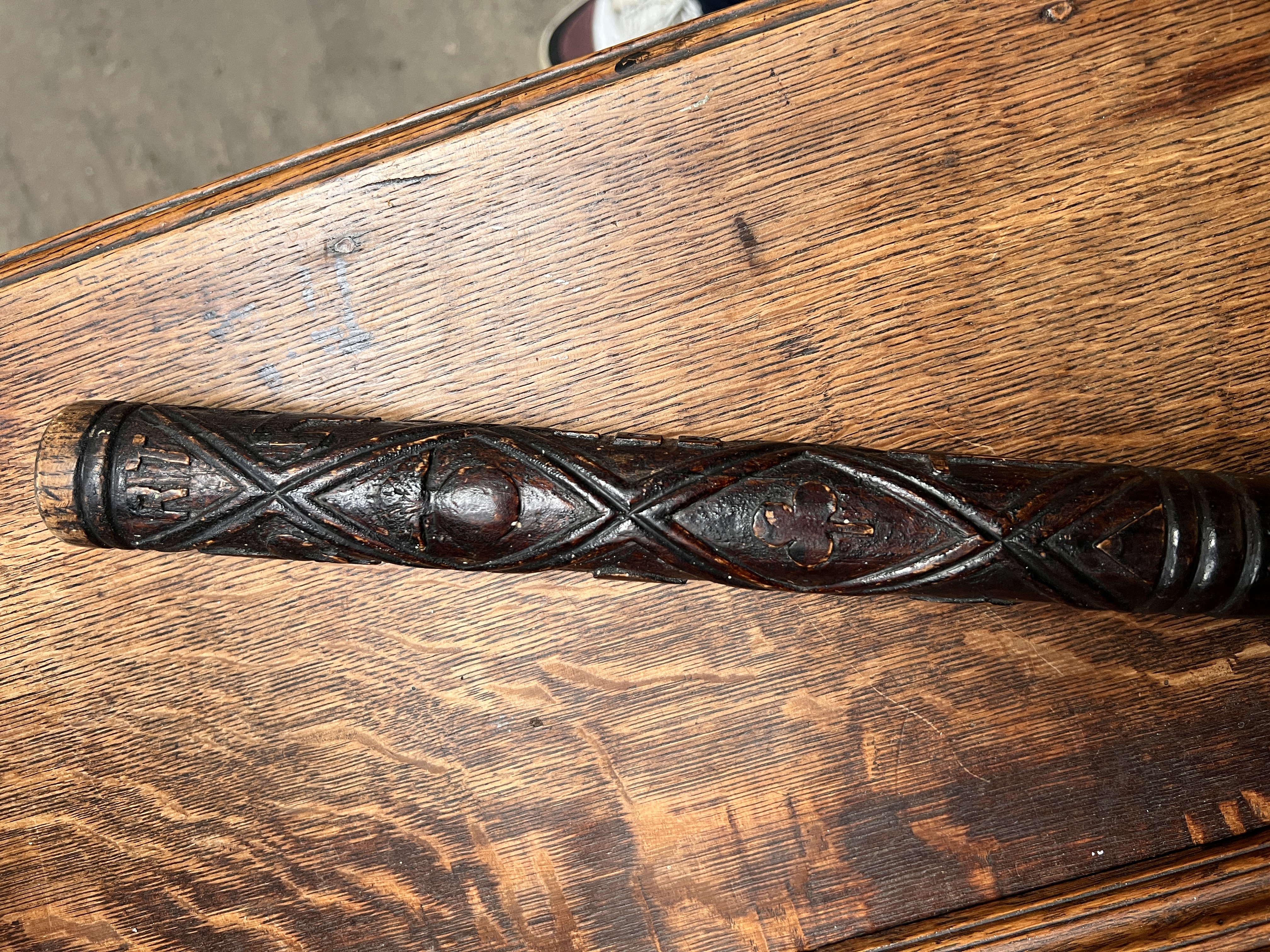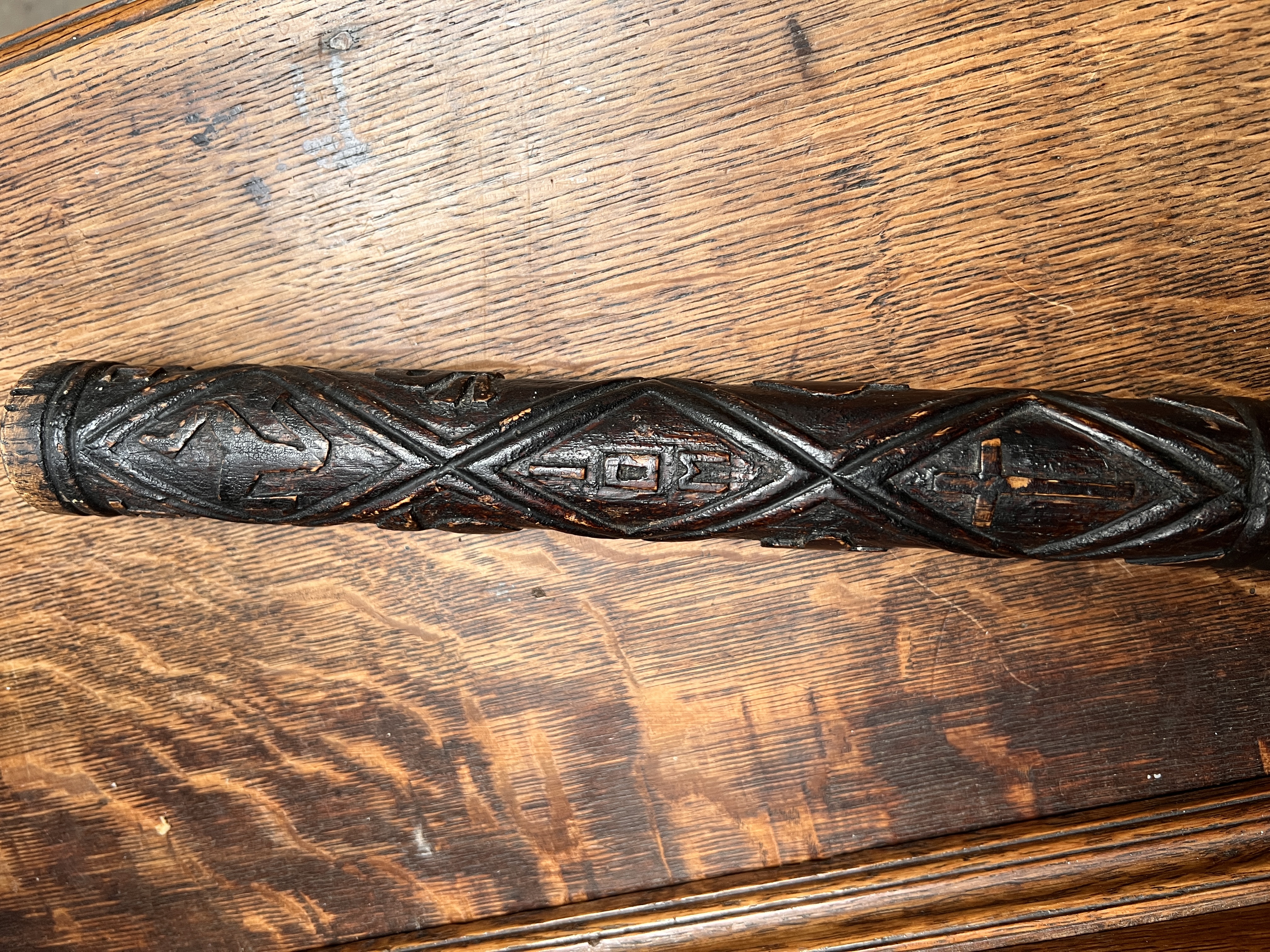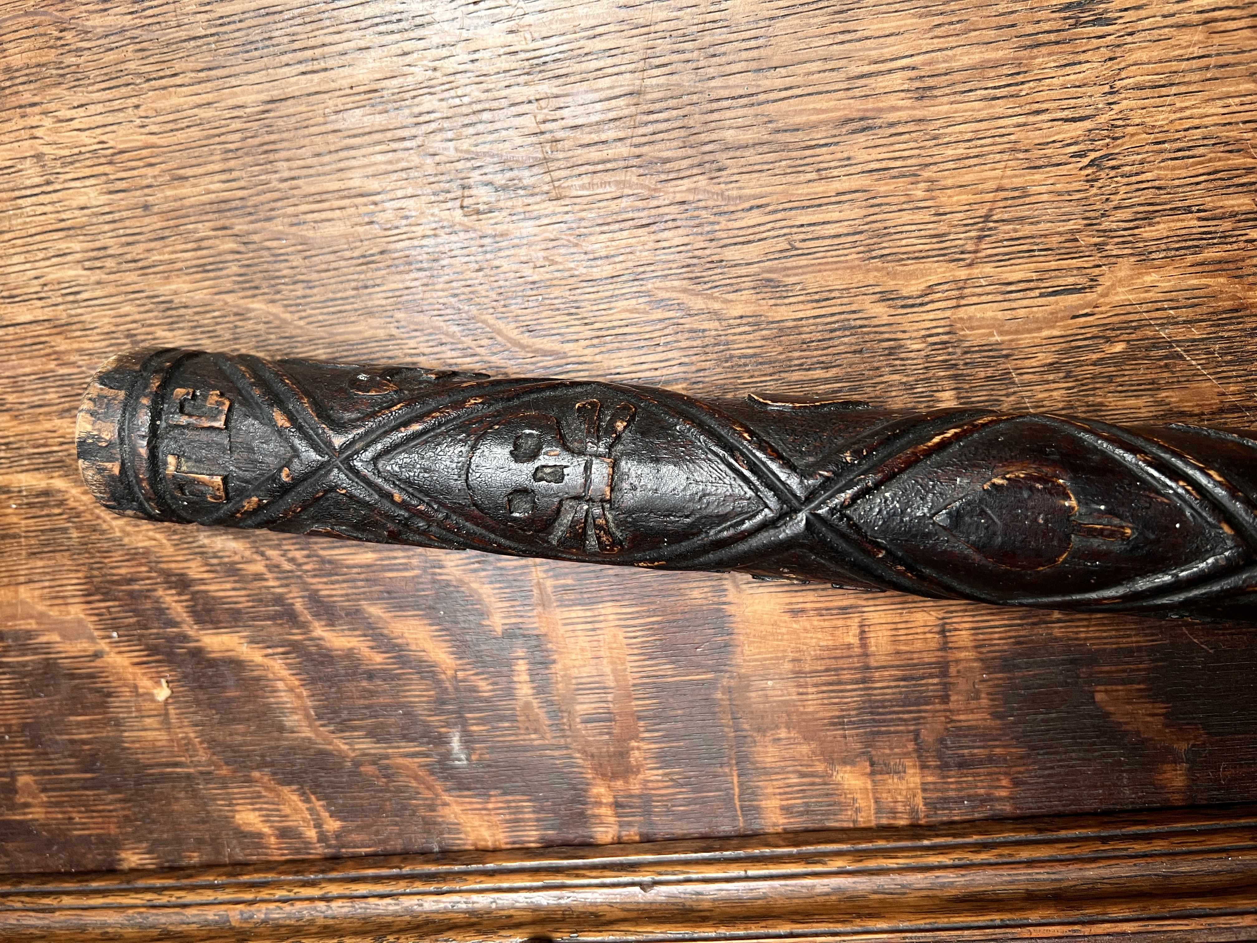 An early 20th century folk art hand carved Irish oak truncheon carved with skull and cross bones initials etc 52cm long
