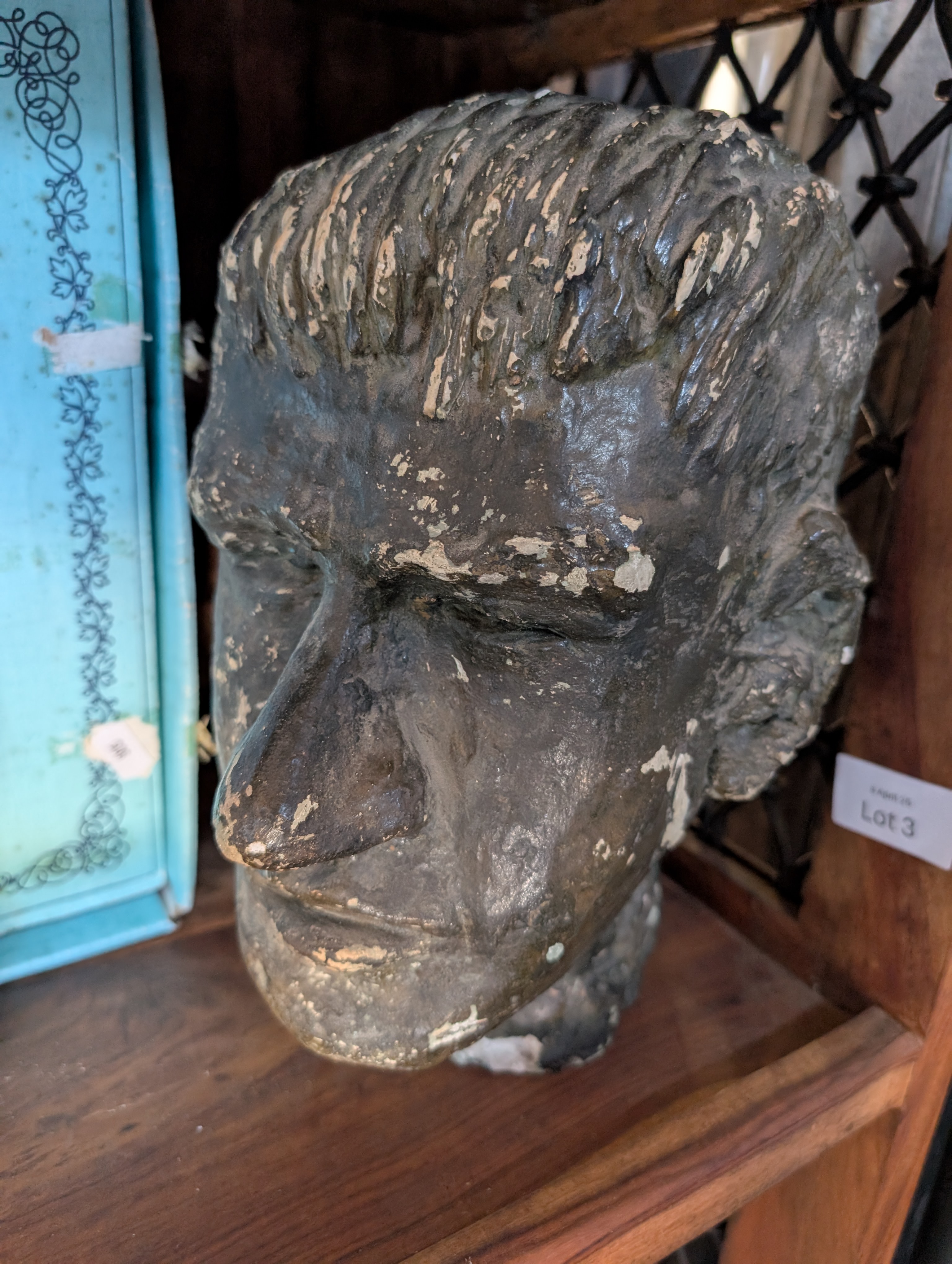 A mid-century studio pottery life-size head 27cm ceramic with weathered bronze effect