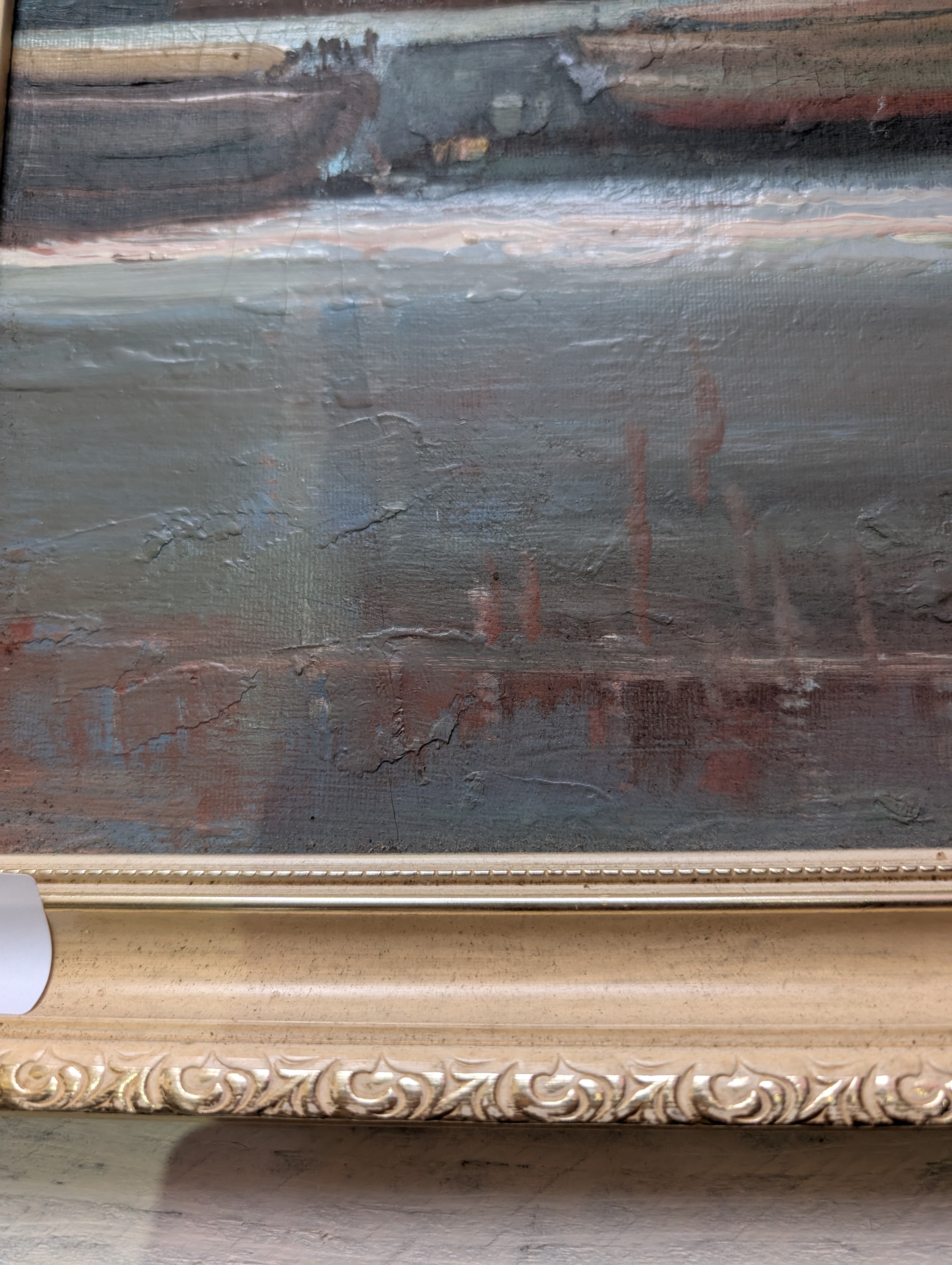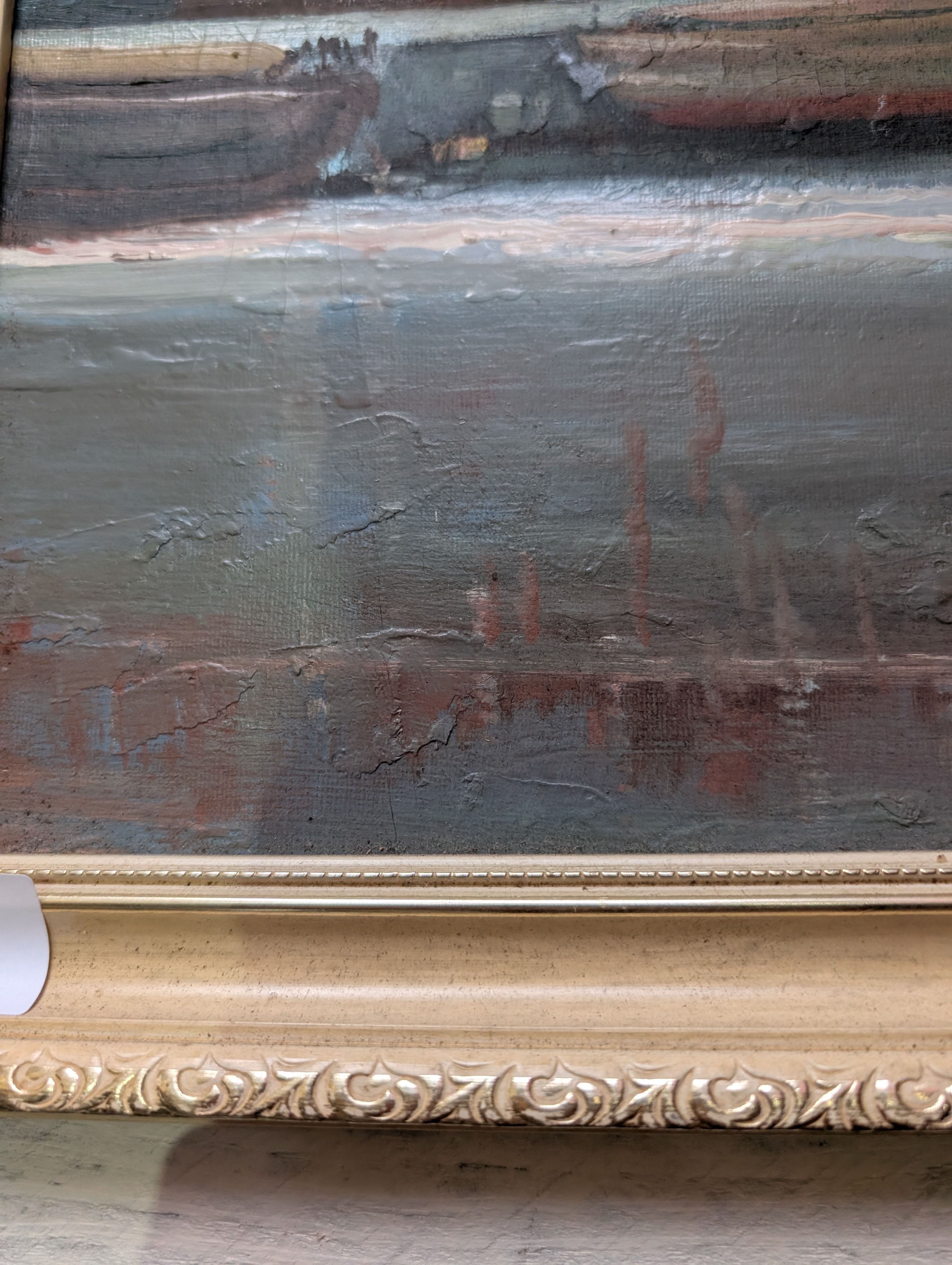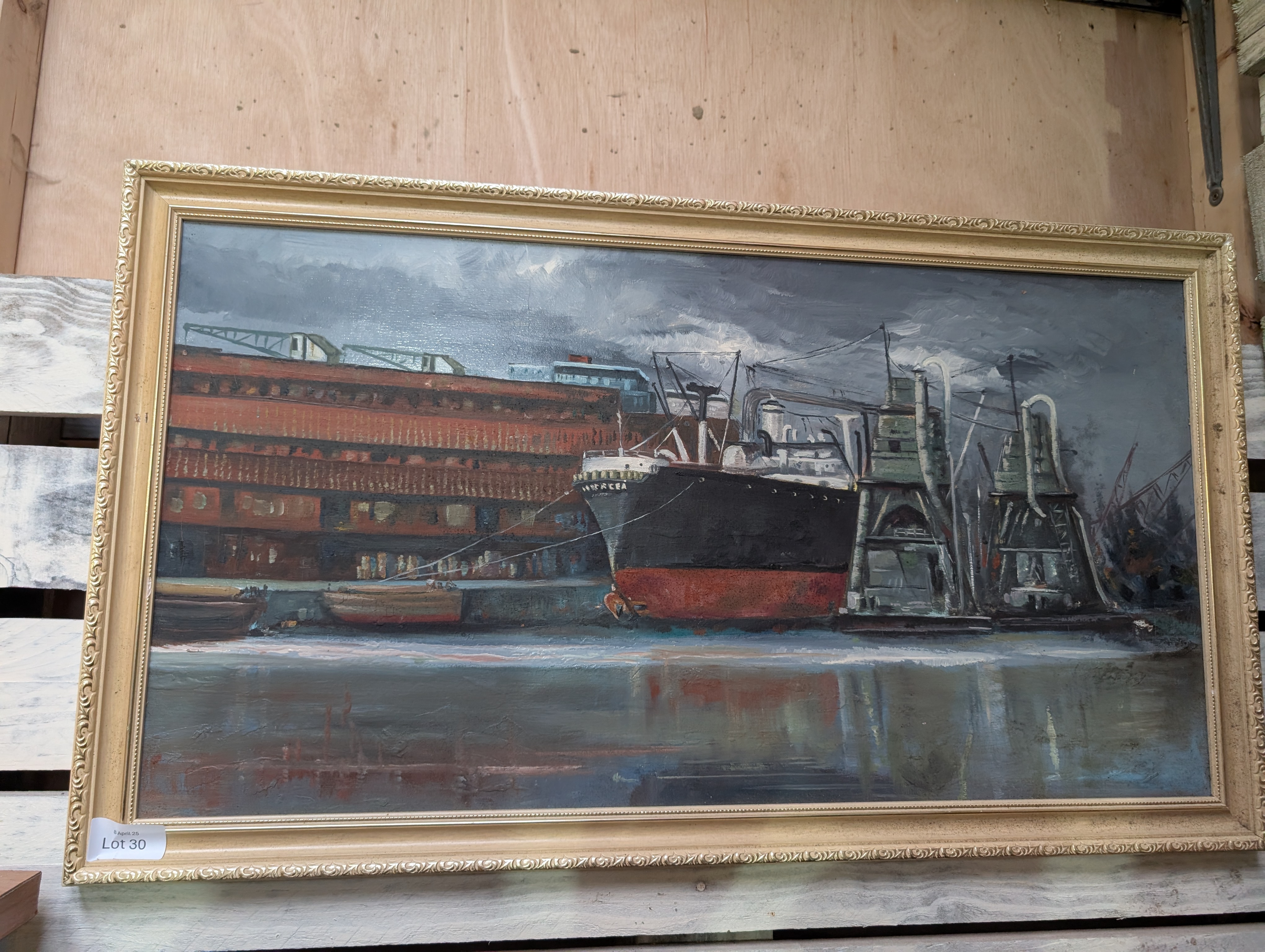 A mid-century oil on board of an industrial dock with ship ‘Mercea’ docked. Unsigned