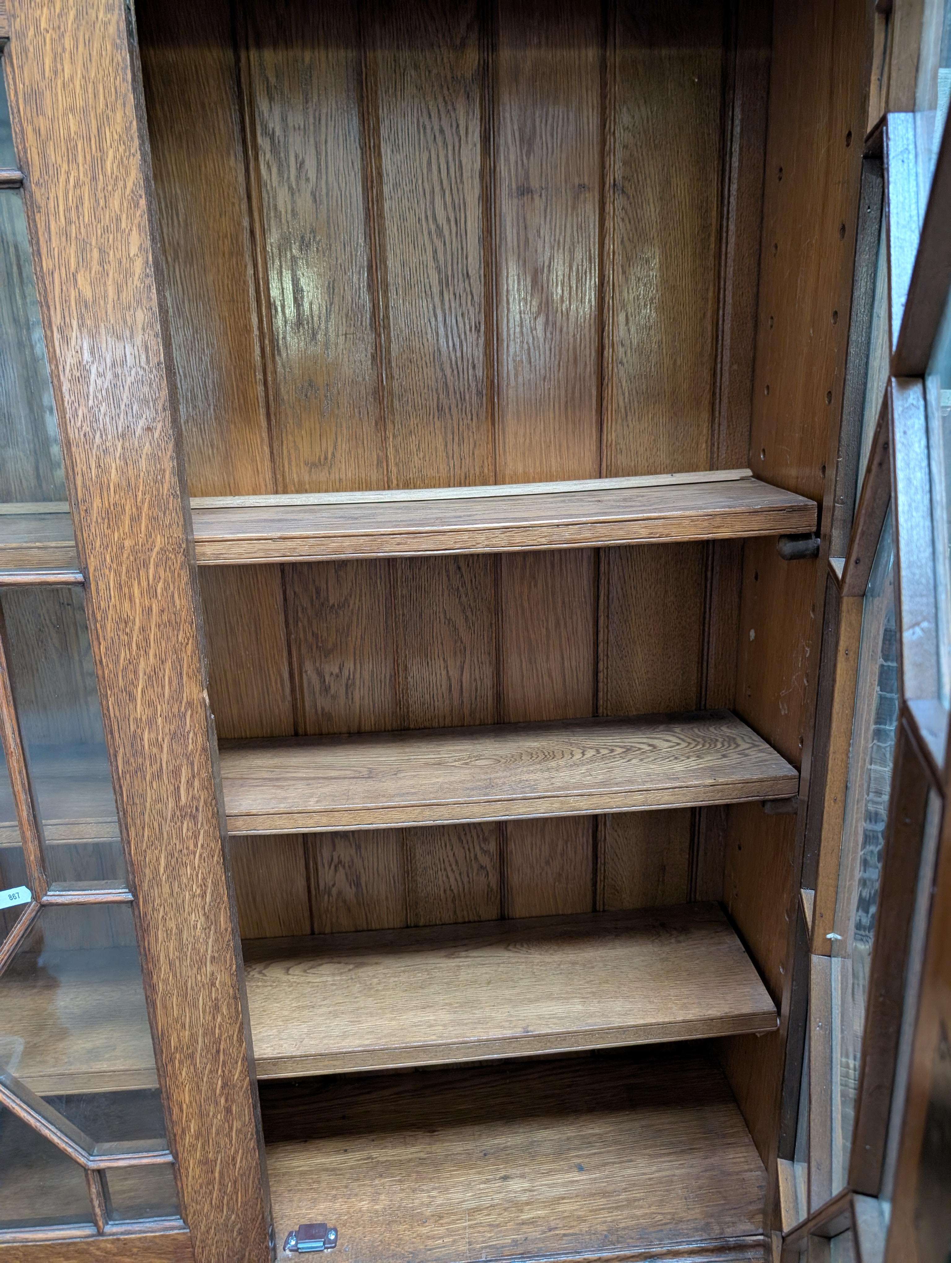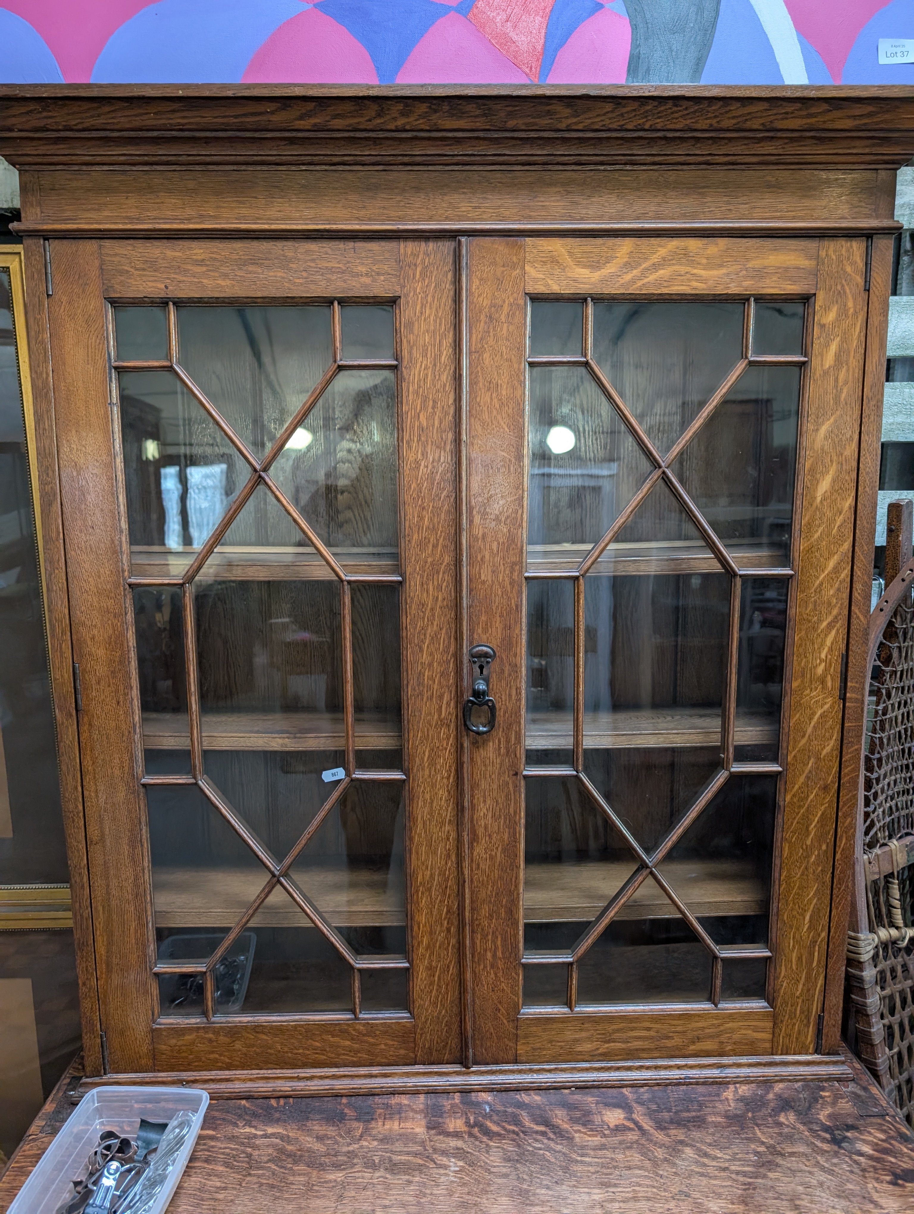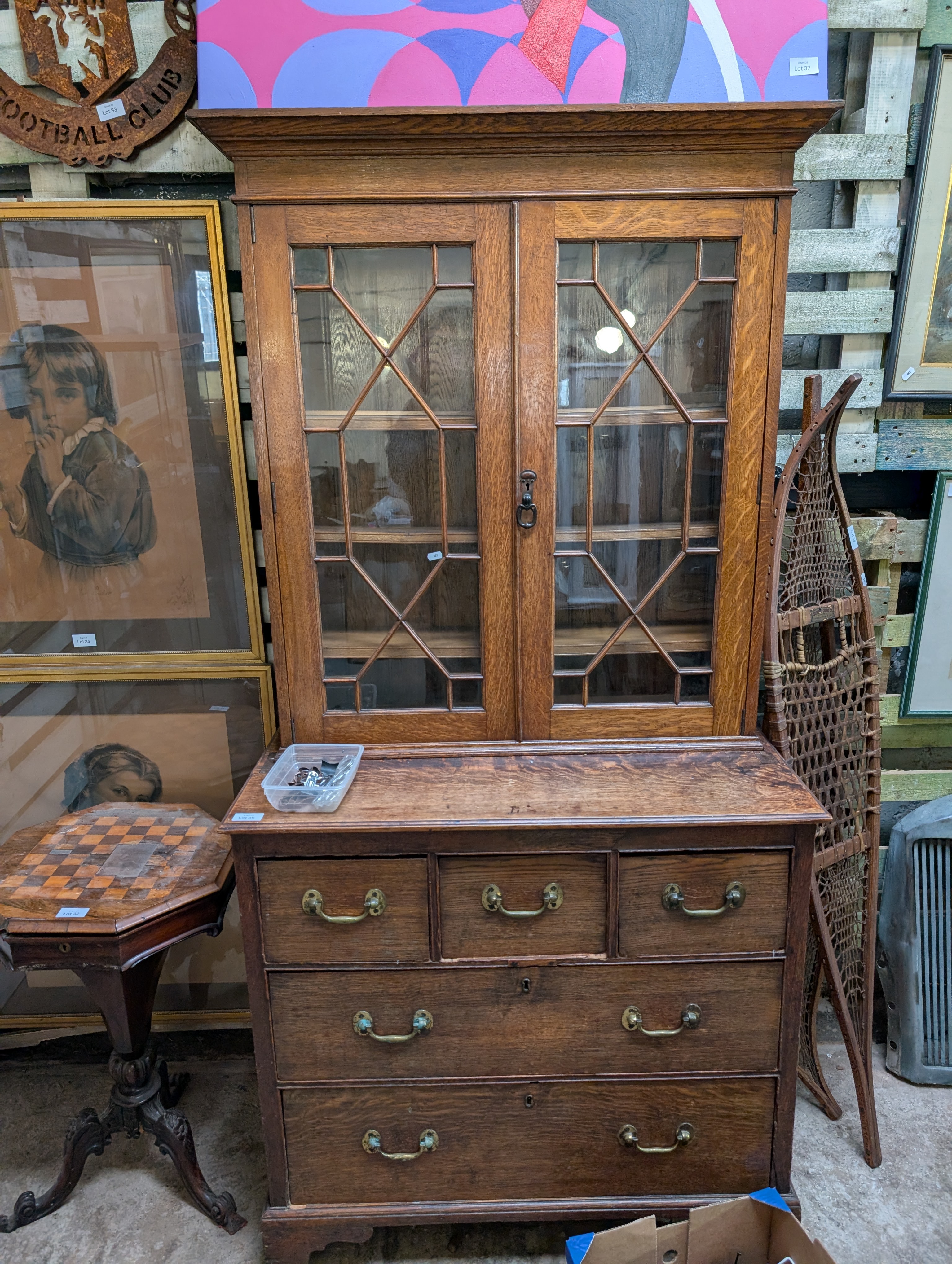 An antique oak chest of three over two drawers with astral glazed bookcase top.
