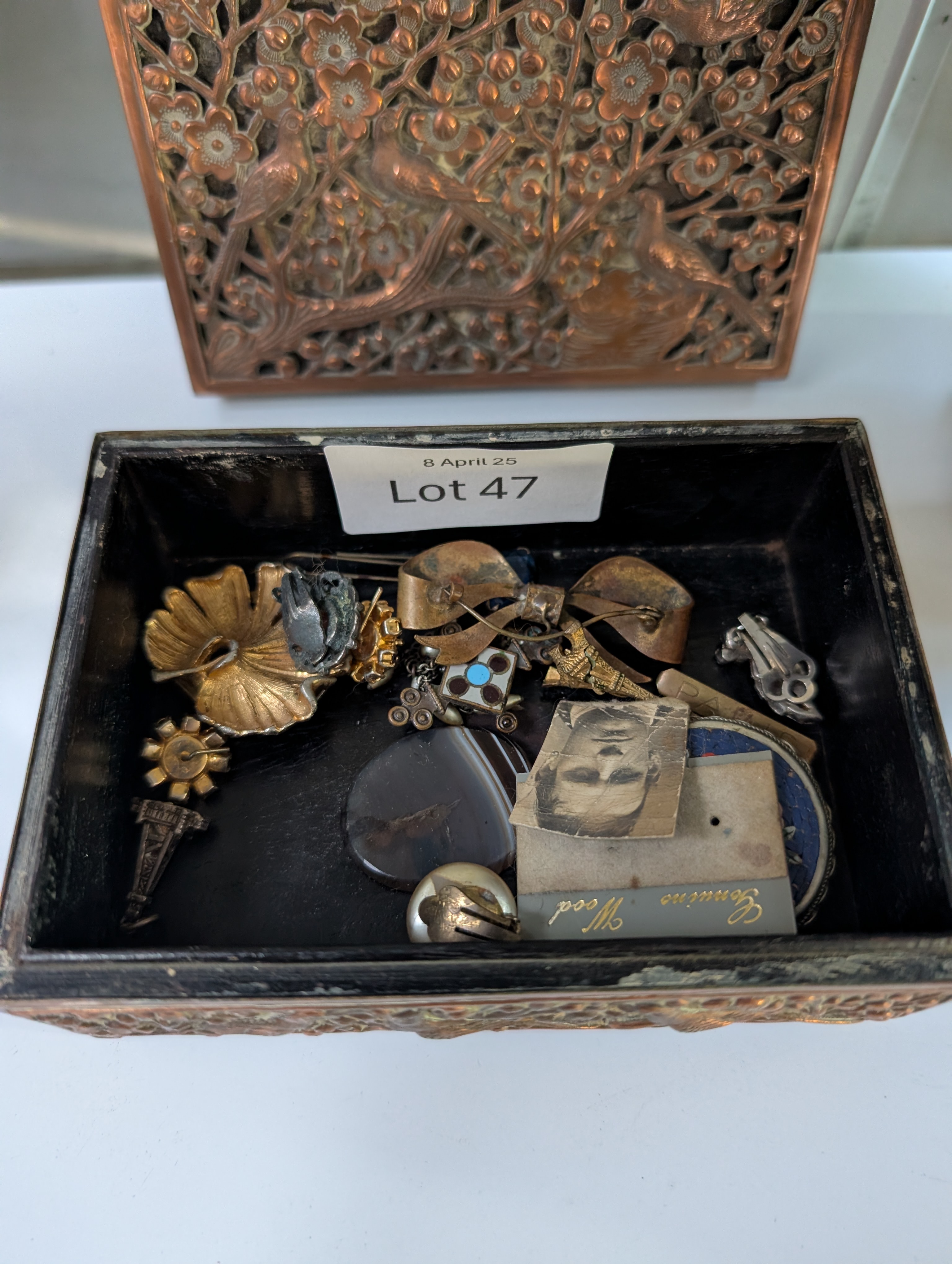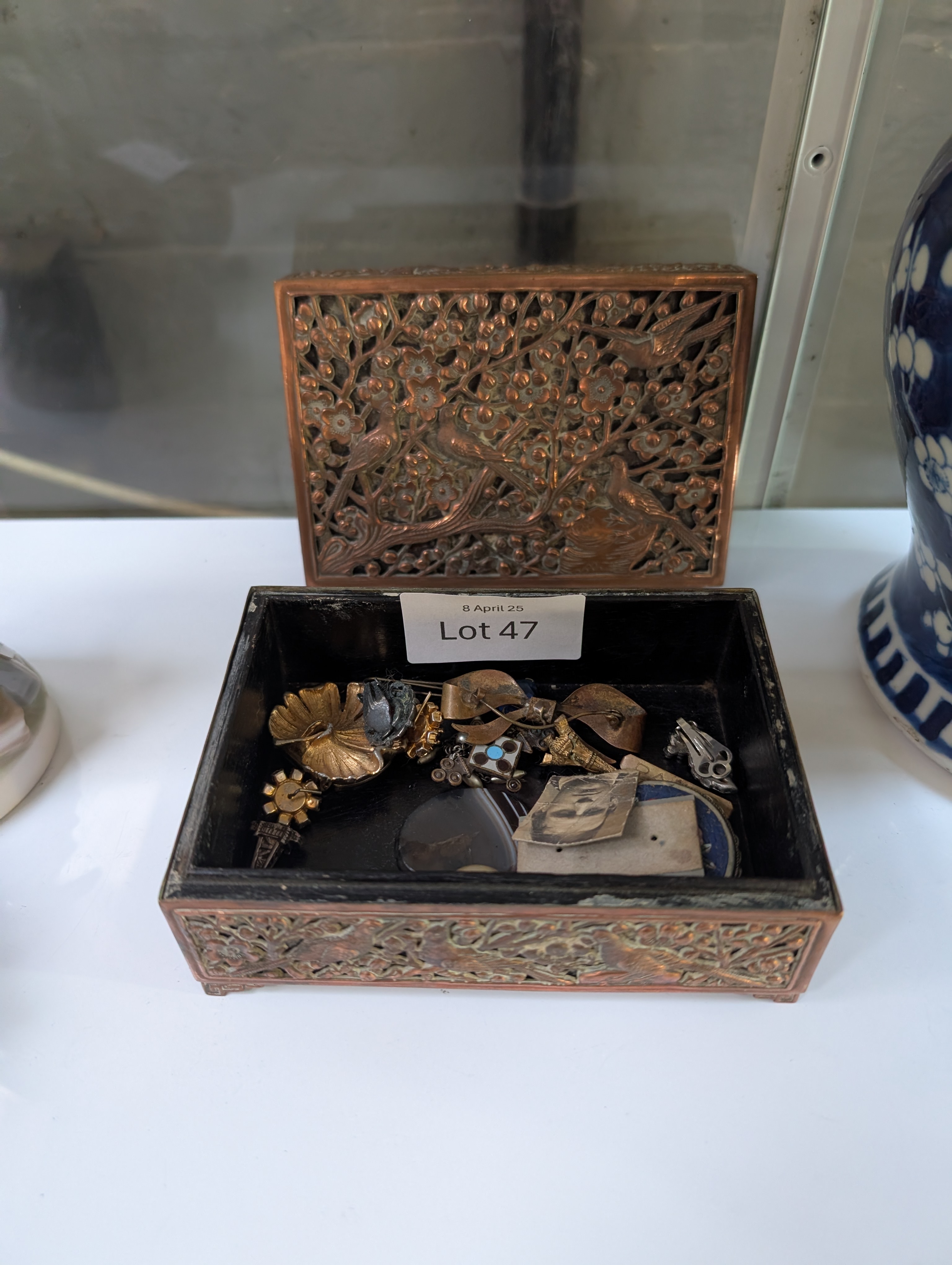 An early 20th century Japanese trinket box, chase worked copper decorated with birds and blossom.