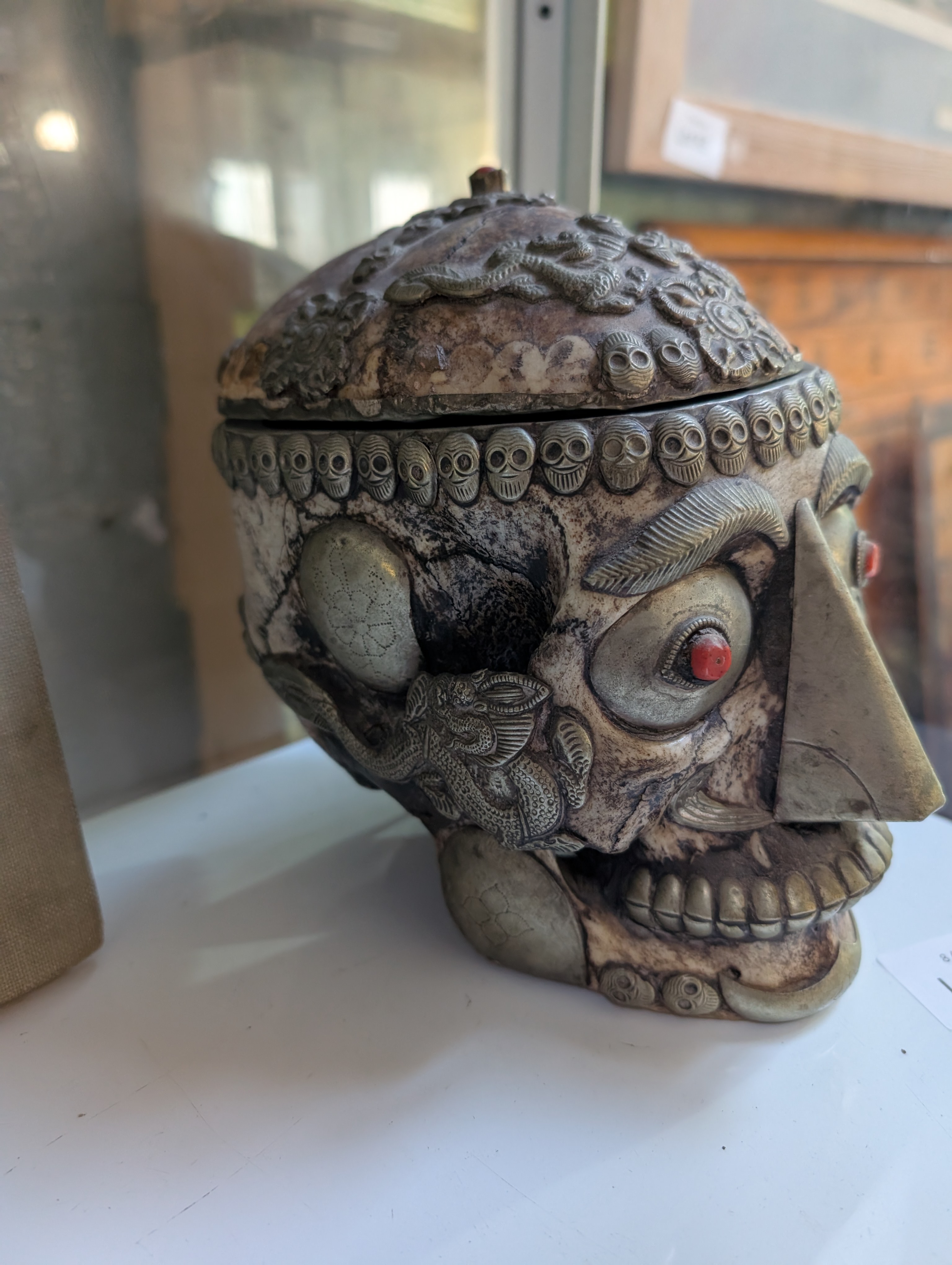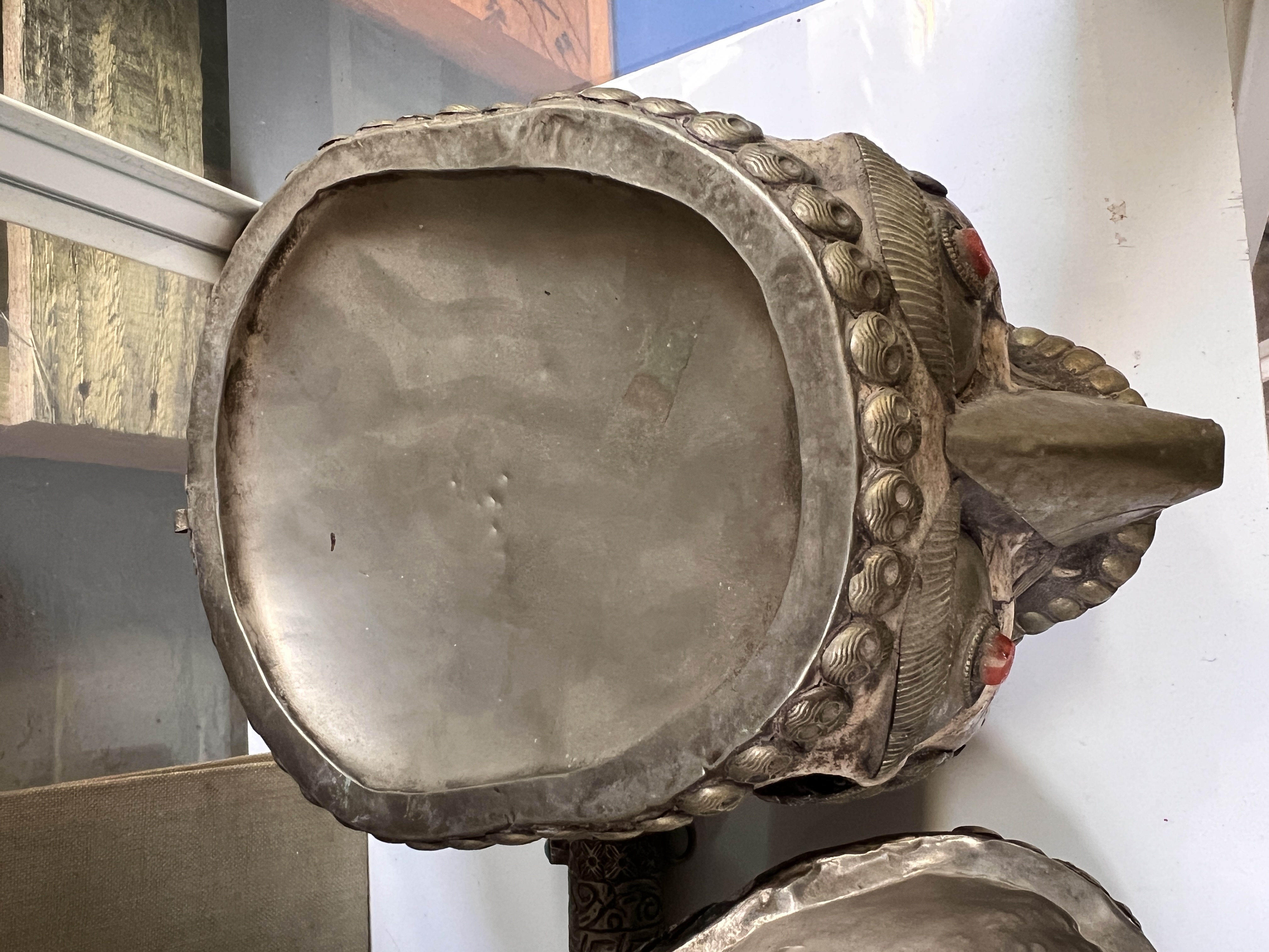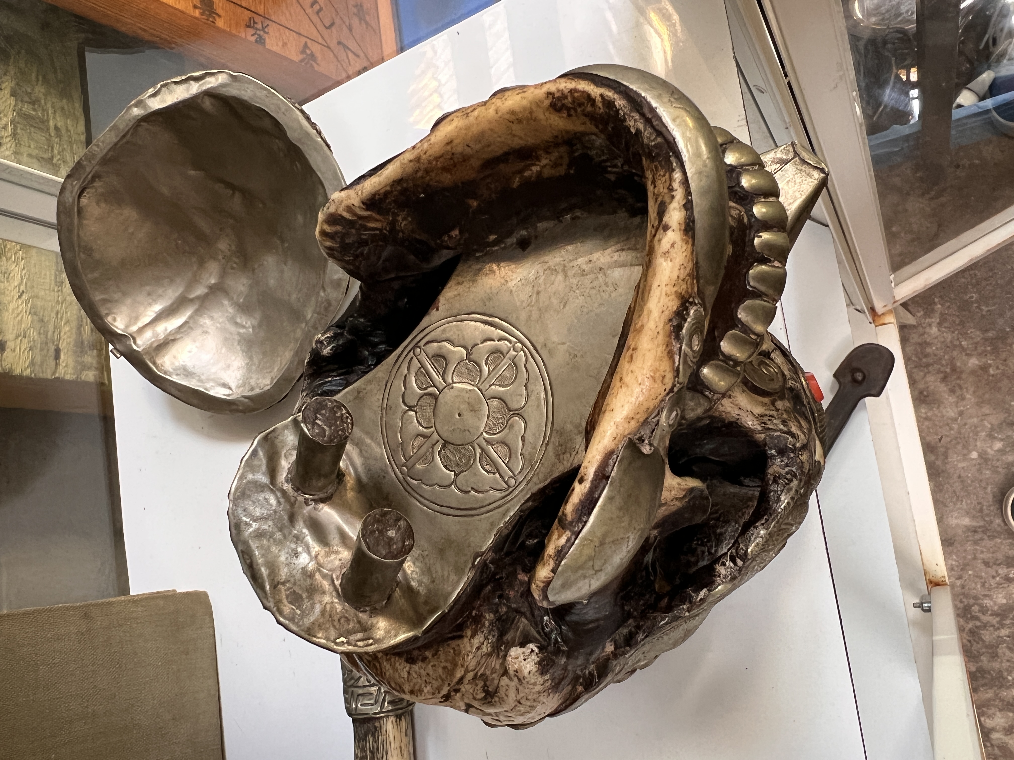 An antique Tibetan Kapala (Sanskrit for skull) ritual cup used in both Hindu and Buddhist Tantra practices. Comprising of lid and skull forming a bowl decorated with white metal fitments and adorned with skull, dragon motifs and cabochons. Good condition with slight loss of metal decoration, lid is detached from bowl. 18cm tall.