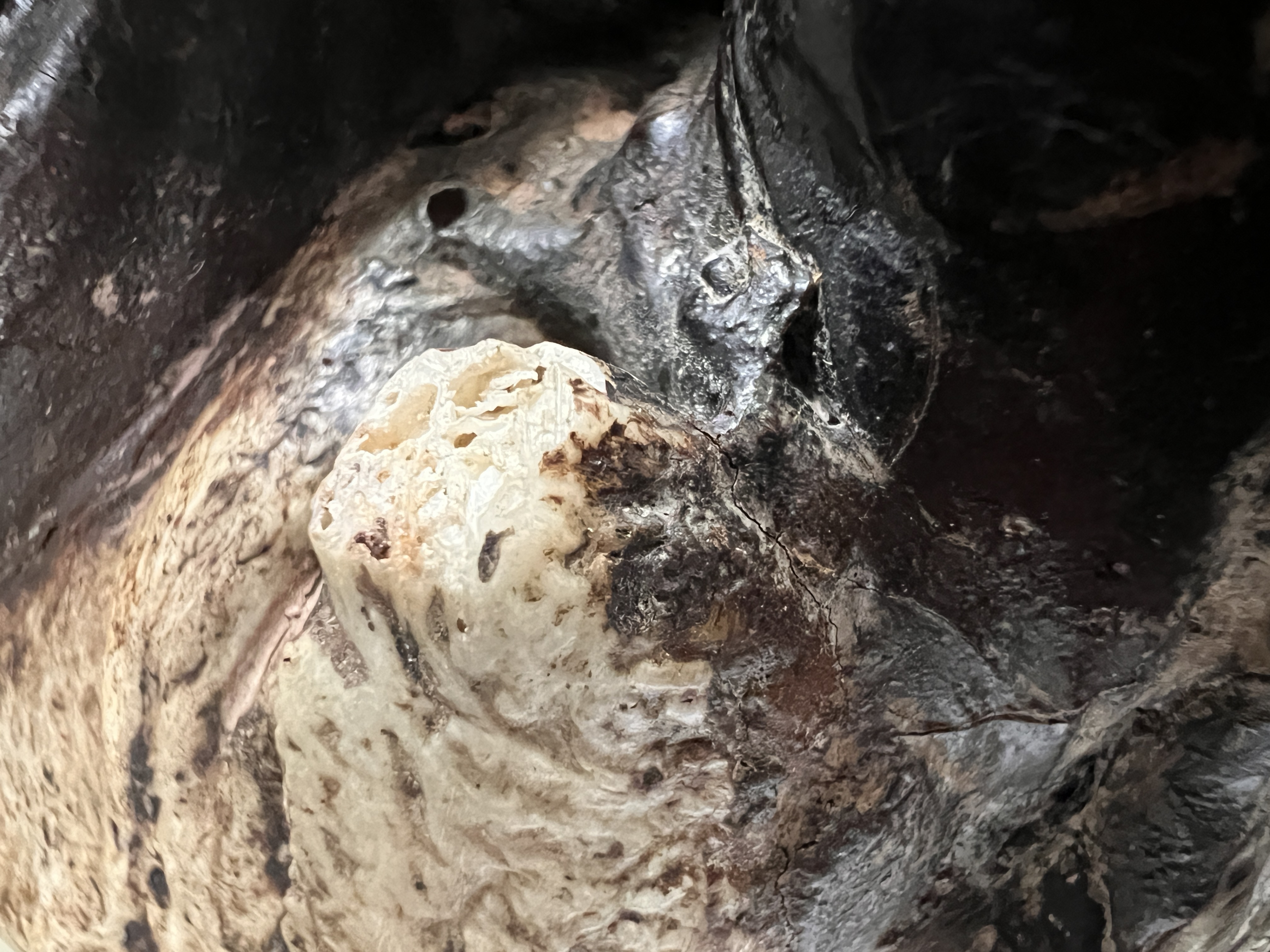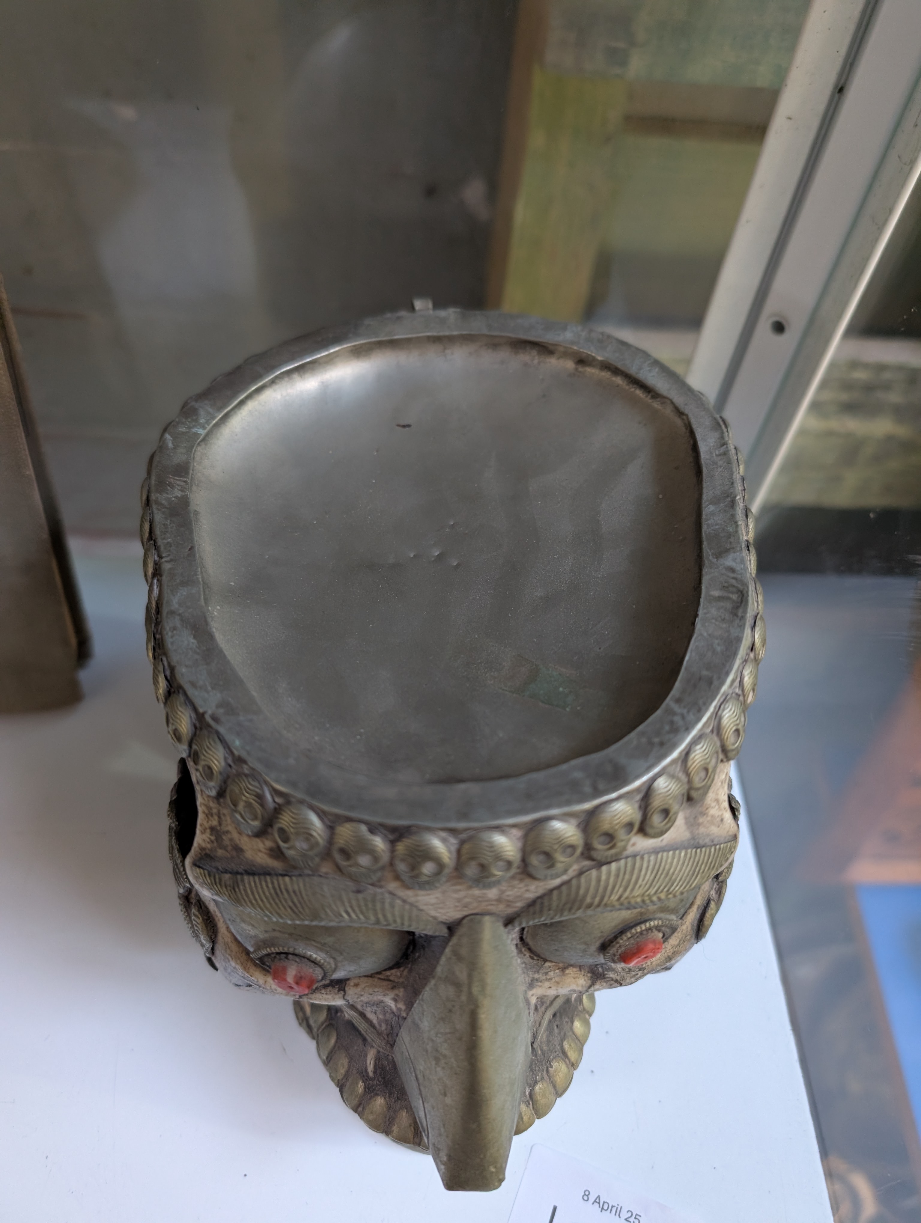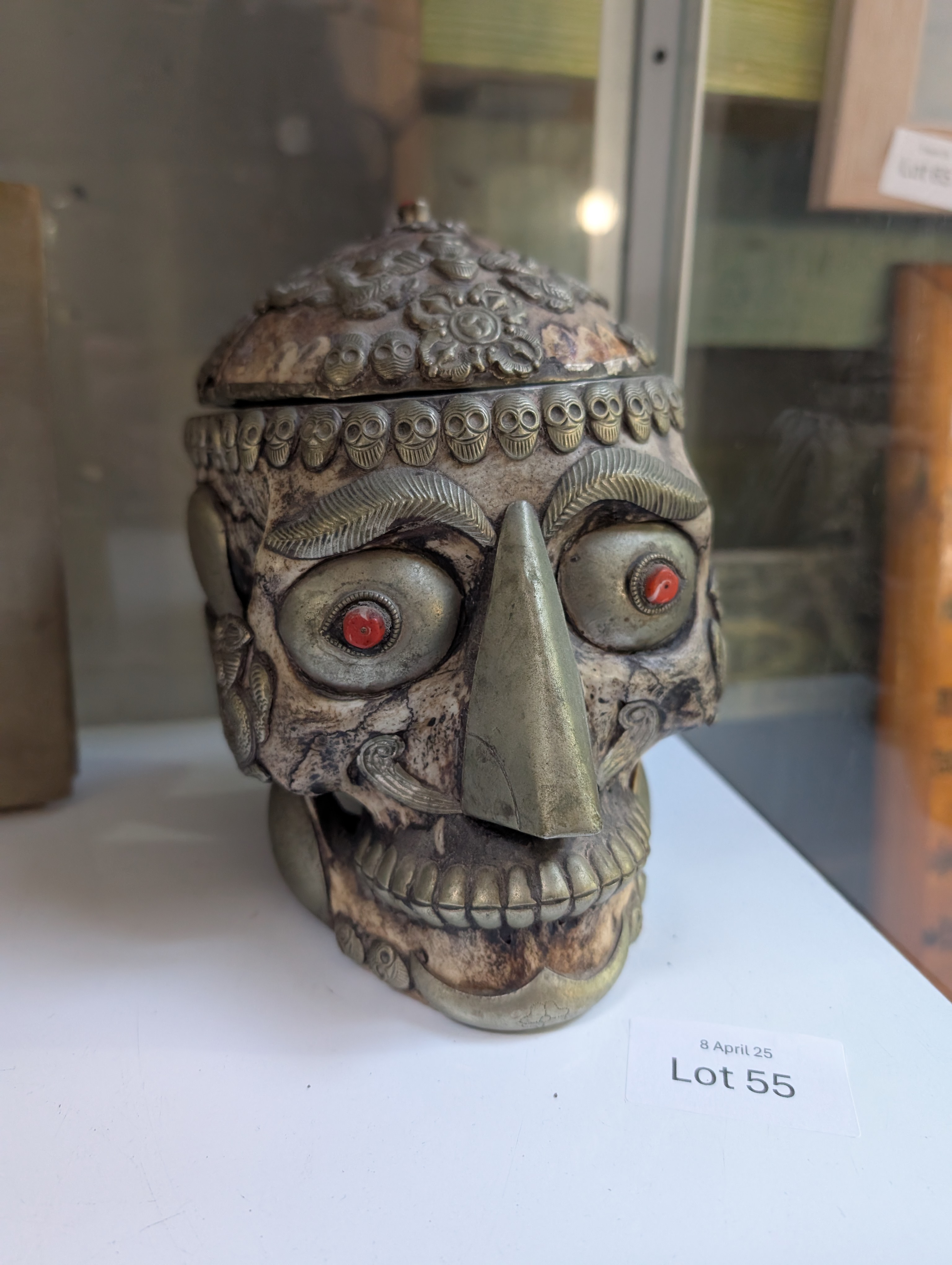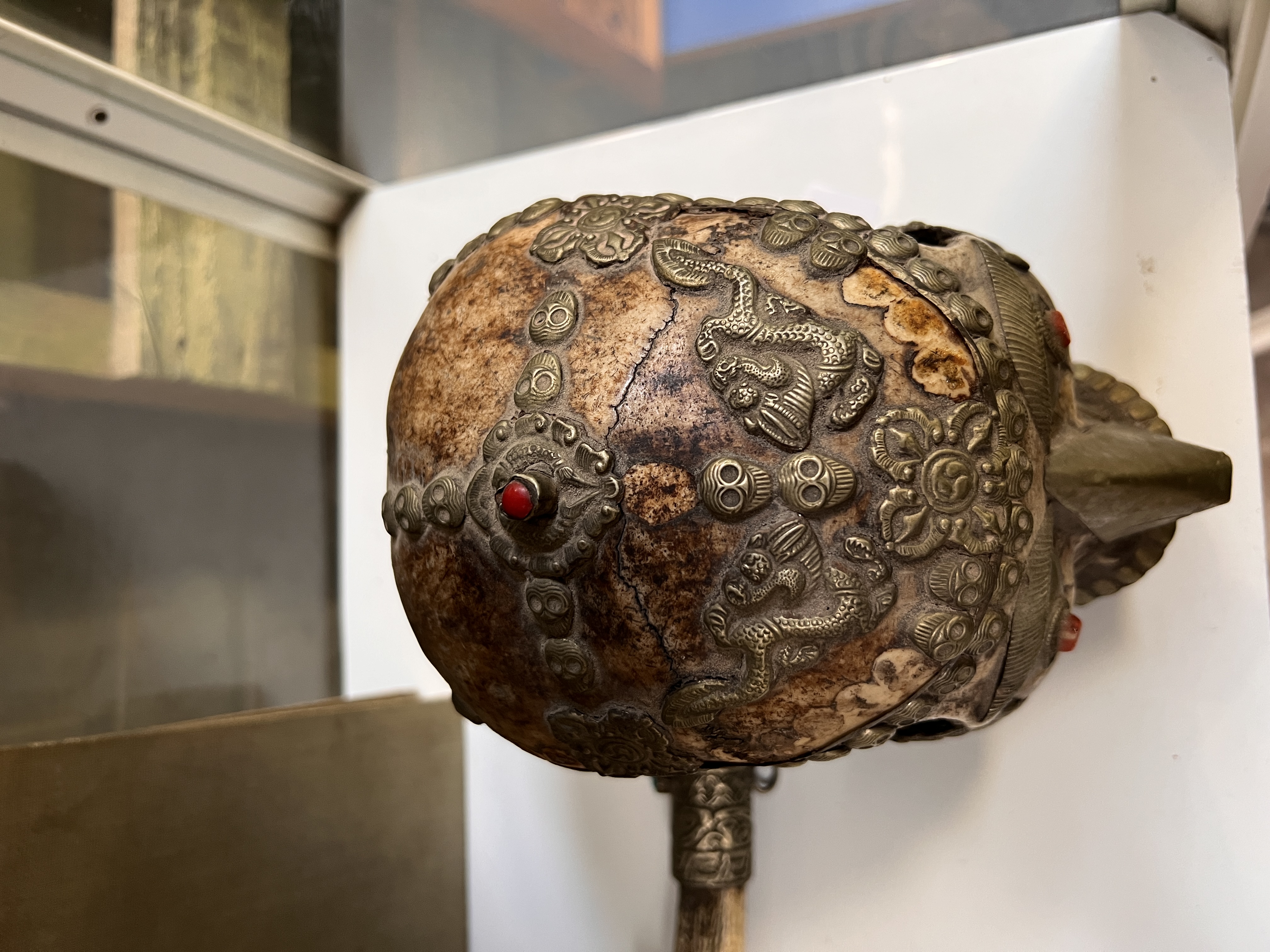 An antique Tibetan Kapala (Sanskrit for skull) ritual cup used in both Hindu and Buddhist Tantra practices. Comprising of lid and skull forming a bowl decorated with white metal fitments and adorned with skull, dragon motifs and cabochons. Good condition with slight loss of metal decoration, lid is detached from bowl. 18cm tall.